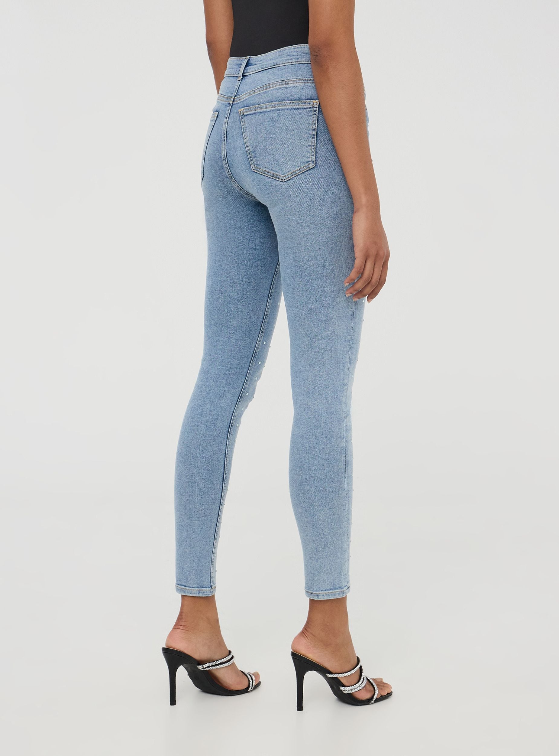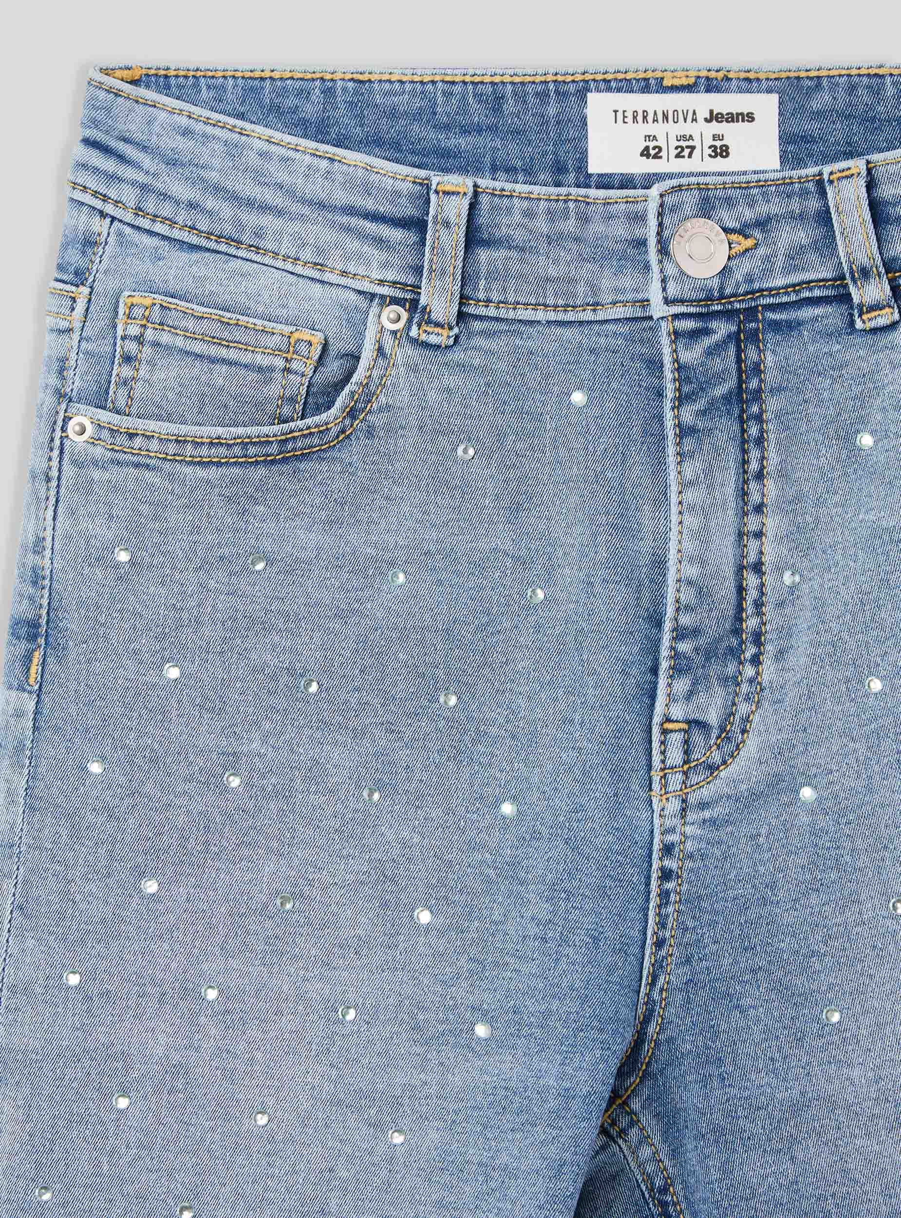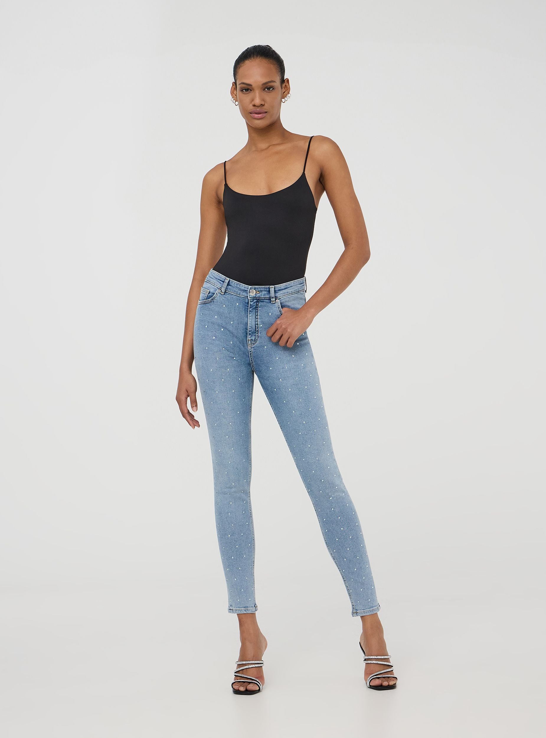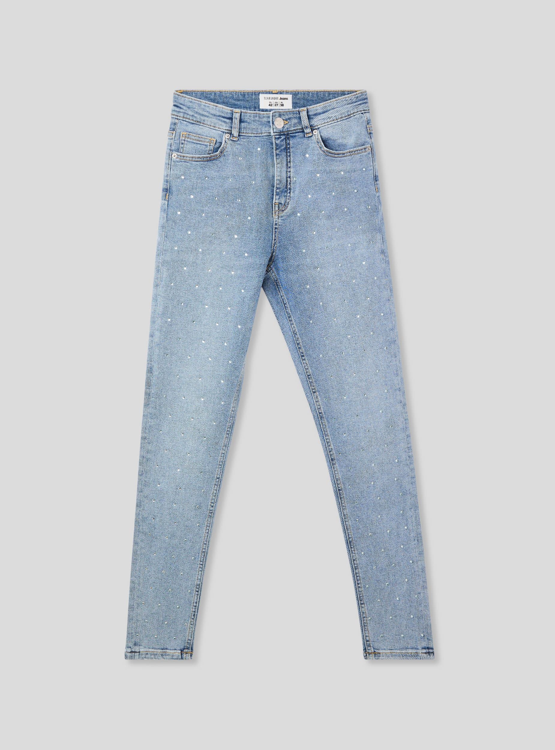 Dámské džíny s úzkým střihem a kamínky na celé přední části, ideální pro moderní a třpytivý vzhled. Design s pěti kapsami a zapínáním na zip a knoflík, spolu s poutky na opasek, nabízí praktičnost a styl. Ideální pro elegantní kombinace s upnutými topy a vysokými podpatky na speciální večer nebo s teniskami a volnými blůzami pro volný čas.Detaily