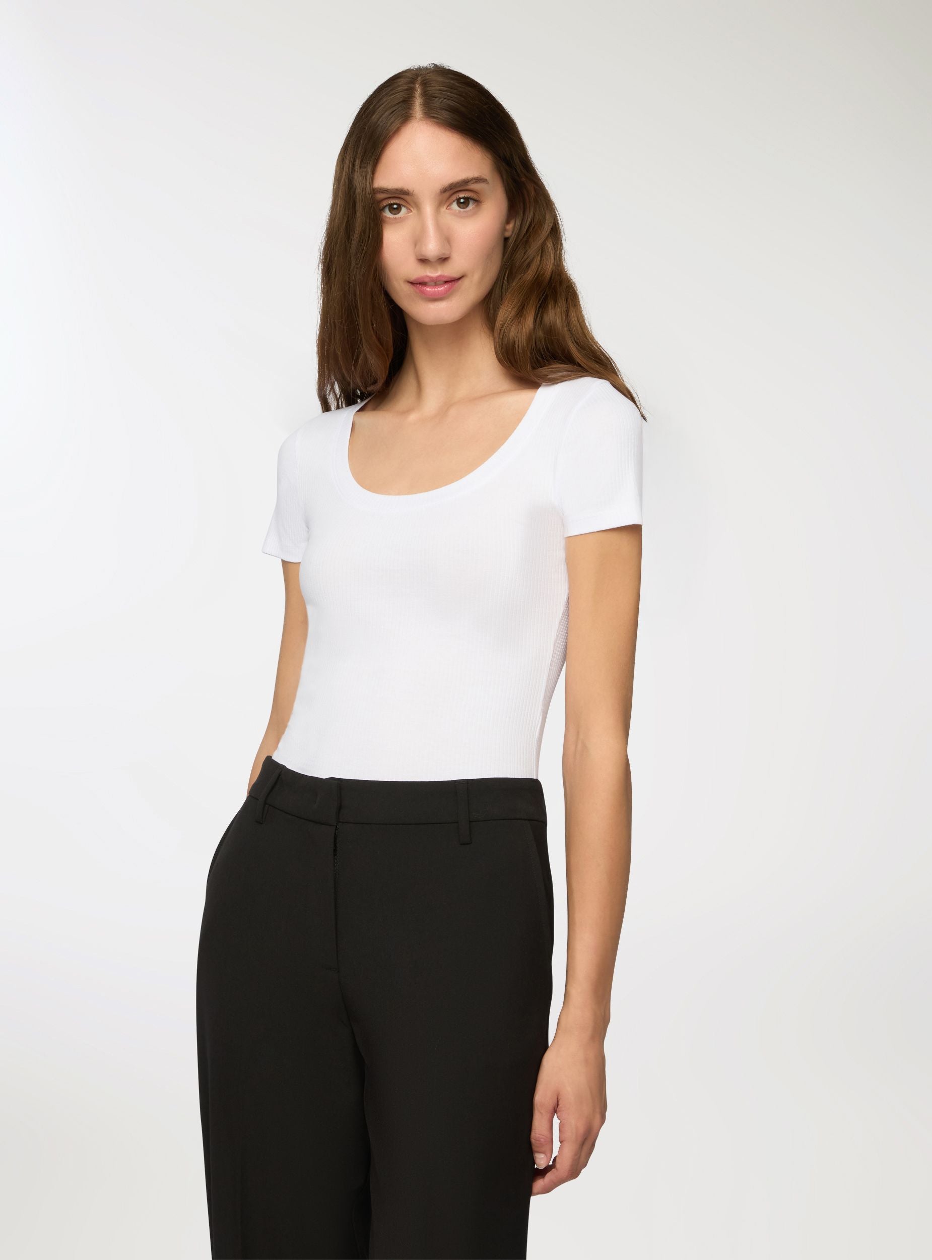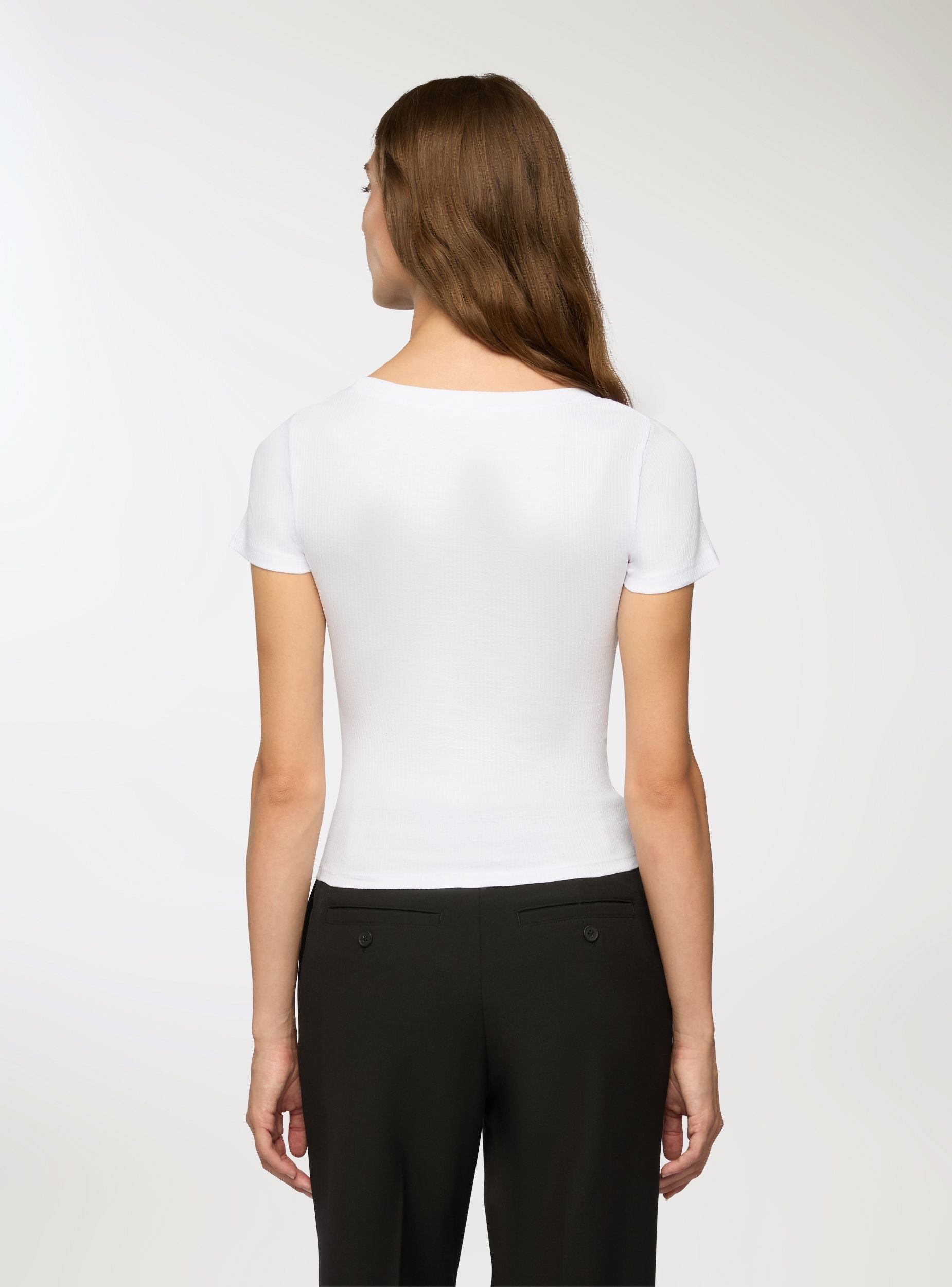 Dámské tričko se slim střihem, ideální pro ležérní a všestranný vzhled. Má jednobarevný žebrovaný vzor, který přidává kousku na stylu. Perfektní k džínům nebo kalhotám pro každodenní outfit. Kulatý výstřih a krátké rukávy zajišťují pohodlí a vhodnost pro různé příležitosti. Nezbytný kousek v šatníku každé ženy.Detaily