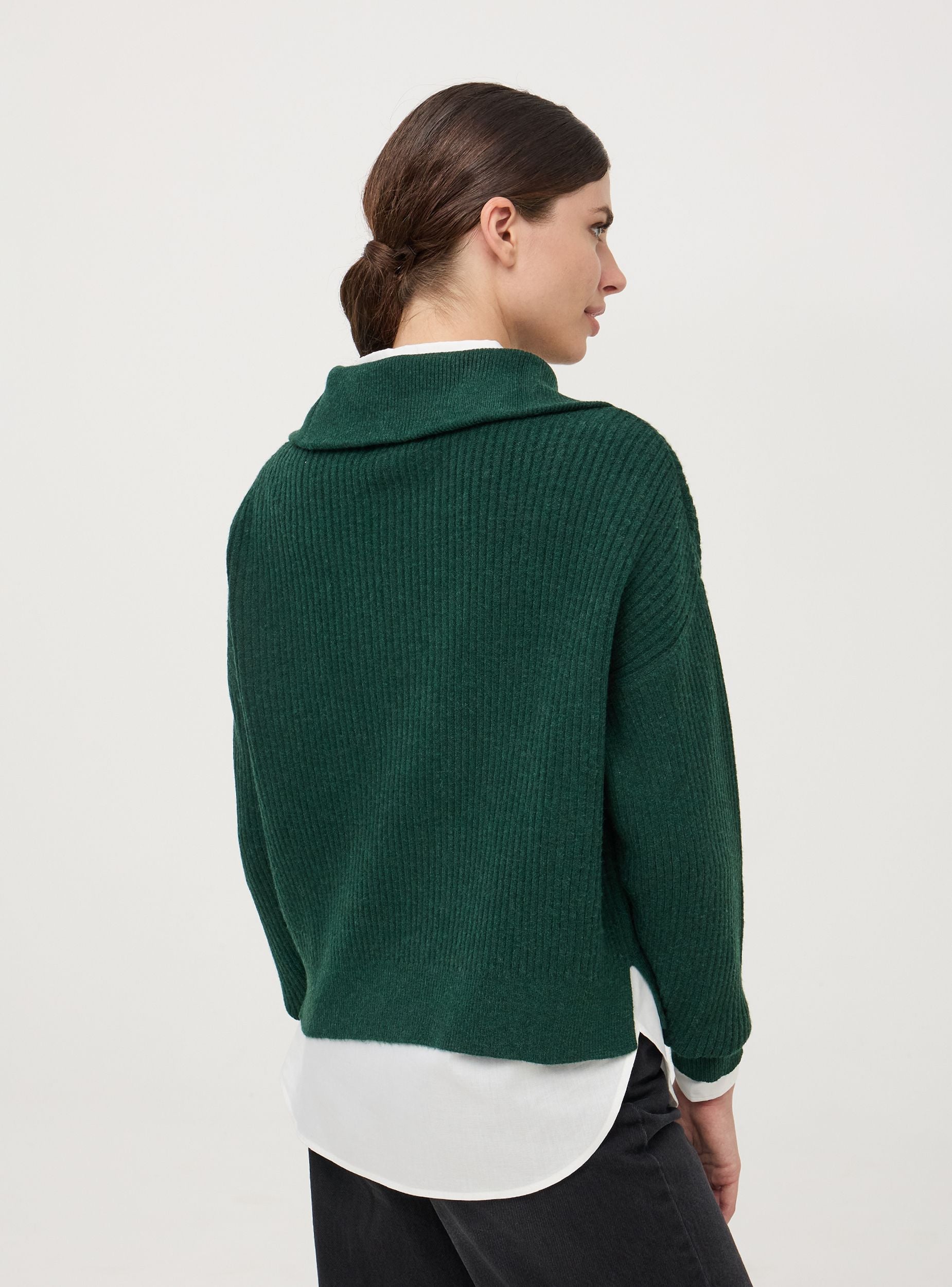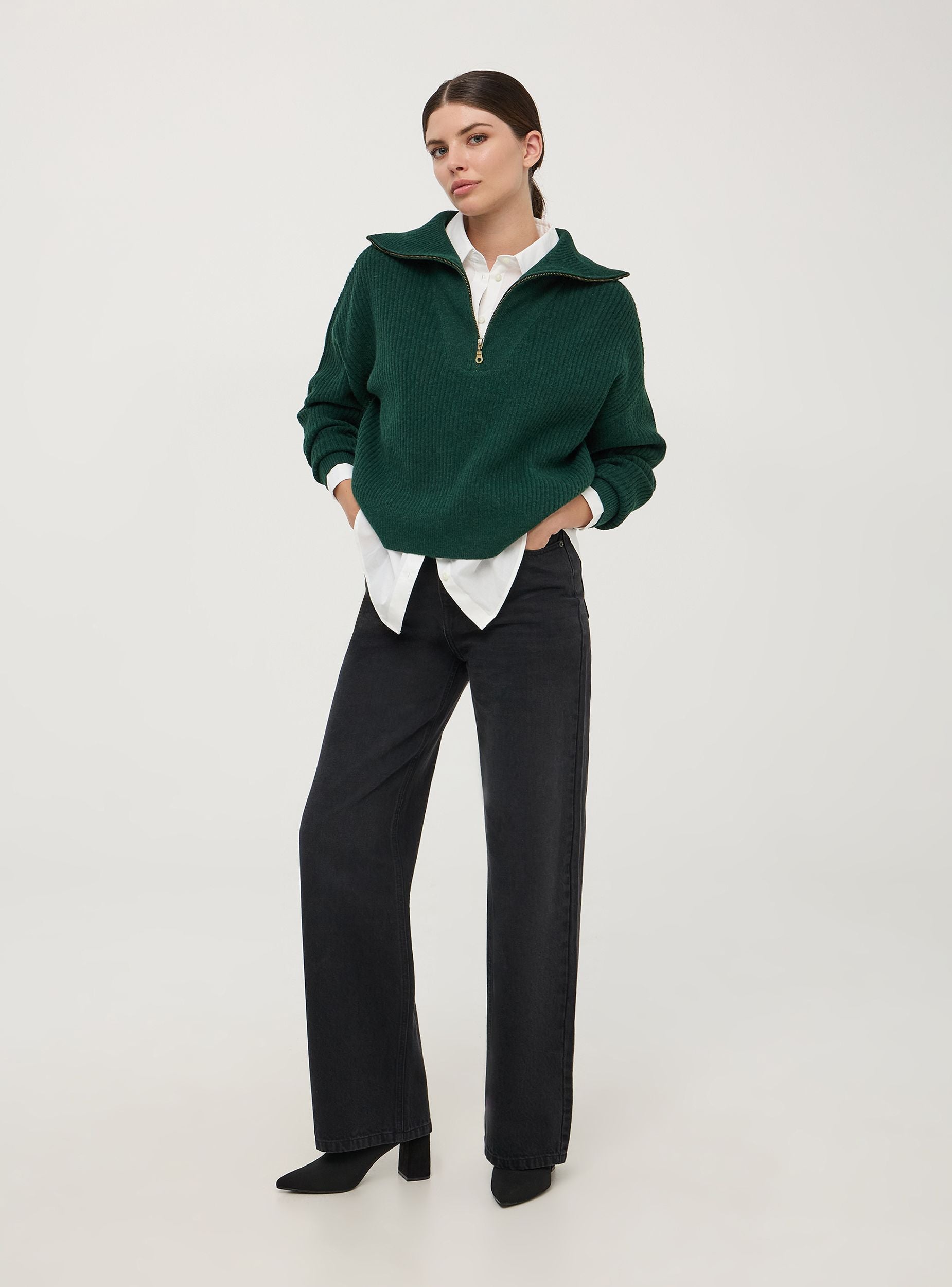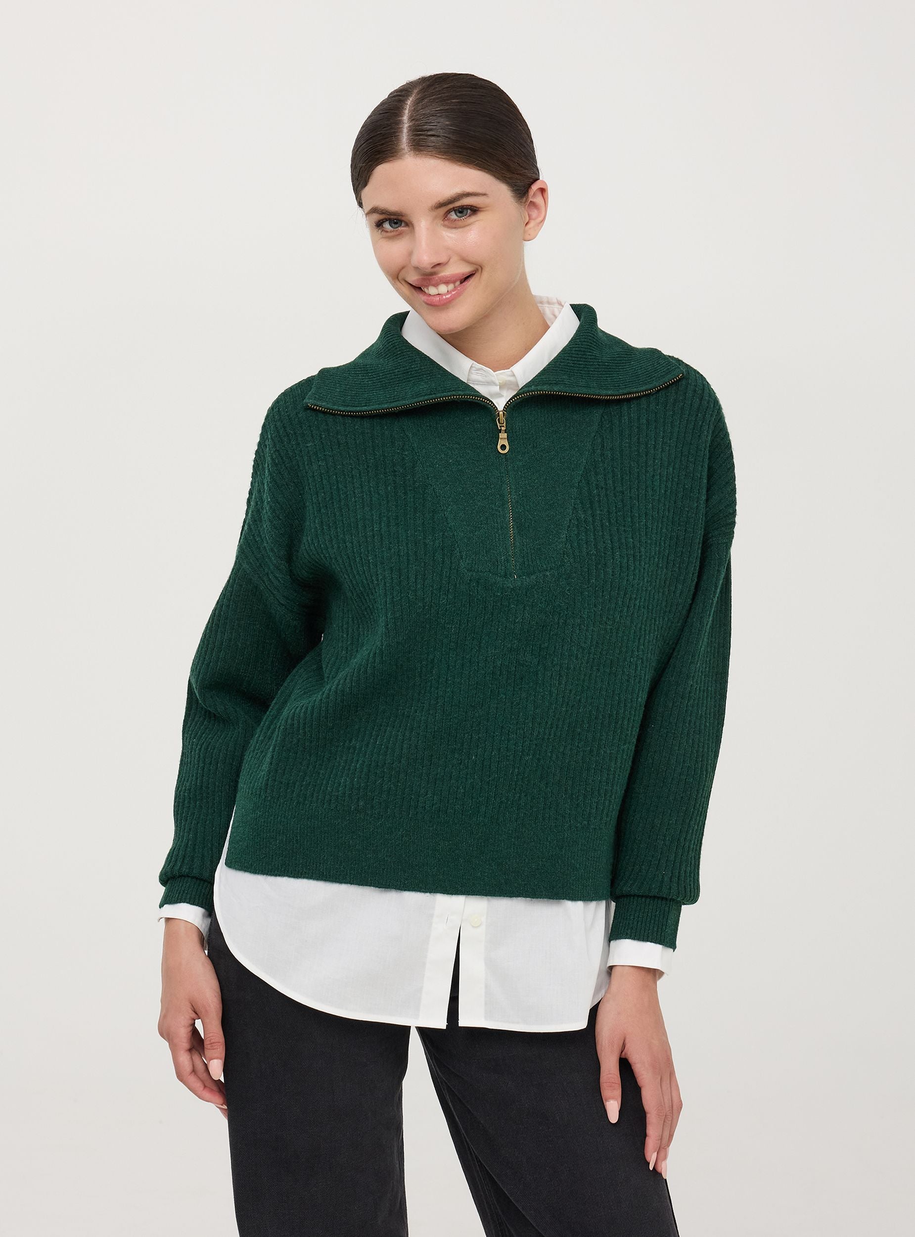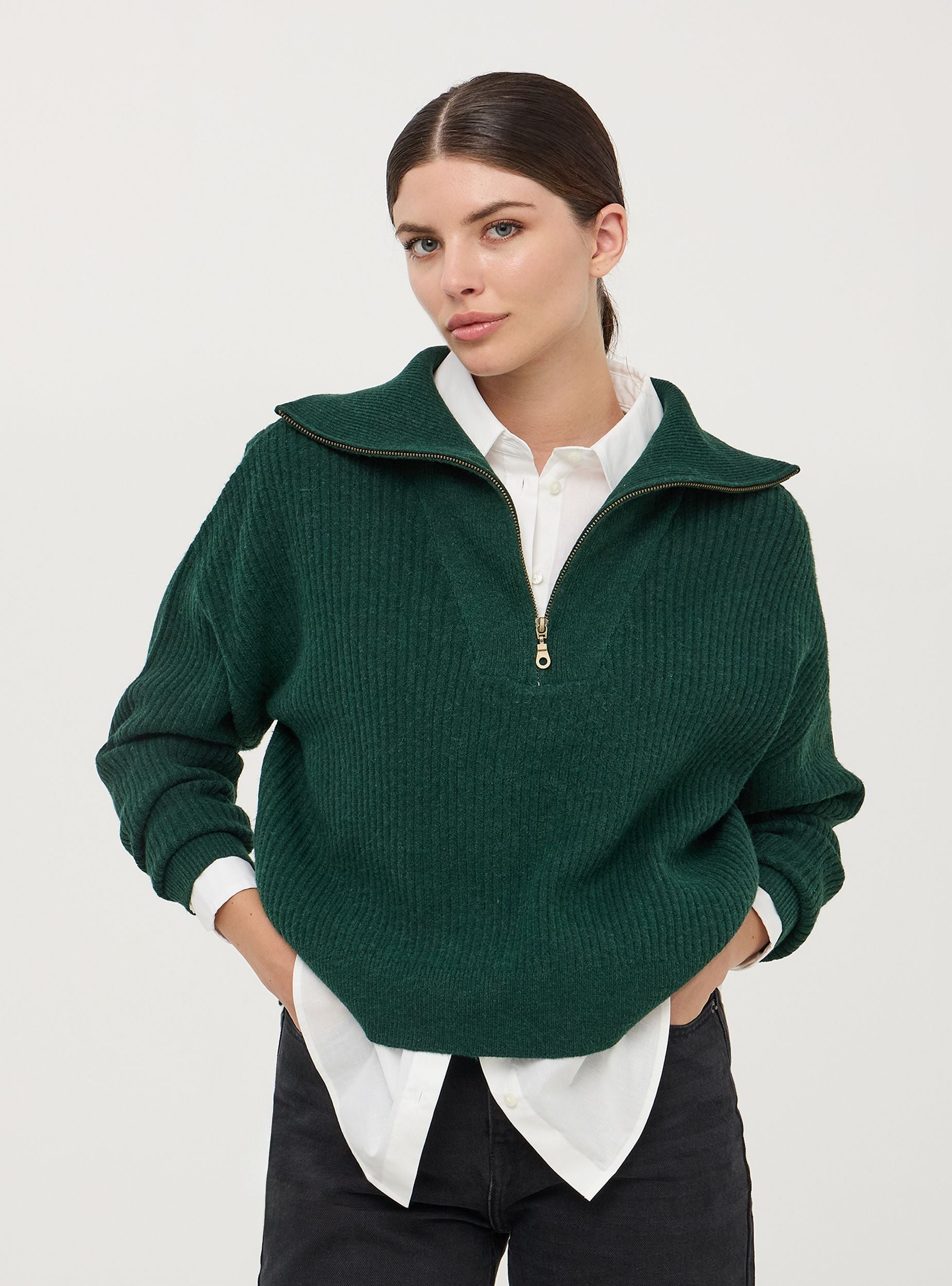 Dámský svetr s vysokým límcem a zipem. Má strukturu s žebrováním. Design zahrnuje žebrované okraje na manžetách i na lemu, což zajišťuje pohodlné a přiléhavé nošení. Přední zip umožňuje regulovat otevření límce pro větší stylovou variabilitu a pohodlí.