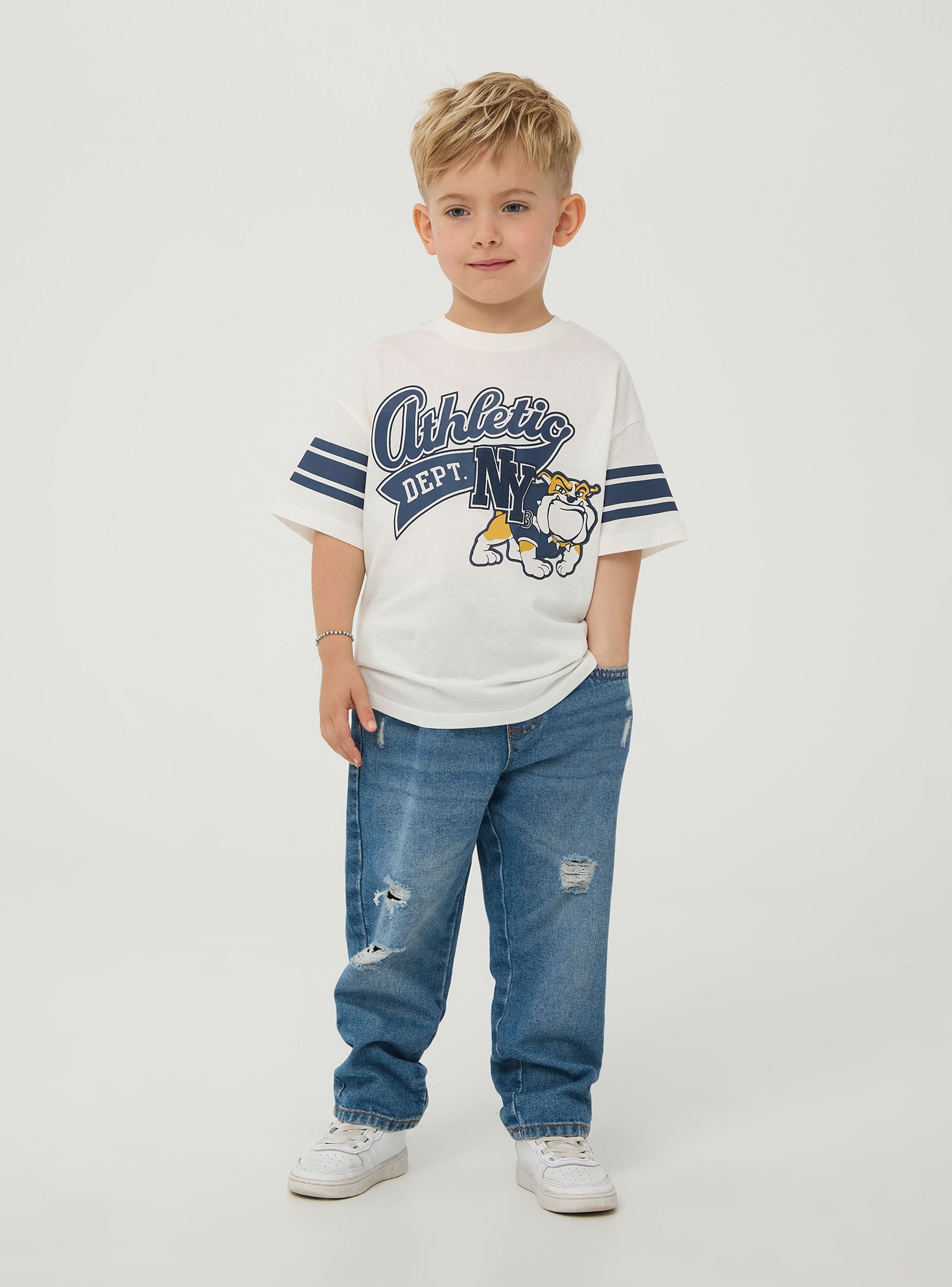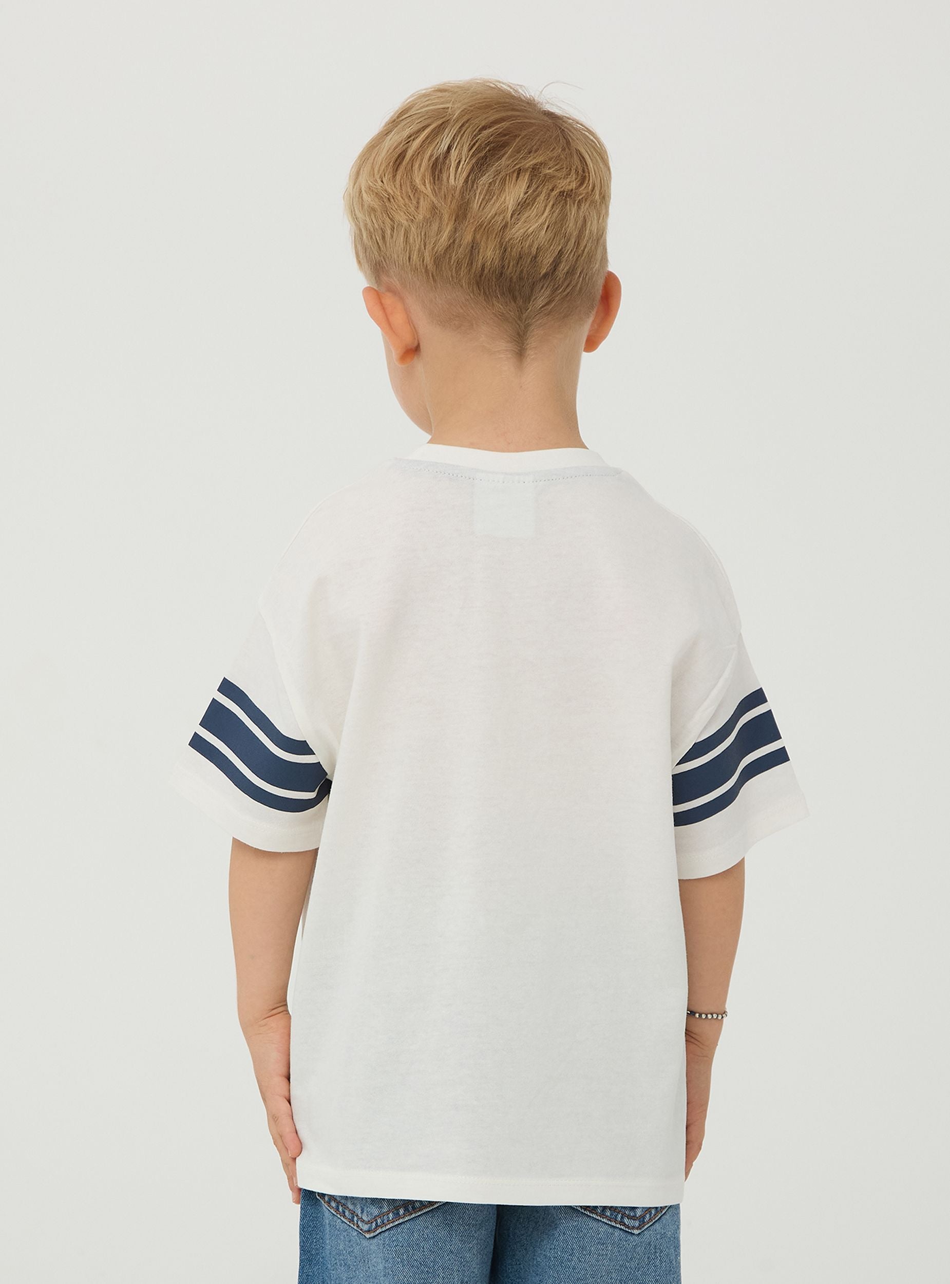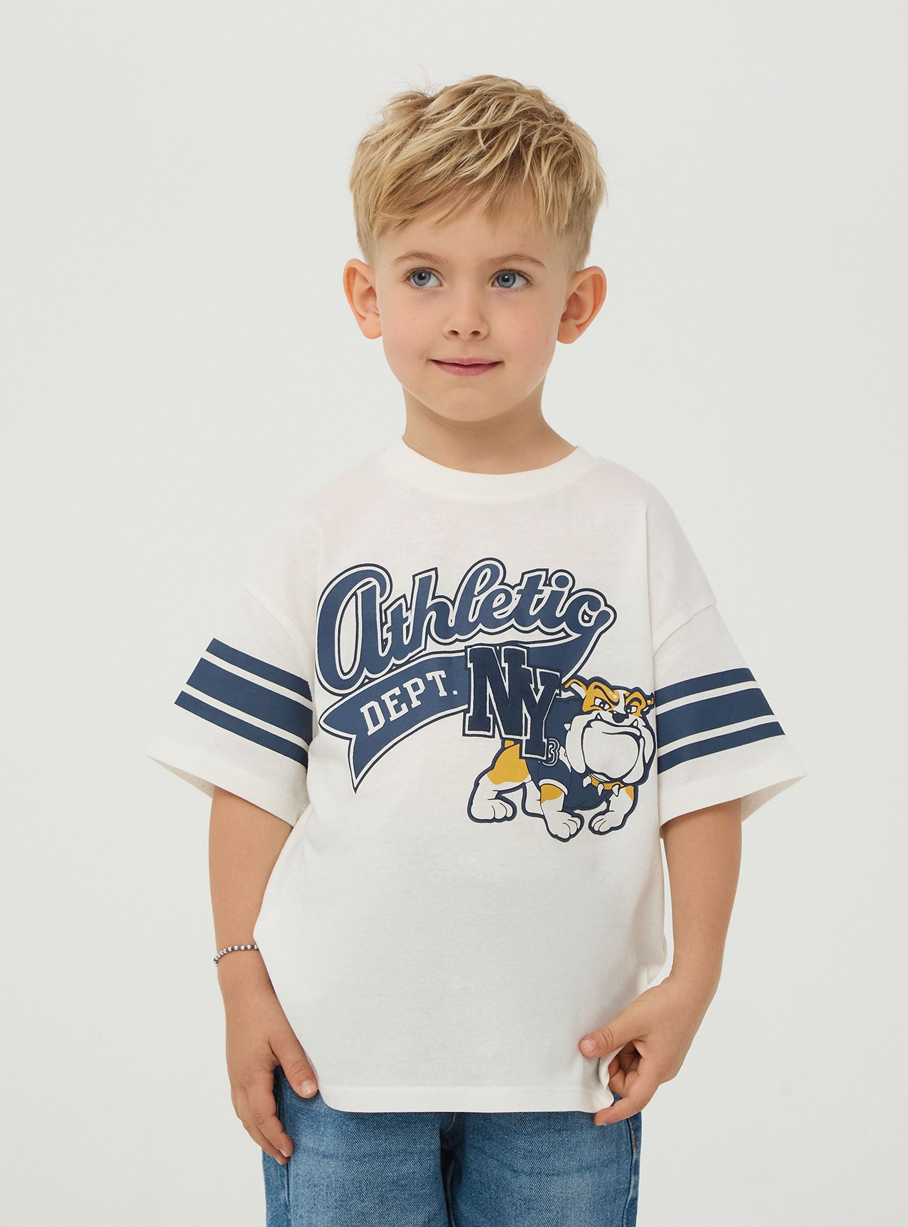 Dětské tričko z bavlněného žerzeje s college potiskem. Model s kulatým výstřihem a krátkými rukávy se pruhy. Regular fit.Detaily