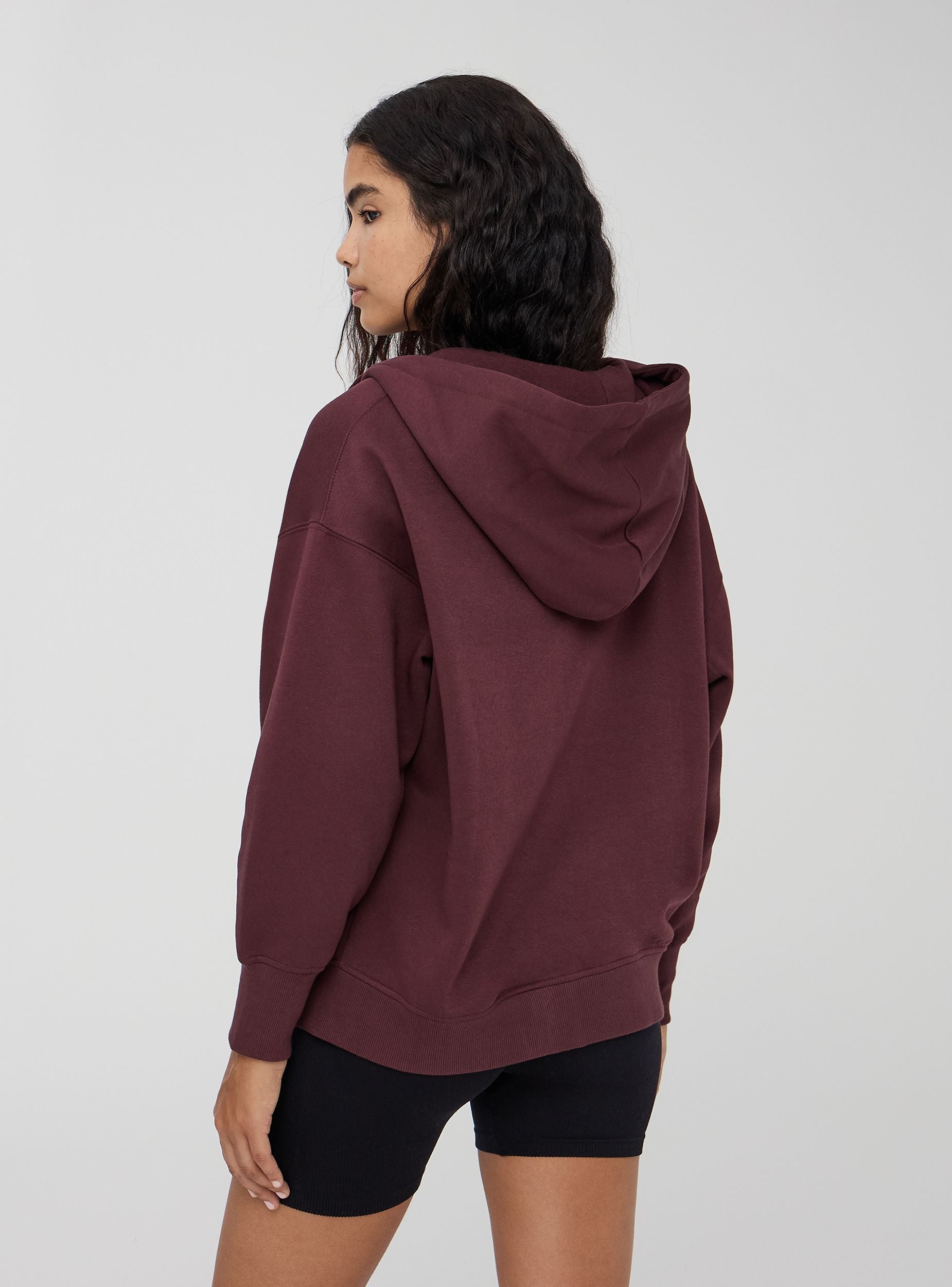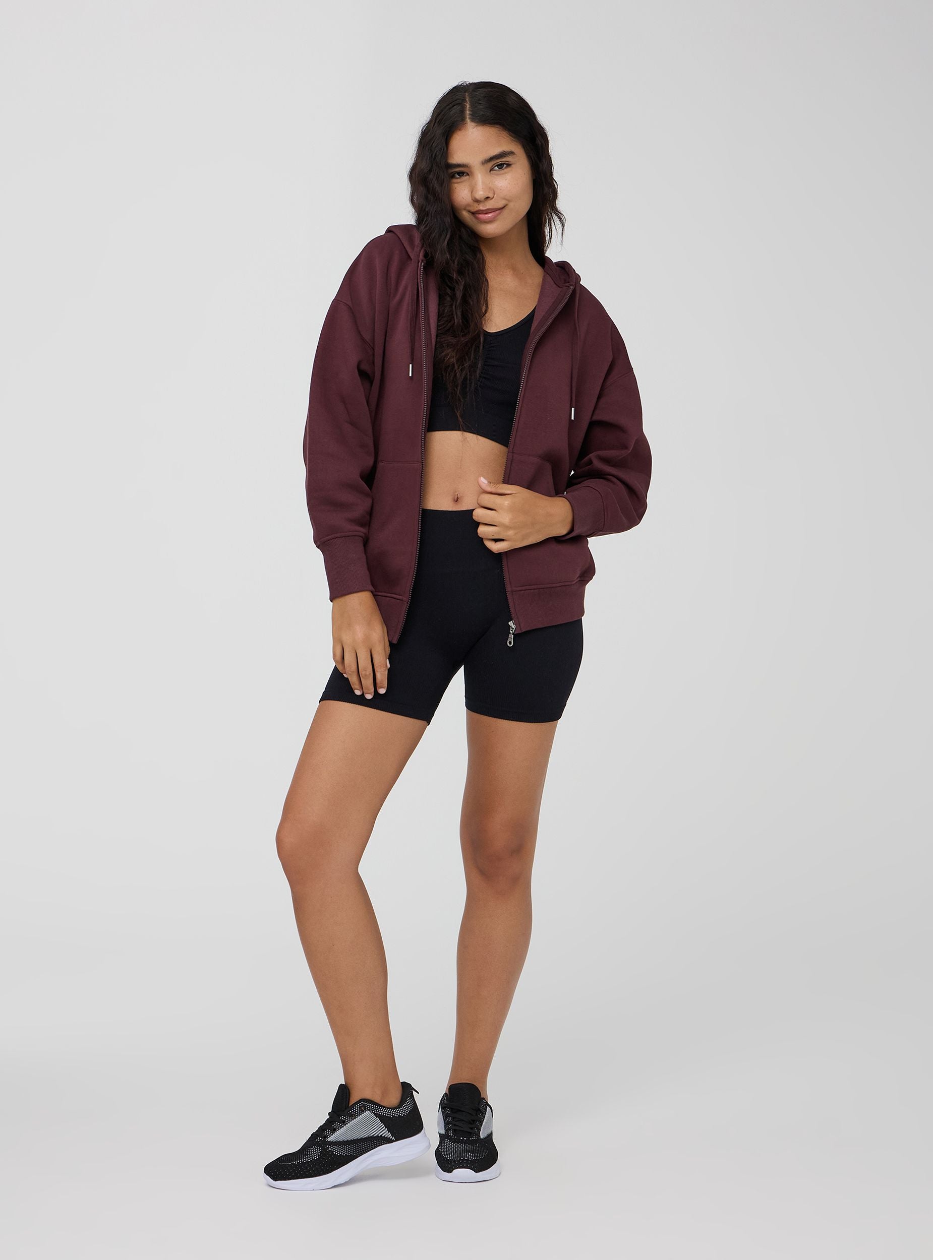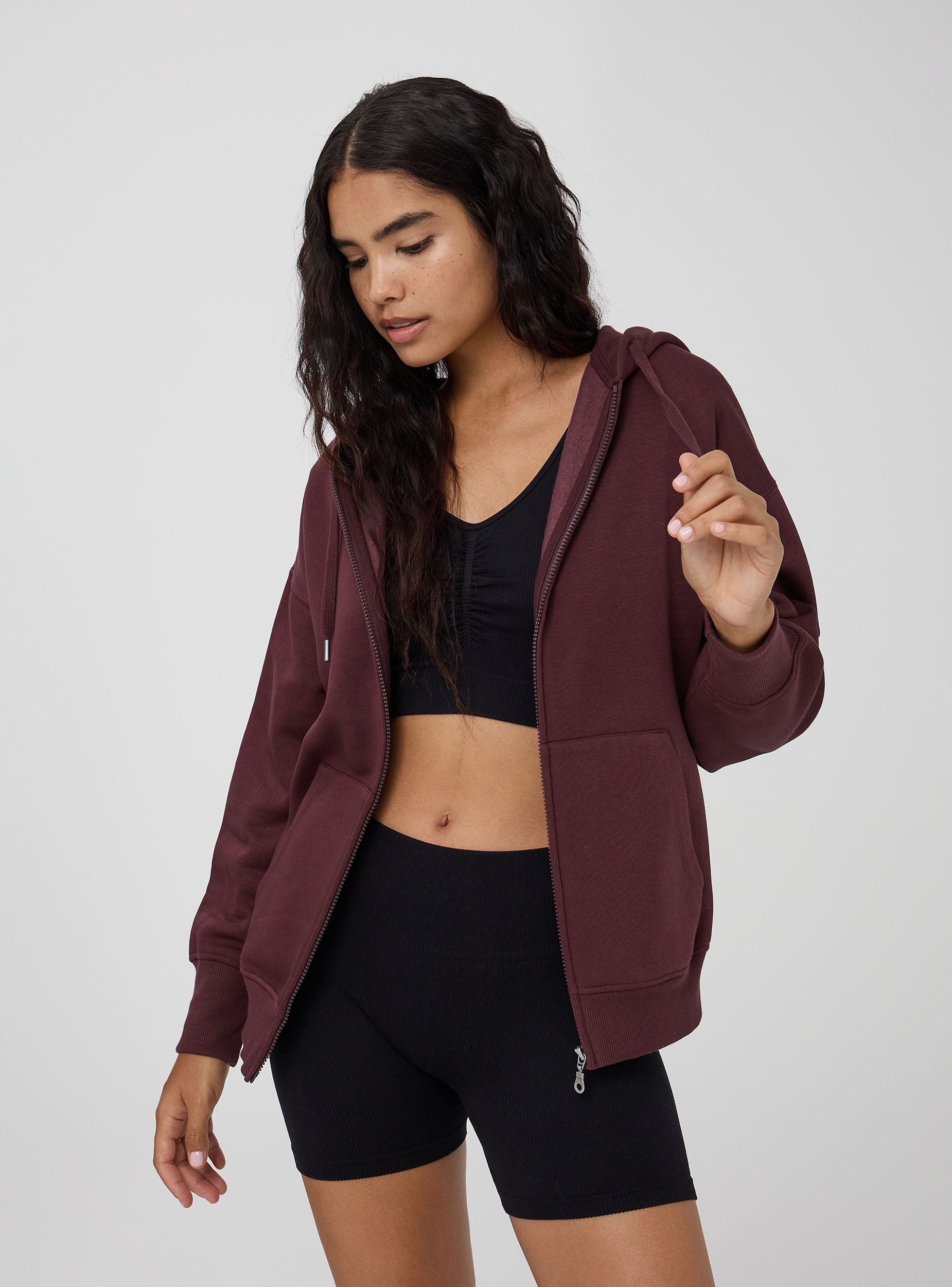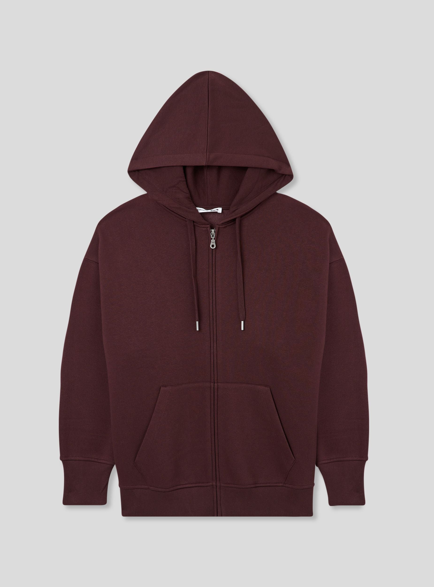 Dámská mikina s kapucí a stahovací šňůrkou, zapínání na zip a přední klokaní kapsy, z těžké jednobarevné tkaniny. Perfektní pro pohodlné a ležérní outfity. Volný střih.Detaily