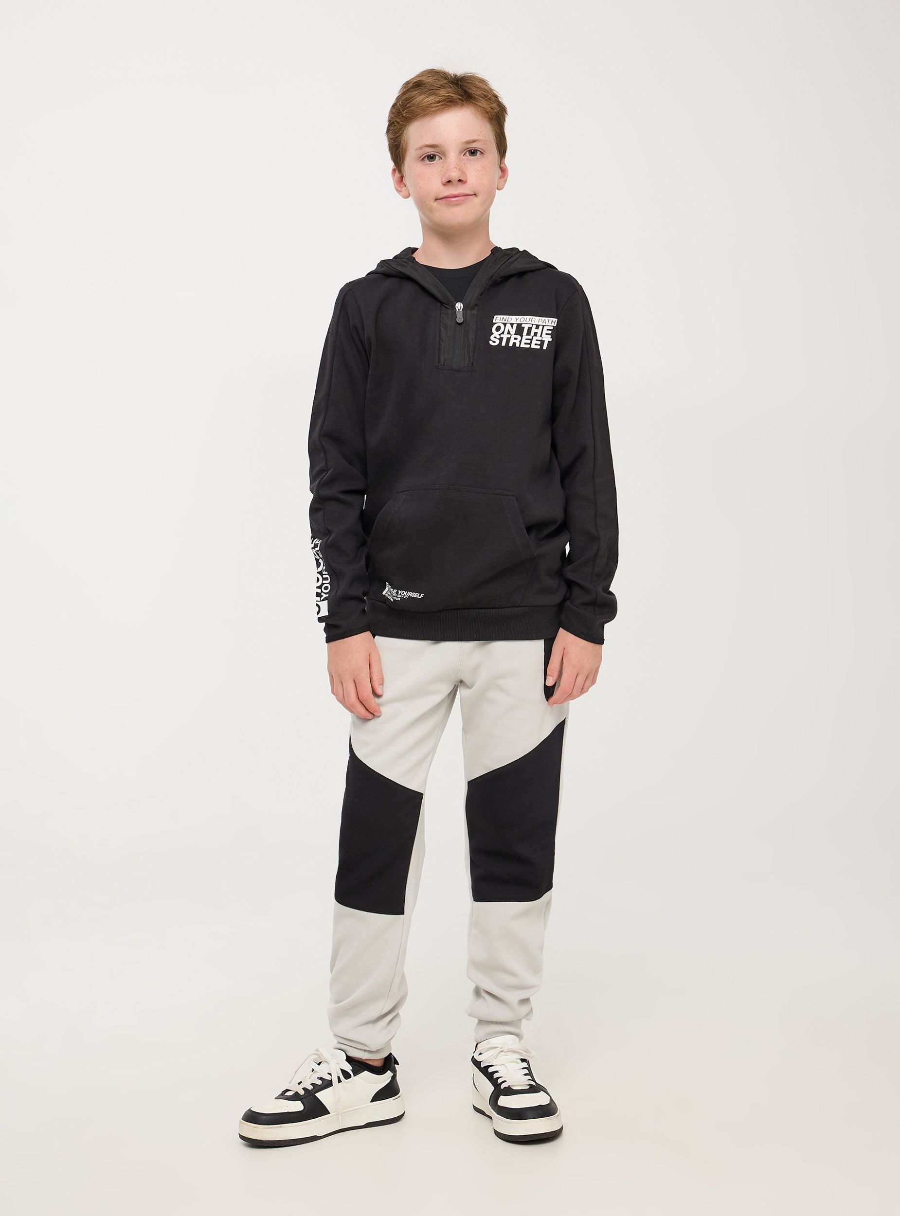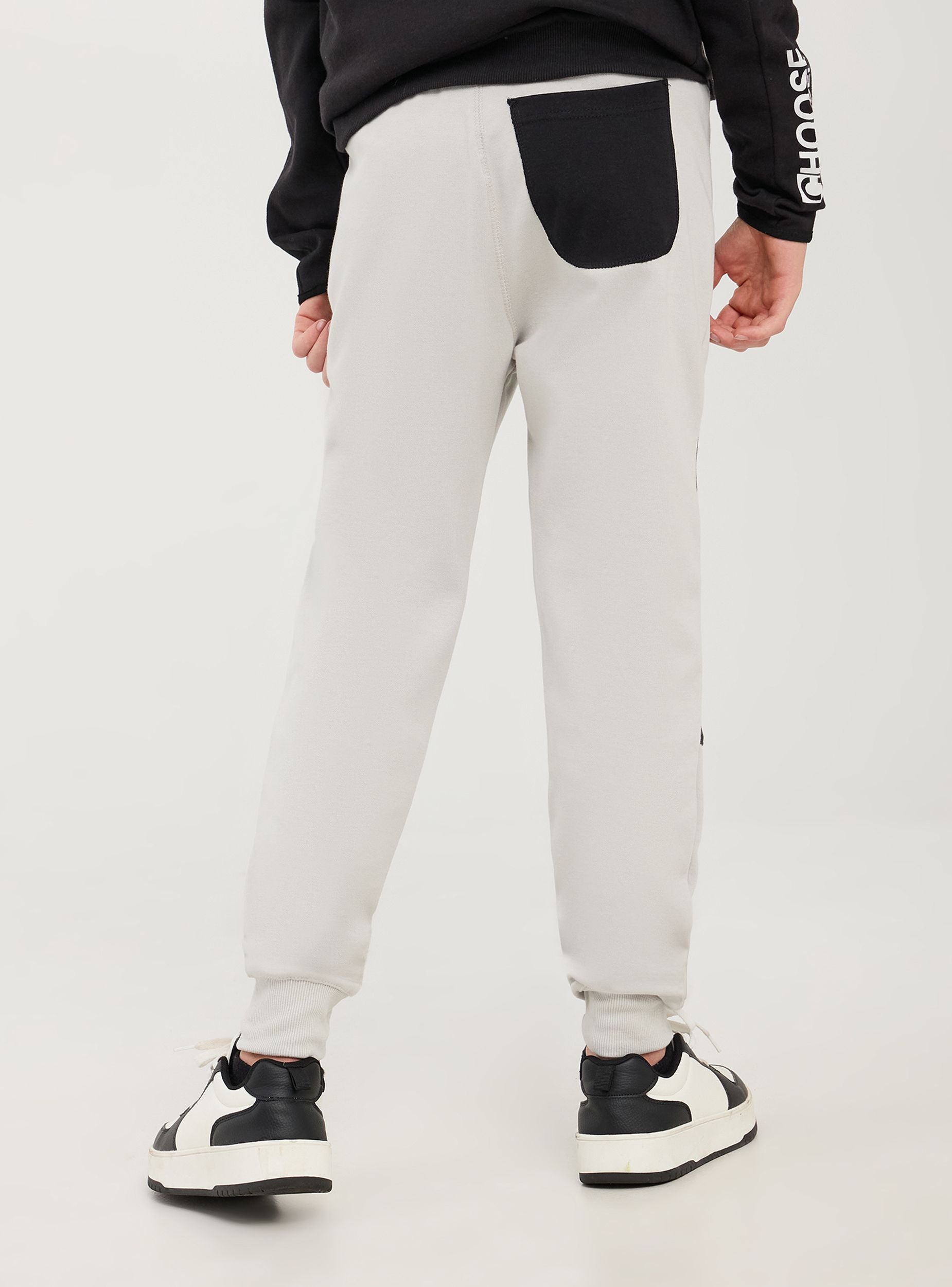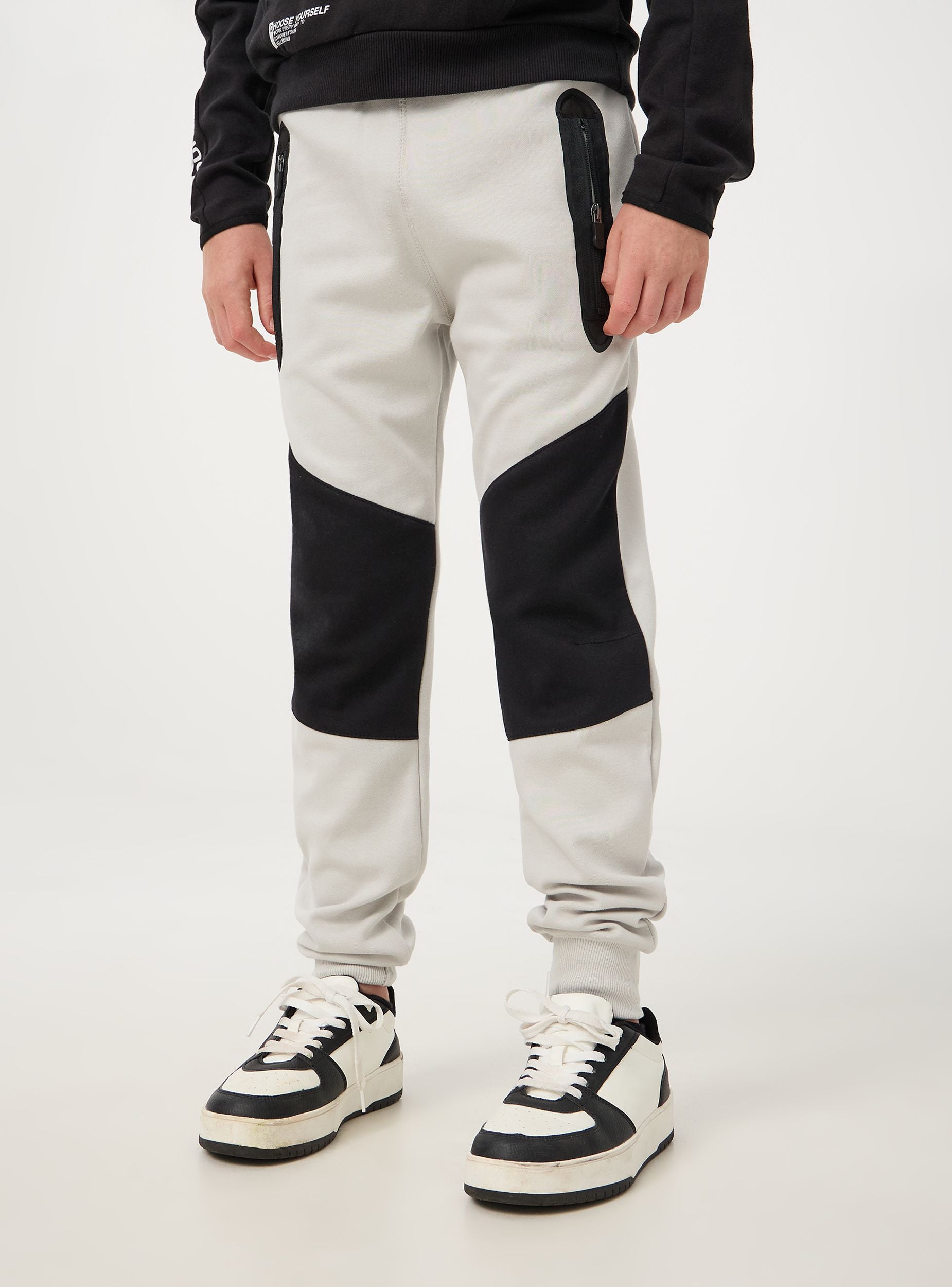 Tyto dětské teplákové kalhoty nabízejí pohodlný a sportovní střih. Vyrobeny z těžkého materiálu. Mají elastický pas se šňůrkou a dvě praktické vertikální kapsy na zip, které dodávají moderní vzhled. Jsou vybaveny náprsní kapsou na zadní straně. Šikmé švy na nohavicích a elastické manžety na kotnících zajišťují dokonalý ležérní vzhled pro každodenní aktivity nebo relaxační dny.Detaily