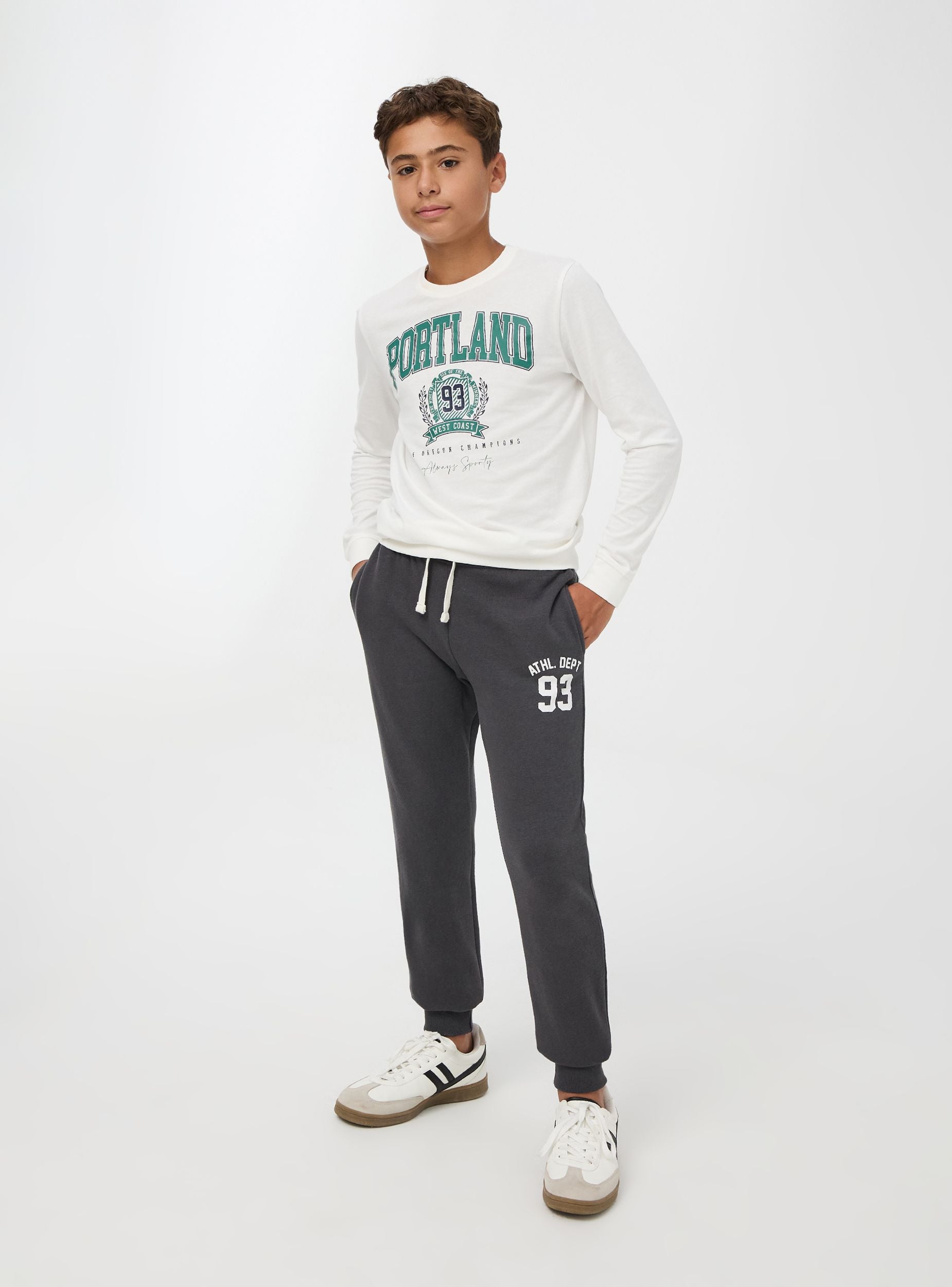 Těžké kalhoty pro dětskou soupravu nabízejí pohodlí a styl pro volný čas. Design s nastavitelným stahováním v pase zajišťuje pohodlné nošení. Jsou vybaveny praktickými bočními kapsami a potiskem "ATHL DEPT 93" na levém stehně. Rybí okraj dodává moderní nádech, což je činí ideálními pro neformální aktivity, lehké tréninky nebo chvíle odpočinku.