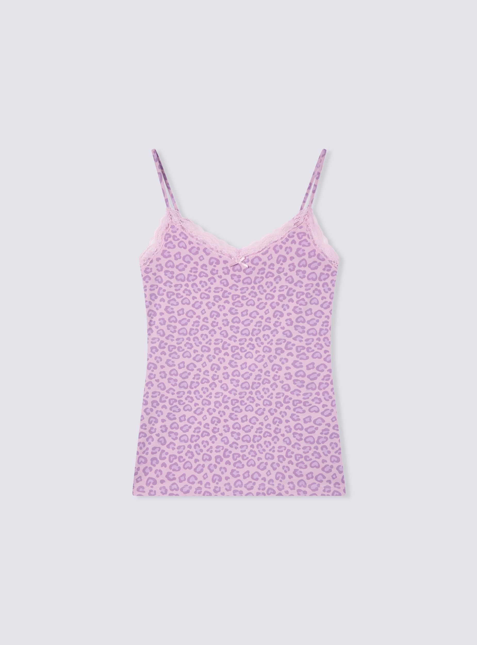 Dámská tílko s svůdným a ženským designem, zdobené zvířecím potiskem, který dodává odvážný a moderní nádech. Tenké ramínka zajišťují jemné padnutí, zatímco krajka podél výstřihu dodává romantický efekt. Přední mašle dokončuje vzhled s rafinovaným detailem. Ideální jako spodní prádlo nebo pod otevřenou košilí pro trendy a všestranný outfit.