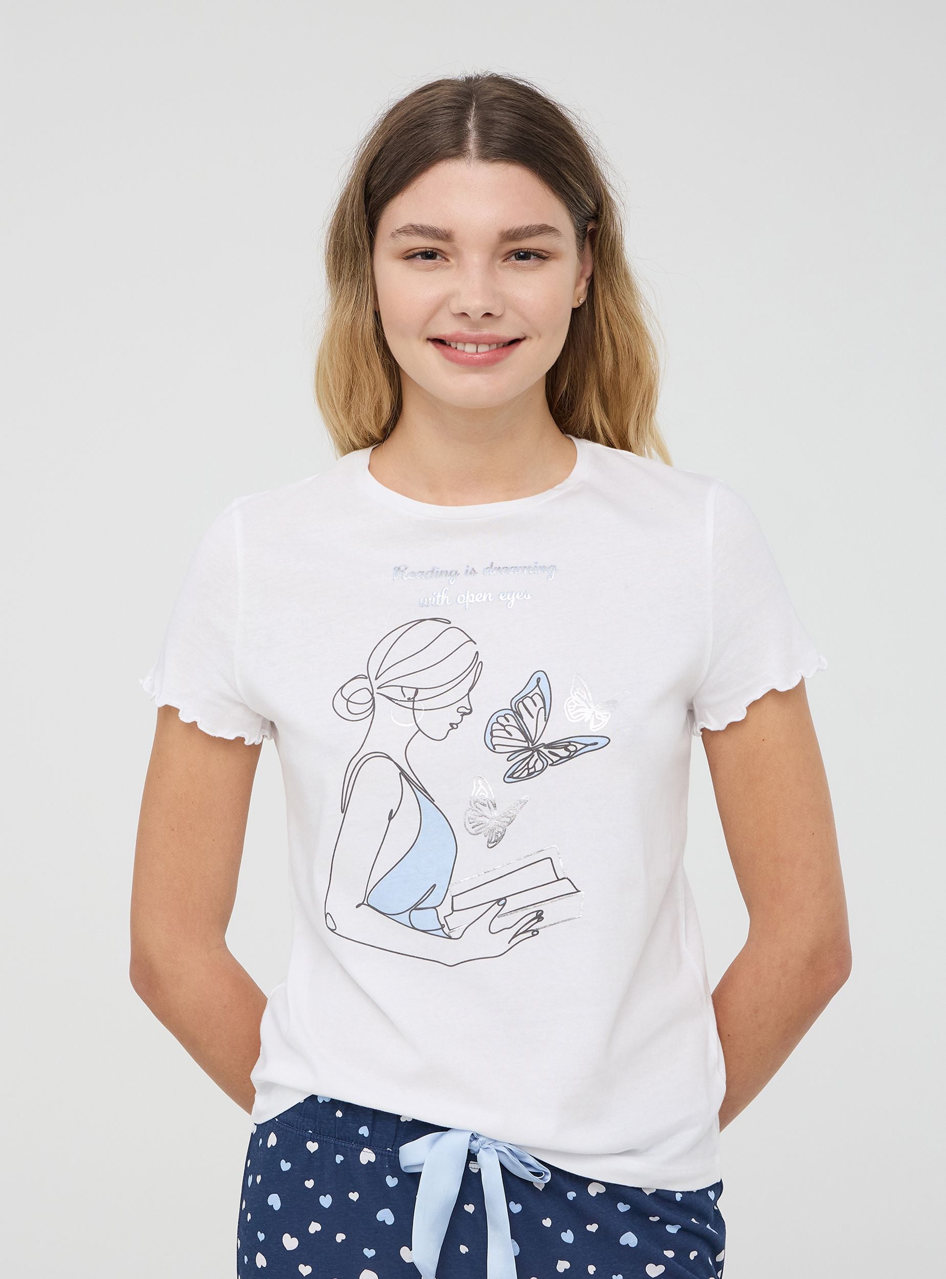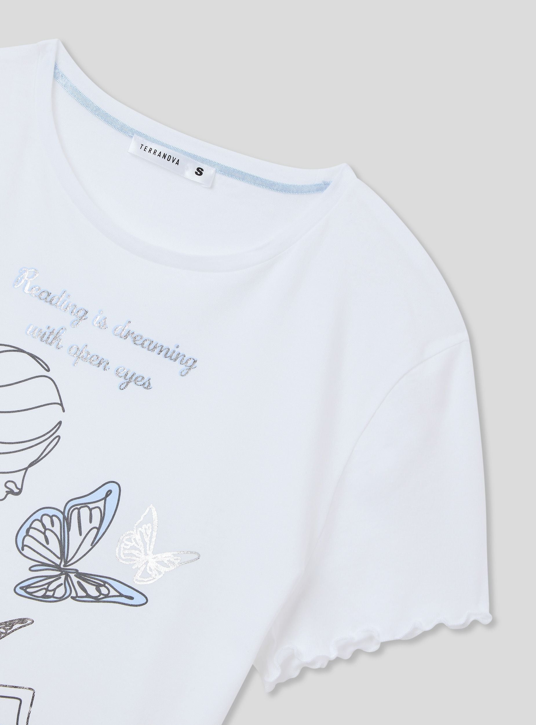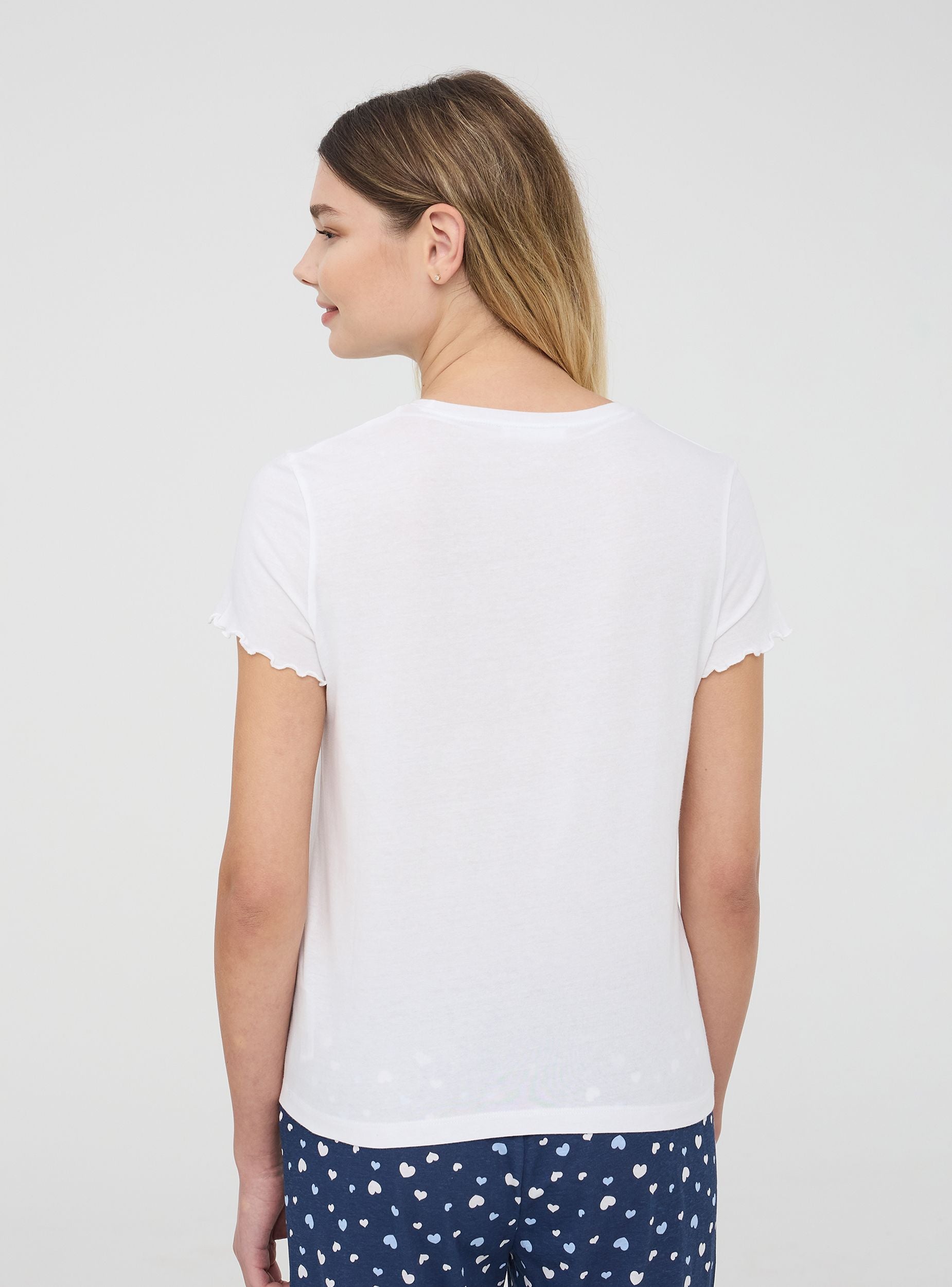 Dámské pyžamové tričko s kulatým výstřihem, charakterizované dekorativním potiskem na přední straně, který dodává designu jemný a snový nádech. Krátké rukávy doplňují tento kousek, což z něj činí ideální volbu pro zajištění pohodlí a lehkosti během noci. Perfektní kousek pro ty, kteří mají rádi relaxaci se stylem, s detaily, které odkazují na neformální eleganci.Detaily