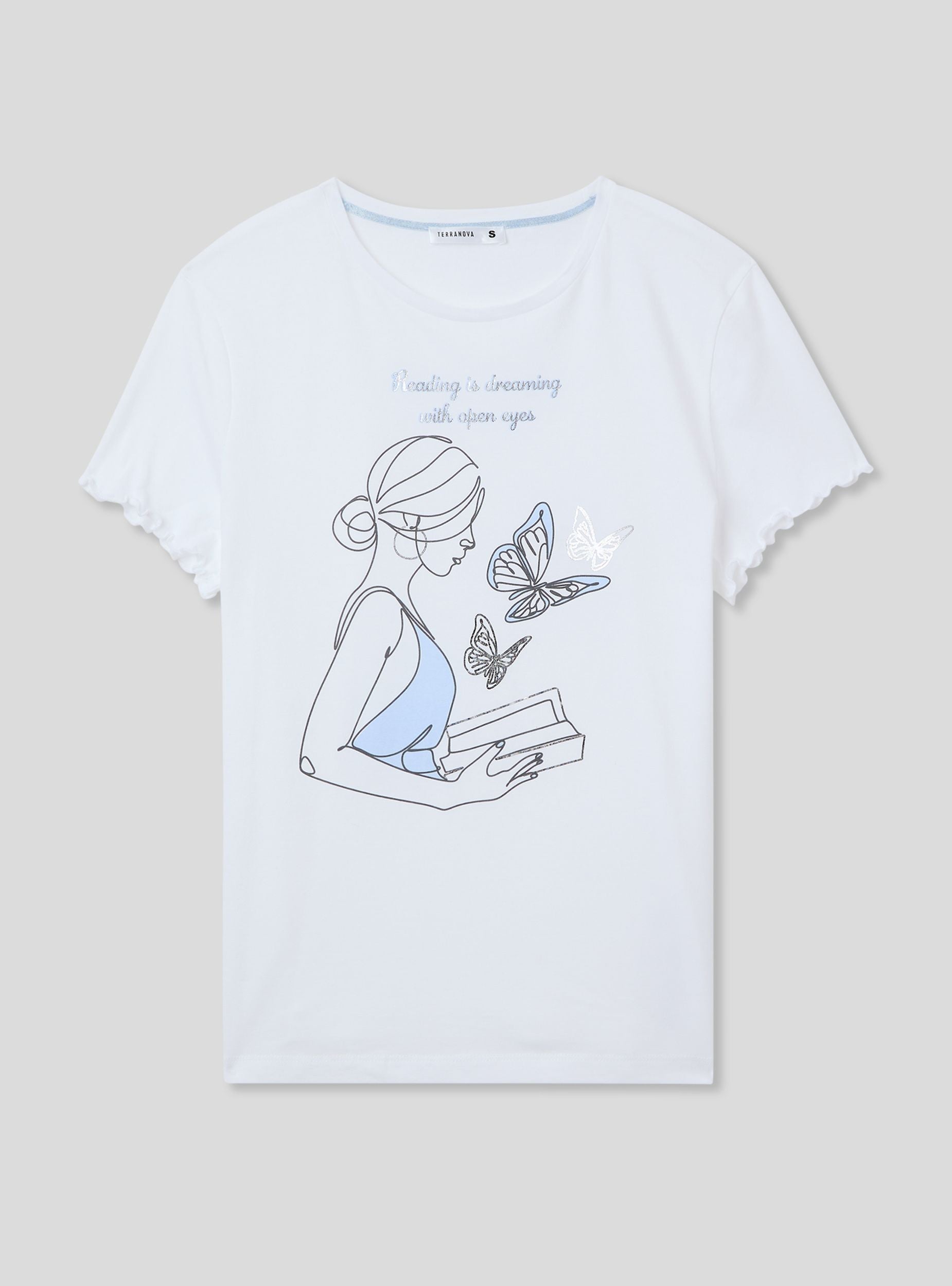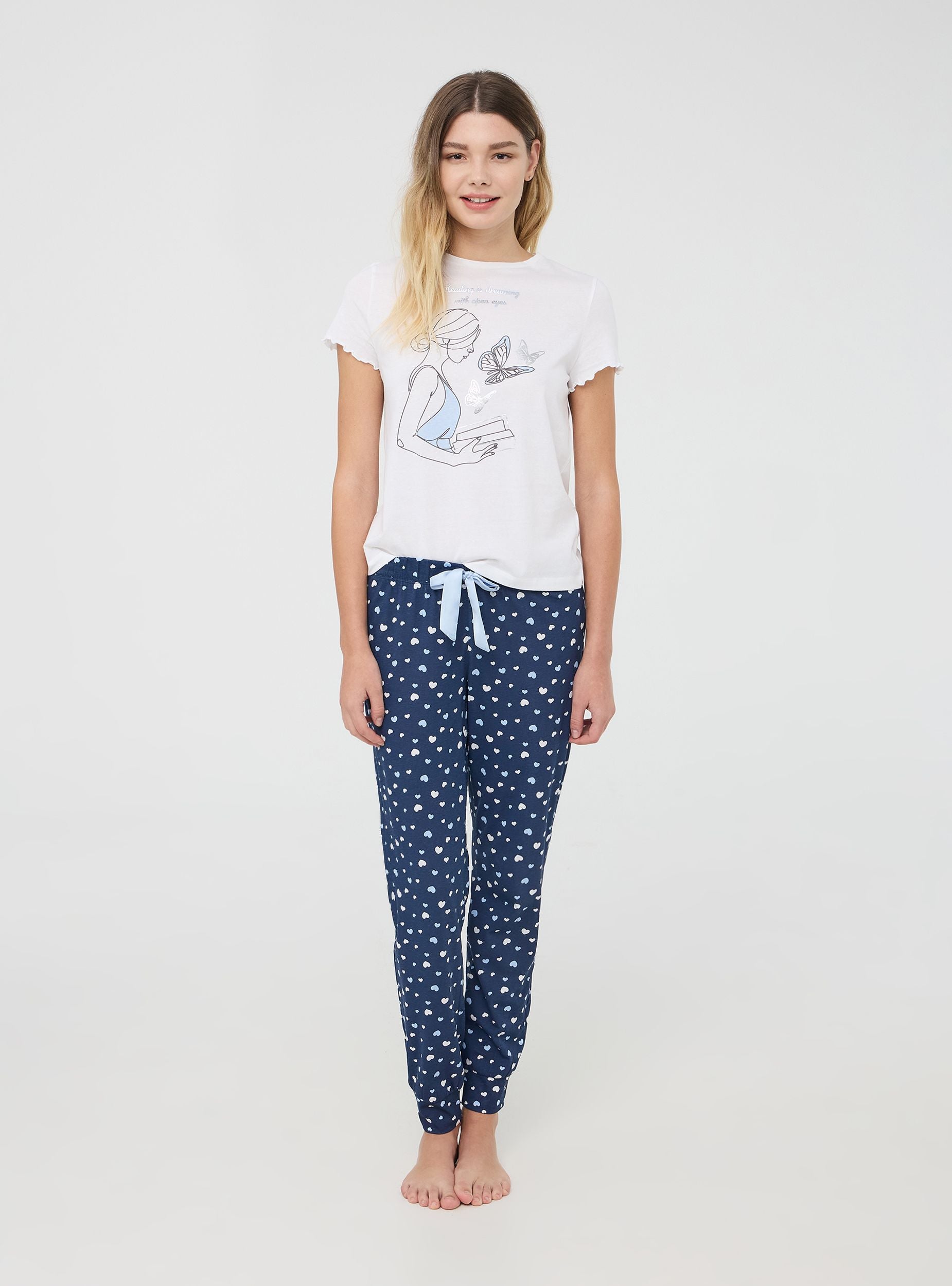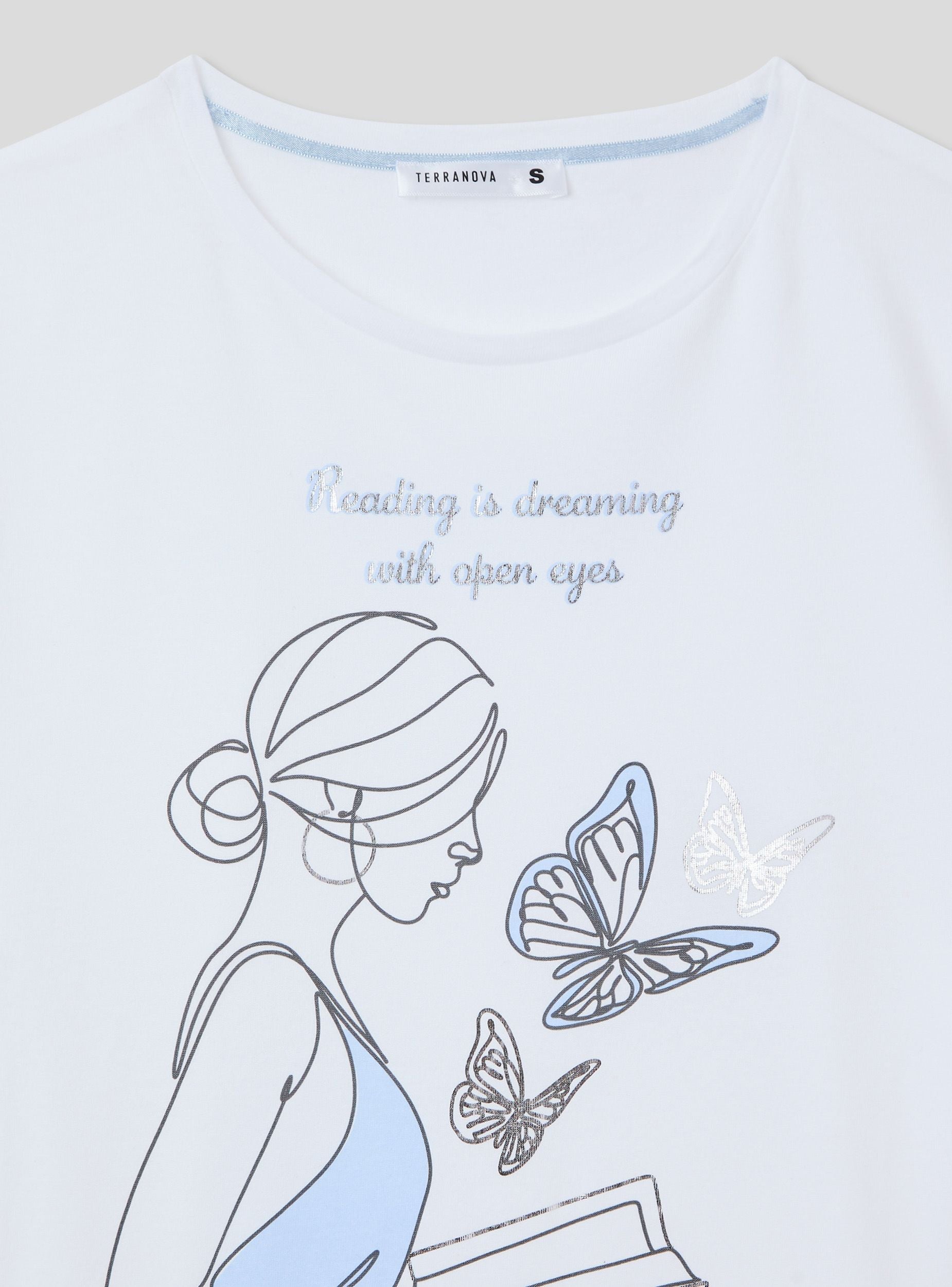 Dámské pyžamové tričko s kulatým výstřihem, charakterizované dekorativním potiskem na přední straně, který dodává designu jemný a snový nádech. Krátké rukávy doplňují tento kousek, což z něj činí ideální volbu pro zajištění pohodlí a lehkosti během noci. Perfektní kousek pro ty, kteří mají rádi relaxaci se stylem, s detaily, které odkazují na neformální eleganci.Detaily