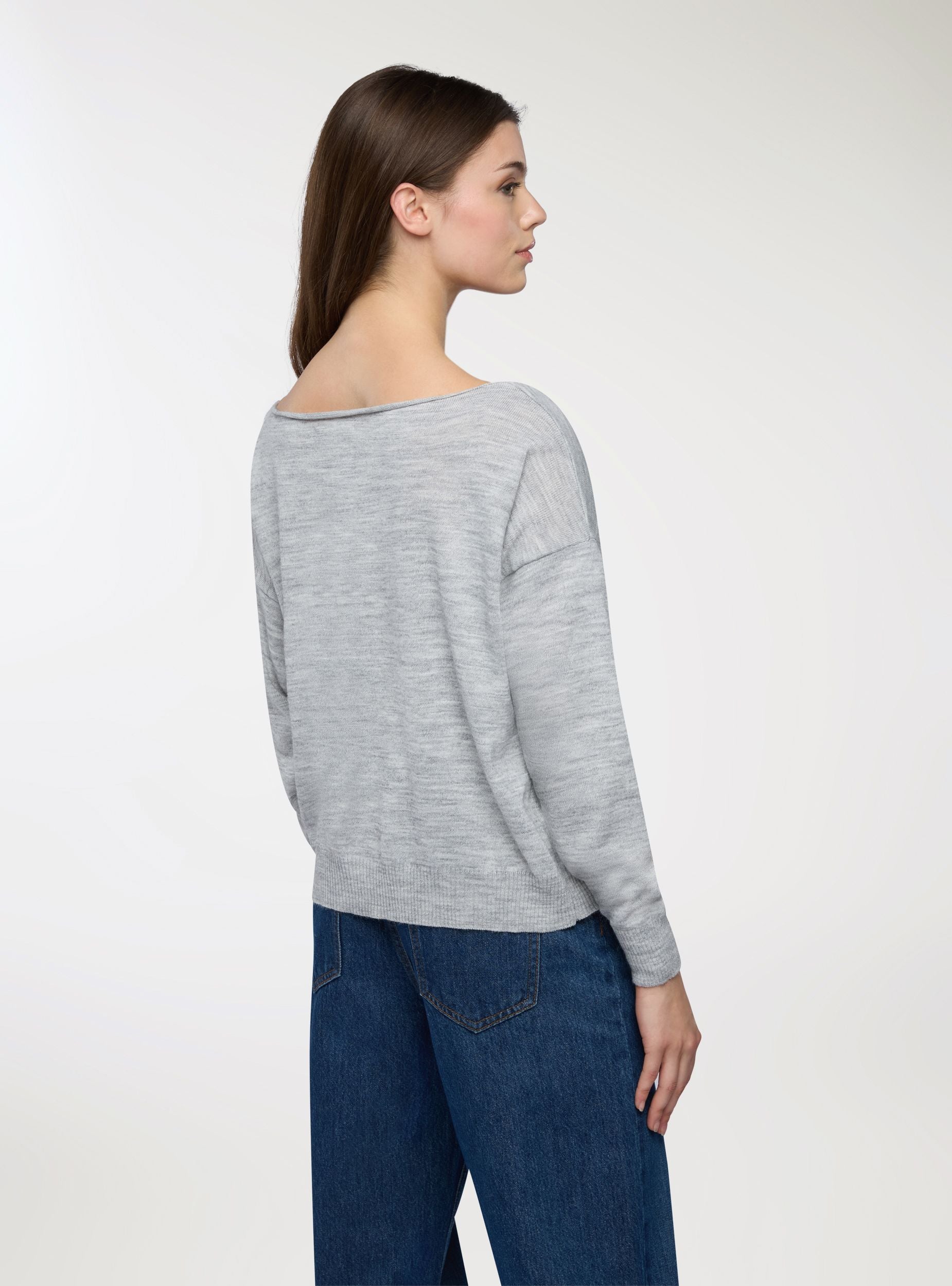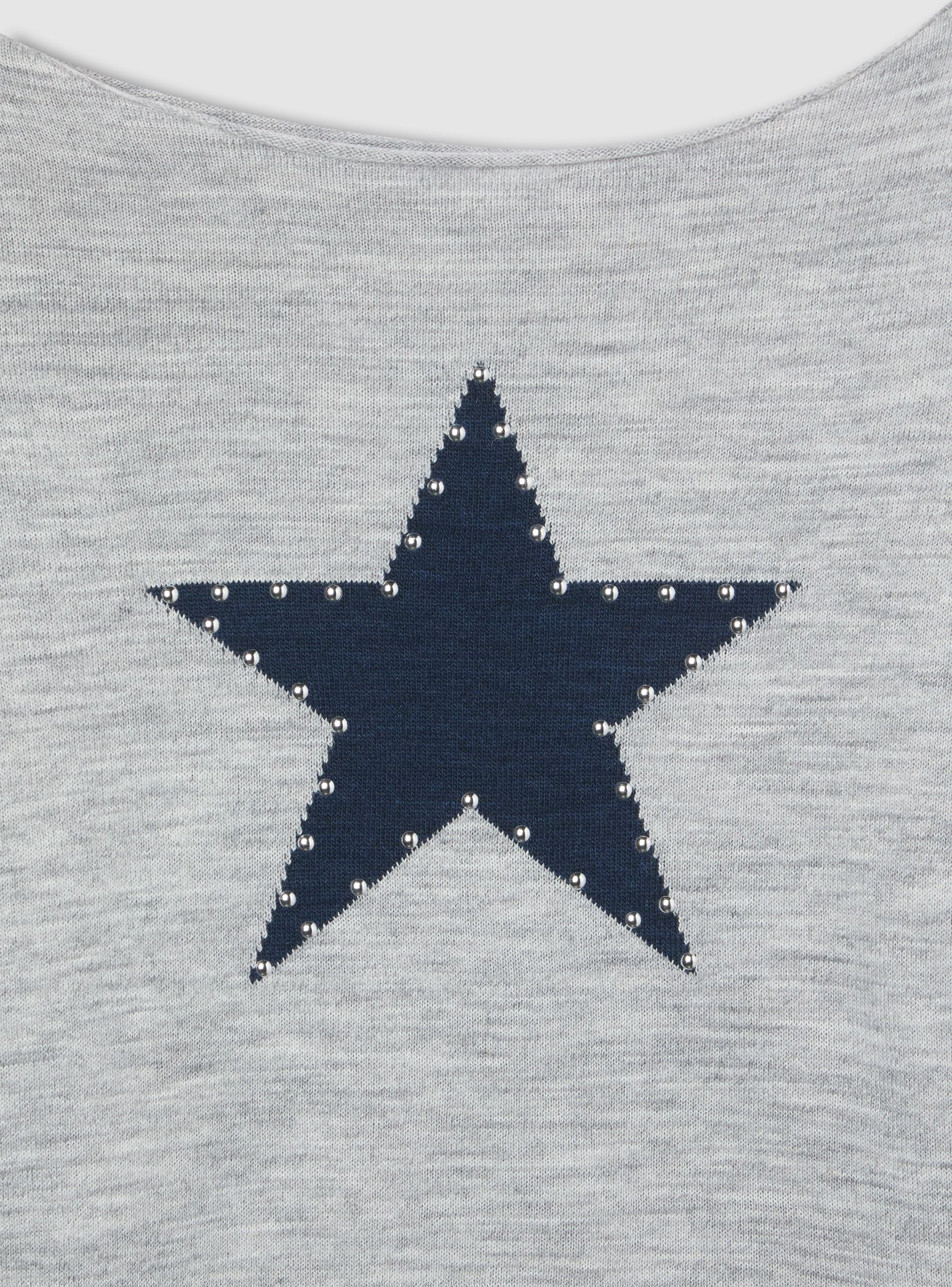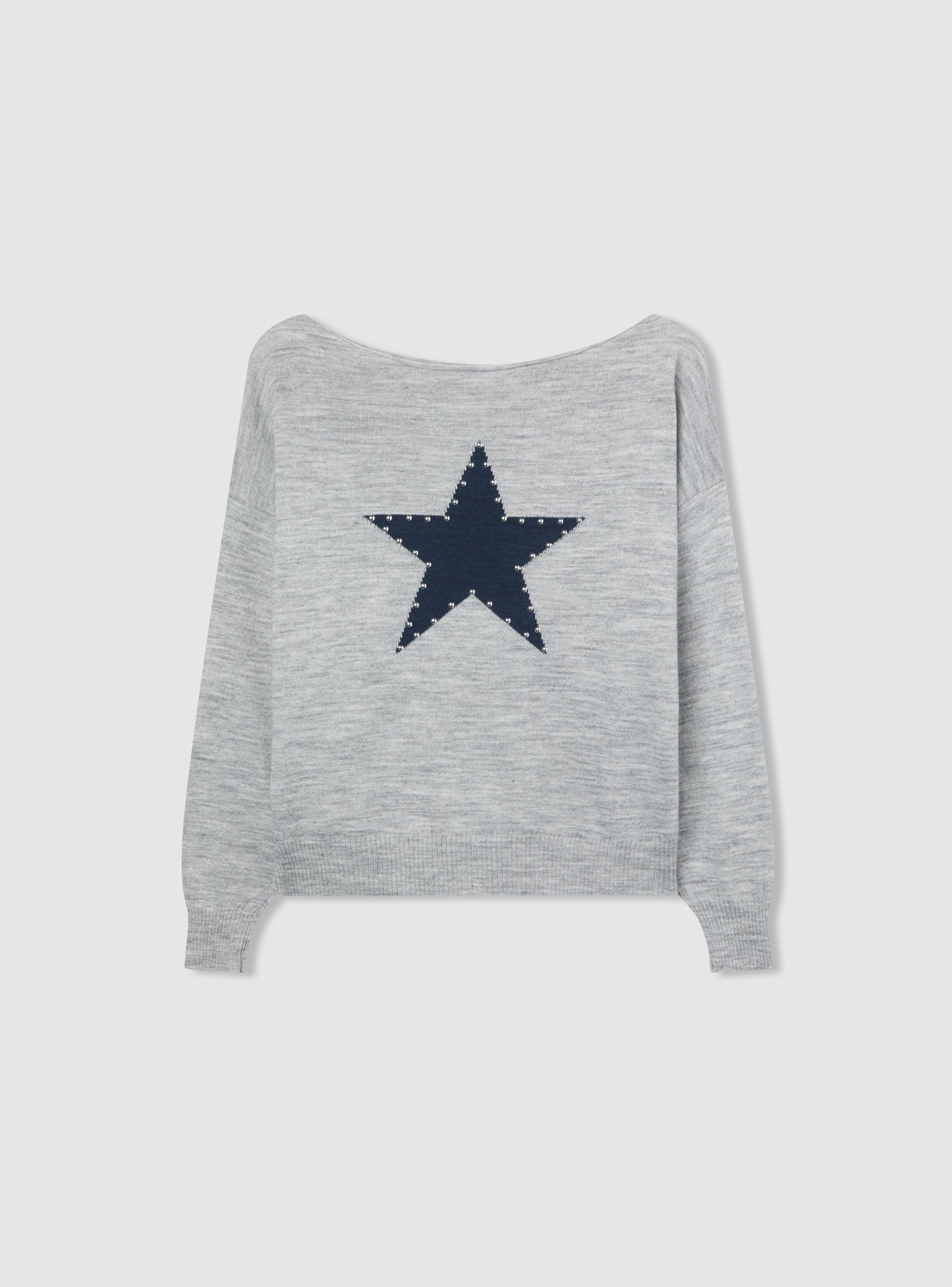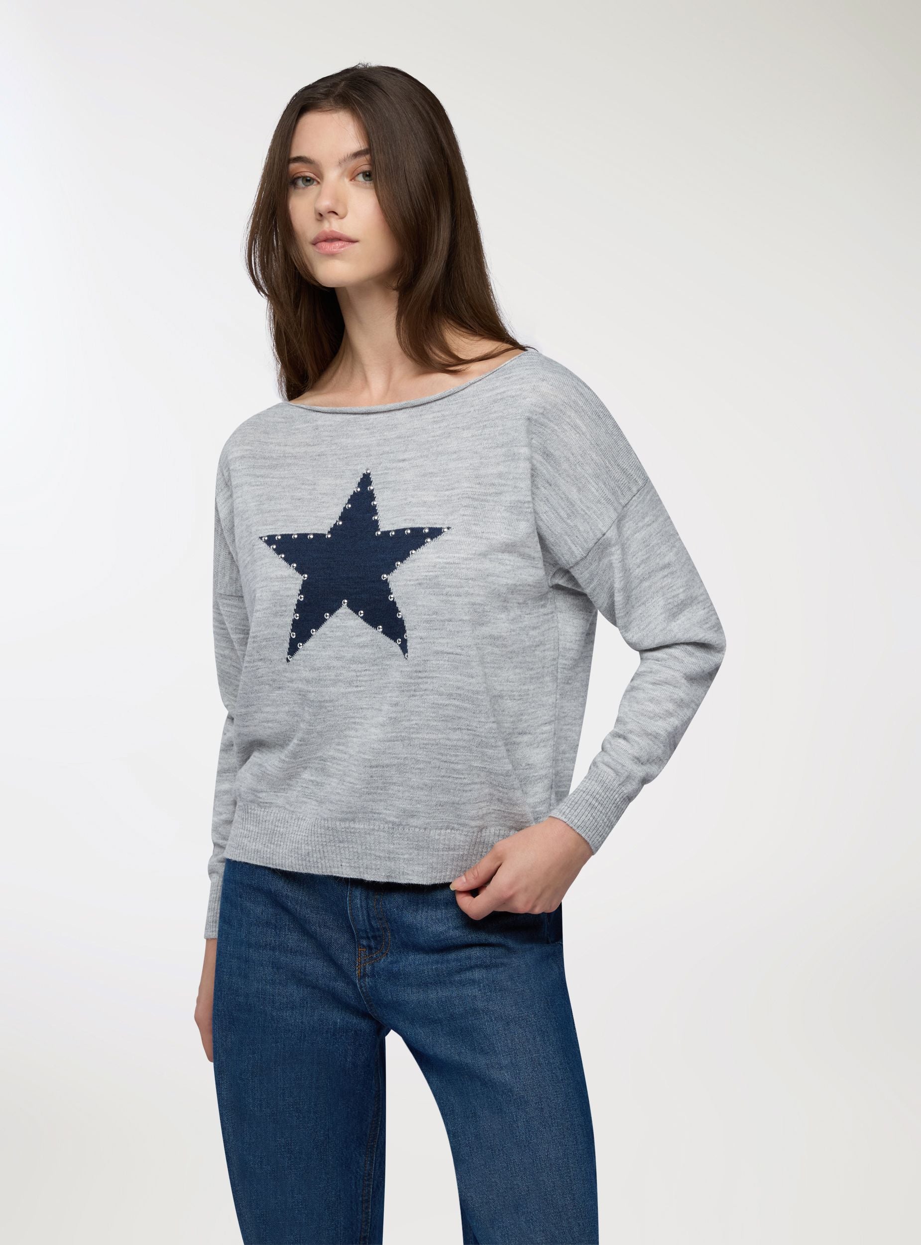 Dámský svetr s lodičkovým výstřihem a dlouhými rukávy, ideální pro ležérní vzhled nebo volný čas. Přední stranu zdobí velká hvězda s drobnými kovovými aplikacemi, které dodávají zářivý efekt. Lem a manžety jsou žebrované pro pohodlné a ženské nošení. Snadno se kombinuje s džínami nebo sukněmi, ideální pod kabáty nebo bundy pro všestranné jednobarevné outfity.