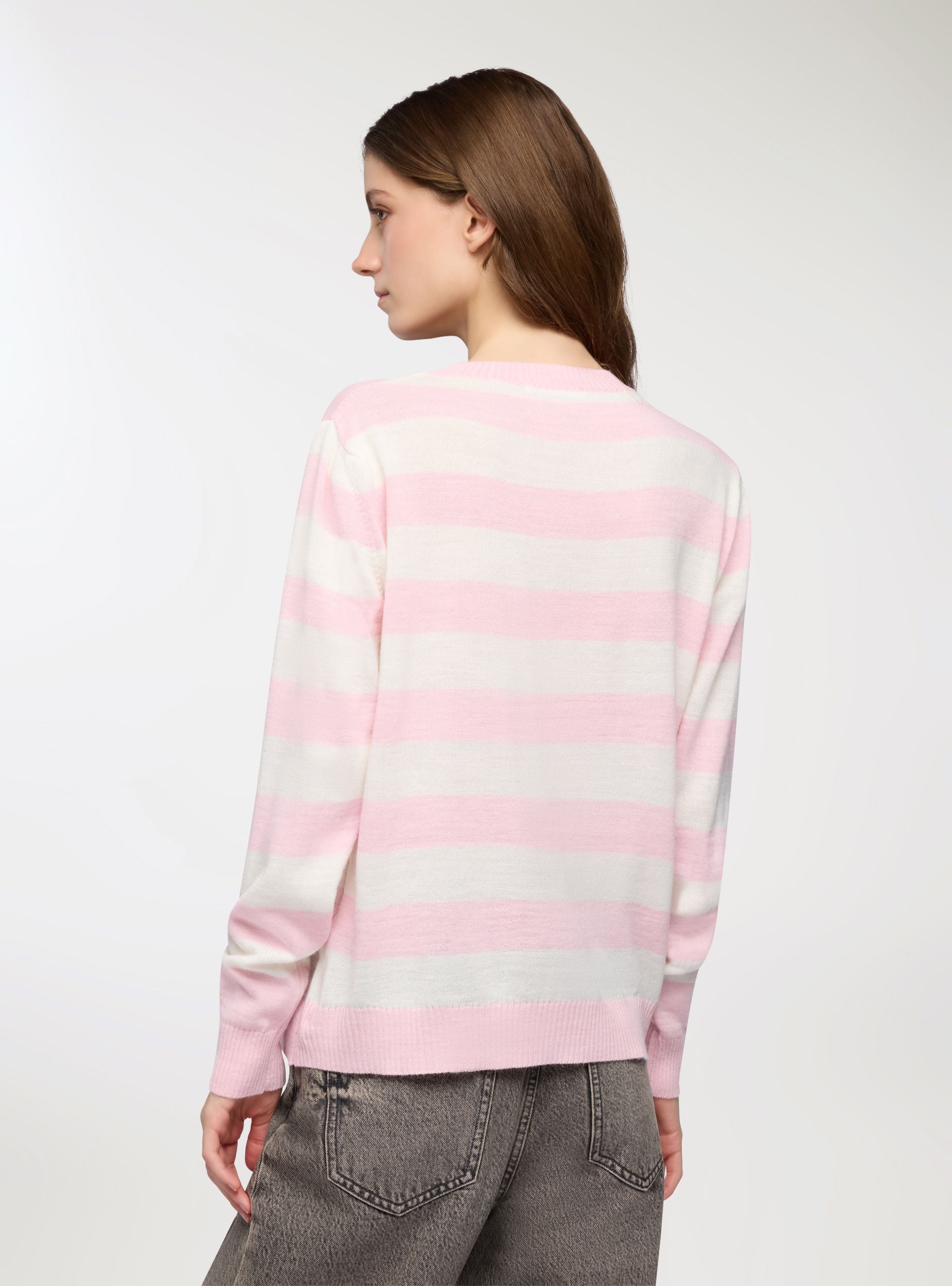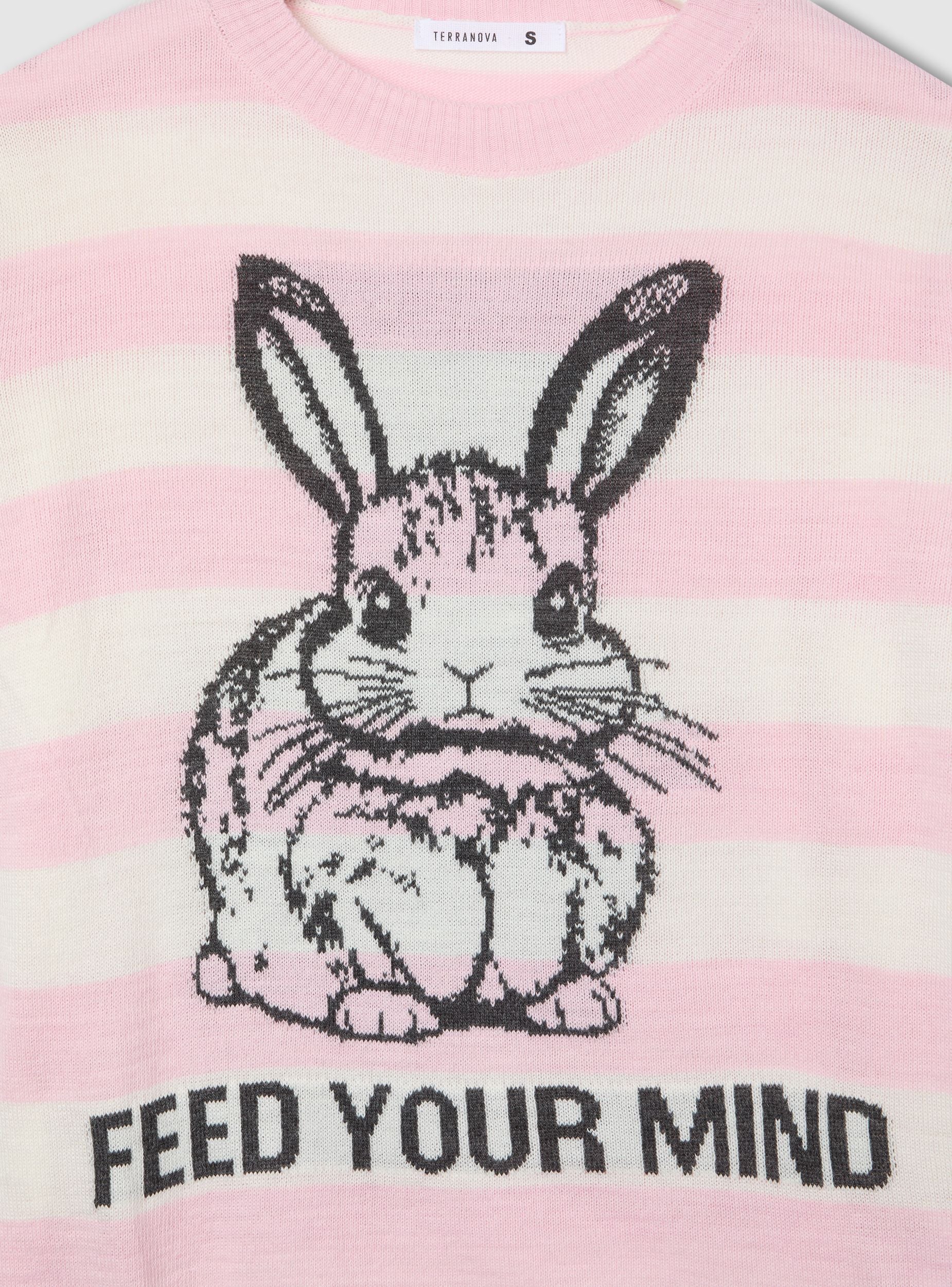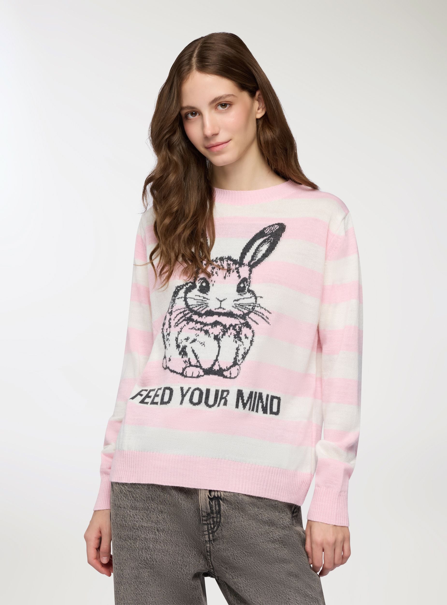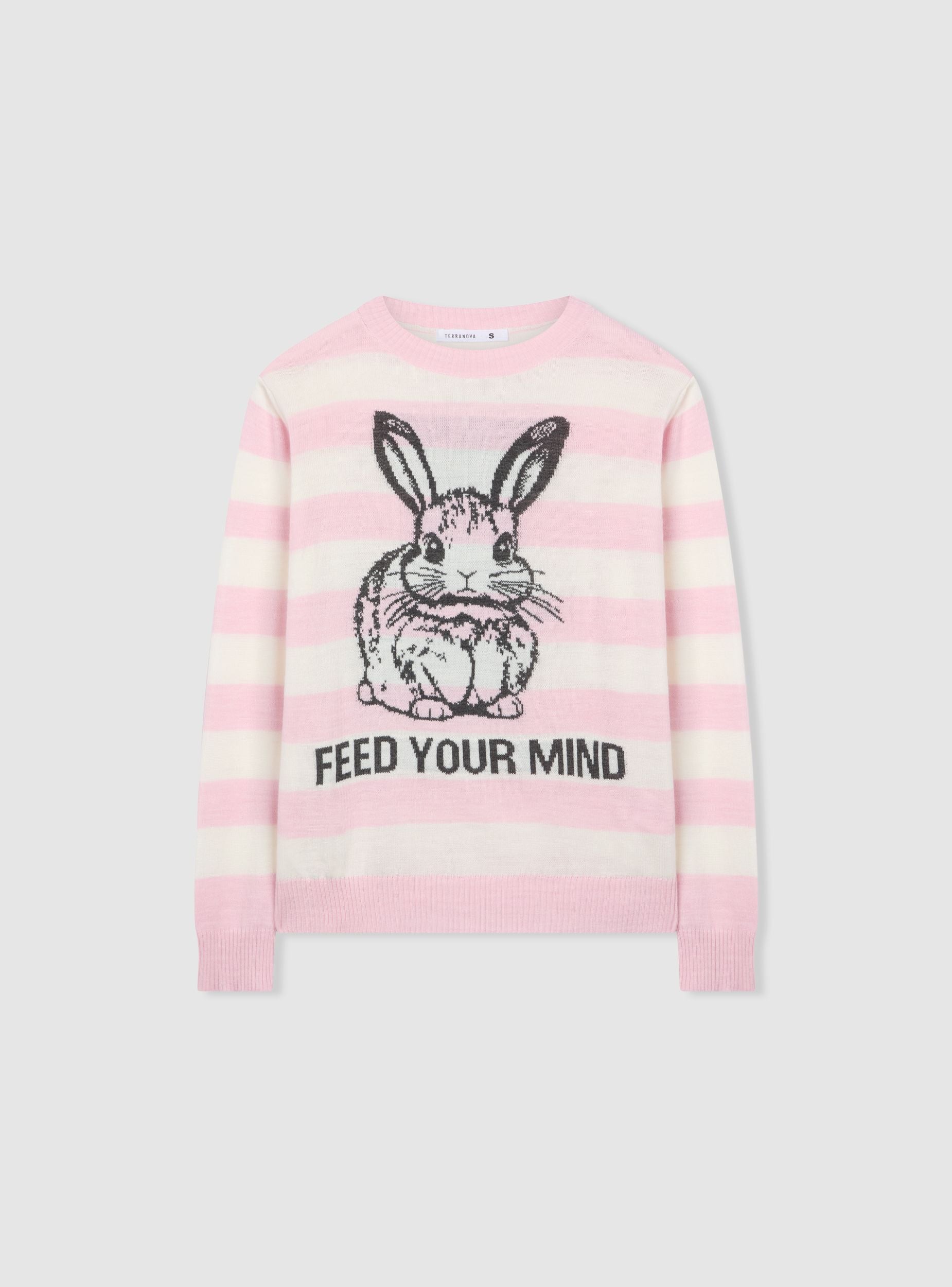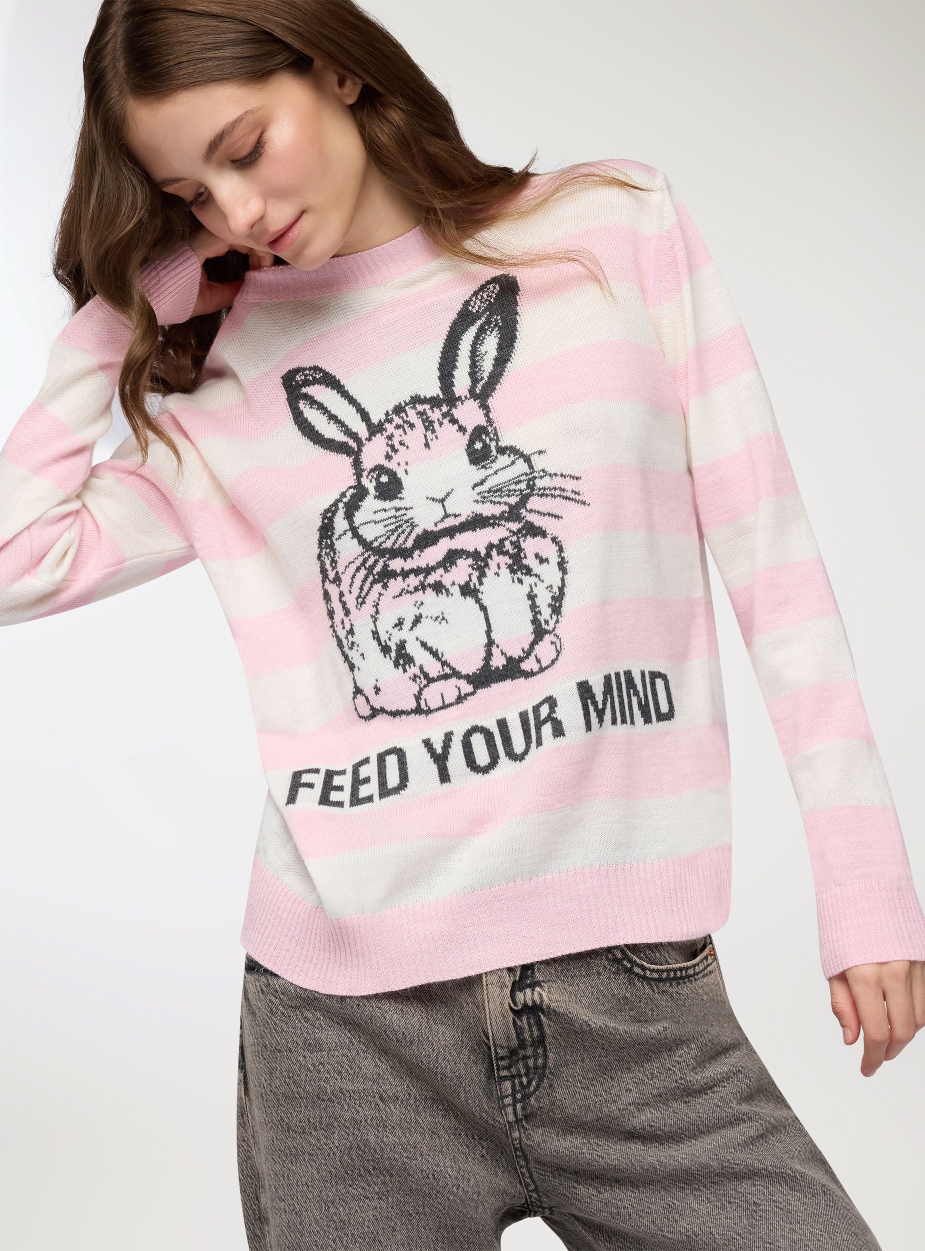 Dámské tričko s dlouhými rukávy, pruhovaným vzorem a kulatým výstřihem. Přední strana je zdobená grafikou s králíkem a nápisem, ideální pro casual a urban styl. Manžety a spodní lem jsou žebrované pro pohodlné nošení a snadné vrstvení přes košile nebo pod džínové bundy. Perfektní k džínům nebo sukním na volný čas a každodenní nošení.
