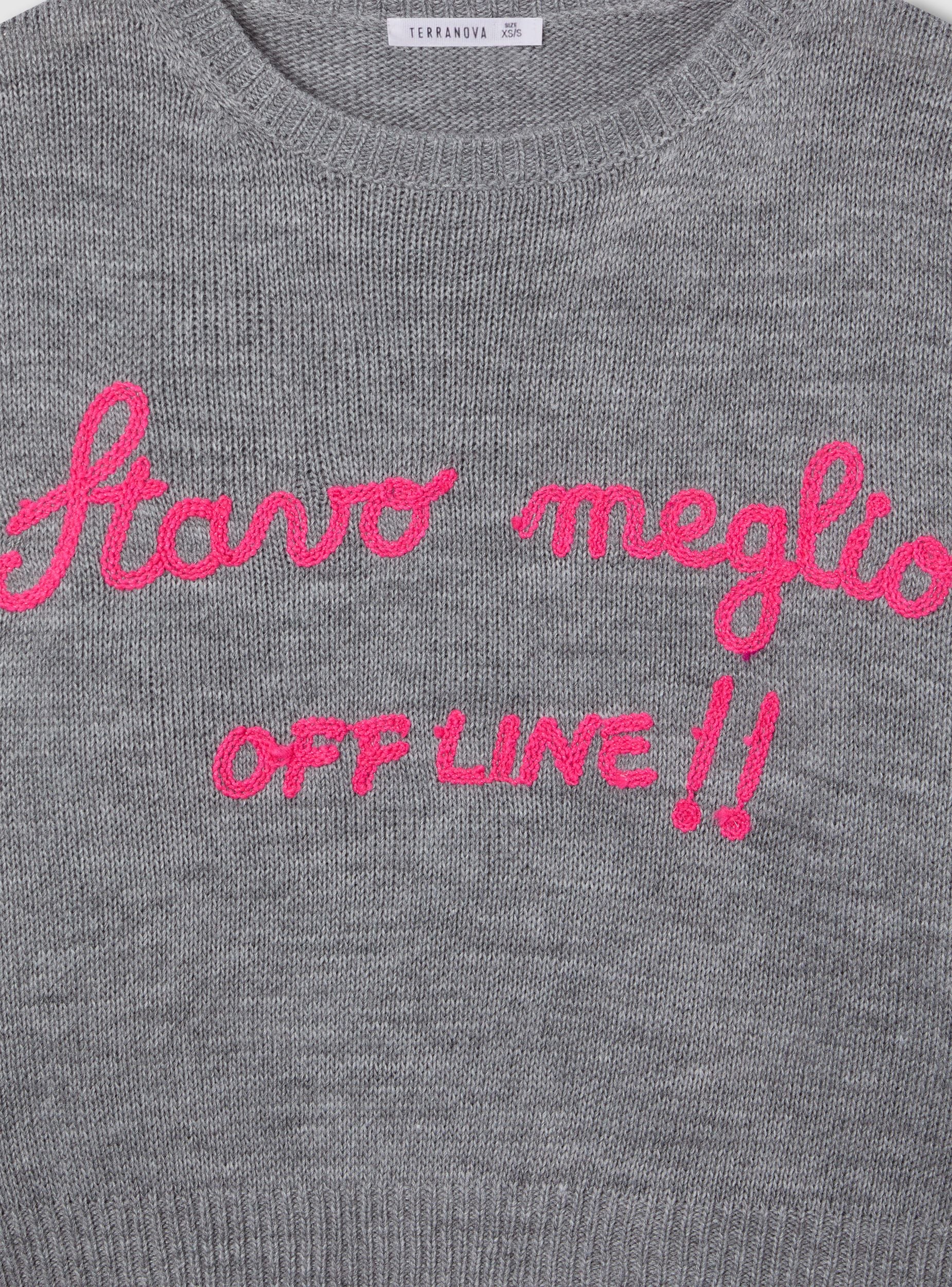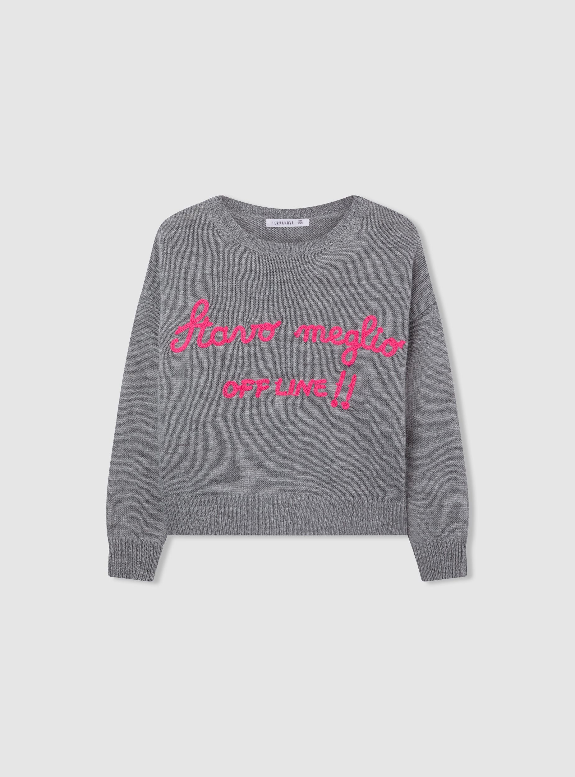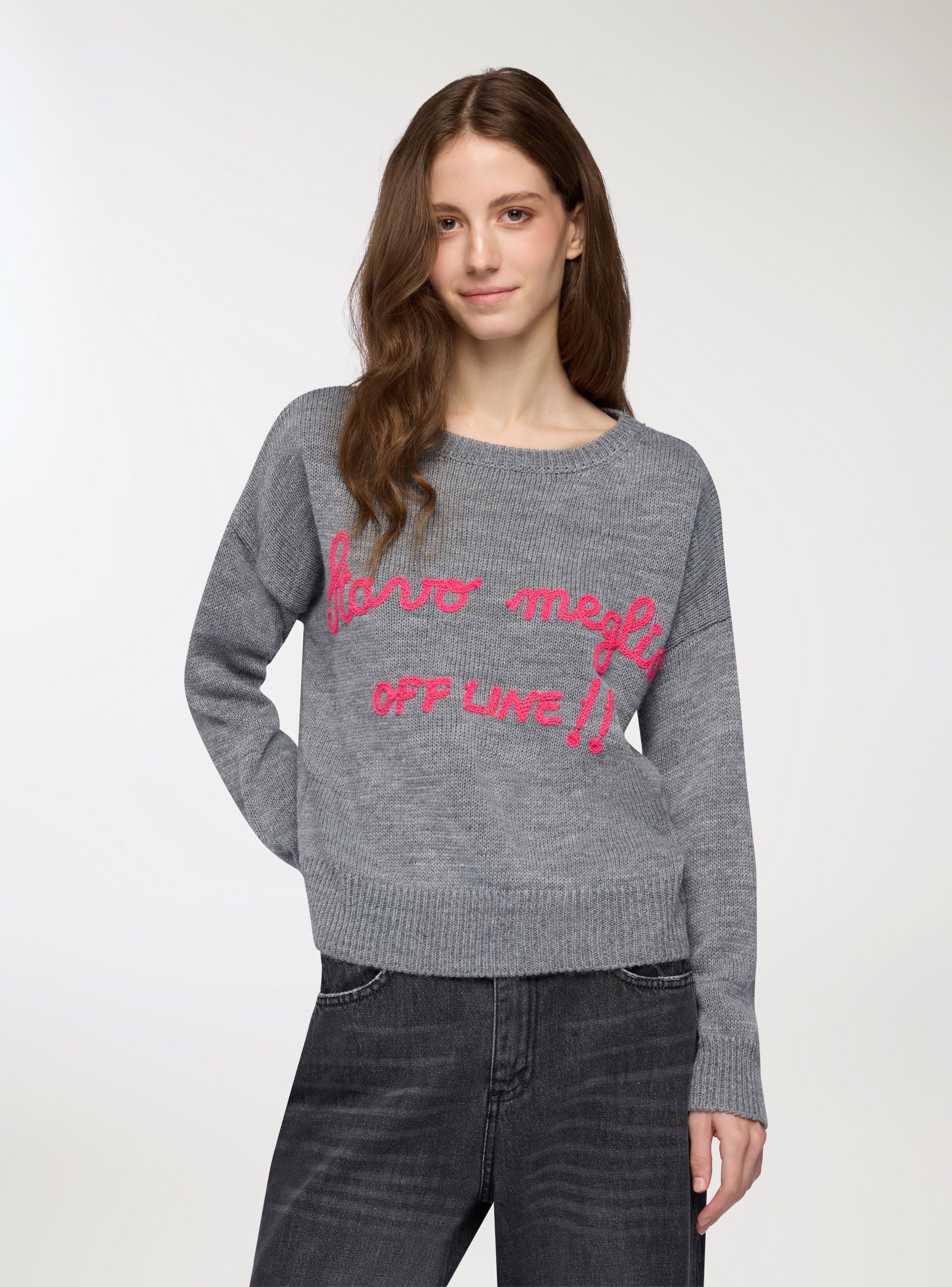 Dámský svetr s dlouhým rukávem, kulatým výstřihem a jednobarevným pleteným vzorem, zdobený vystouplým nápisem na přední straně. Lem a manžety jsou žebrované pro pohodlné nošení a snadné kombinování s džíny nebo kalhotami s přímým střihem. Ideální pro volný čas nebo každodenní městský styl, nosí se přes košile nebo topy pro vytvoření lehkých vrstev.Detaily