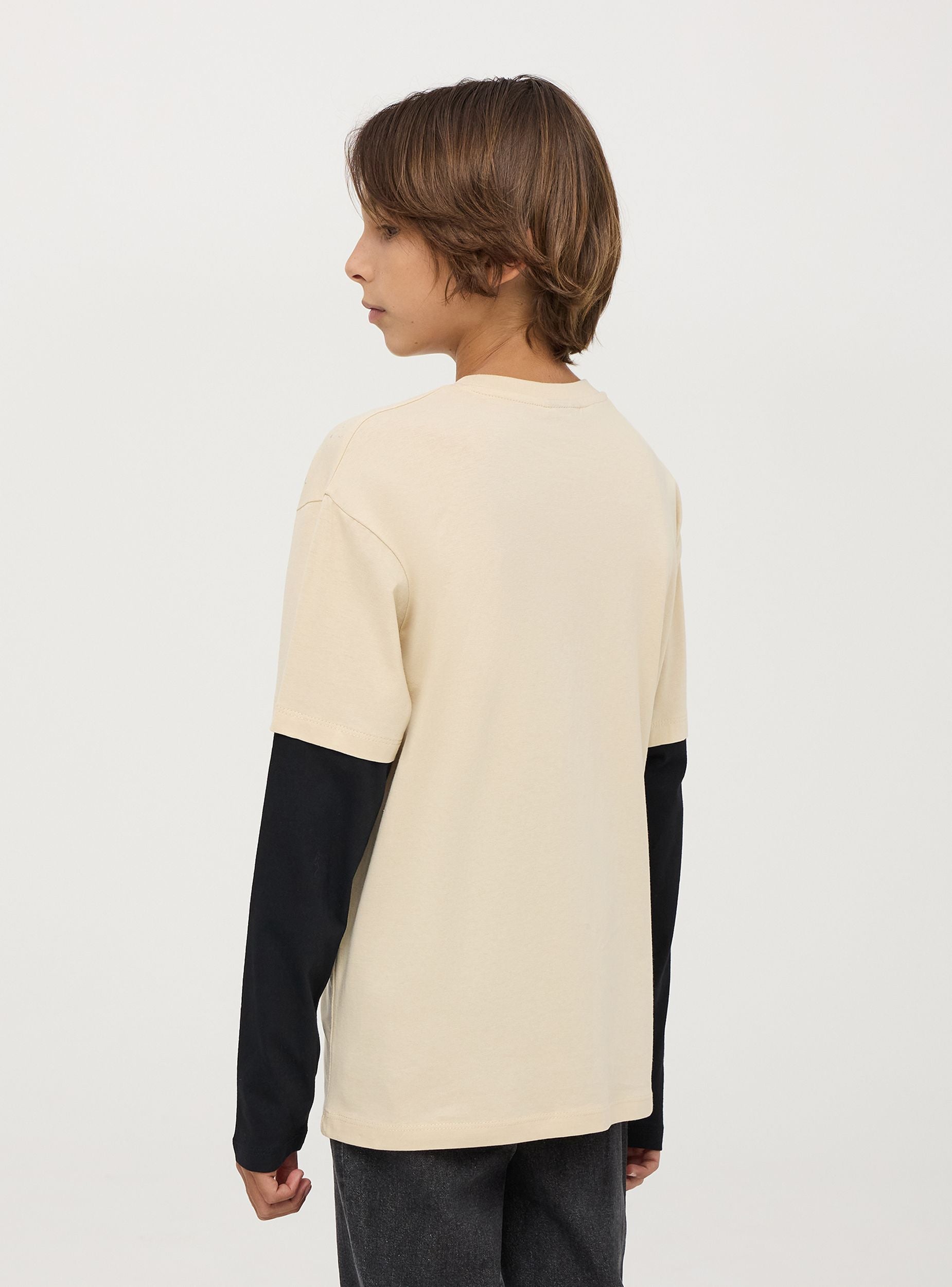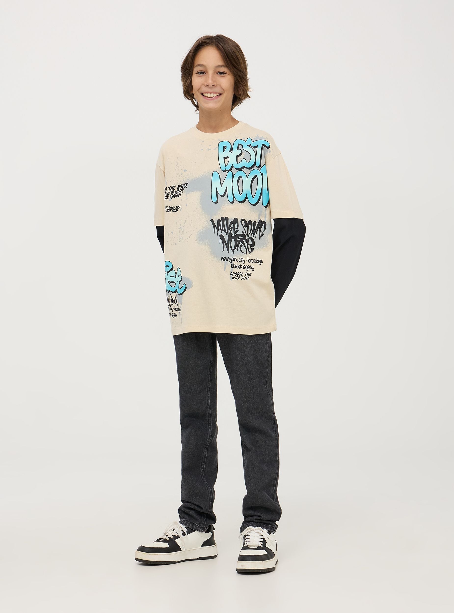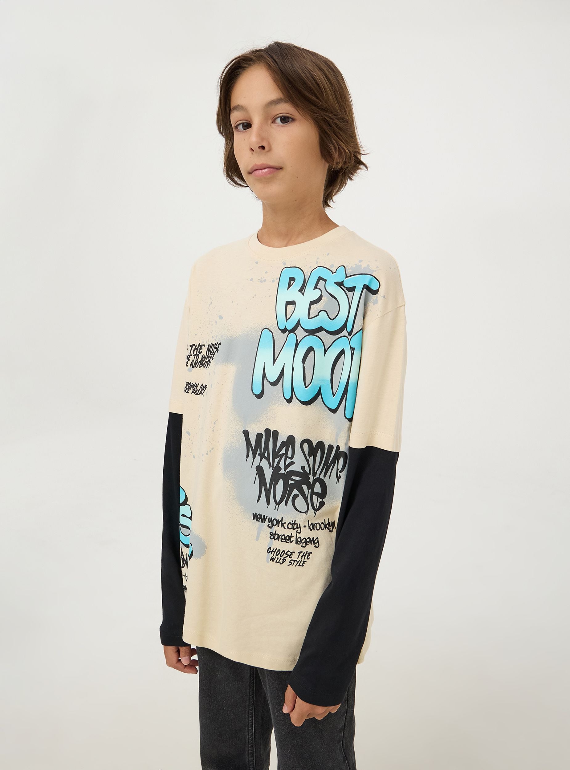 Tento dětský svetr s dlouhými rukávy má inovativní vrstvený design s kontrastními rukávy, což vytváří efekt dvojitého svetr. Vícebarevný graffiti potisk se nápisy dodává jedinečný městský nádech. Pohodlný střih a casual styl, ideální pro neformální výlety a každodenní aktivity. Perfektní pro přidání rebelského nádechu k outfitu.Detaily