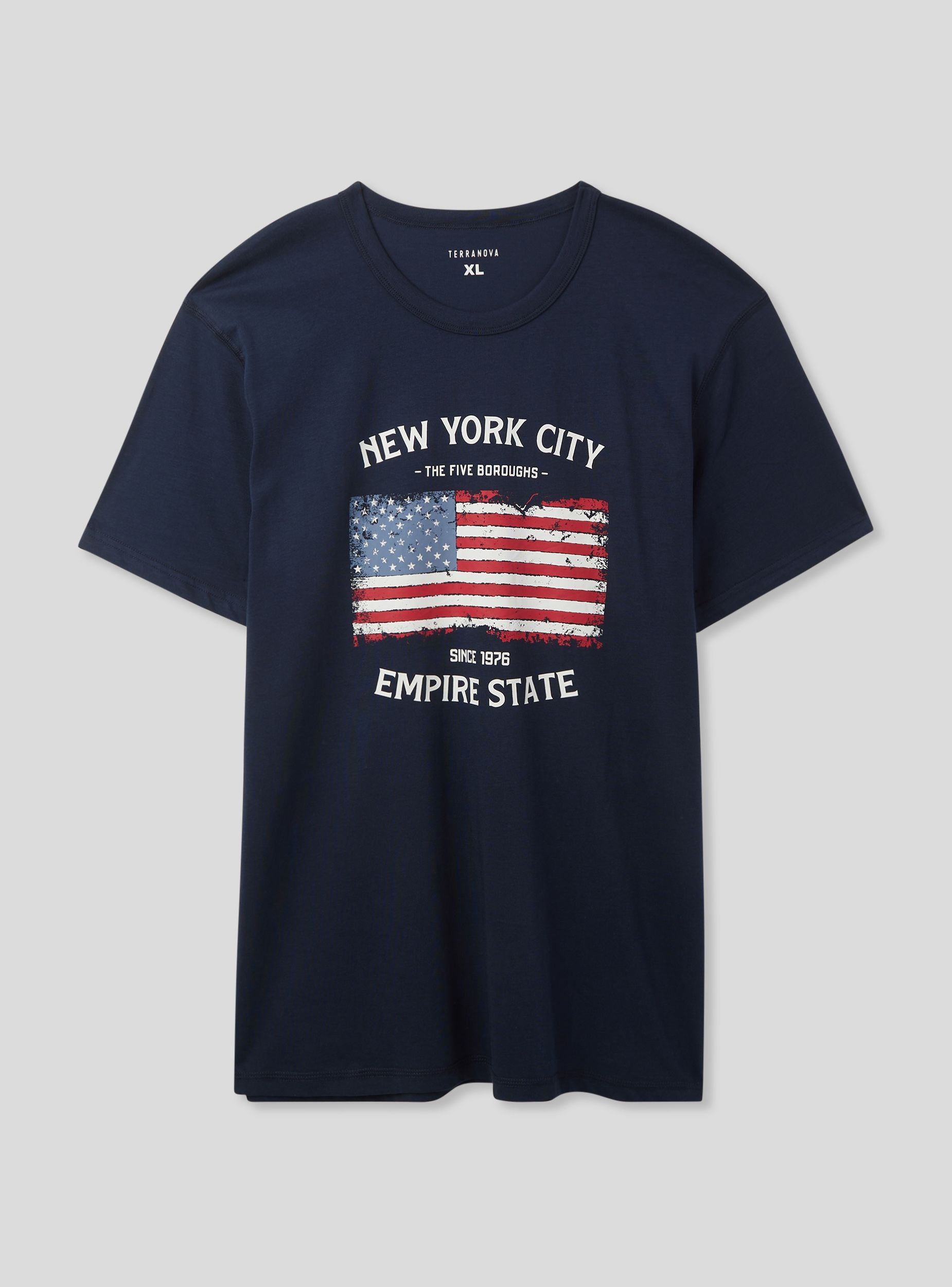 Pánská trička s krátkým rukávem a kulatým výstřihem, ideální pro ty, kteří mají rádi casual styl a městské kouzlo. Potisk s americkou vlajkou a nápisy evokuje energii New Yorku, což je činí ideálními pro městské vzhledy s výrazným charakterem. Skvěle se hodí k džínům a teniskám pro dynamický outfit, přizpůsobí se dnům ve městě a chvílím odpočinku s nádechem streetwear inspirace.Detaily