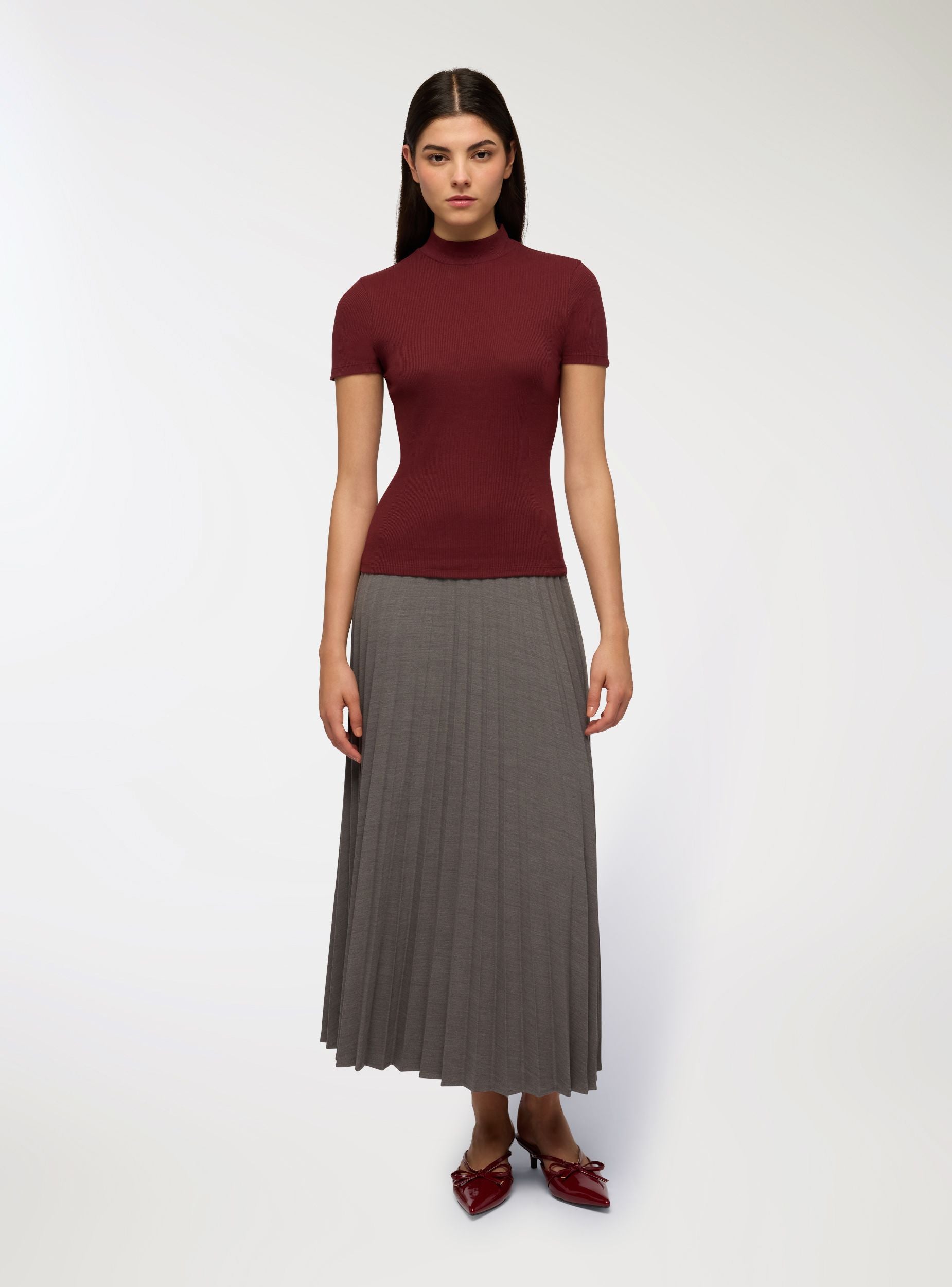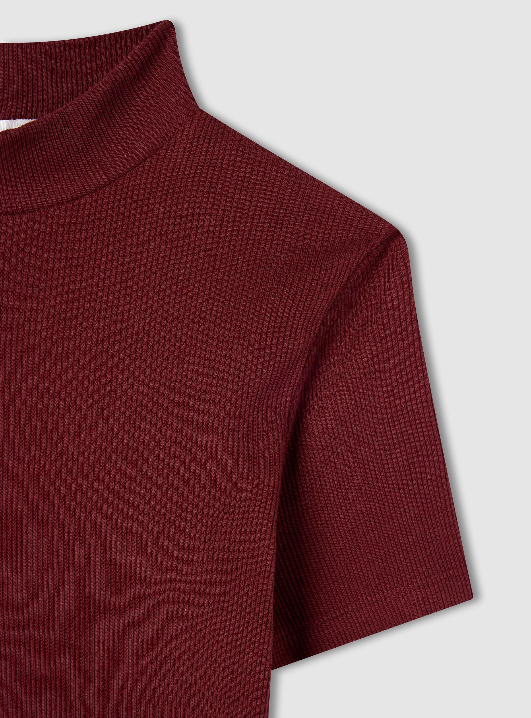 Dámské tričko s vysokým límcem z jemného žebrovaného materiálu, základní a univerzální. Nezbytné a vždy aktuální, toto tričko je základním kouskem, který nesmí chybět ve vašem šatníku. Vyrobeno z jednobarevné látky, má krátké rukávy a slim fit střih, který diskrétně zvýrazňuje siluetu. Vysoký límec dodává sofistikovaný nádech, ideální pro vytváření minimalistických, čistých a trendových outfitů. Noste ho samostatně v nejvíce neformálních lookách nebo pod blazery, otevřenými košilemi či oversized svetry pro moderní a funkční vrstvený efekt. Díky své univerzálnosti se snadno přizpůsobí každému ročnímu období a příležitosti, což ho činí nezbytným pro ty, kteří mají rádi jednoduchý, ale pečlivý styl.Detaily