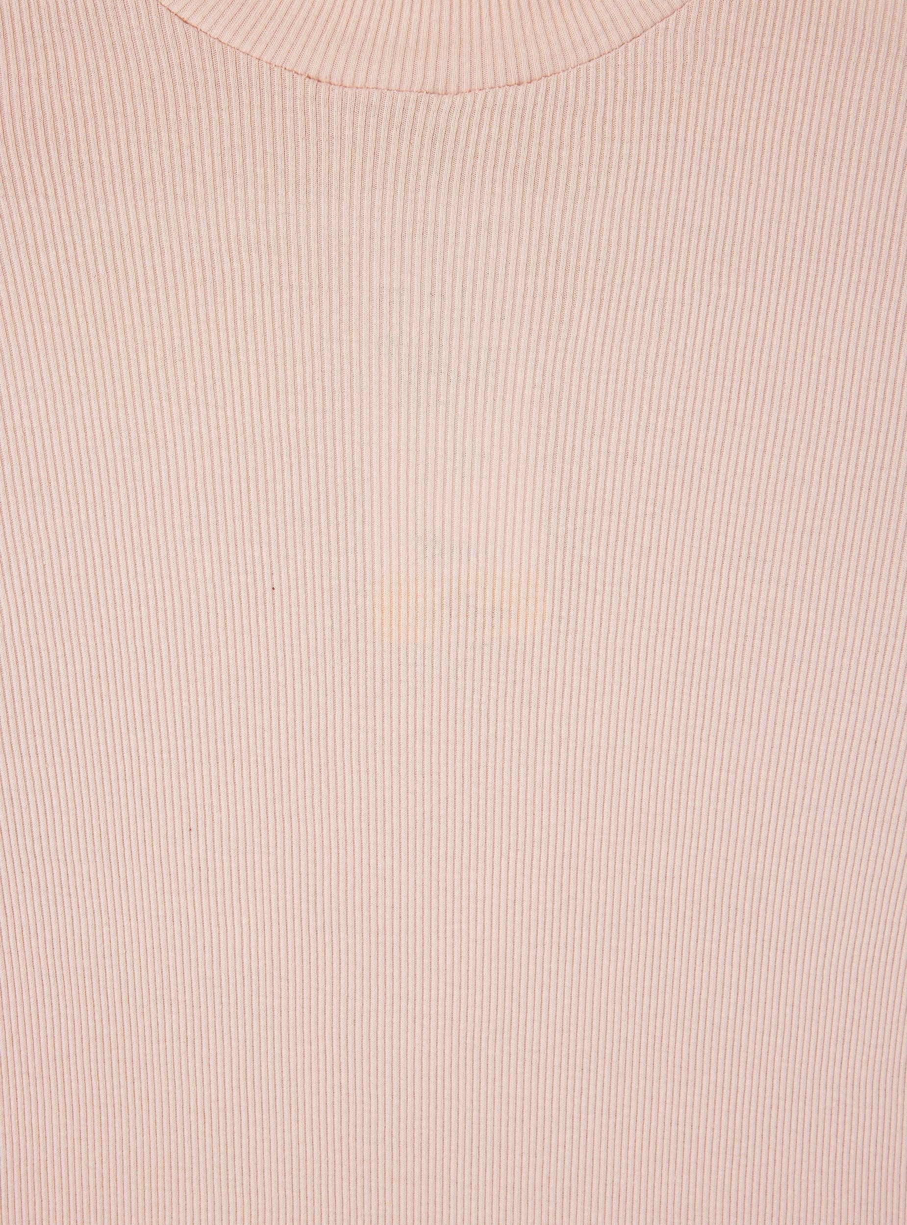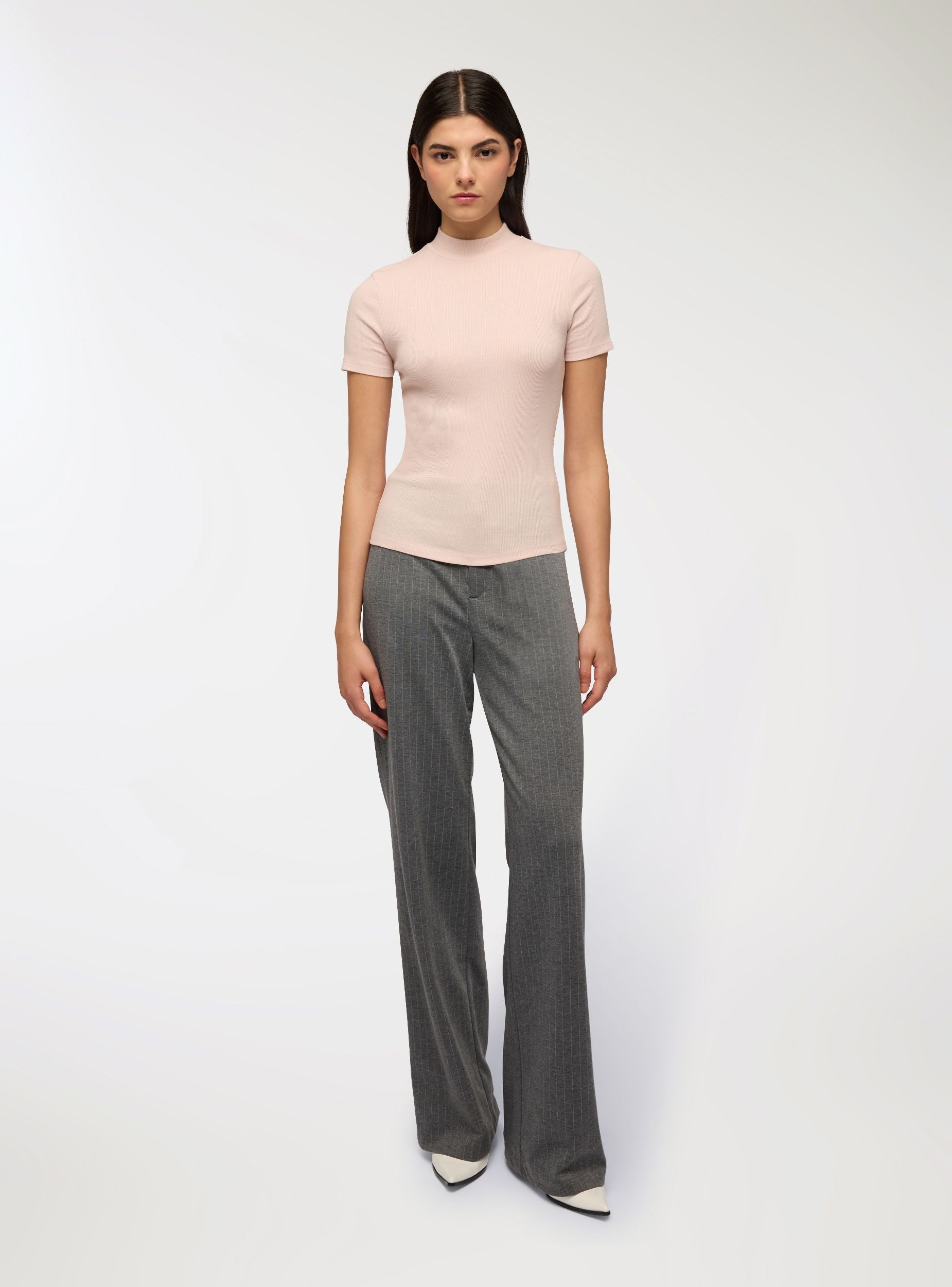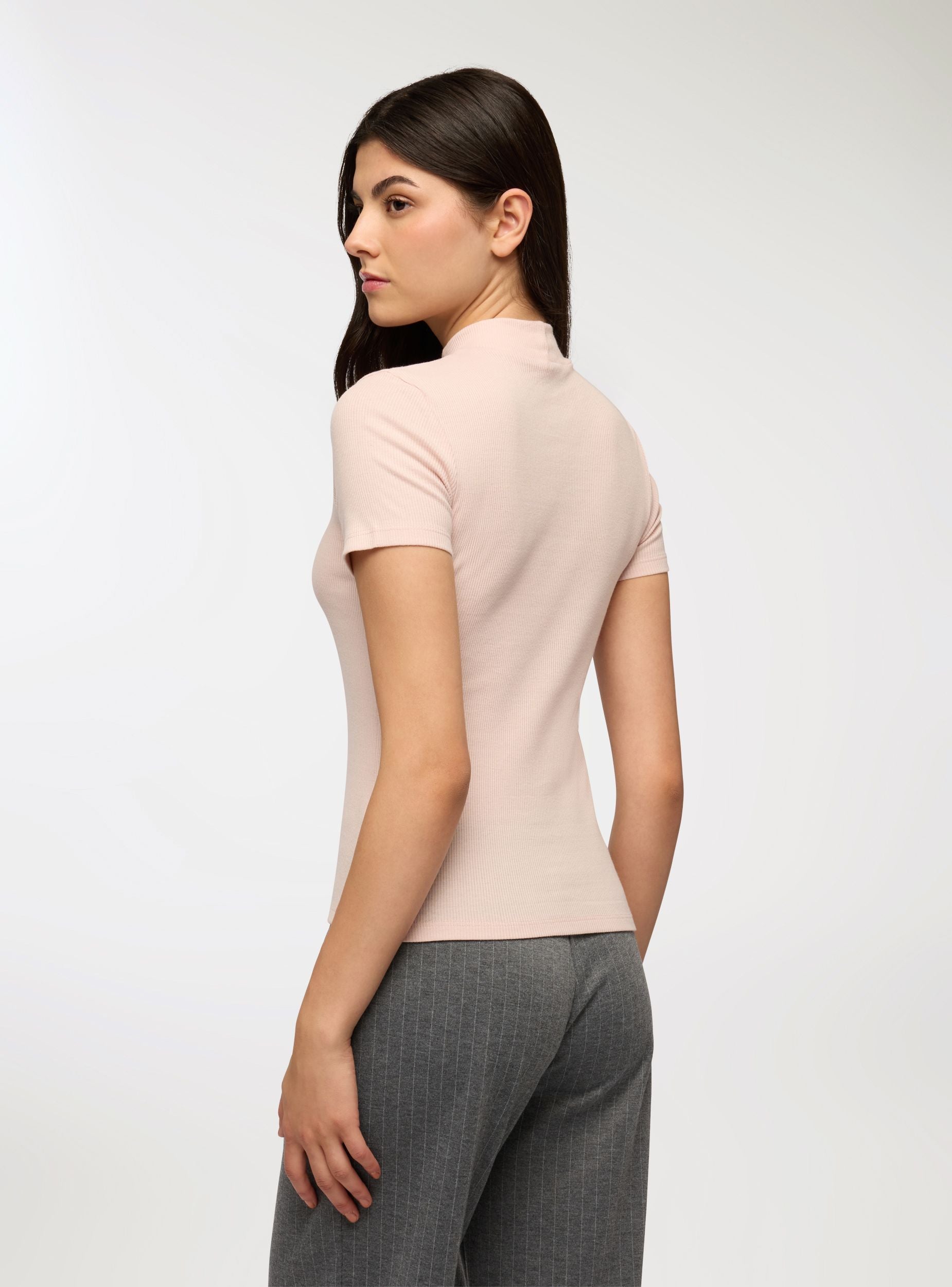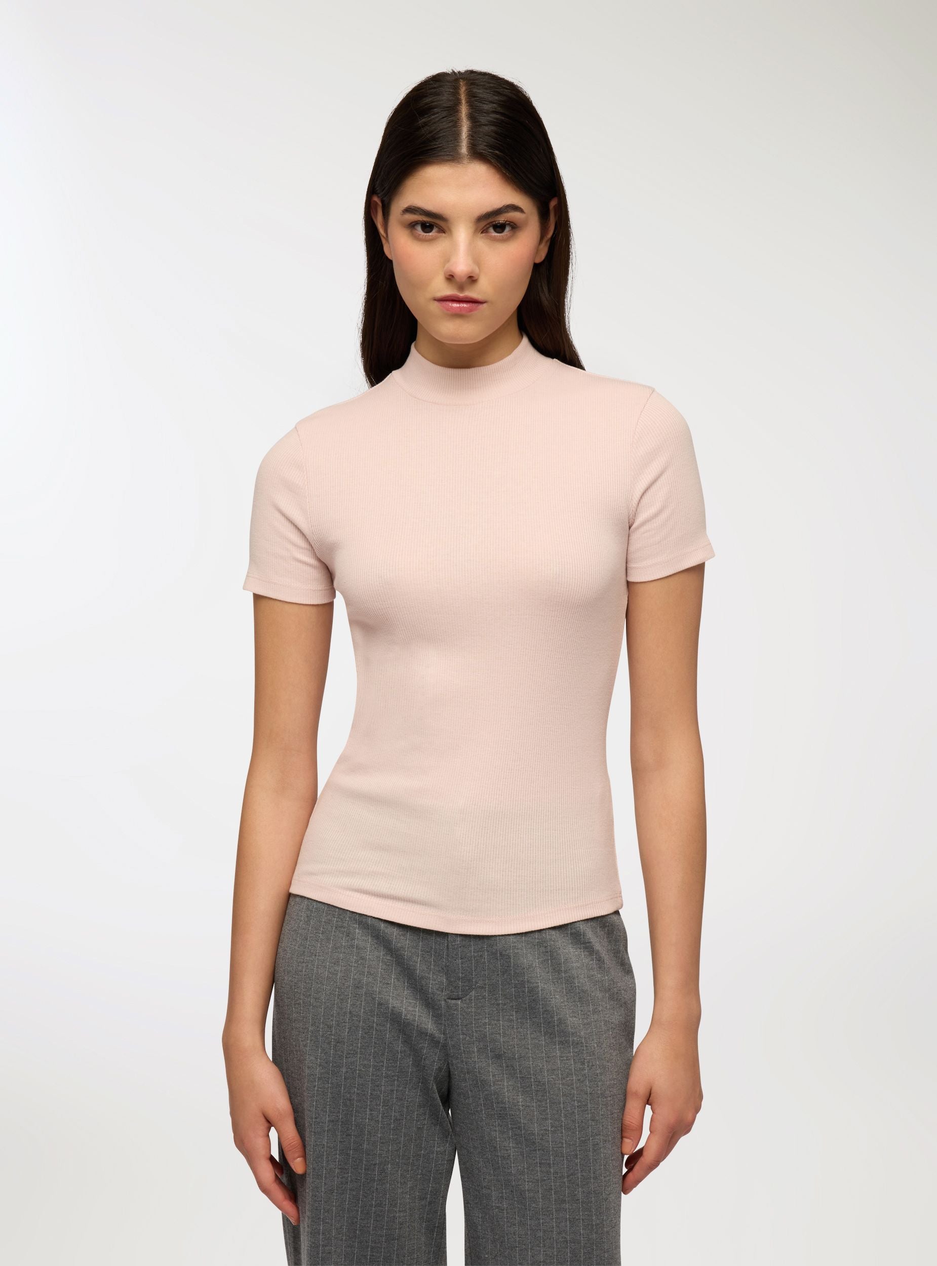 Dámské tričko s vysokým límcem z úpletu, základní a všestranné. Nezbytné a vždy aktuální, toto tričko je základním kouskem, který nesmí chybět ve vašem šatníku. Vyrobeno z jednobarevné tkaniny, má krátké rukávy a slim fit střih, který diskrétně zvýrazňuje siluetu. Vysoký límec dodává sofistikovaný nádech, ideální pro vytváření minimalistických, čistých a trendových outfitů. Noste jej samostatně v nejvíce casual looku nebo pod sako, otevřené košile či oversized svetry pro moderní a funkční vrstvení. Díky své všestrannosti se snadno přizpůsobí každému ročnímu období a příležitosti, což z něj činí nepostradatelný kousek pro ty, kteří mají rádi jednoduchý, ale pečlivý styl.