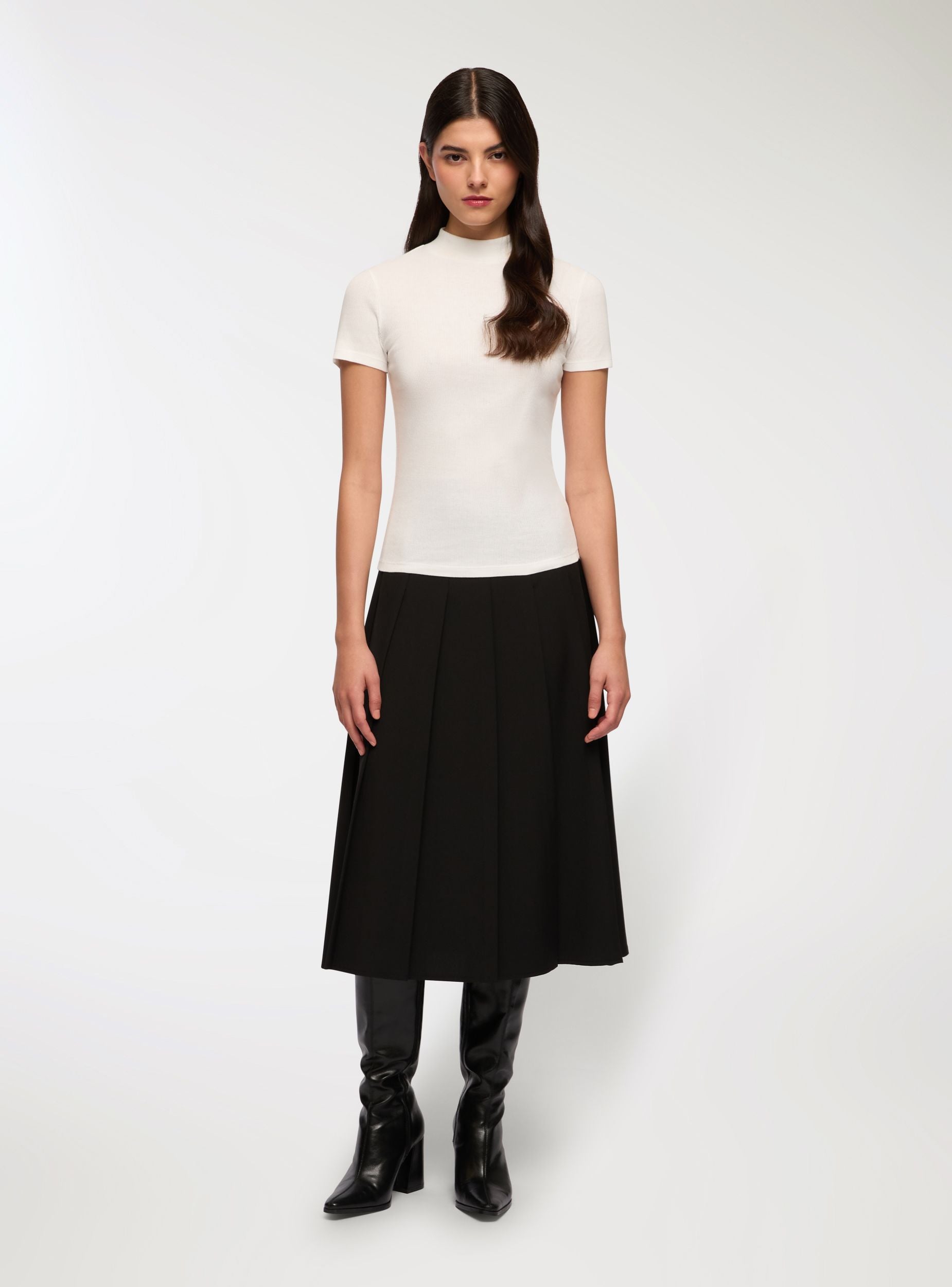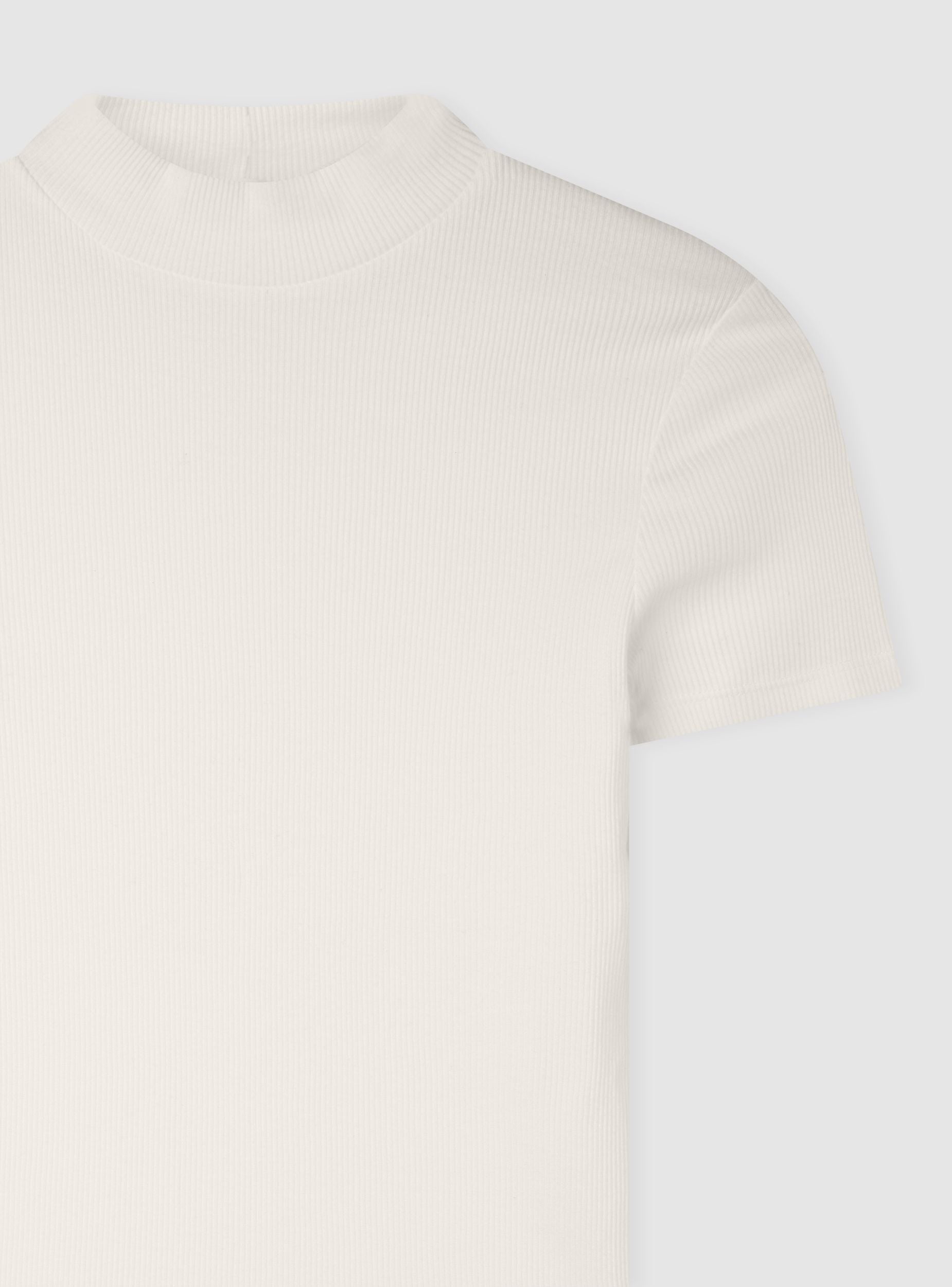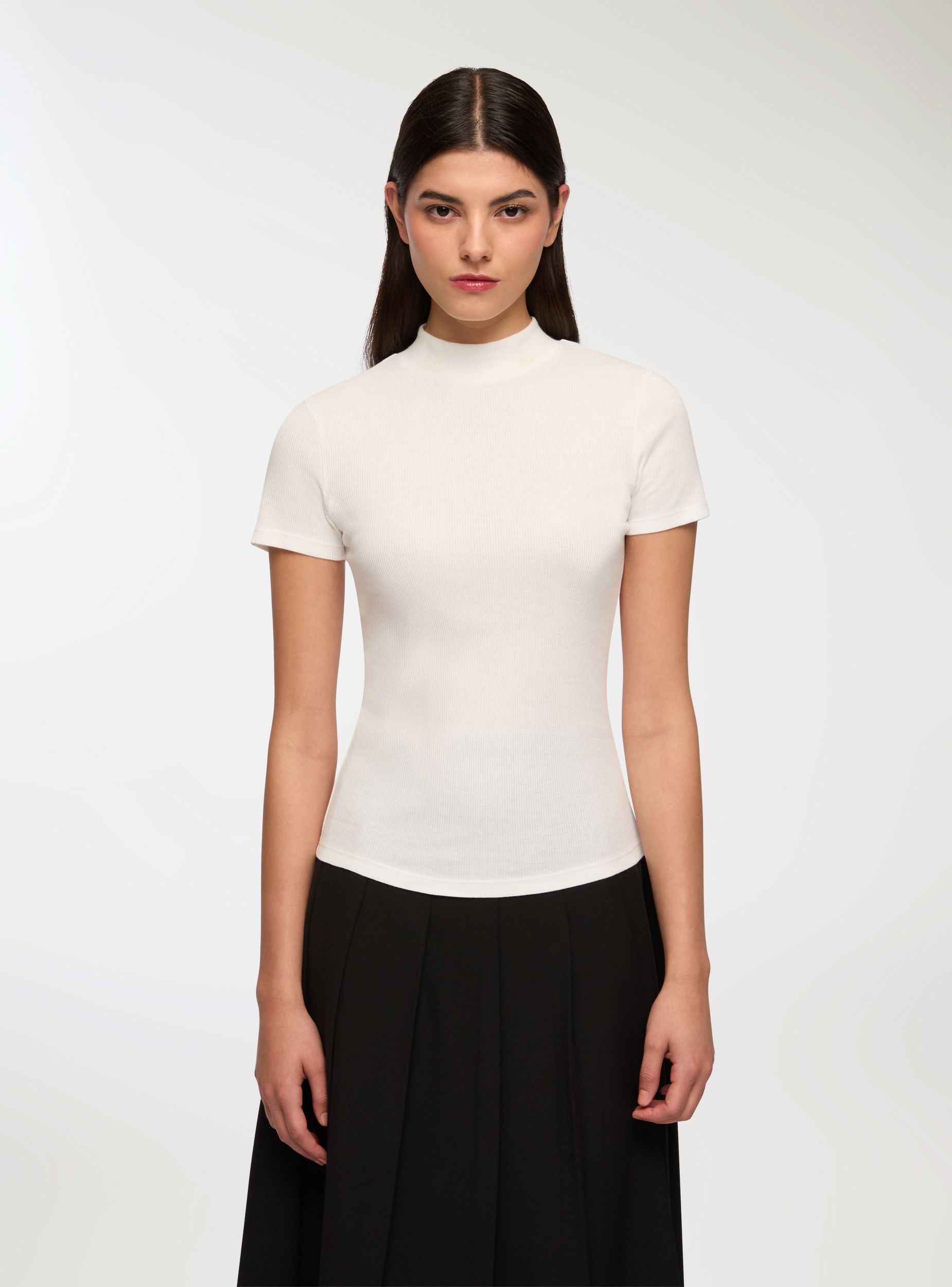 Dámské tričko s vysokým límcem z úpletu, základní a univerzální. Esenciální a vždy aktuální, toto tričko je základním kouskem, který nesmí chybět v šatníku. Vyrobeno z jednobarevné tkaniny, má krátké rukávy a slim fit střih, který diskrétně zvýrazňuje siluetu. Vysoký límec dodává sofistikovaný nádech, ideální pro vytváření minimalistických, čistých a trendy outfitů. Noste ho samostatně v nejvíce casual vzhledech nebo pod blejzry, otevřenými košilemi nebo oversized svetry pro moderní a funkční vrstvený efekt. Díky své univerzálnosti se snadno přizpůsobí každému ročnímu období a příležitosti, což ho činí nezbytným pro ty, kteří mají rádi jednoduchý, ale pečlivý styl.