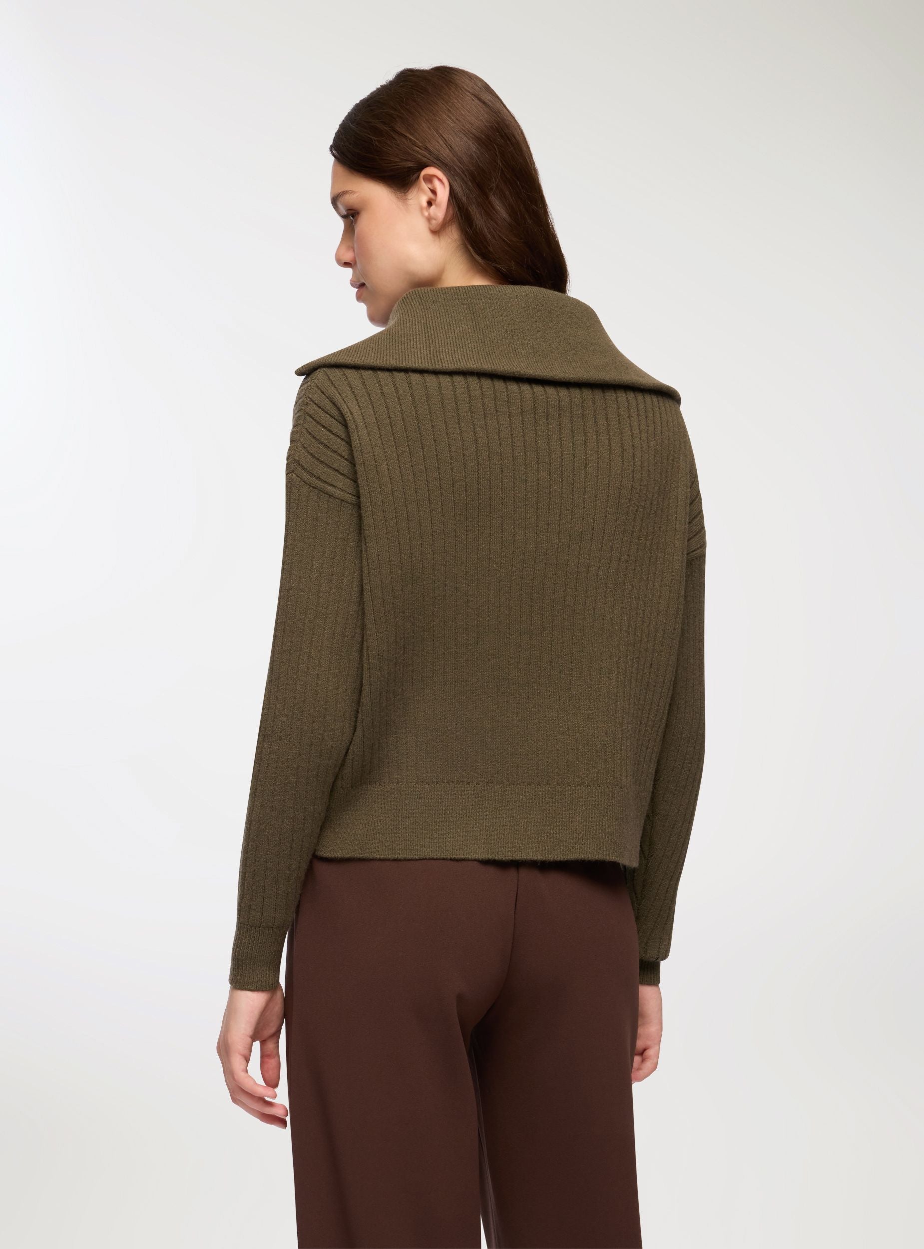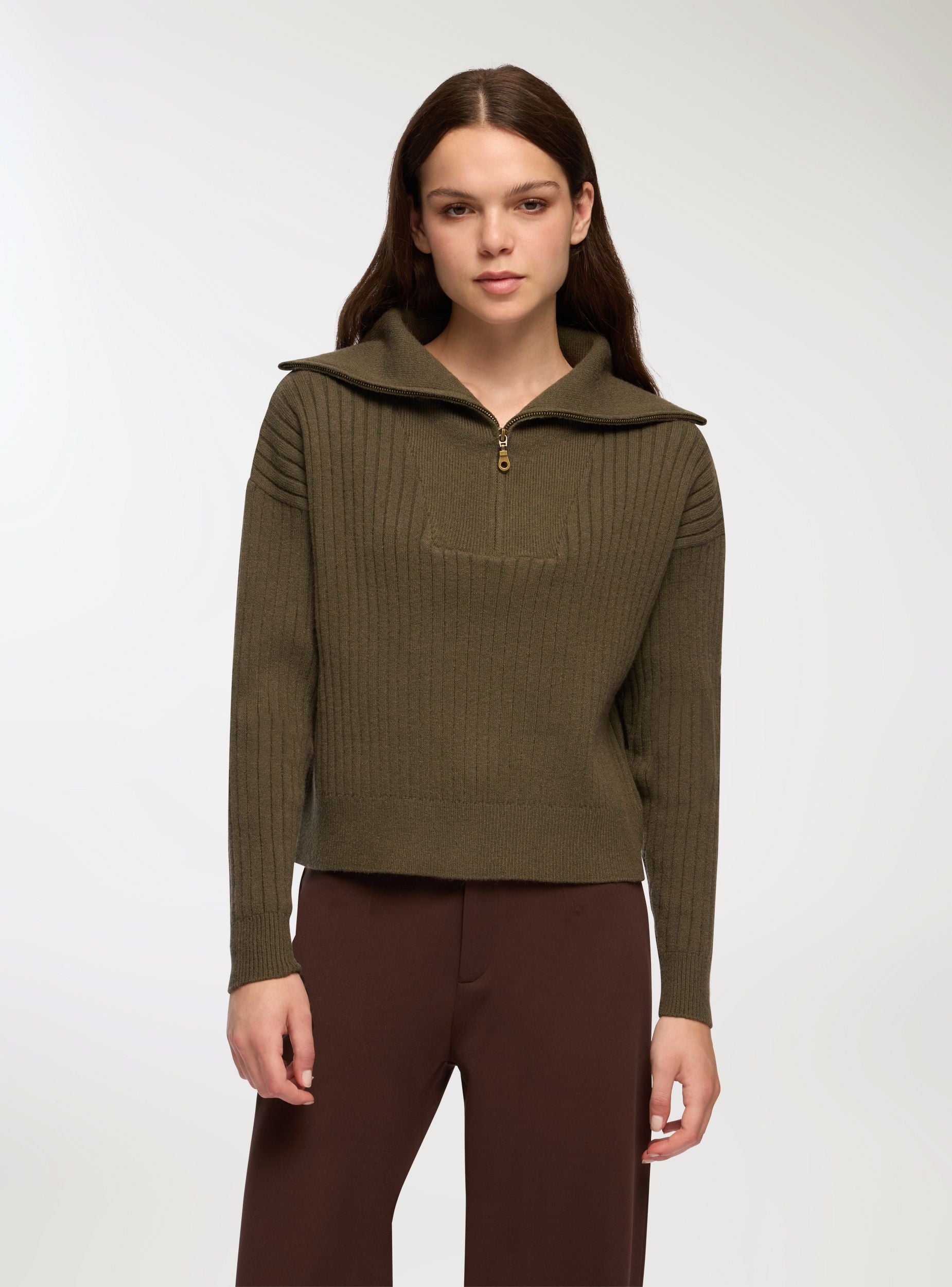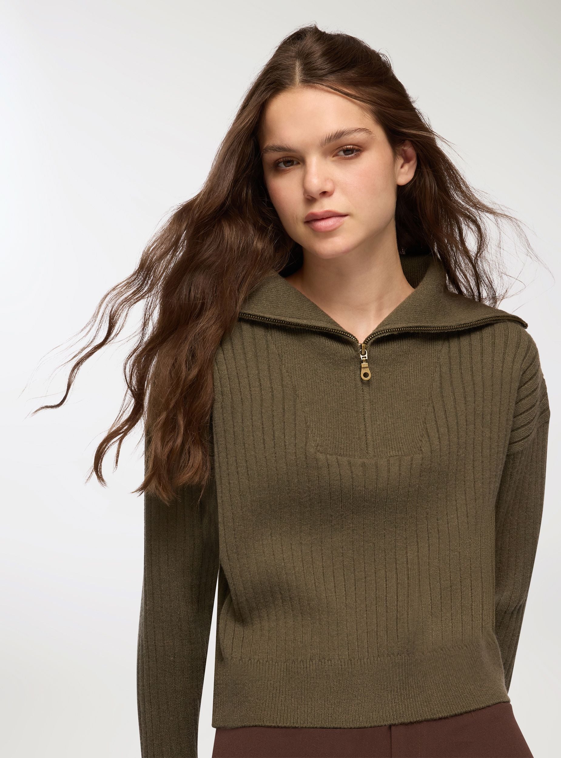 Dámský svetr s žebrovaným vzorem a širokým výstřihem. Má praktické přední zapínání na zip, které zajišťuje pohodlné a univerzální nošení. Ideální pro neformální kombinace s džíny nebo kalhotami, perfektní na odpočinkové dny nebo neformální příležitosti. Jednobarevný design usnadňuje kombinování s ostatními kousky v šatníku.Detaily