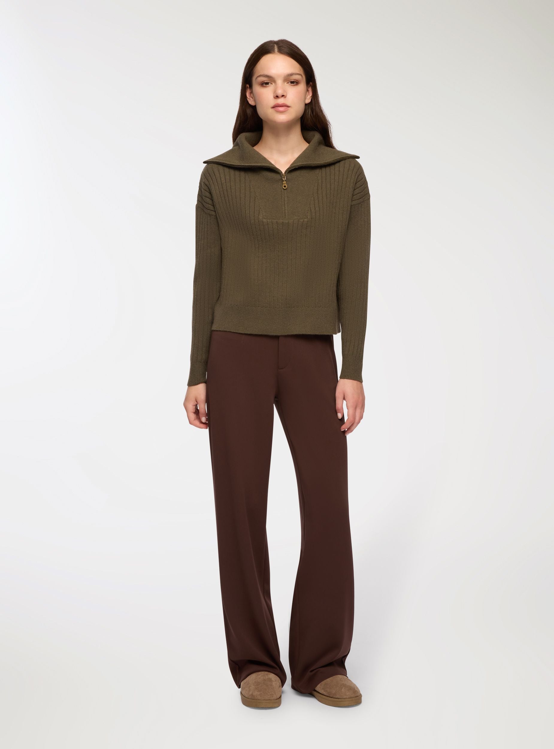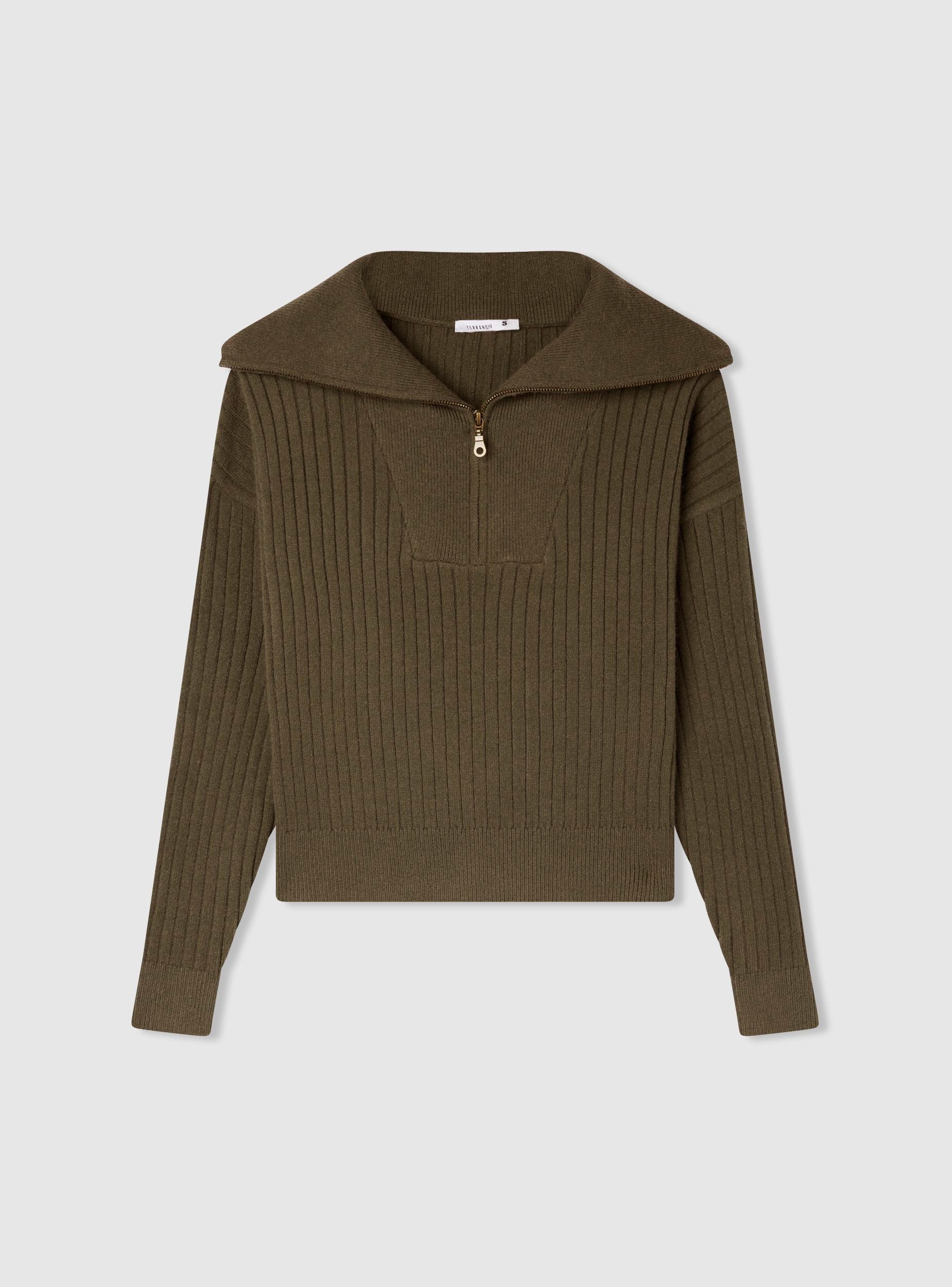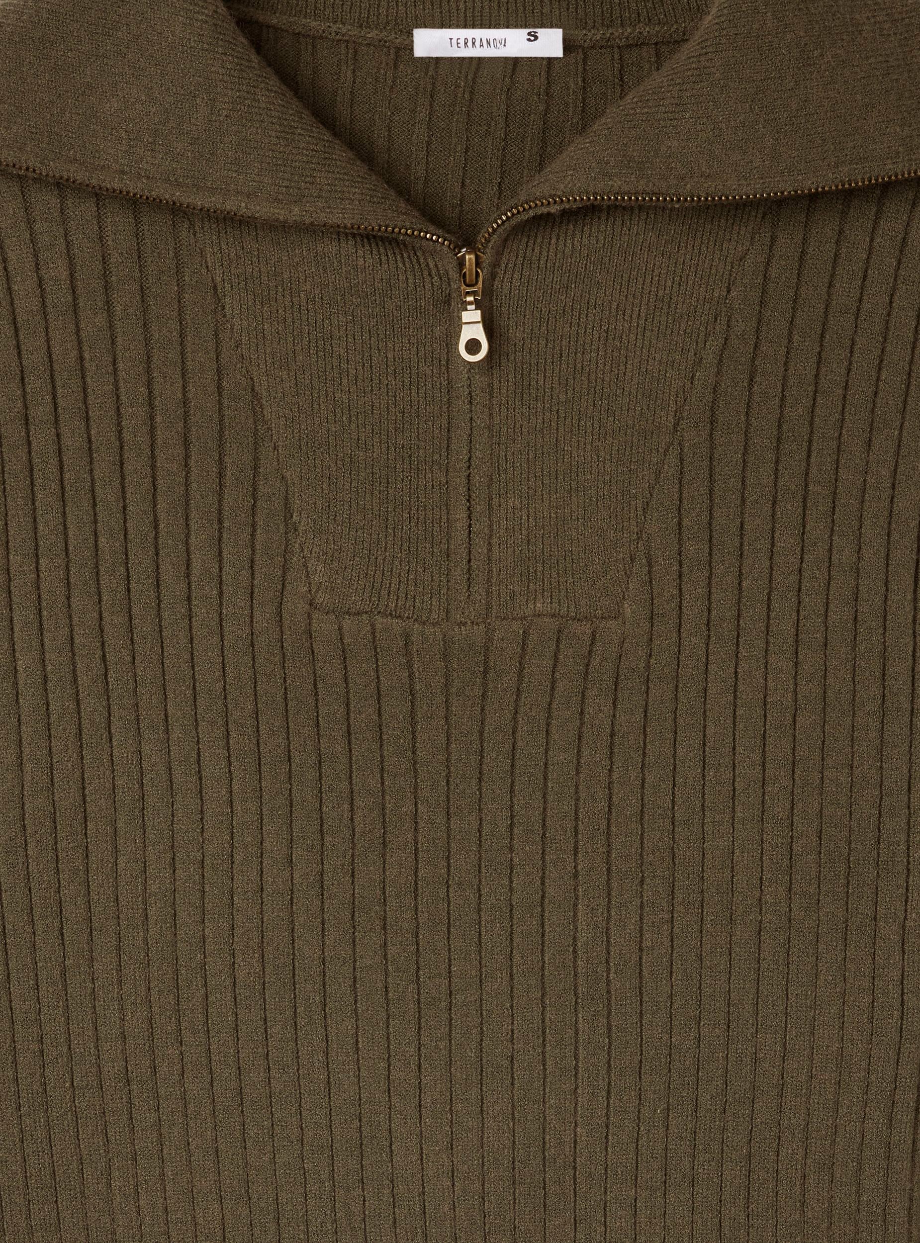 Dámský svetr s žebrovaným vzorem a širokým výstřihem. Má praktické přední zapínání na zip, které zajišťuje pohodlné a univerzální nošení. Ideální pro neformální kombinace s džíny nebo kalhotami, perfektní na odpočinkové dny nebo neformální příležitosti. Jednobarevný design usnadňuje kombinování s ostatními kousky v šatníku.Detaily
