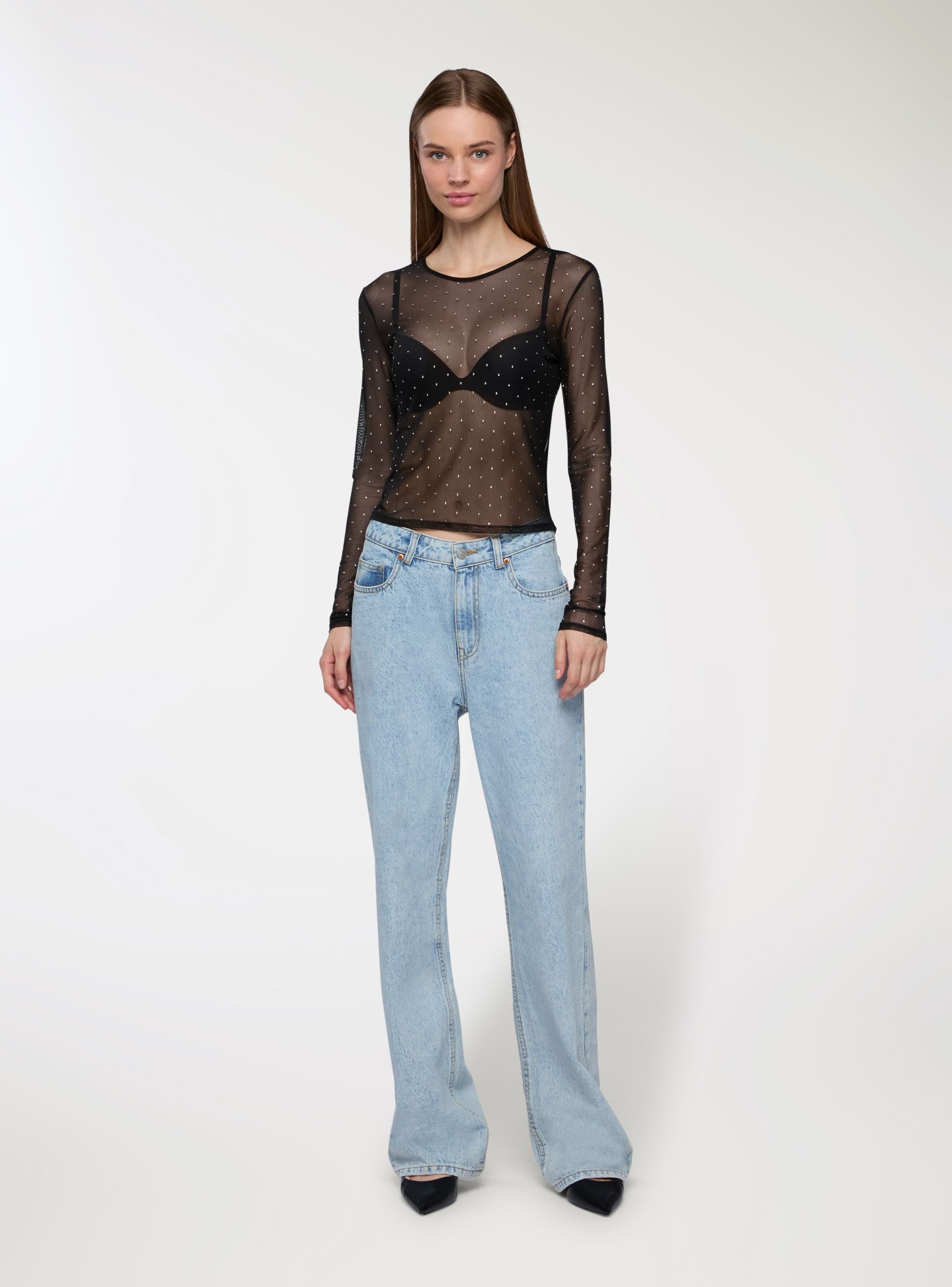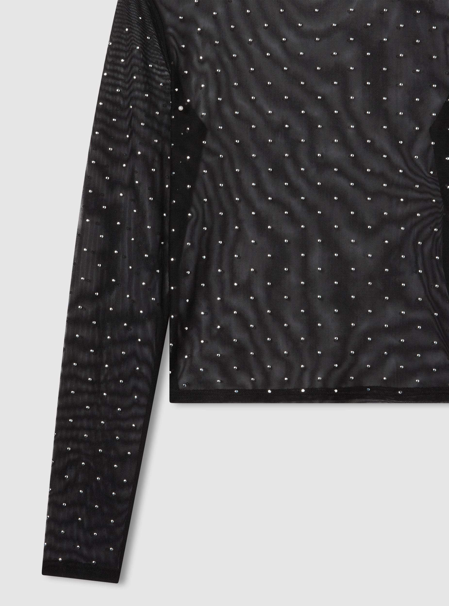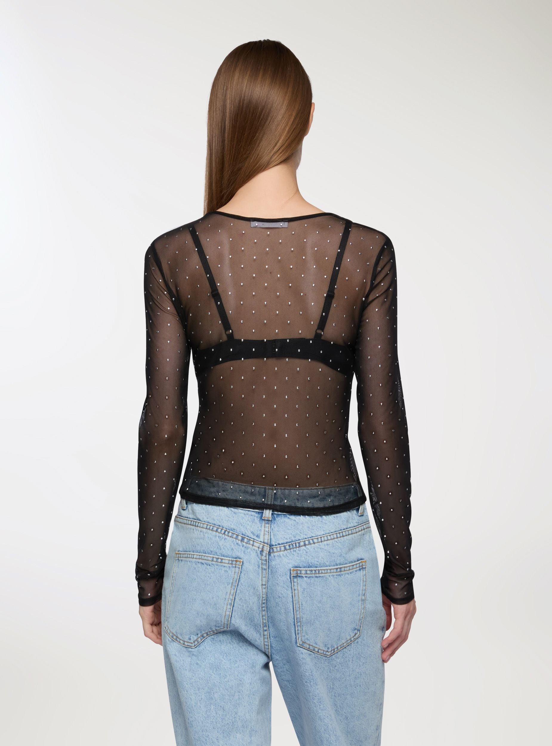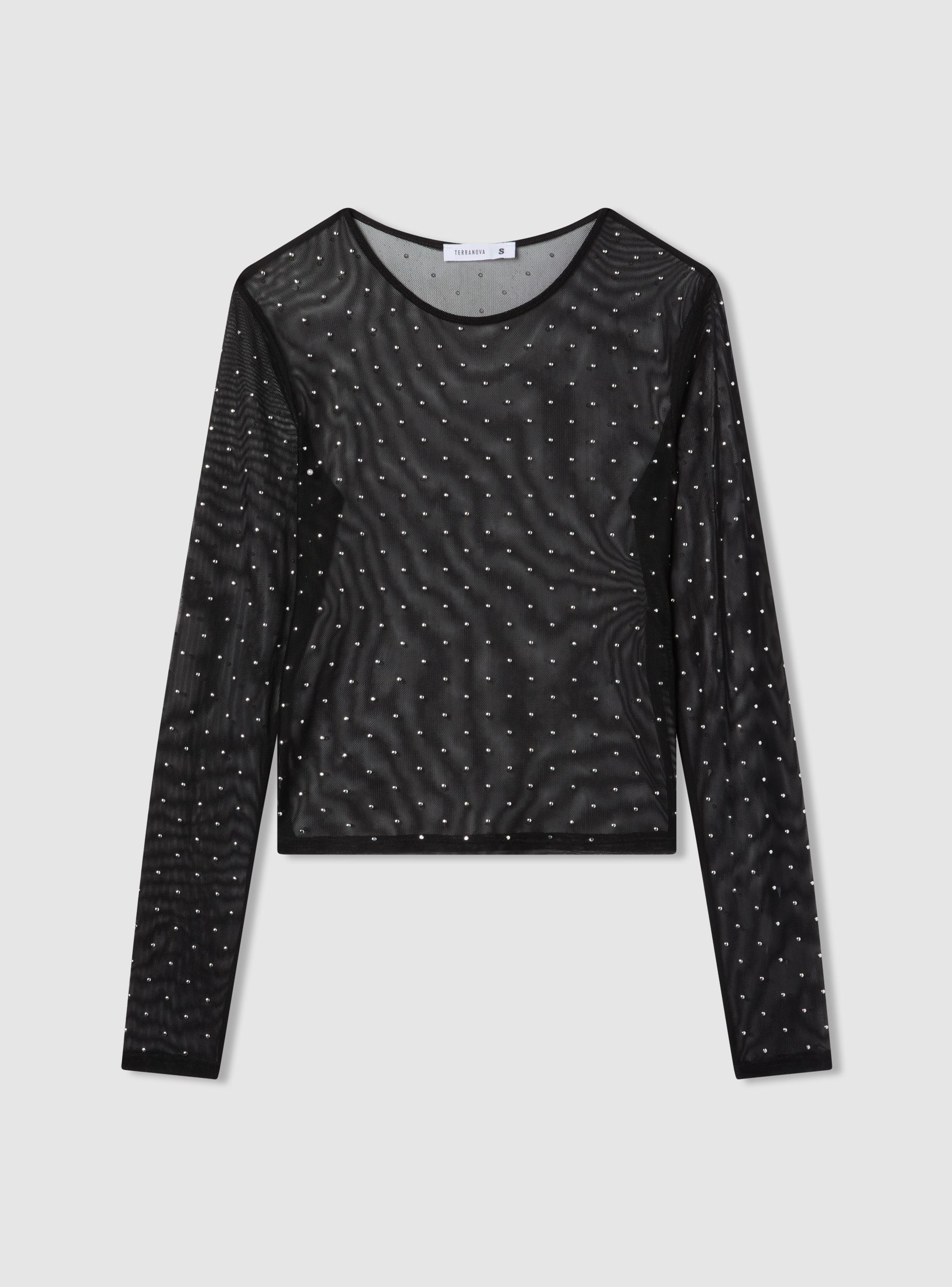 Dámské tričko s dlouhým rukávem, ideální pro elegantní večery nebo speciální události. Průhledný design s ozdobami z cvočků přidává moderní a sofistikovaný styl. Příjemně přiléhavý střih zvýrazňuje siluetu, díky čemuž je ideální k džínům nebo sukním pro módní a všestranný vzhled.