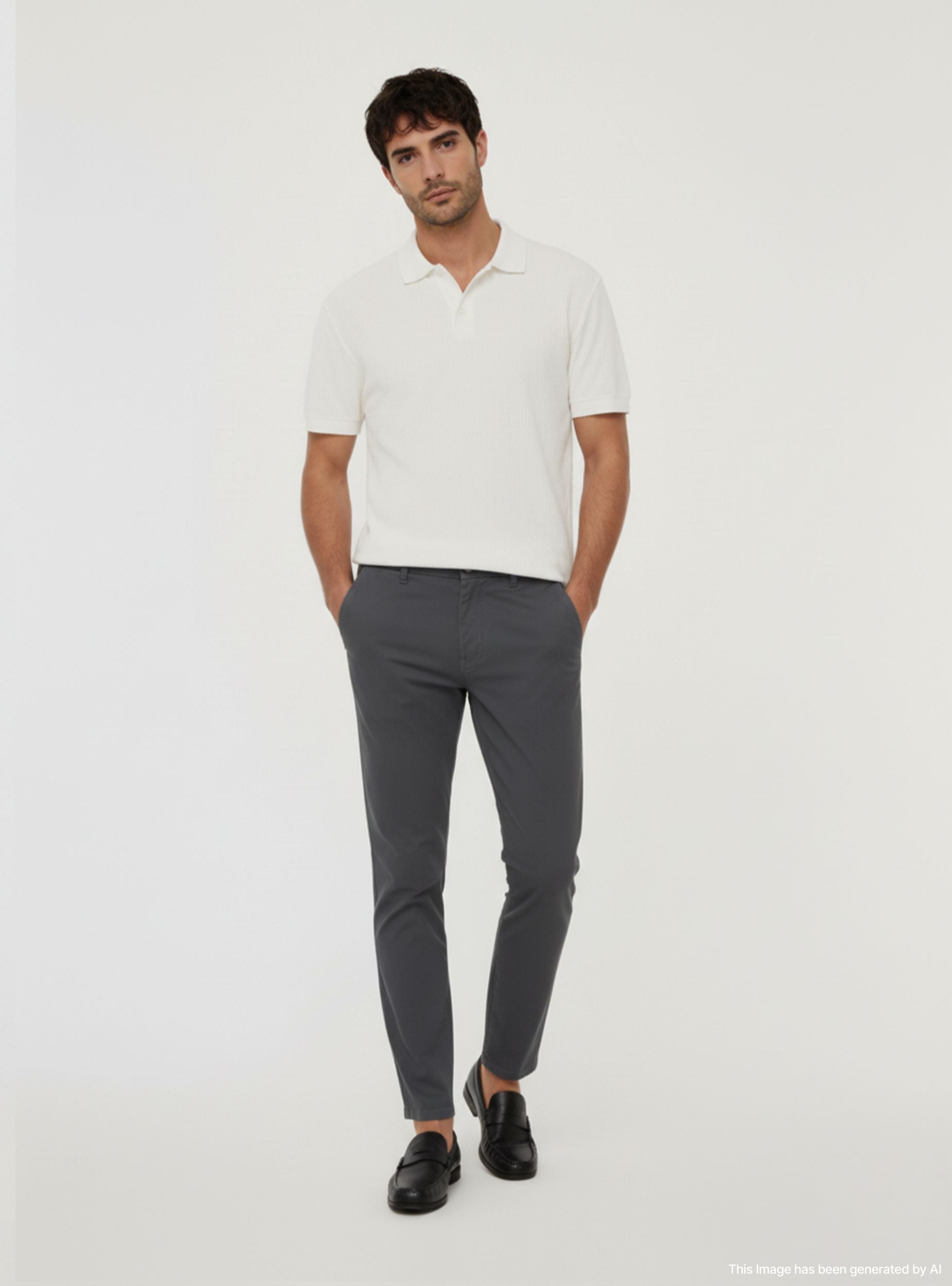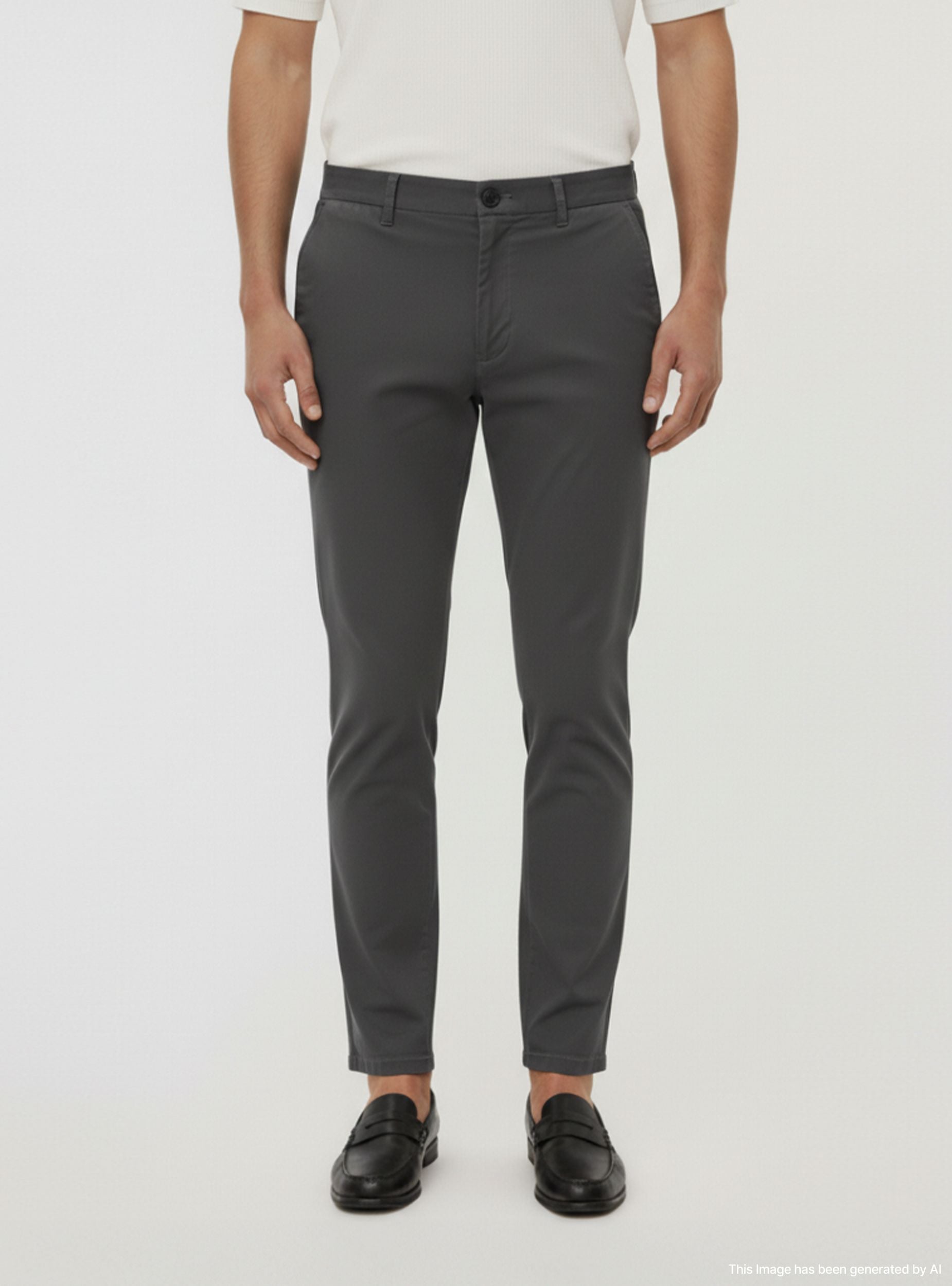Pánské chino kalhoty s moderním designem, charakterizované skinny siluetou, která zvýrazňuje postavu. Jednobarevný vzhled dodává všestrannost, ideální pro každou příležitost, zatímco praktické boční a zadní kapsy přidávají funkčnost. Regulární pas s předním zapínáním zaručuje pohodlí a přilnavost, což z těchto kalhot činí dokonalou volbu pro pečlivý a současný vzhled.