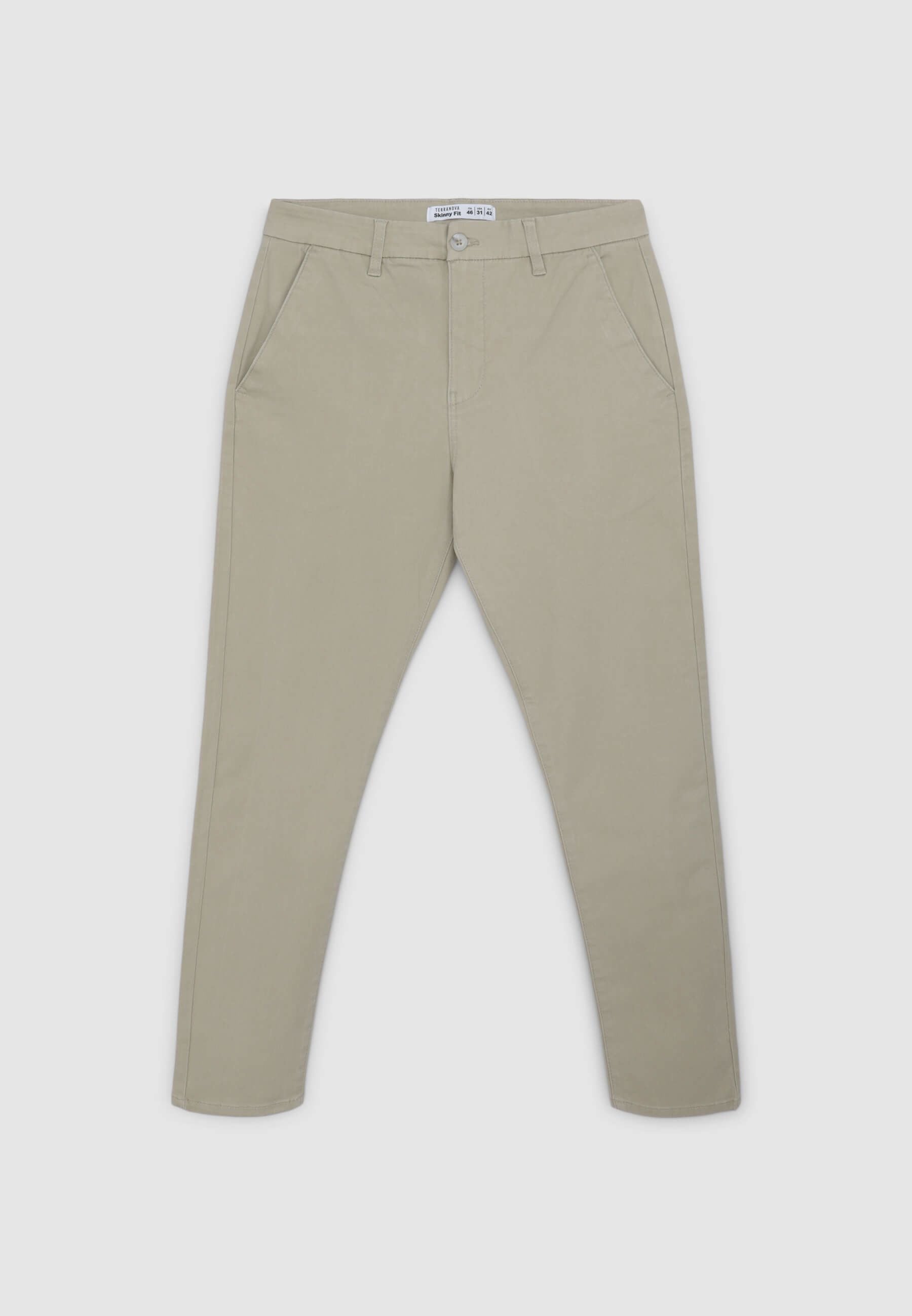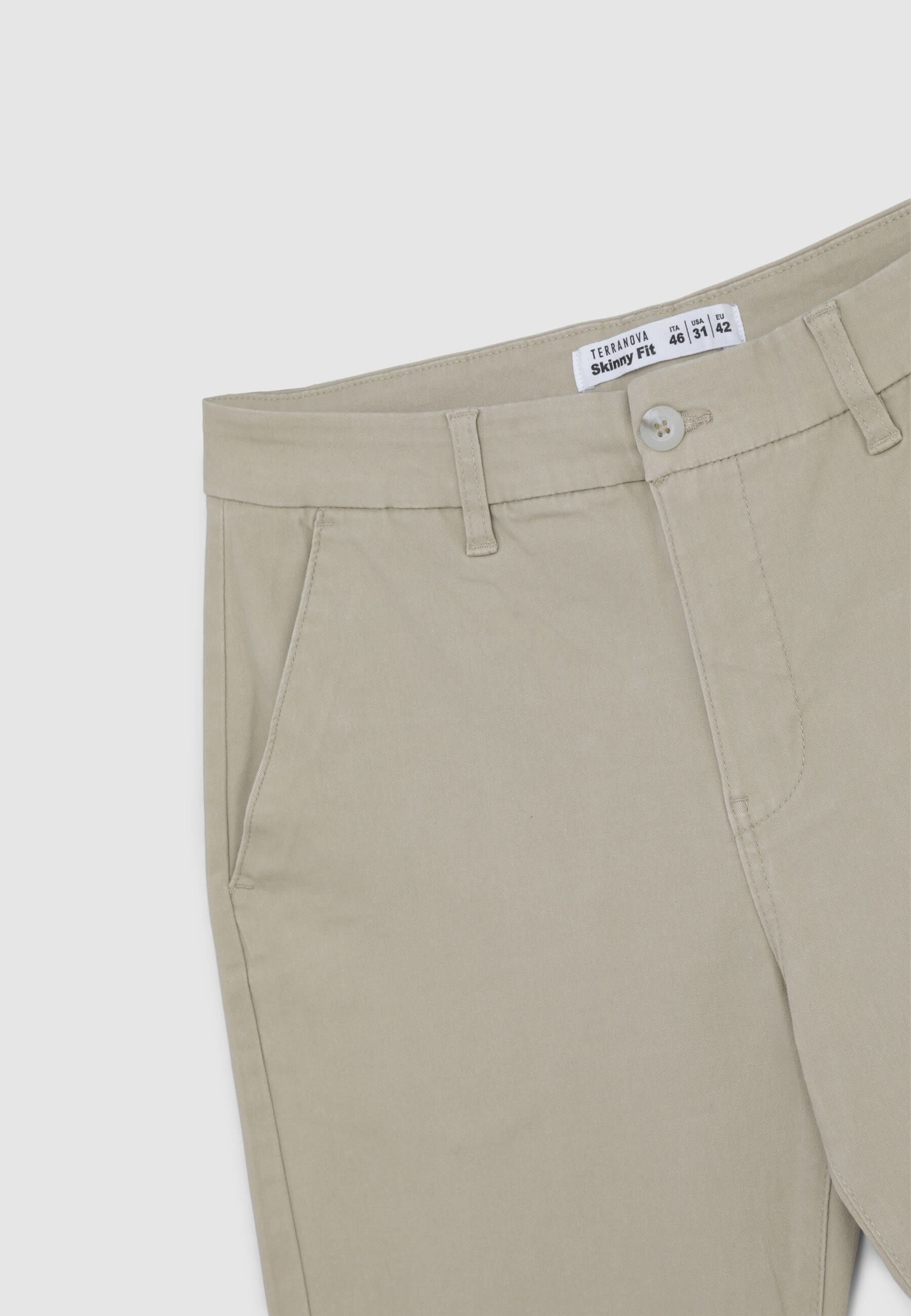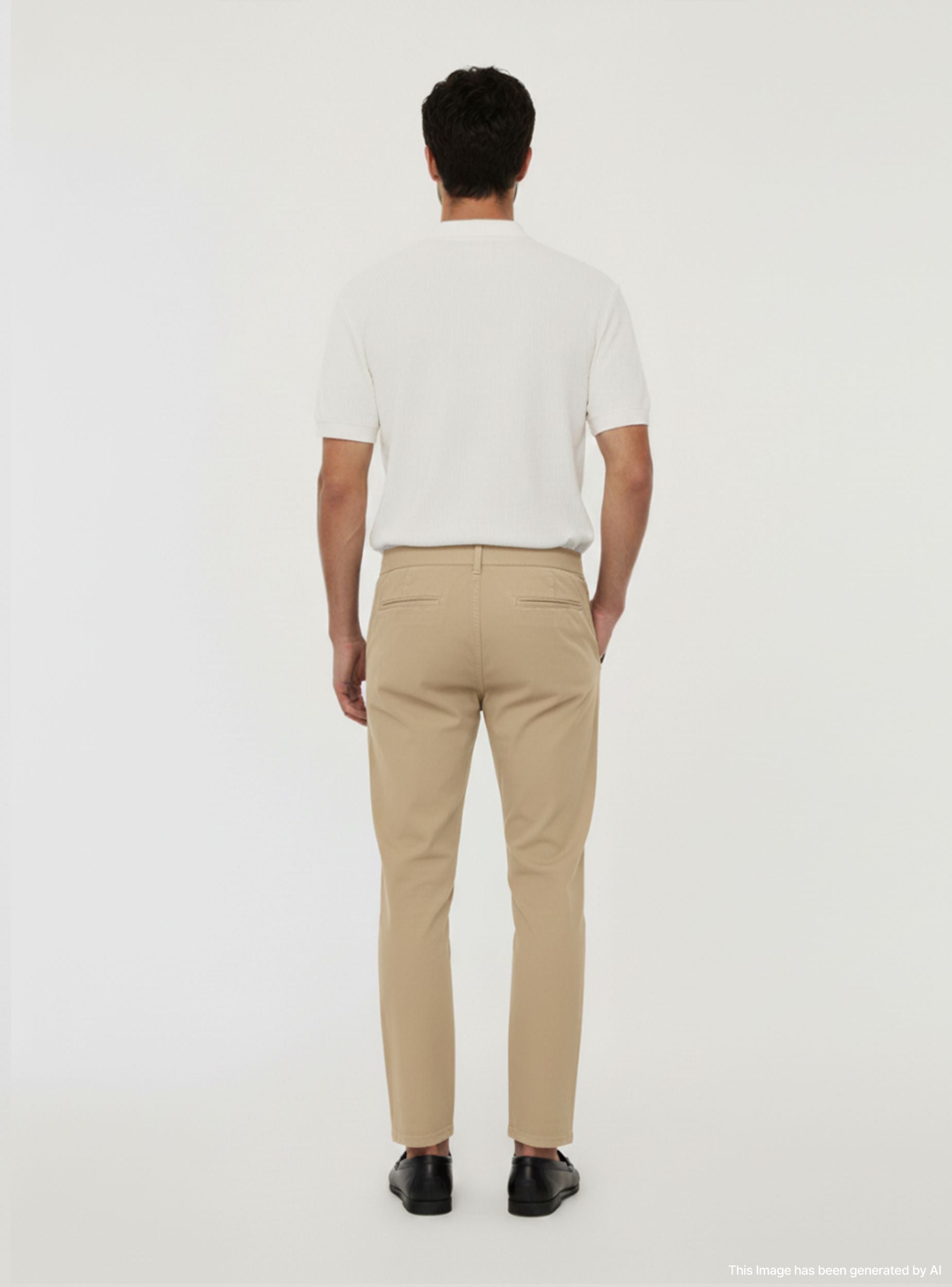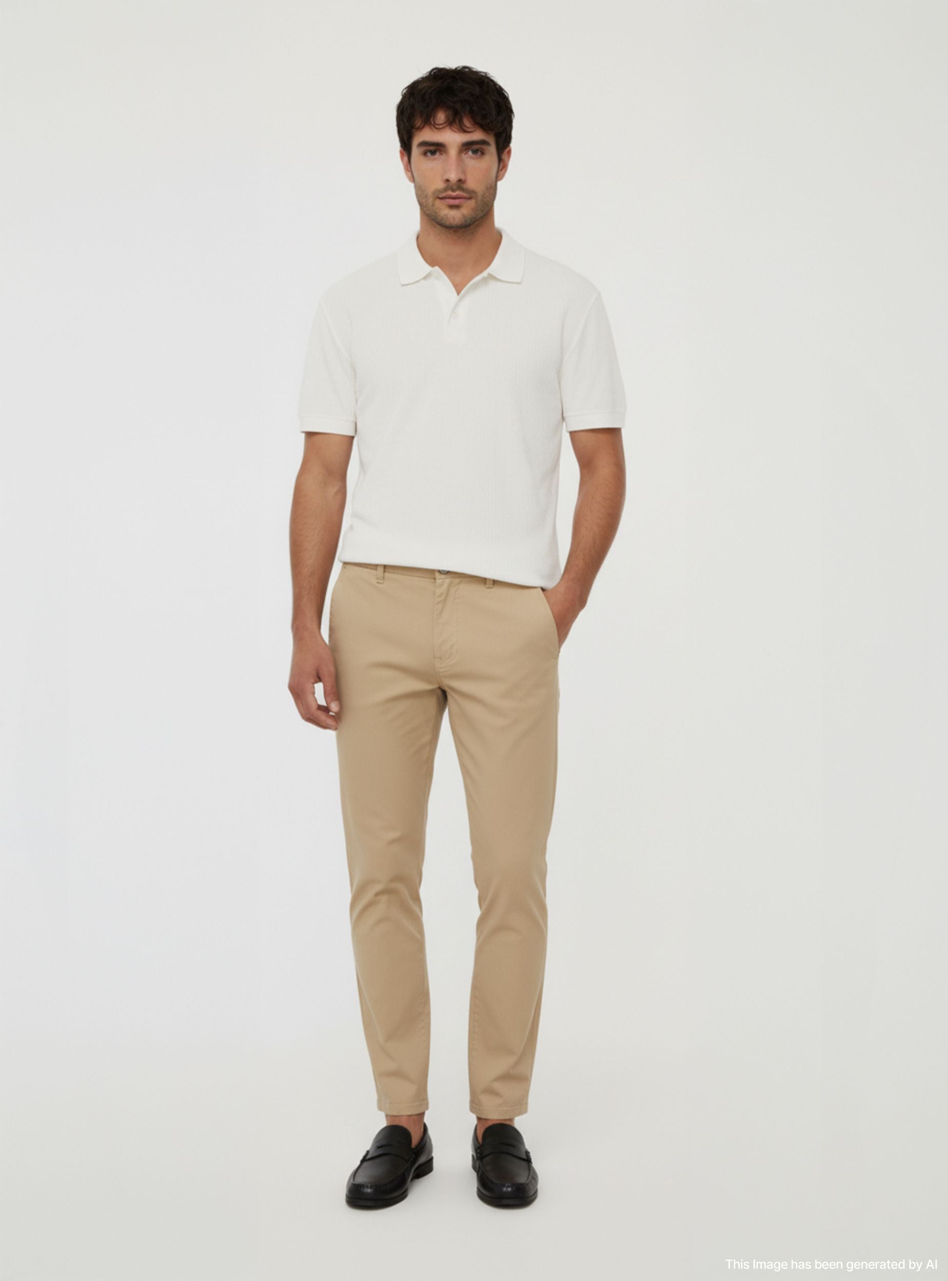 Pánské chino kalhoty s moderním designem, charakterizované skinny siluetou, která zvýrazňuje postavu. Jednoduchá barva dodává všestranný vzhled, ideální pro každou příležitost, zatímco praktické boční a zadní kapsy přidávají funkčnost. Regularní pas s předním zapínáním zajišťuje pohodlí a přiléhavost, což činí tyto kalhoty dokonalou volbou pro pečlivý a současný vzhled.Detaily