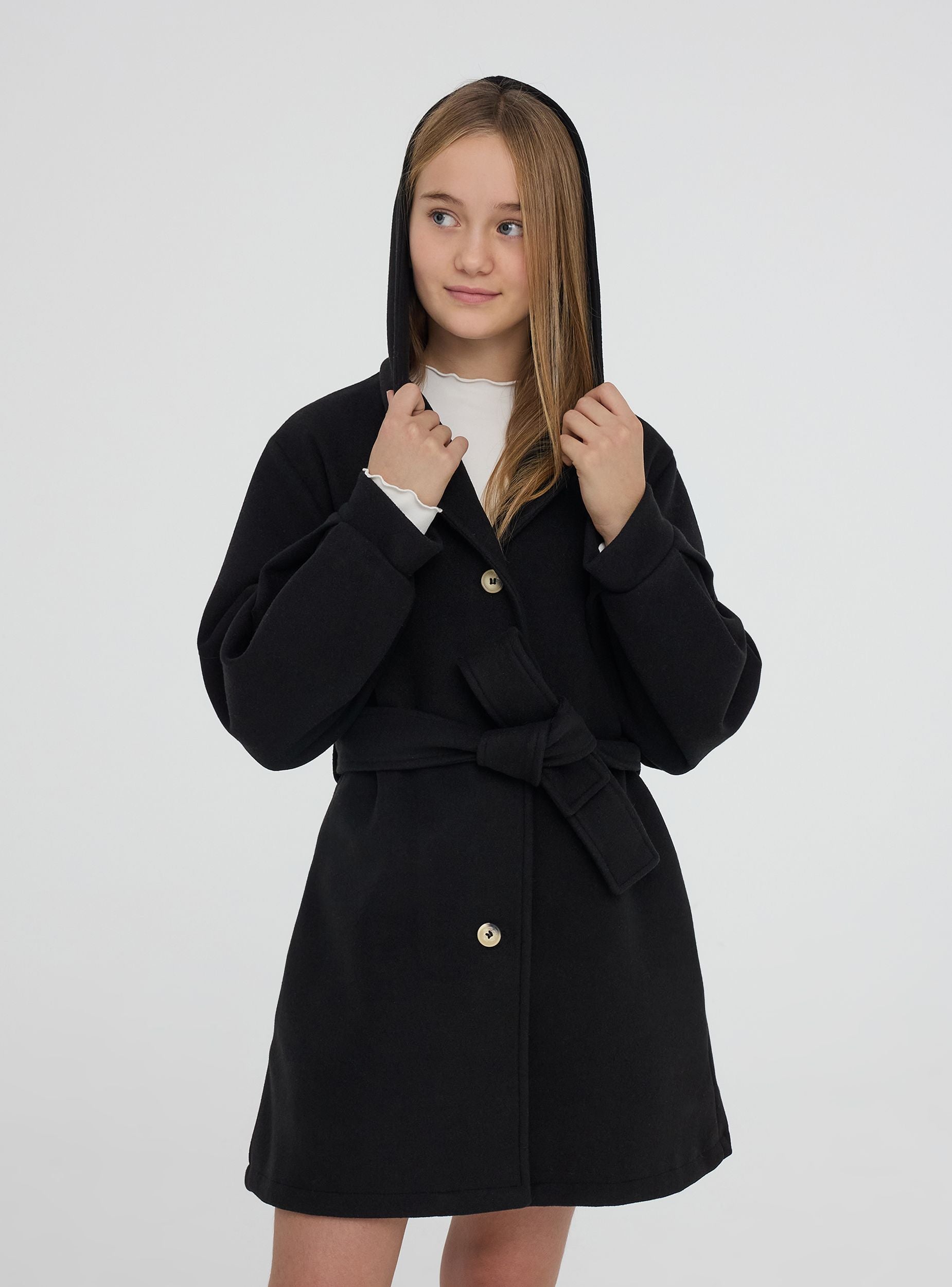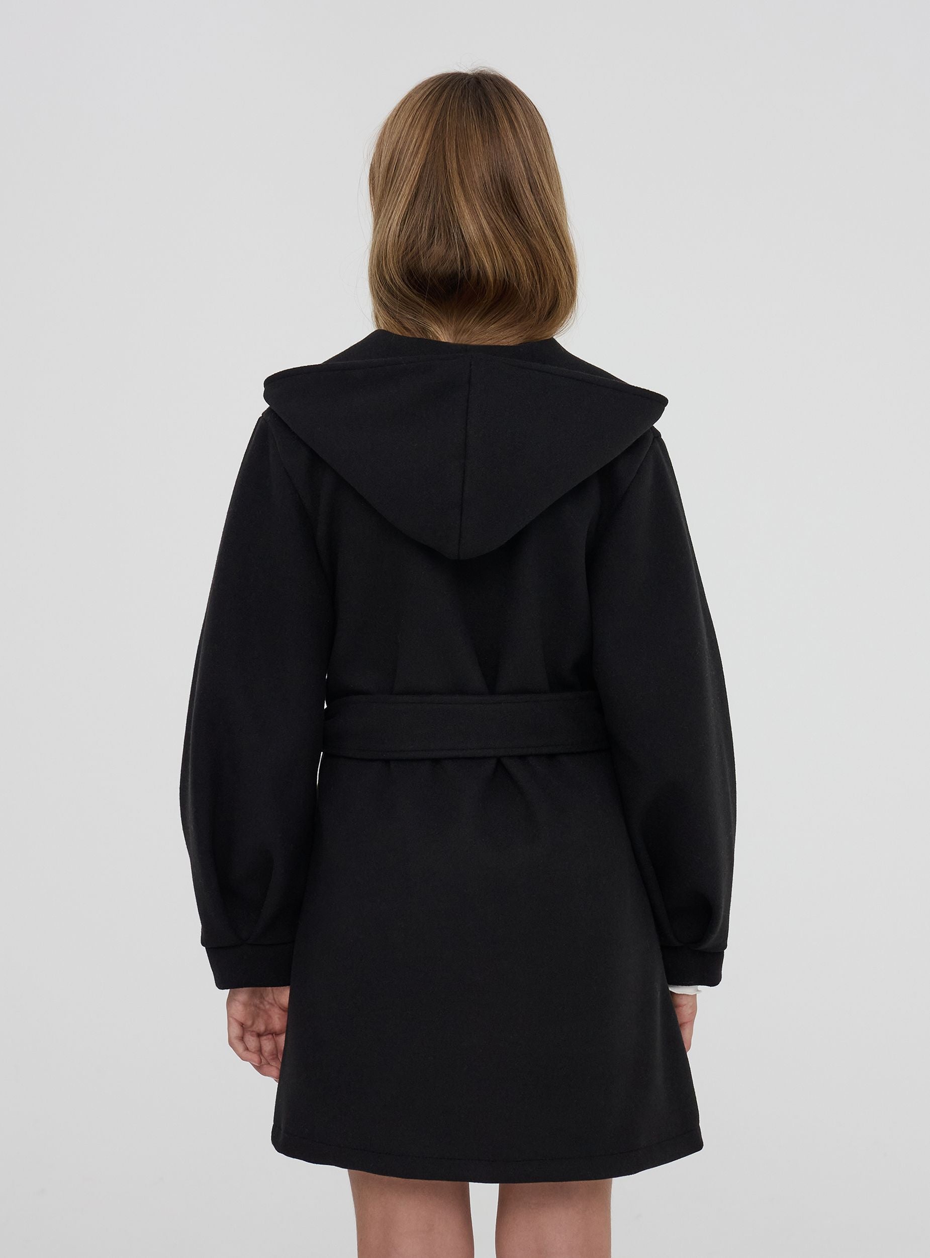 Dětský kabát s kapucí, charakterizovaný předním zapínáním na knoflíky a páskem v pase pro nastavitelný střih. Rukávy jsou dlouhé a končí manžetami. Design zahrnuje boční kapsy a vnitřní podšívku, která poskytuje další pohodlí a teplo. Kabát je navržen tak, aby byl elegantní a praktický, ideální pro chladnější období.