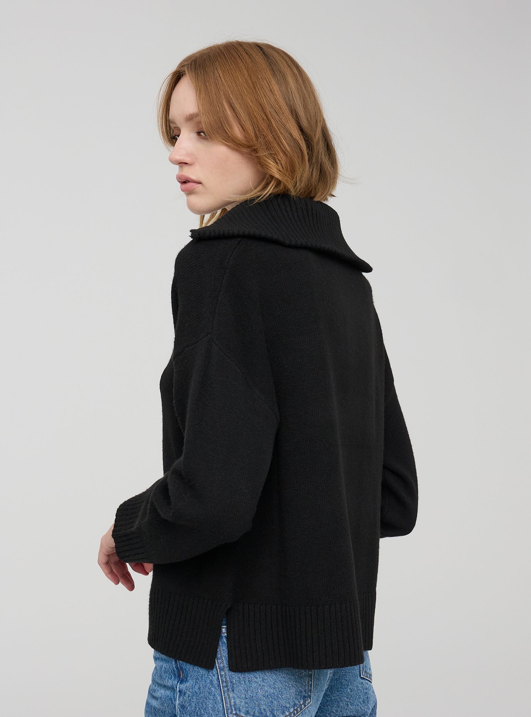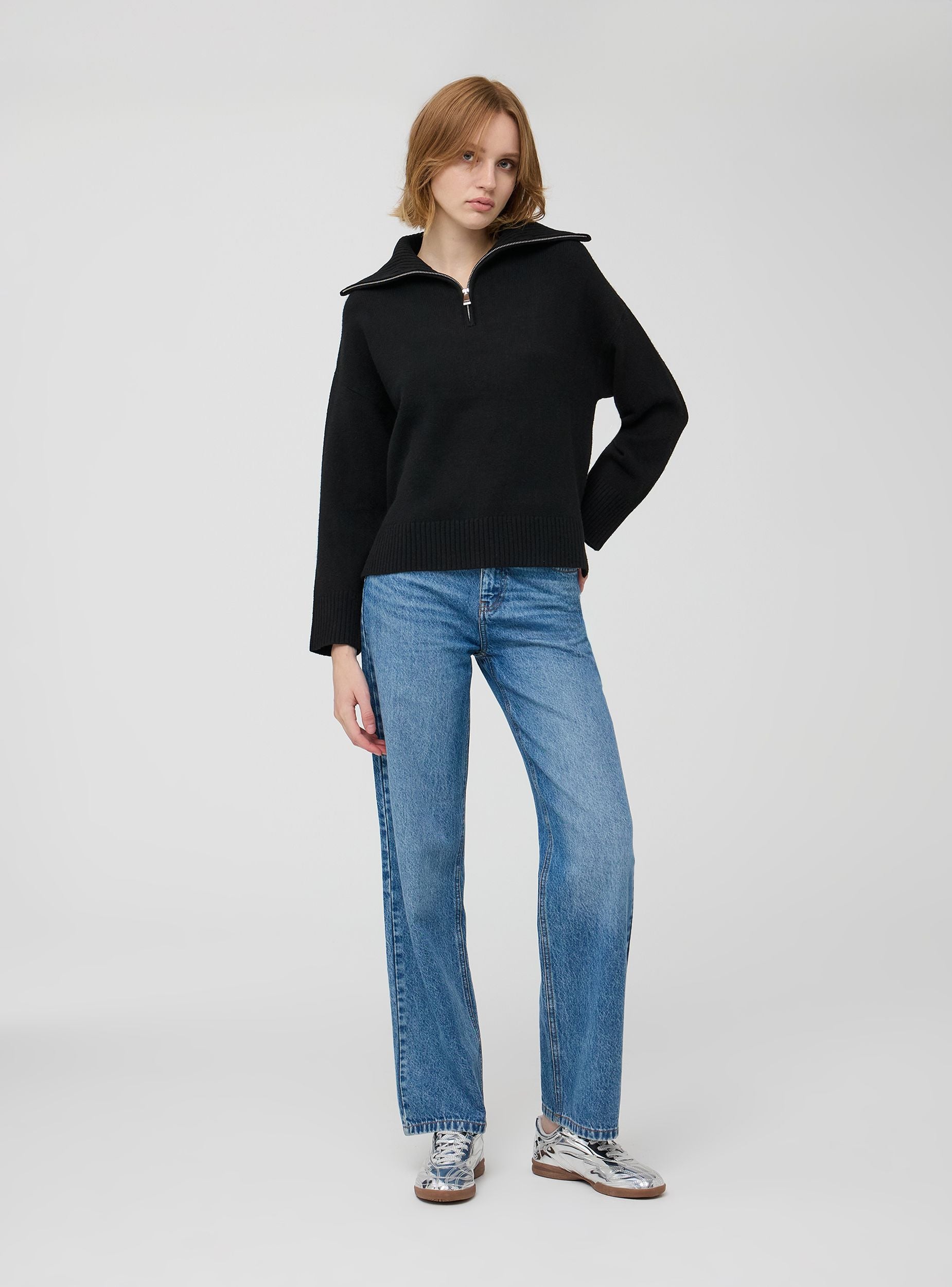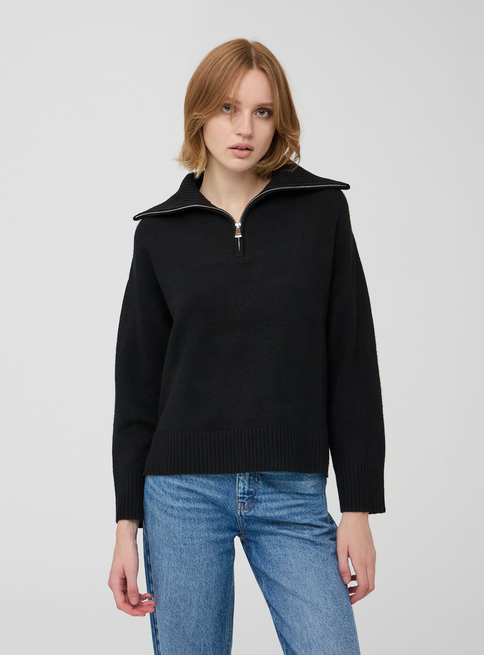 Dámský svetr s vysokým límcem a polovičním zipem. Jednobarevná tkanina, volný a pohodlný střih. Ideální pro ležérní a všestranný vzhled.Detaily