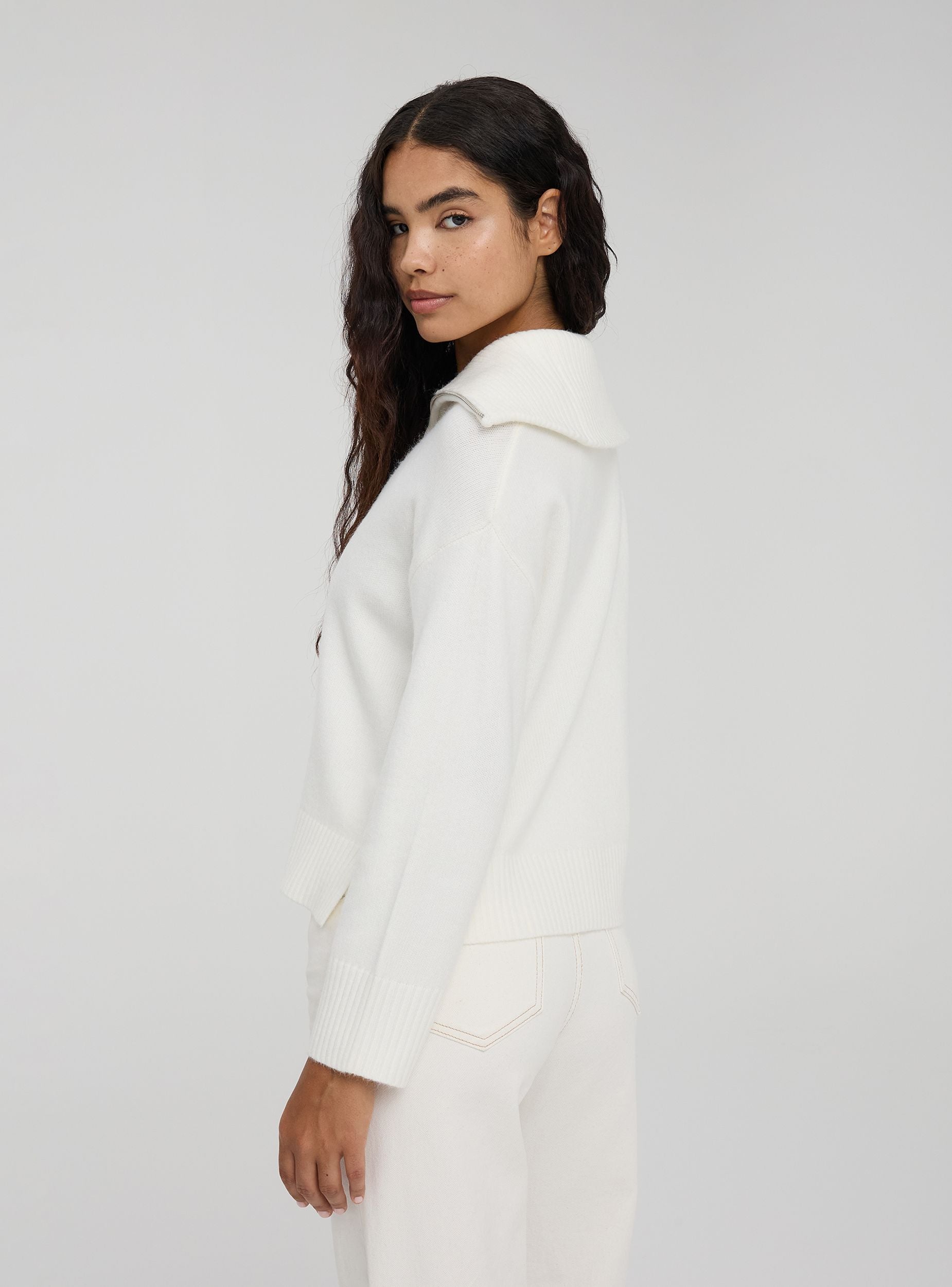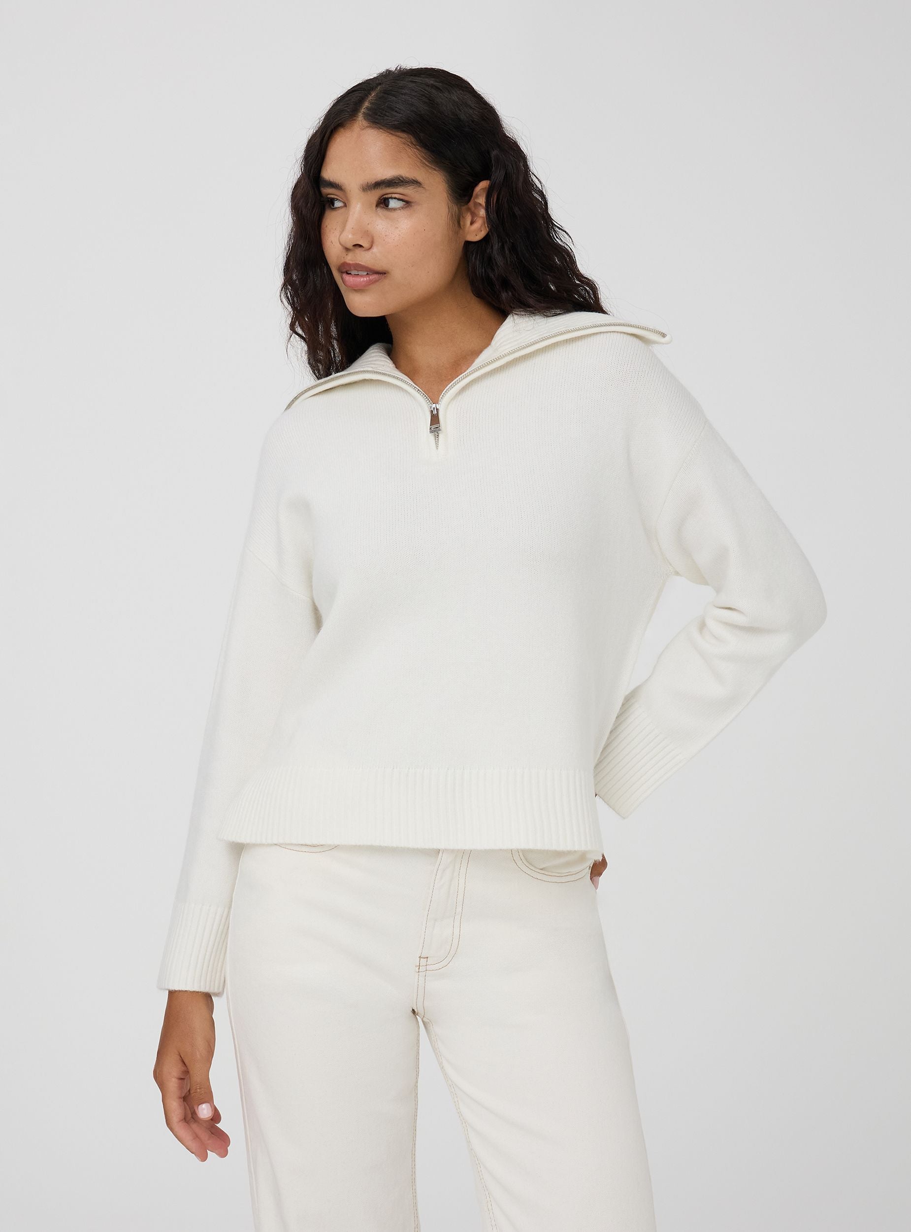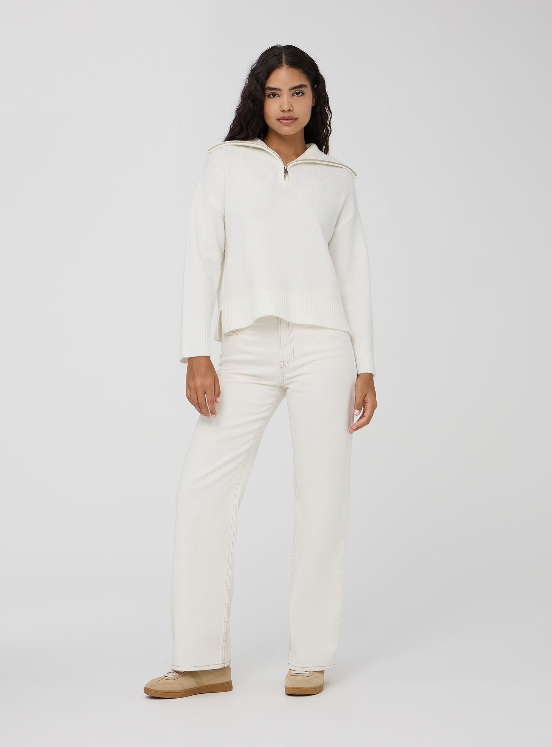 Dámský svetr s vysokým límcem a polovičním zipem. Jednobarevná tkanina, volný a pohodlný střih. Perfektní pro ležérní a všestranný vzhled.
