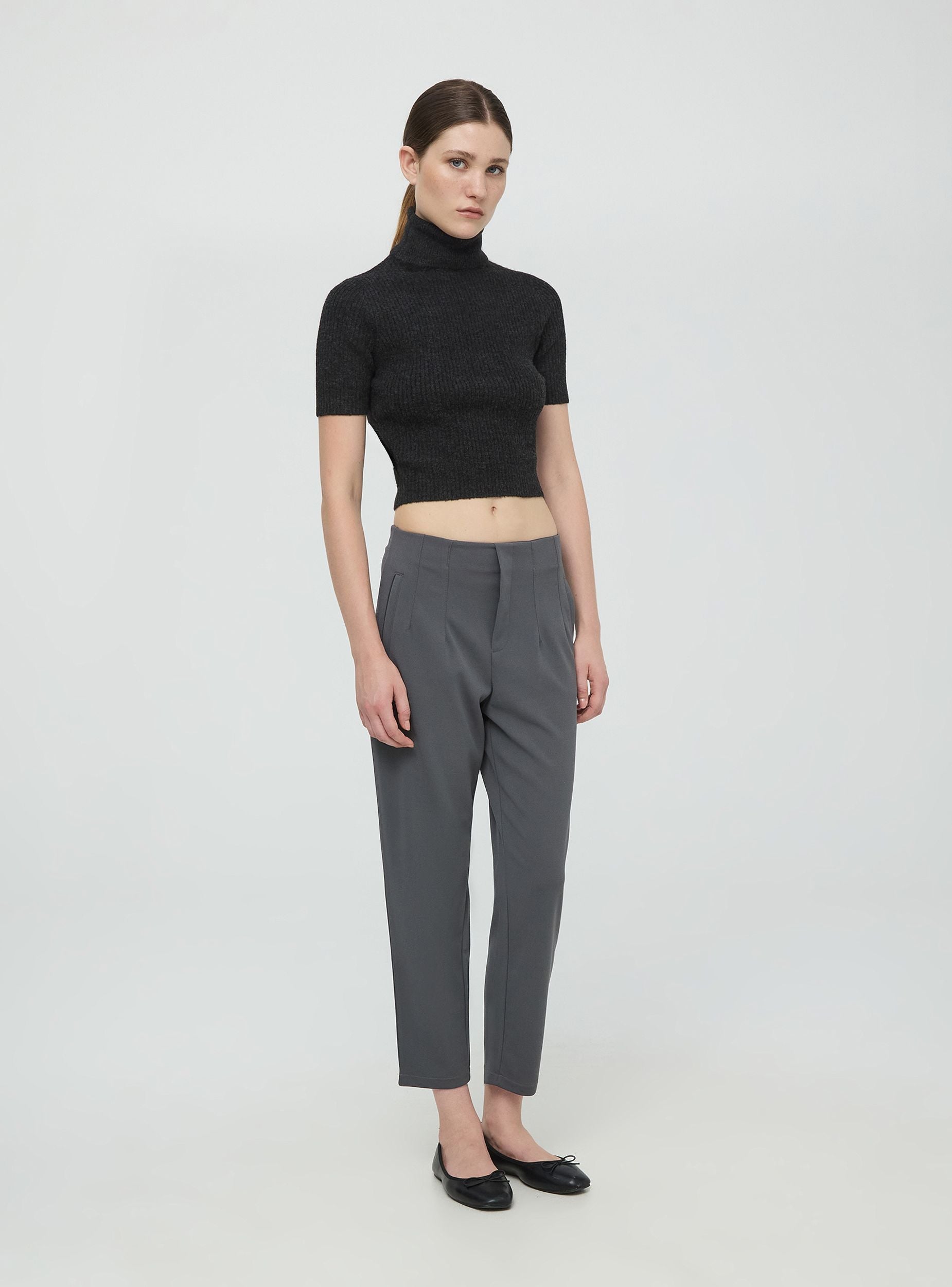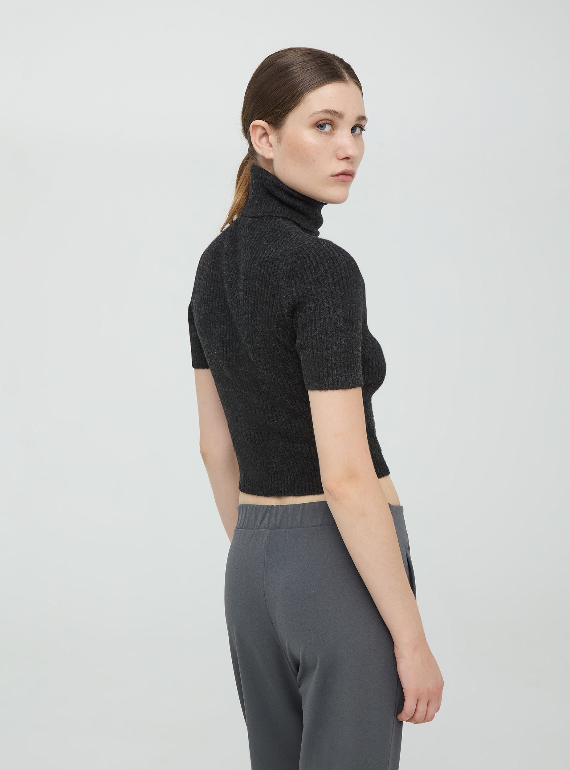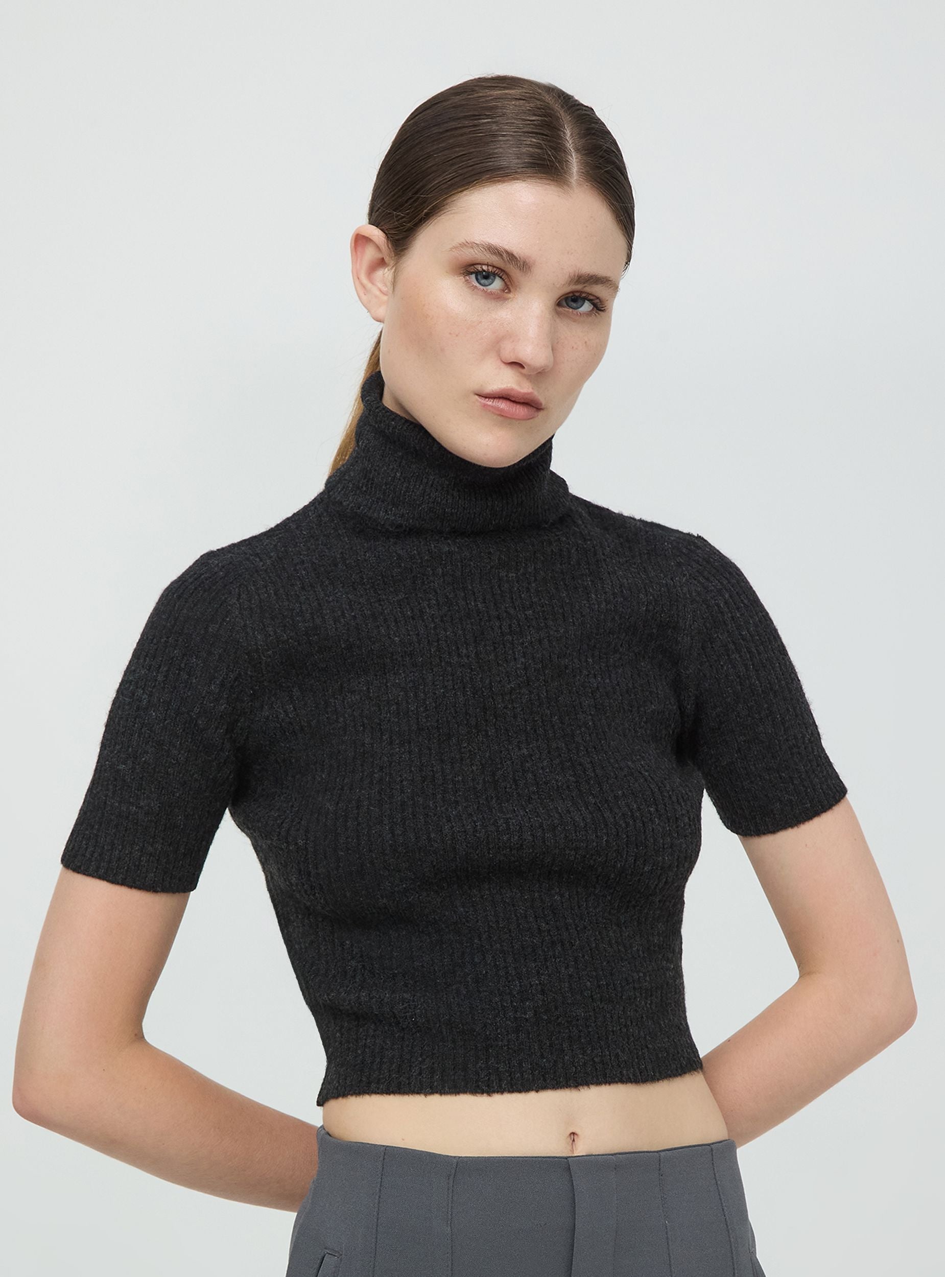 Dámský rolák, charakterizovaný elegantním a sofistikovaným designem. Vyrobený z měkké pleteniny, má vysoký límec, který jemně obepíná krk, což poskytuje pohodlí a teplo. Rukávy jsou krátké, což z něj činí ideální k různým kombinacím oblečení. Svetr je pletený do jemného žebrování, což dodává rafinovanou texturu a přiléhavý střih, který zvýrazňuje ženskou siluetu.Detaily