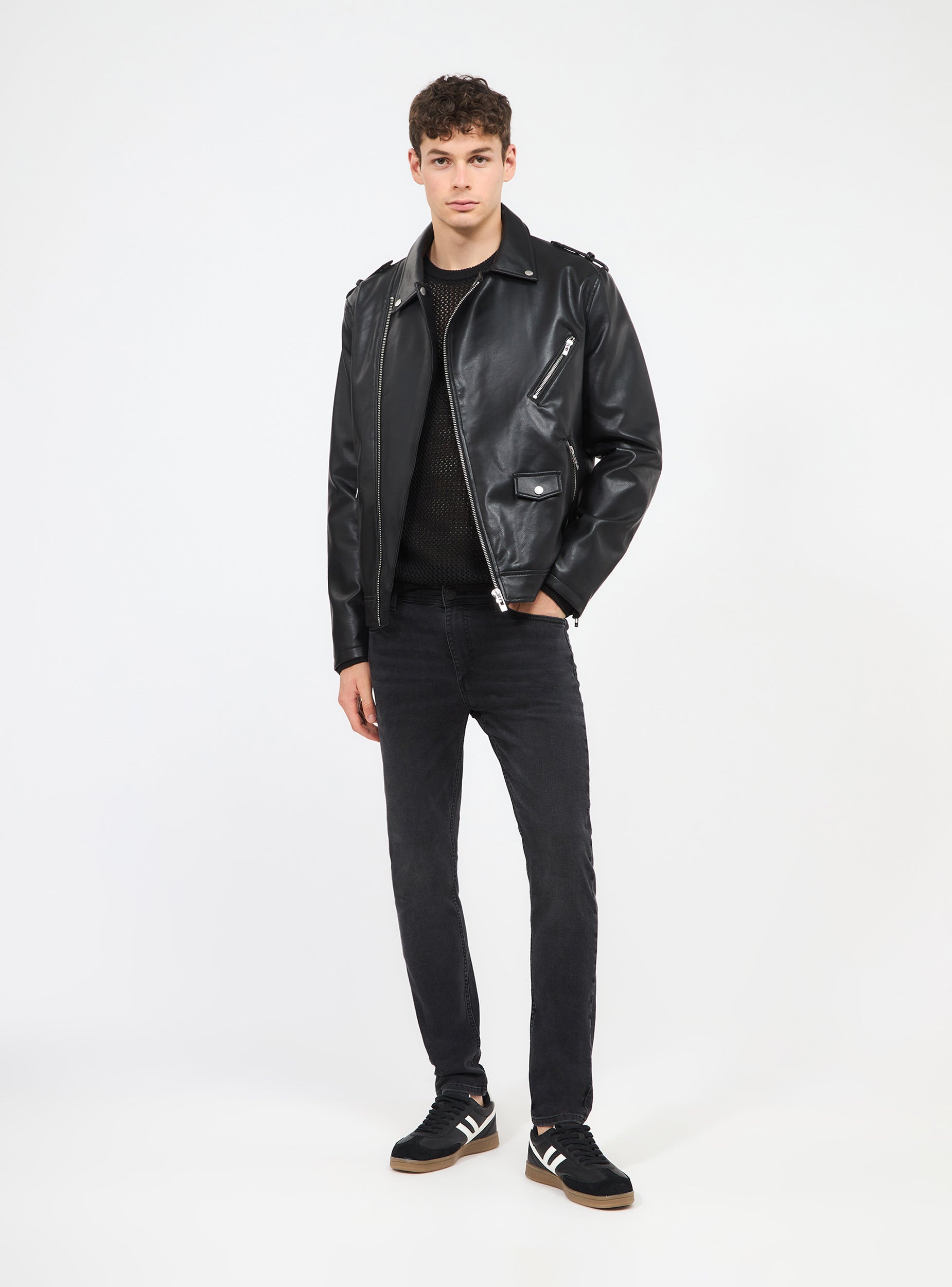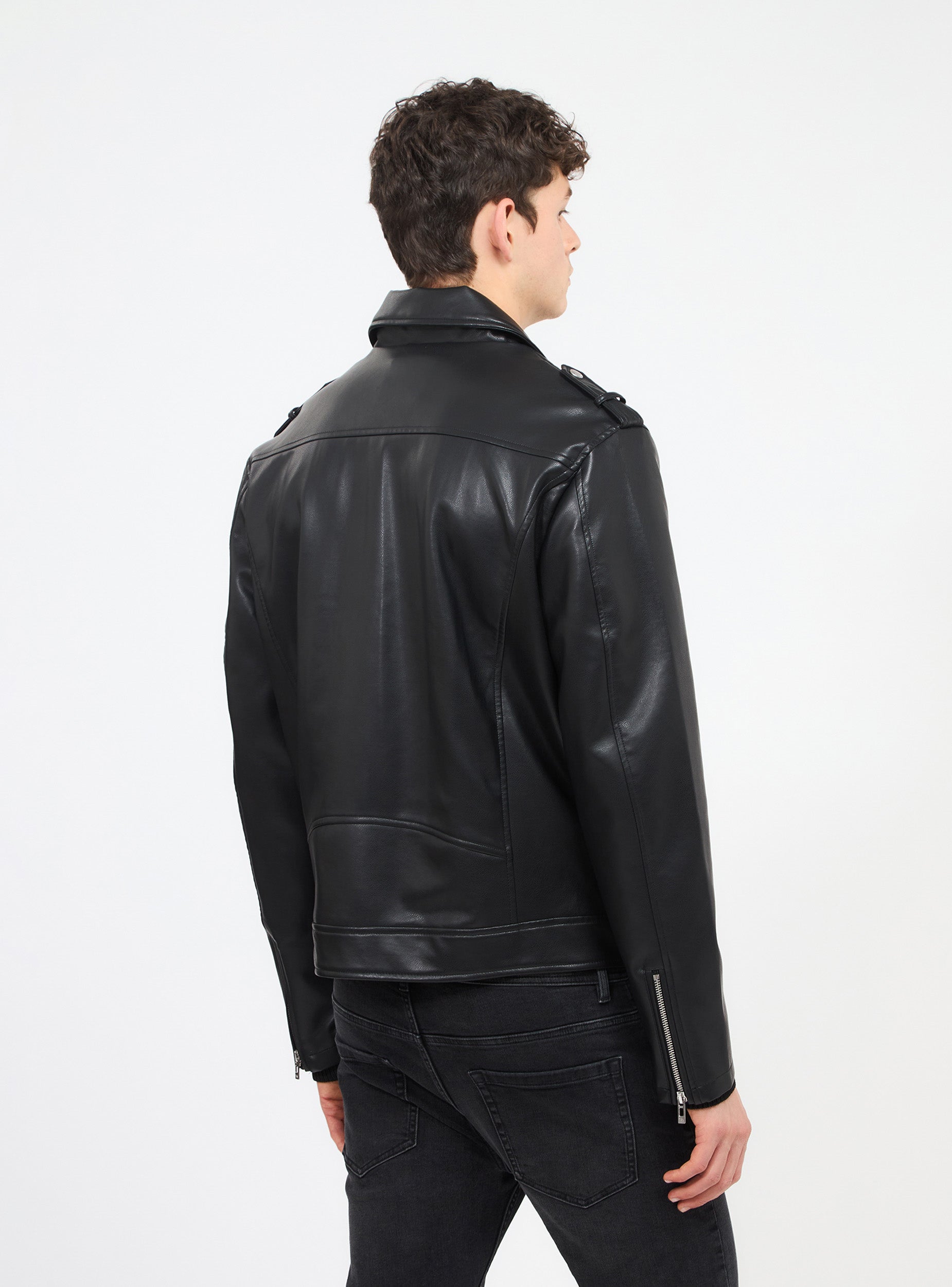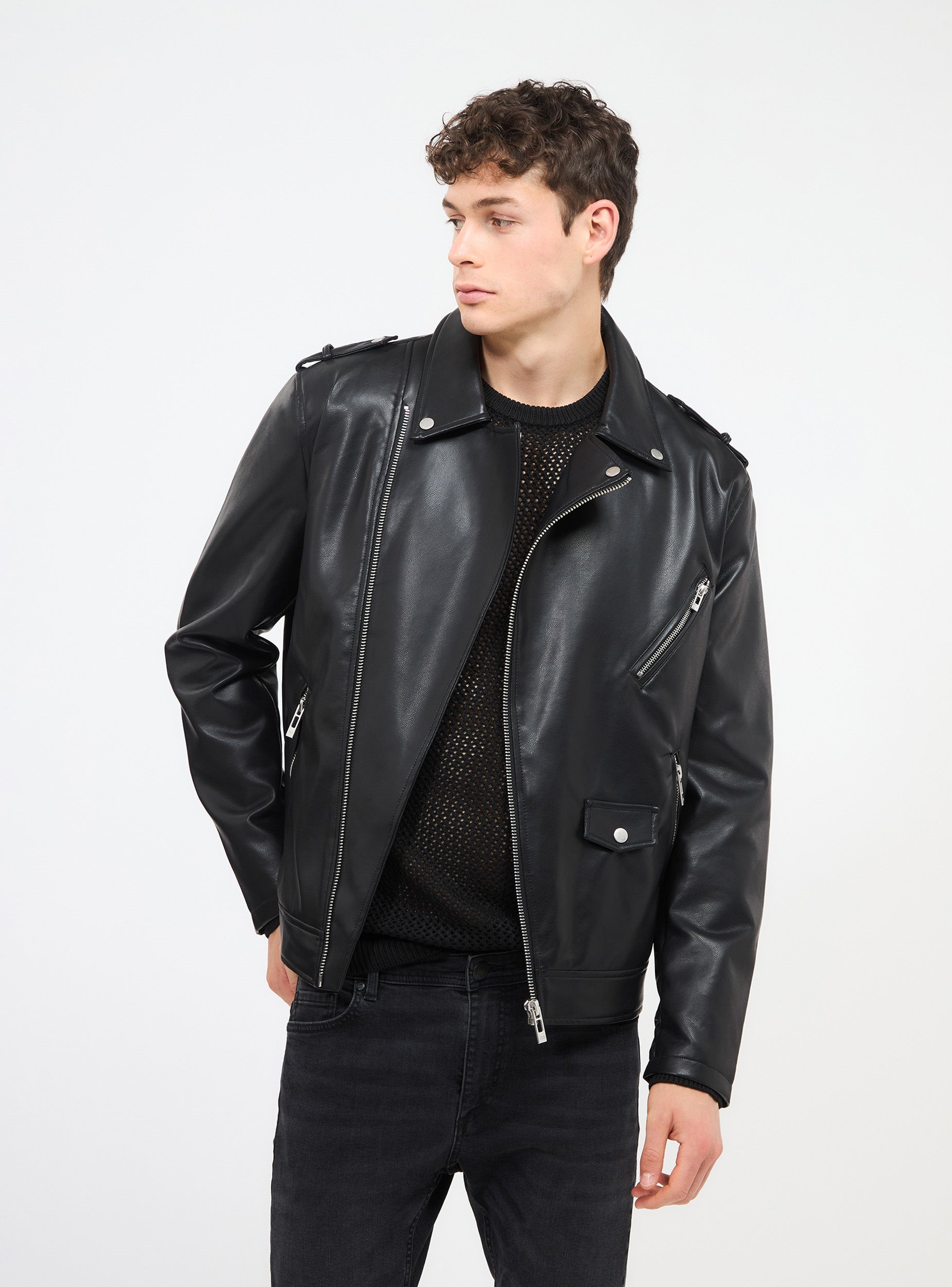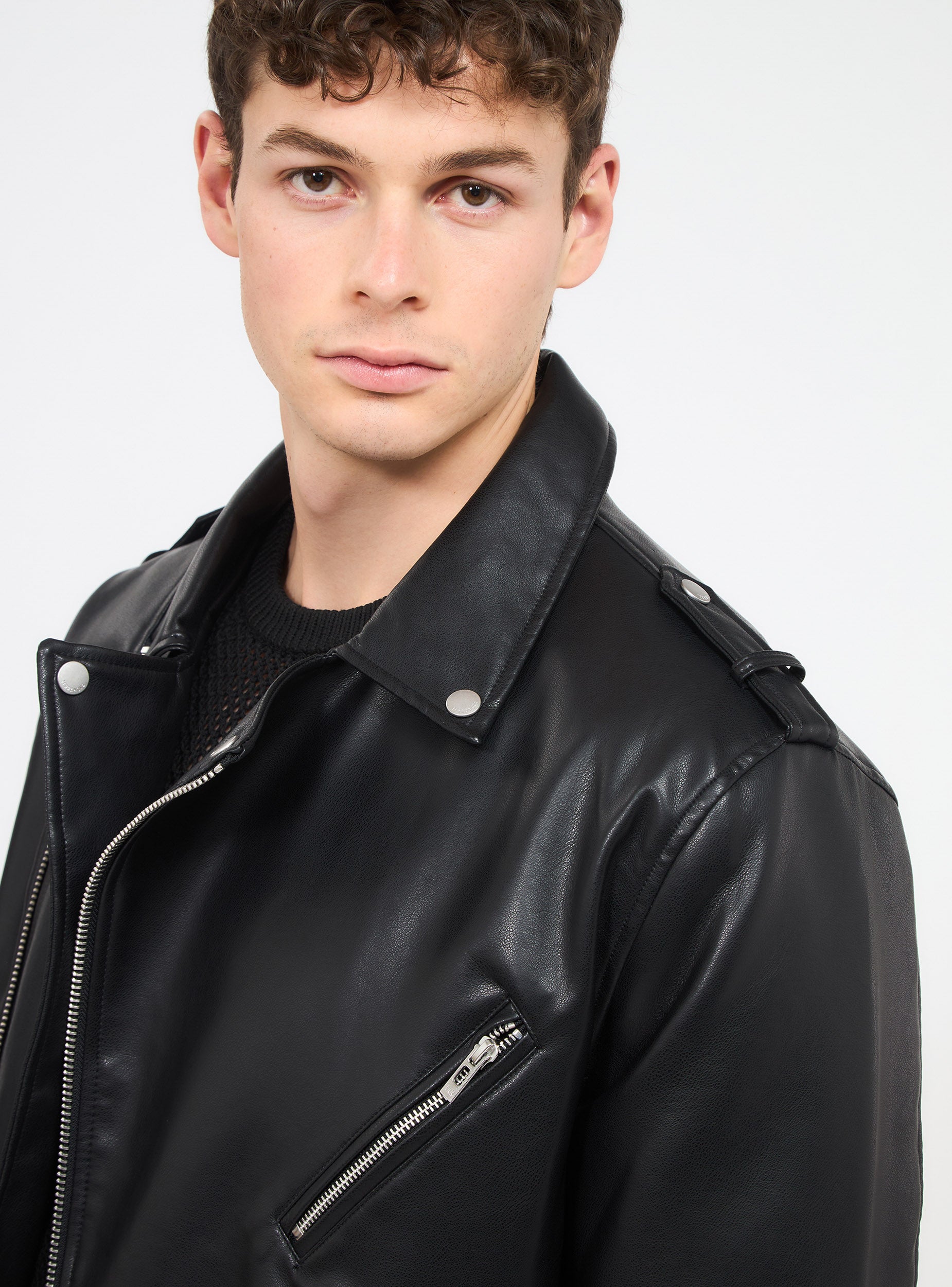 Giubbino similpelle da uomo. Modello chiodo con colletto a revers. Tasche frontali e chiusura con zip in metallo. Fodera interna.