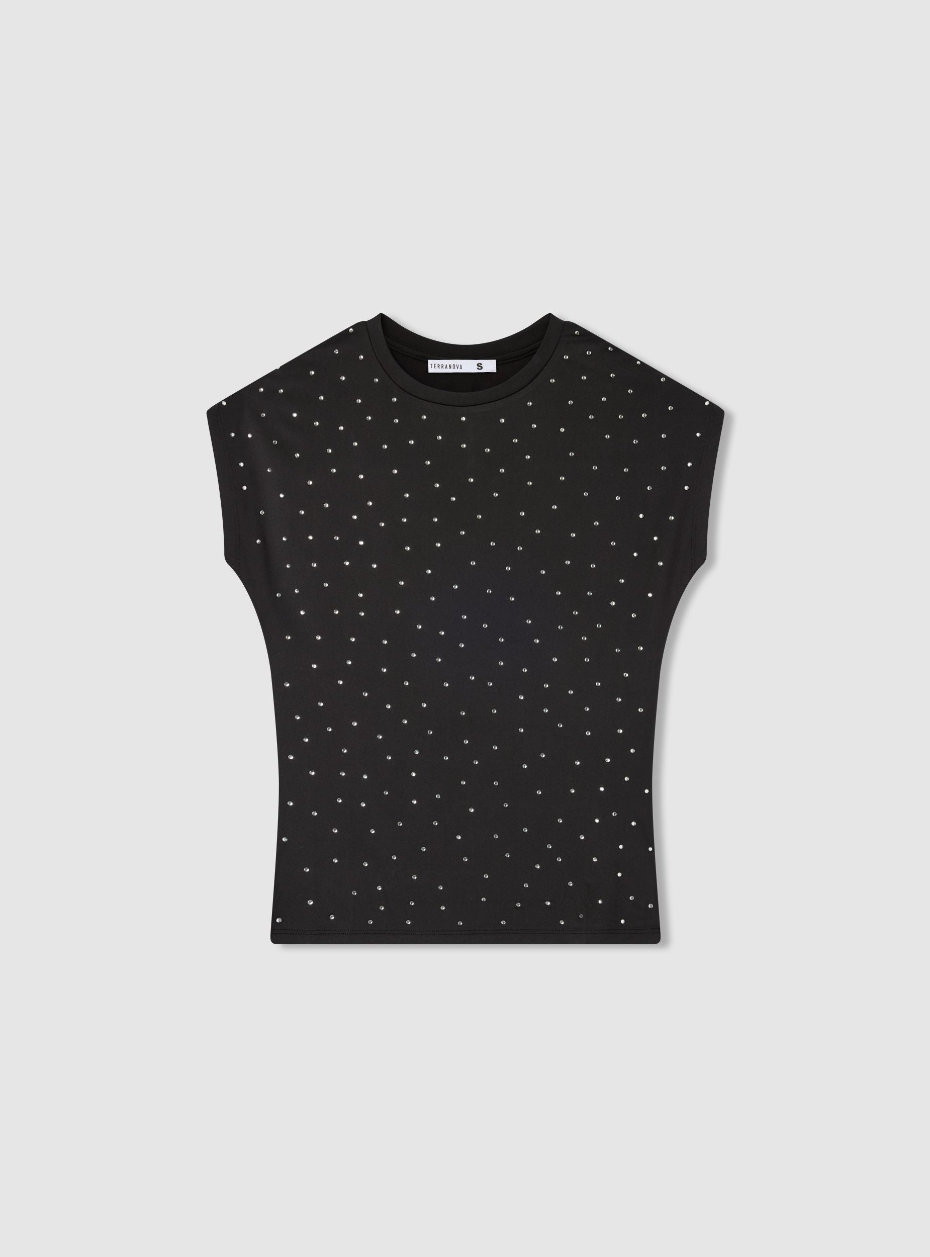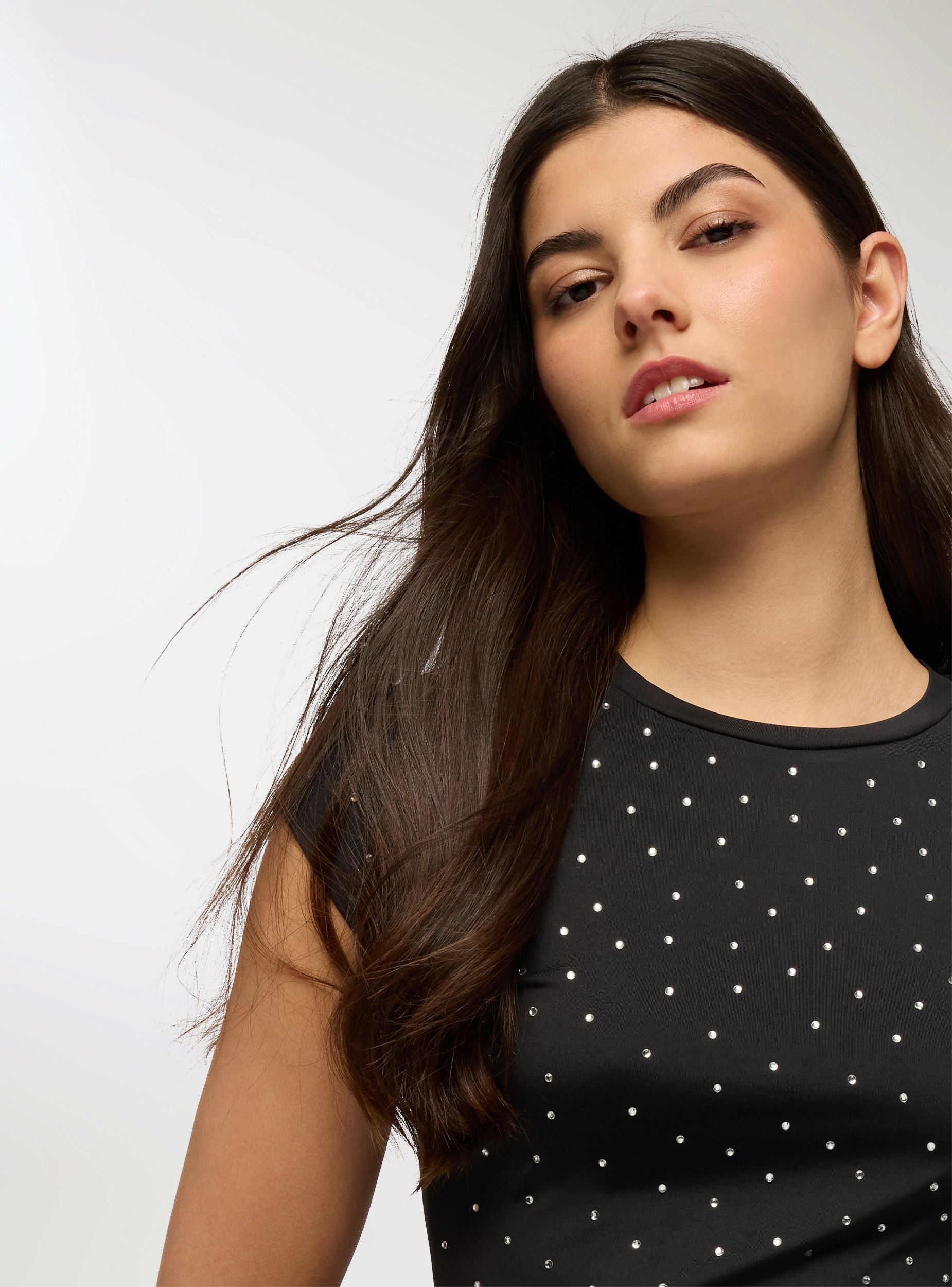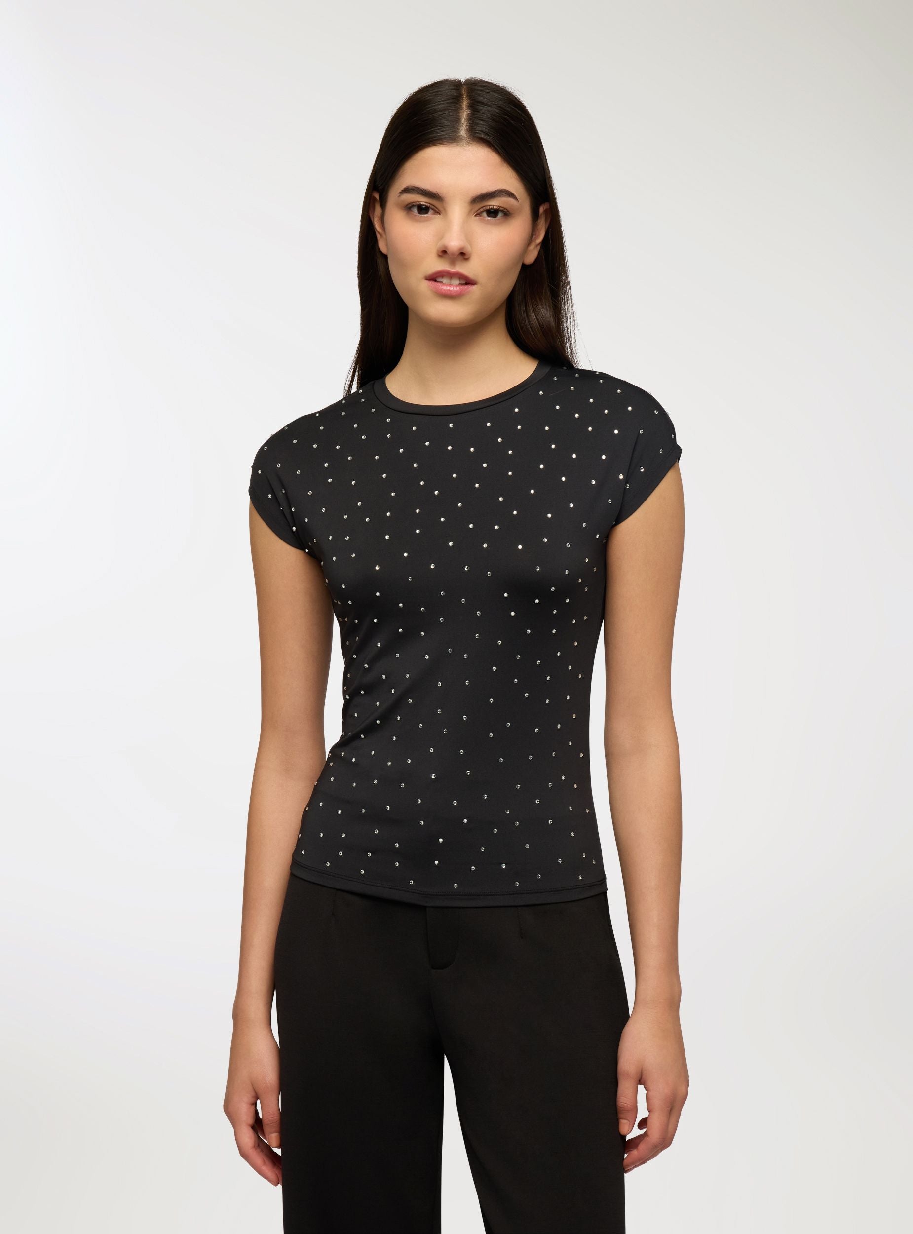Dámské tričko s dekorací z kamínků, ideální pro přidání elegance do vašeho každodenního stylu. Má přiléhavý střih s krátkými rukávy a kulatým výstřihem, perfektní pro kombinaci s kalhotami nebo sukněmi pro sofistikovaný vzhled. Dekorace z kamínků dodává lesk a styl, díky čemuž je vhodné pro neformální příležitosti nebo večery s přáteli.Detaily