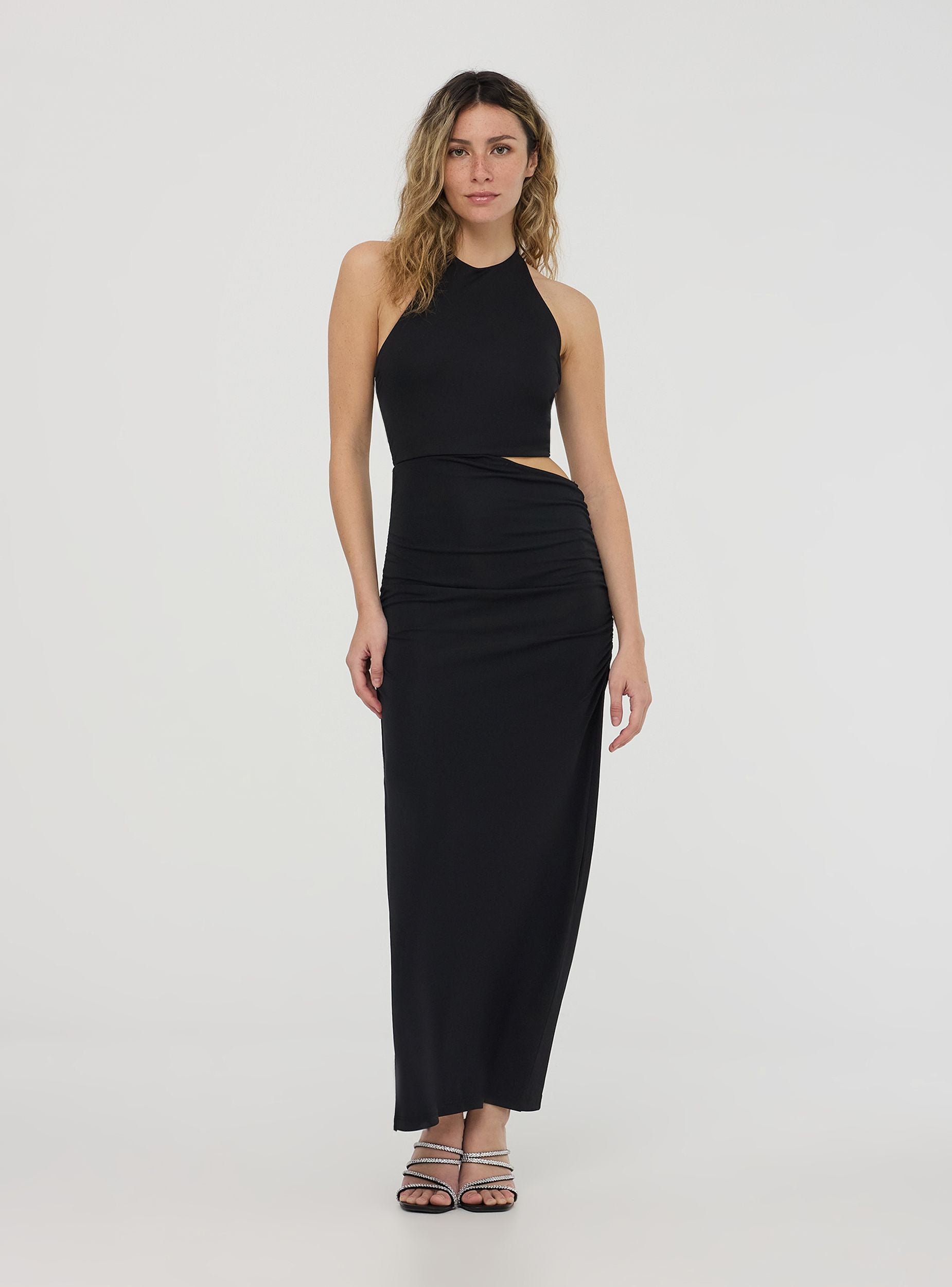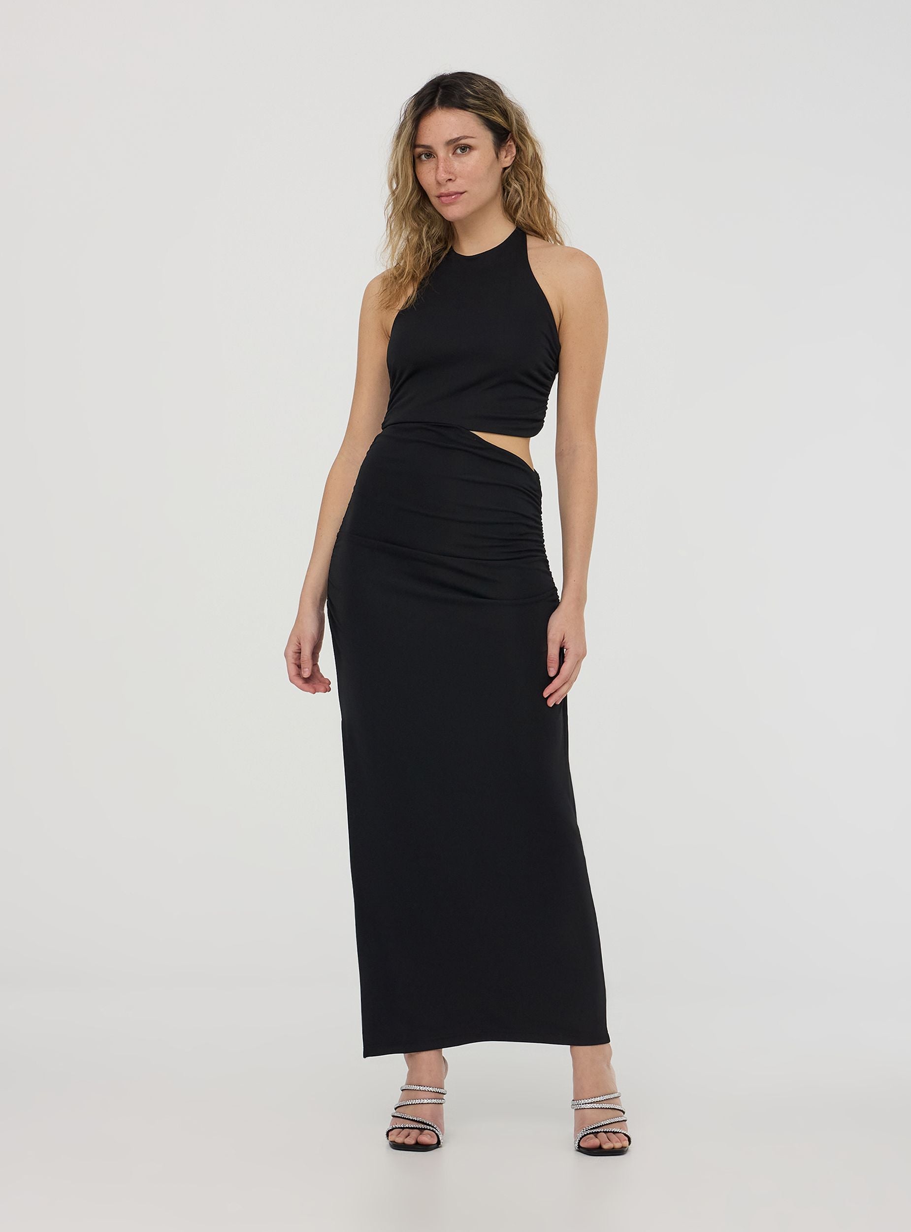Dlouhé dámské šaty v jednobarevném provedení, ideální pro ty, kteří hledají eleganci s nádechem odvážnosti. Design má americké výstřih, který zvýrazňuje ramena a dodává rafinovaný vzhled. Charakteristický výřez přidává zajímavý prvek, odhalující část dekoltu a vytvářející efekt diskrétní svůdnosti. Elastické, tyto šaty přirozeně obepínají siluetu, zajišťují pohodlí a svobodu pohybu. Ideální pro speciální večery nebo příležitosti, kdy chcete mít sofistikovaný a současný vzhled.Detaily