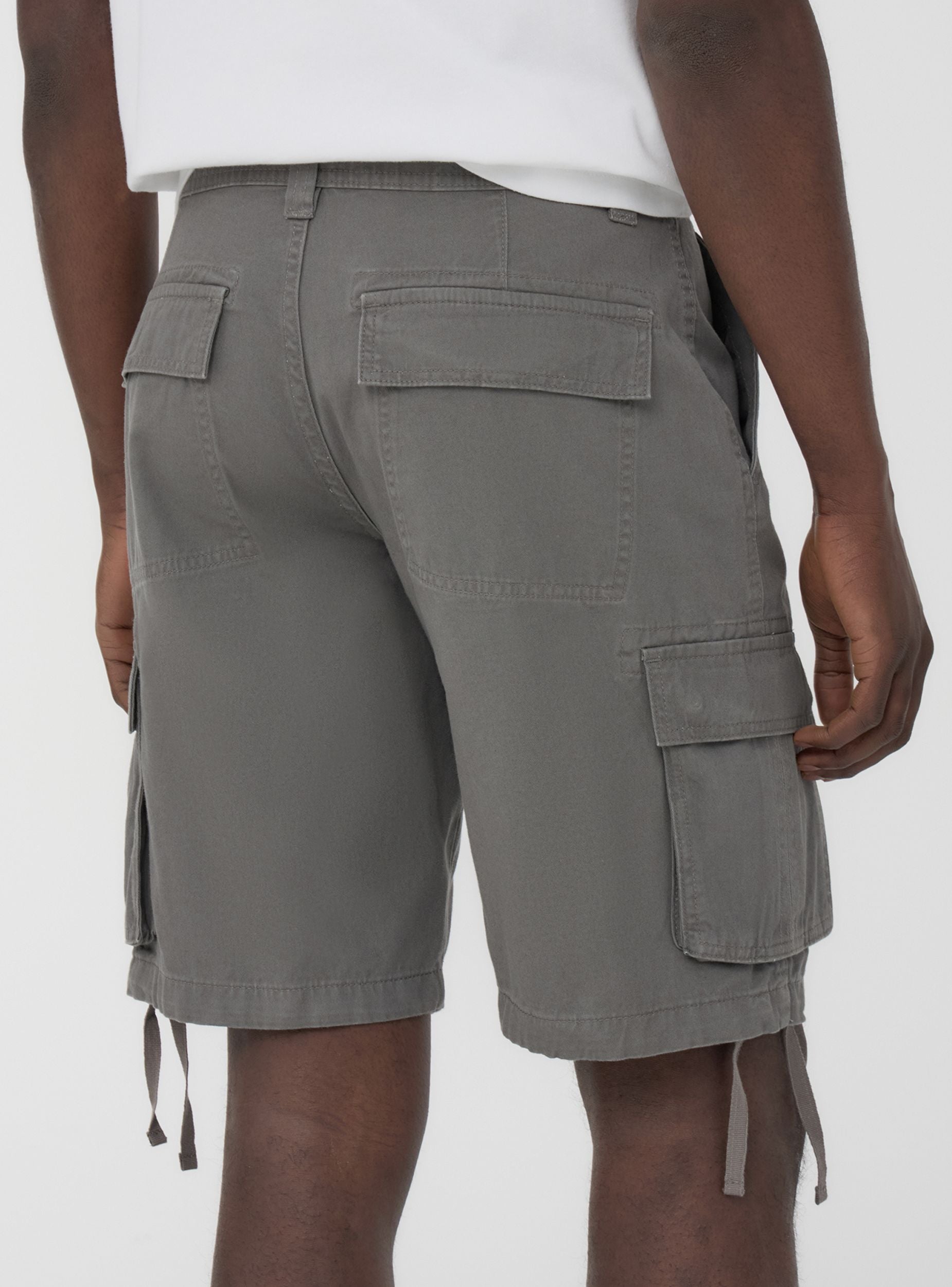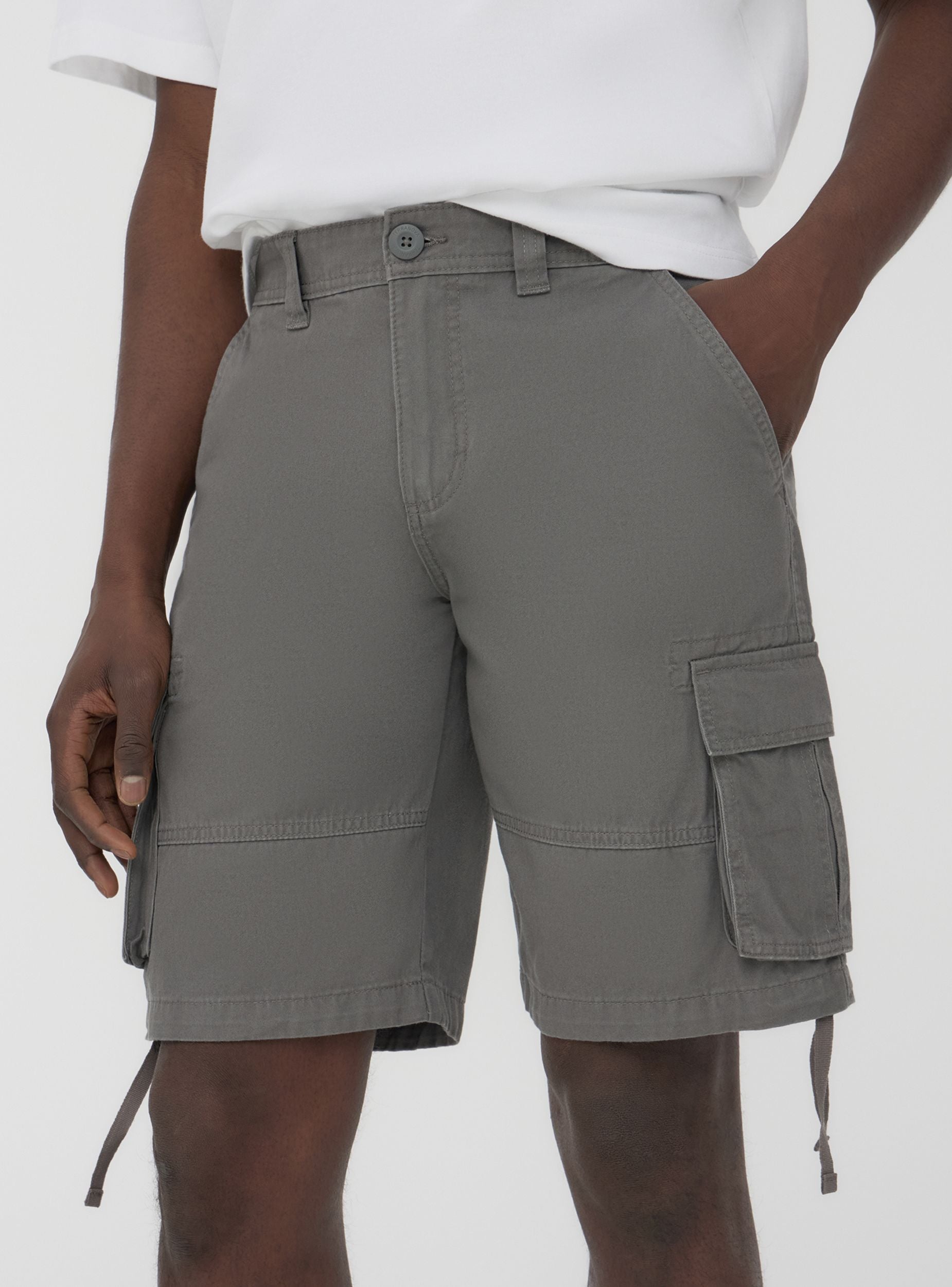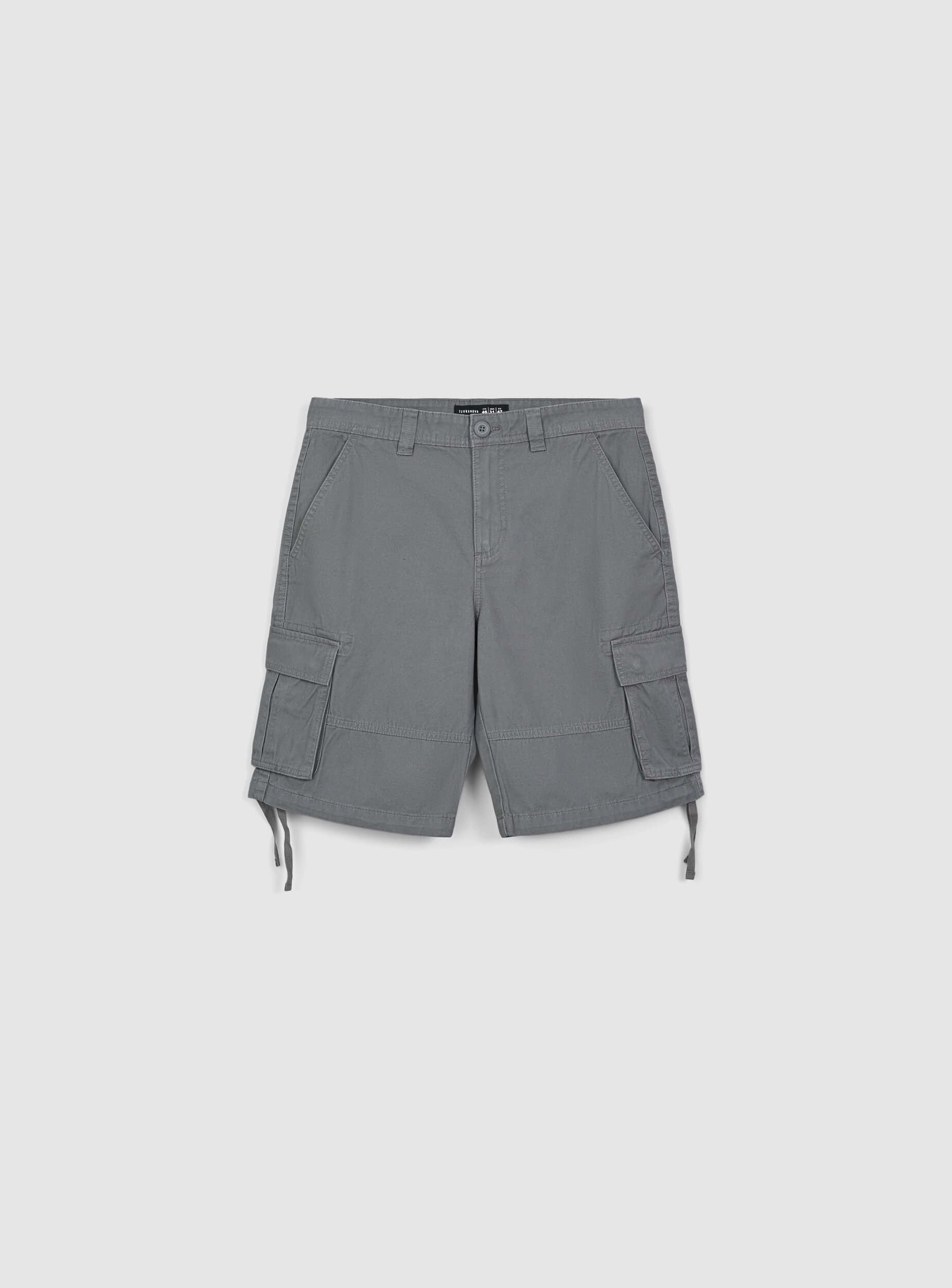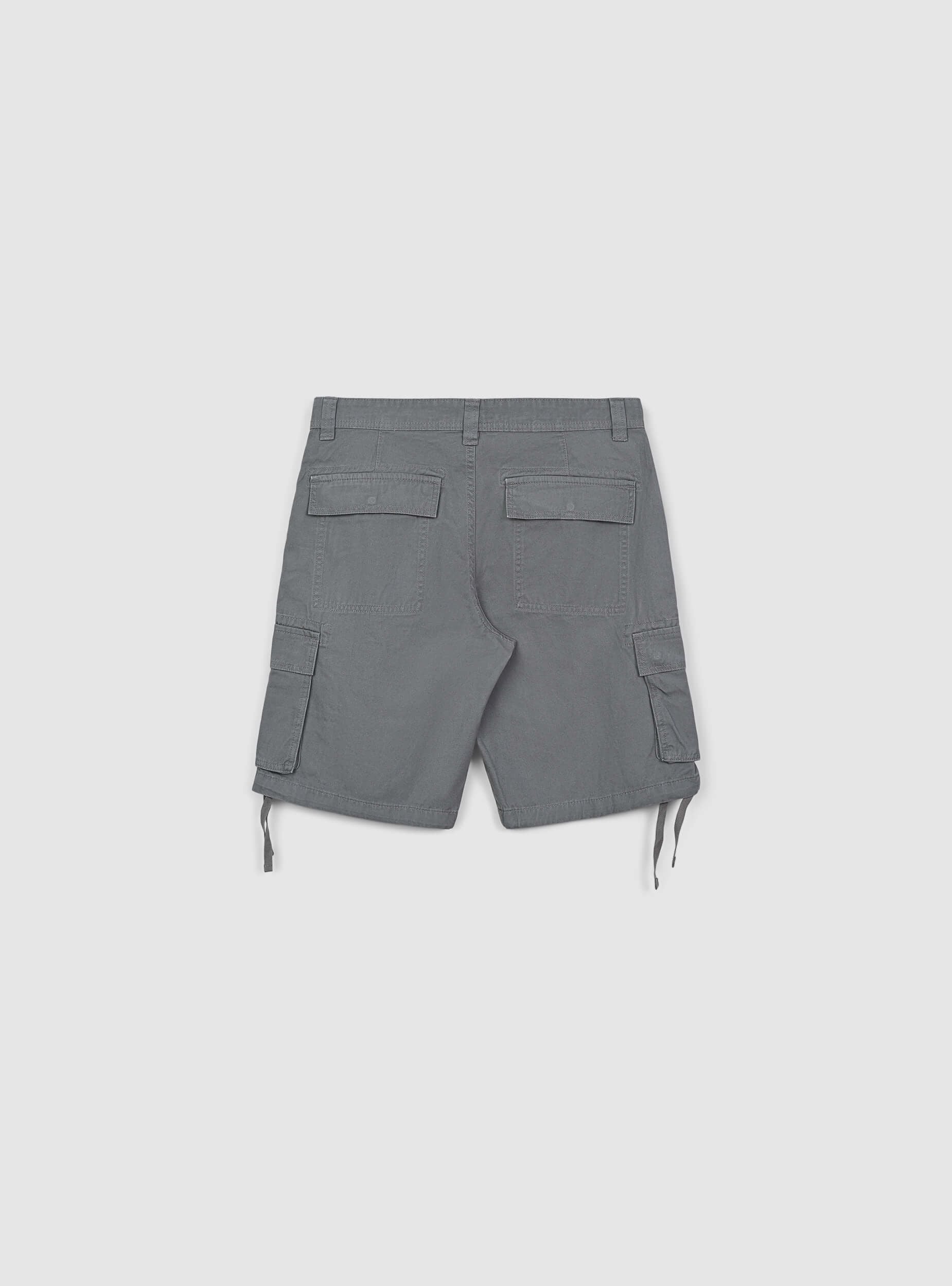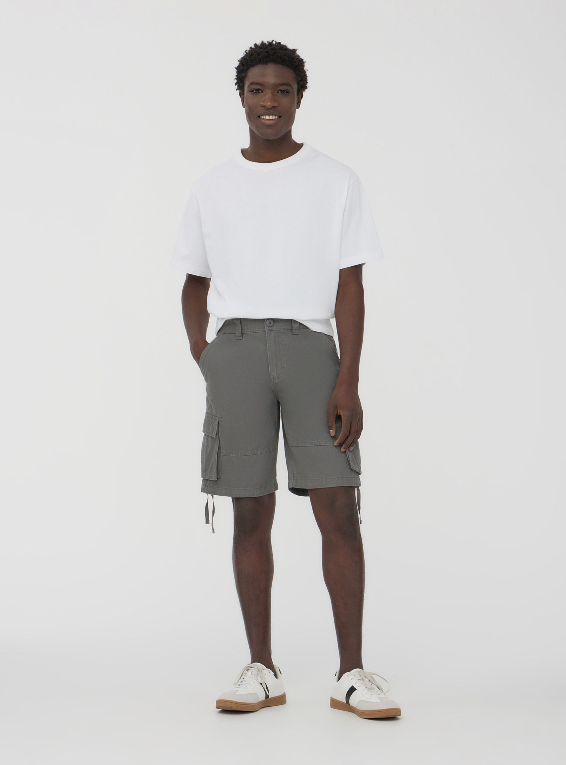 Pánské cargo šortky s knoflíkovým a zipovým zapínáním. Jednoduchý design je obohacen o široké boční kapsy, ideální pro uložení drobných předmětů, a šňůrky po stranách. Ideální pro ležérní a praktický vzhled, tyto šortky kombinují styl a všestrannost, přizpůsobují se různým příležitostem. Cargo model dodává uvolněný vzhled, s kapsami na zadní straně s klopou pro moderní a praktický vzhled.Detaily