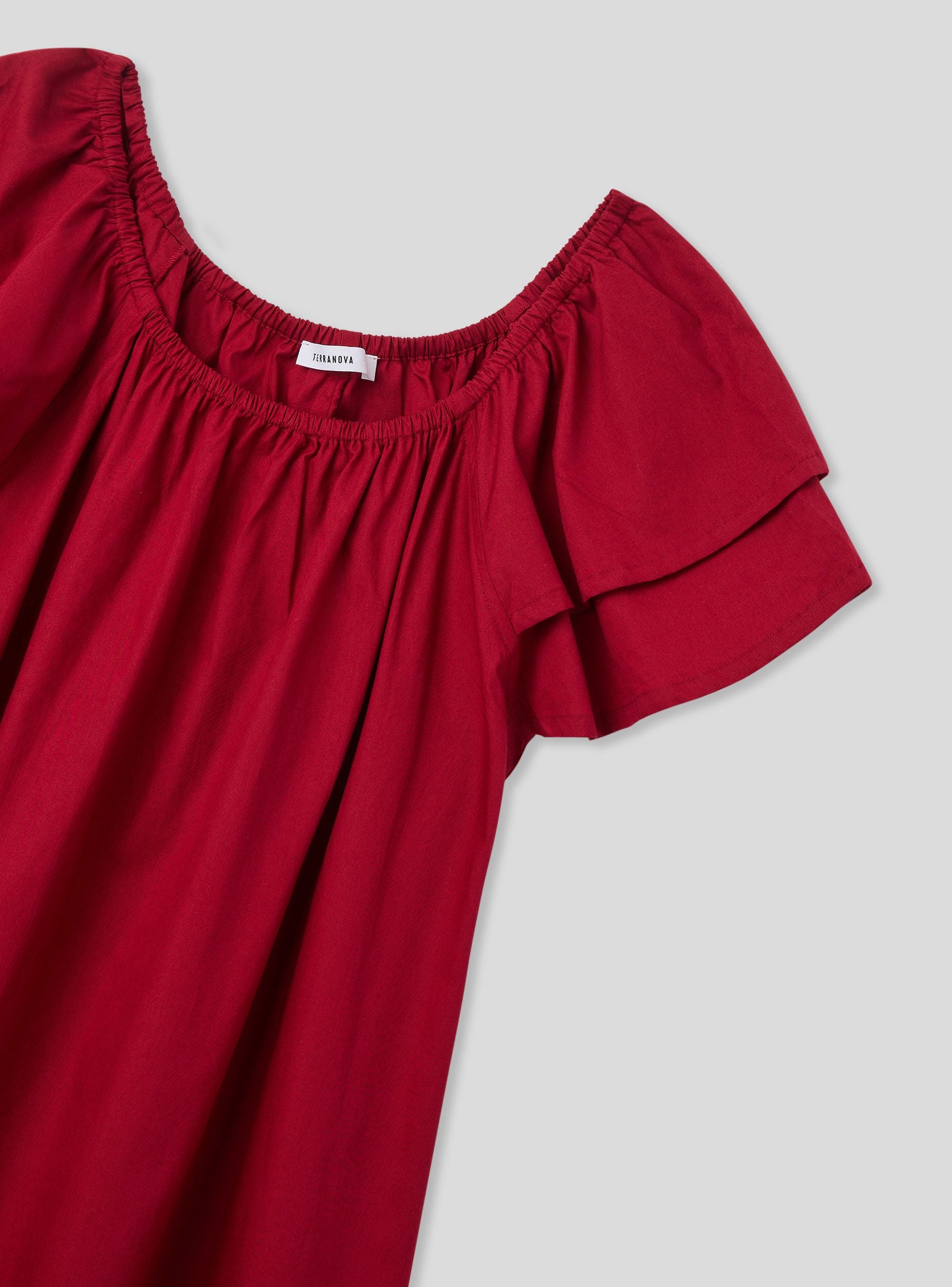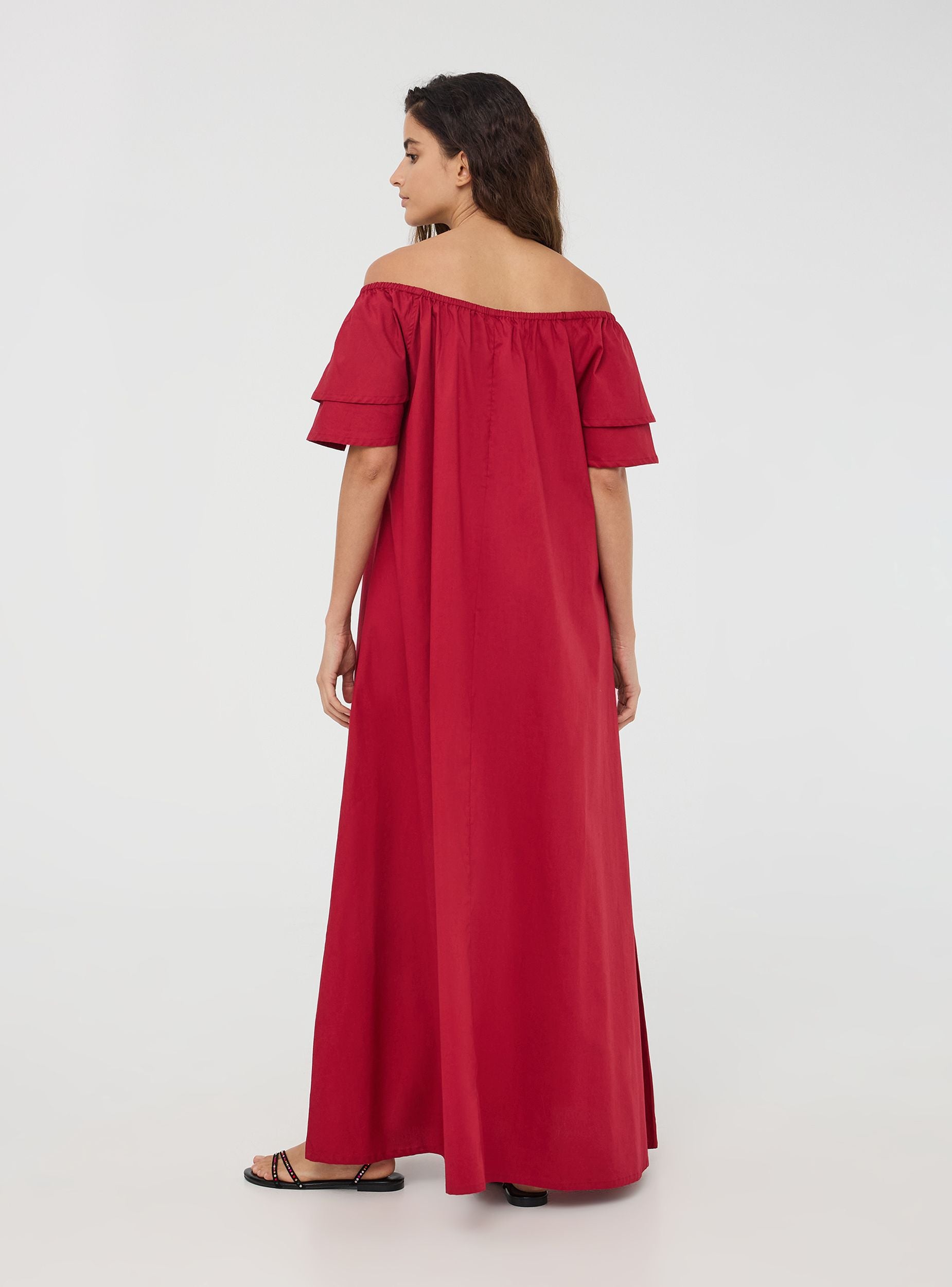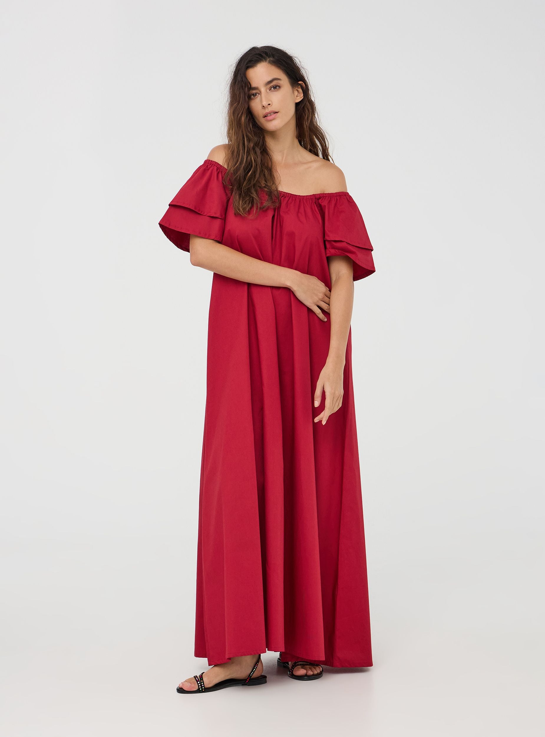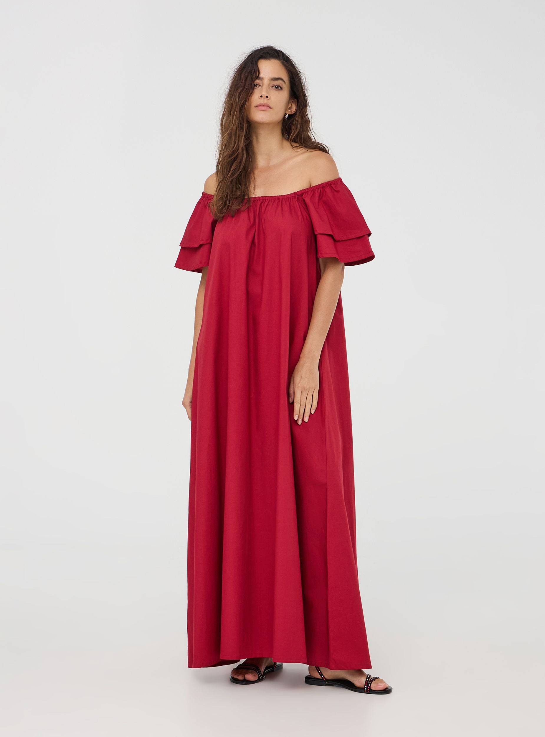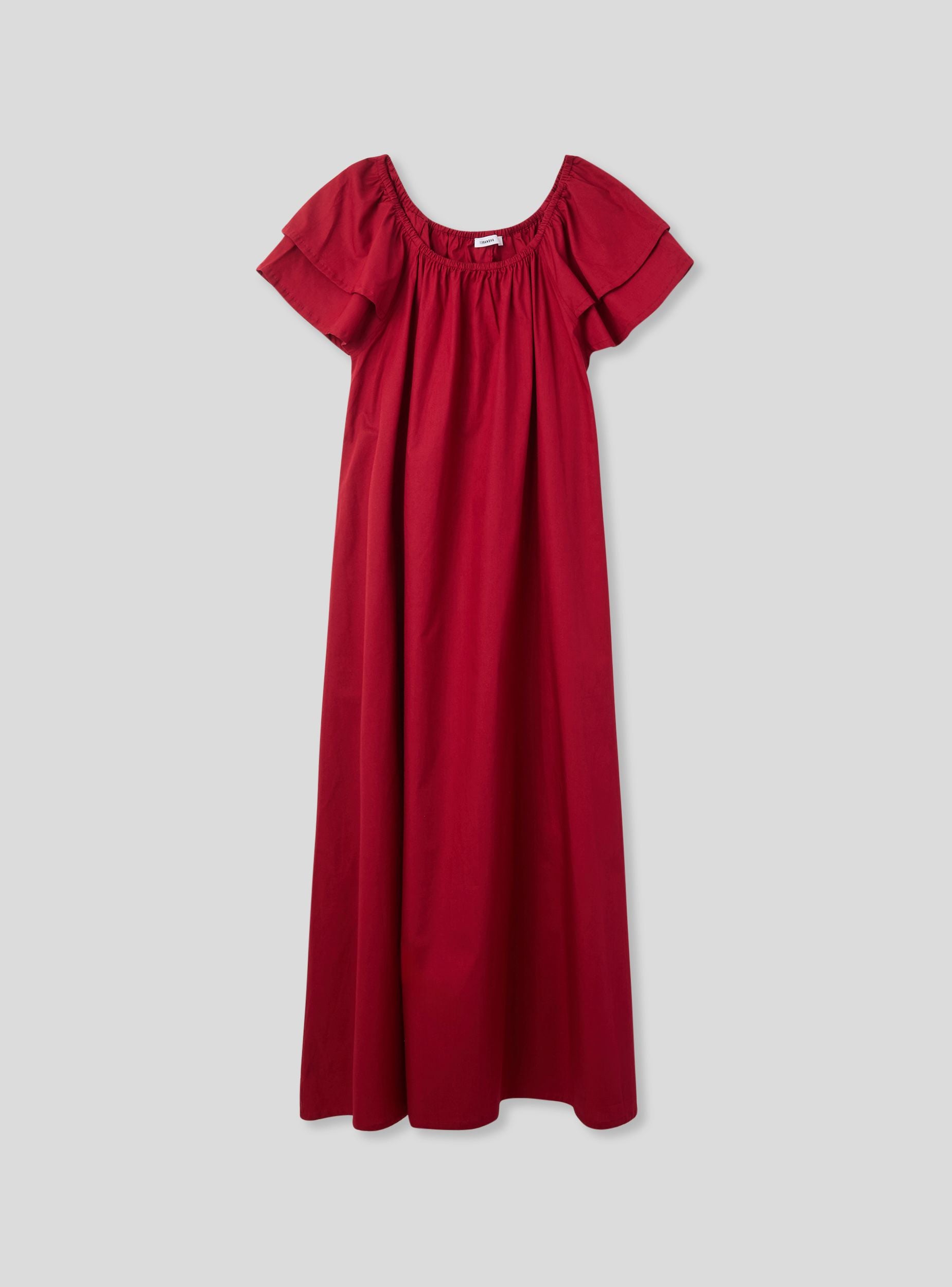 Dámské šaty s dlouhým a fluidním střihem, s jednobarevným designem, který je činí ideálními pro mnoho příležitostí. Krátké rukávy dodávají nádech jemnosti, zatímco lehká popelínová tkanina poskytuje svěžest a pohodlí. Lehce nařasený výstřih dodává designu měkkost, čímž vytváří univerzální a elegantní kousek. Ideální pro nošení jak v neformálních kontextech, tak při formálnějších příležitostech.