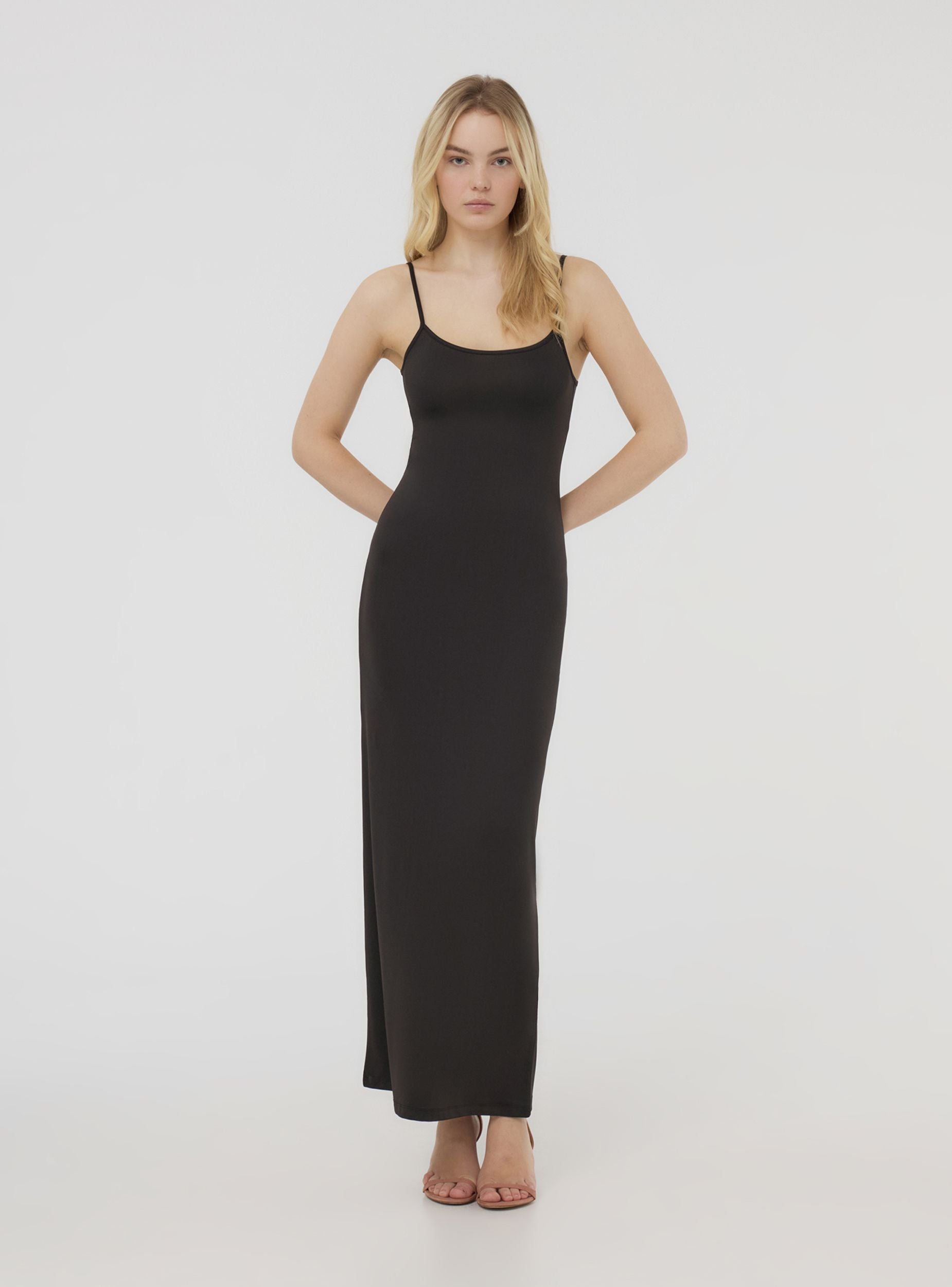Dámské šaty v jednobarevném provedení, dlouhé a obepínající, s jednoduchým a rafinovaným stylem. Design bodydress zvýrazňuje postavu, zatímco tenké nastavitelné ramínka nabízejí dokonalé přizpůsobení tělu, což zajišťuje pohodlí a praktičnost. Šaty mají jednoduchý a jemný výstřih, ideální pro kombinaci s elegantními doplňky nebo s ležérním chic vzhledem. Perfektní na letní večery nebo elegantní akce, díky svému lineárnímu a přiléhavému střihu, který diskrétně a elegantně zvýrazňuje přirozené linie těla.Detaily