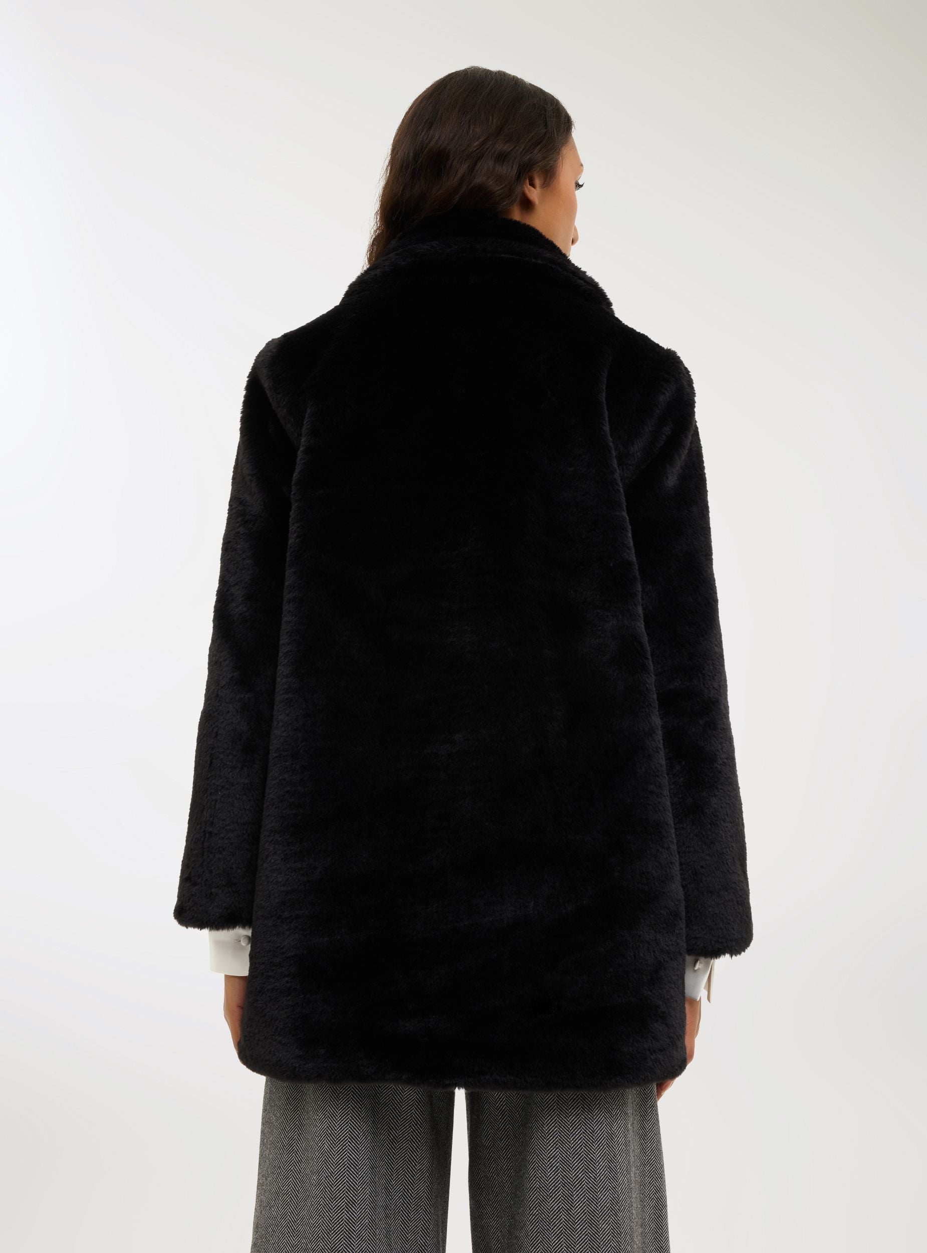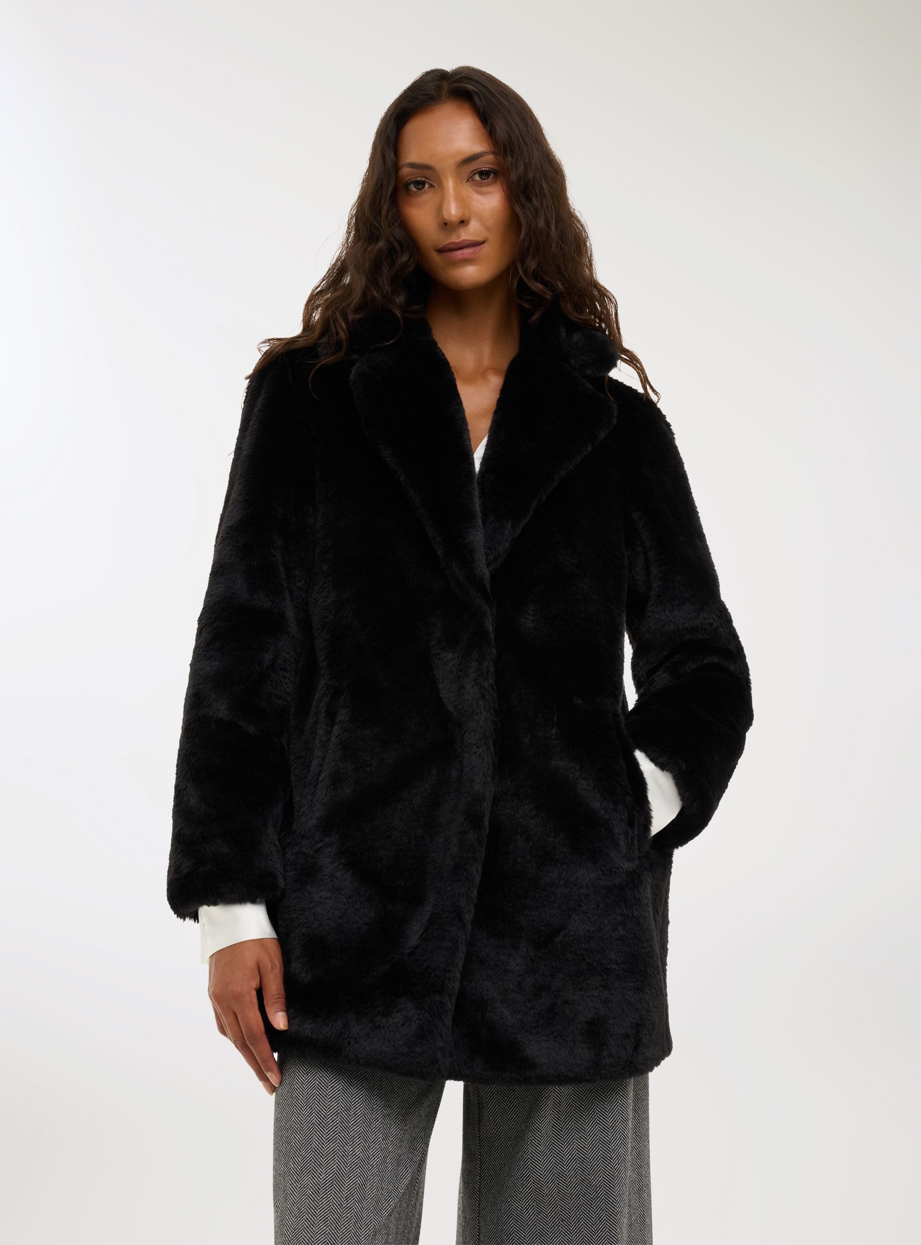 Dámský kabát s klopovým límcem, ideální pro dodání sofistikovaného nádechu zimním outfitům. Střední délka a rovný střih zvýrazňují siluetu, zatímco povrch s efektem kožešiny dodává elegantní vzhled. Vybaven praktickými patentkami a bočními kapsami, dokonale se hodí k širokým kalhotám nebo midi šatům, ideální pro formální příležitosti nebo večery ve městě.Detaily