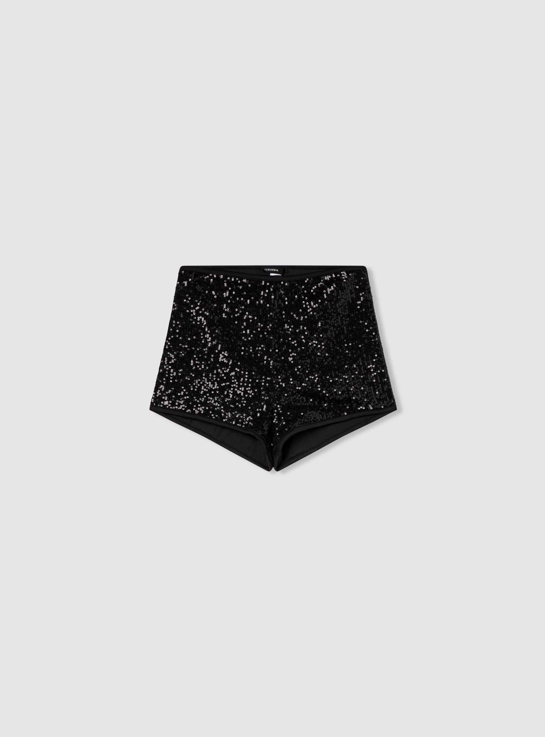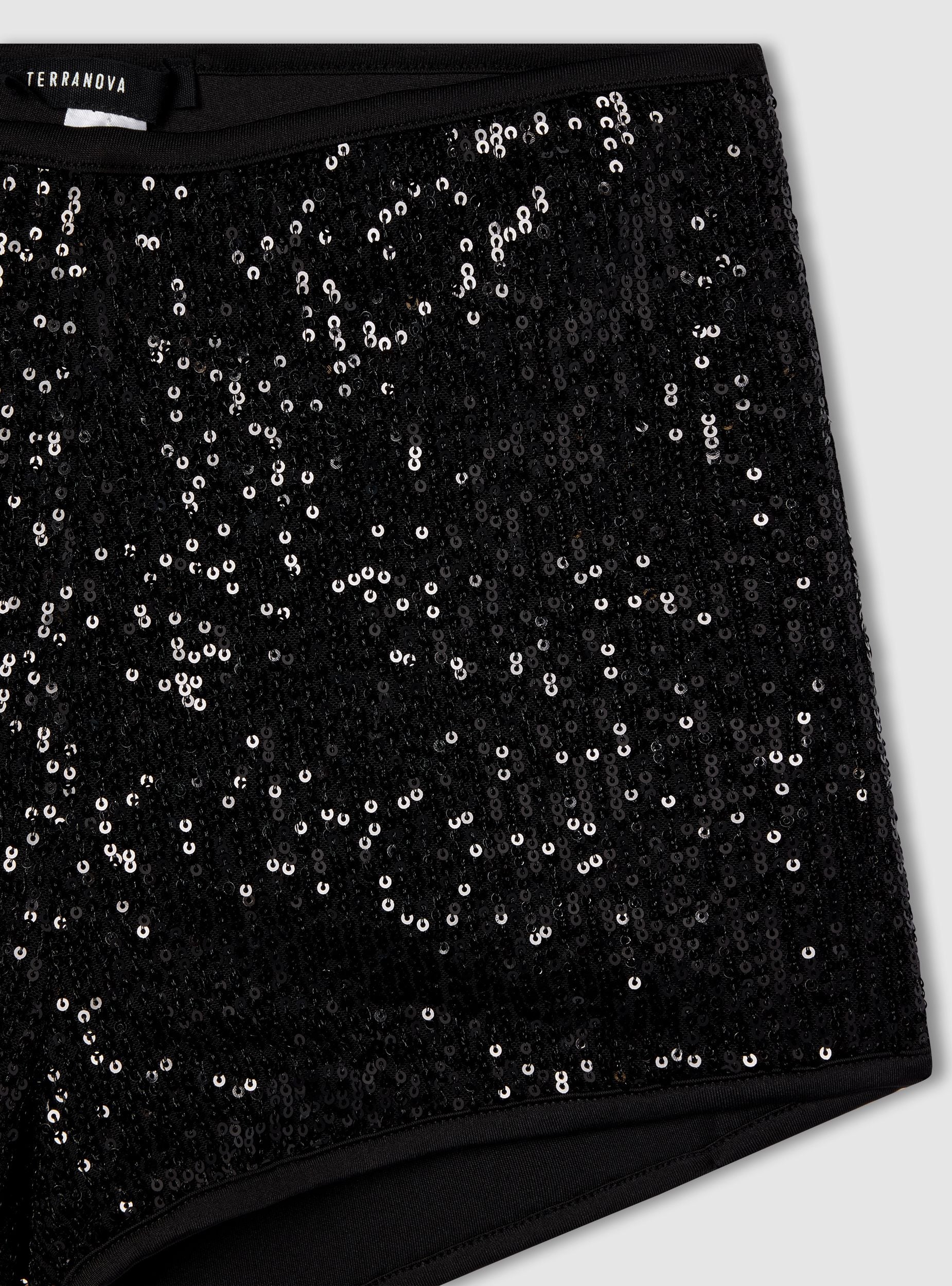 Dámské šortky s vysokým pasem a flitry, ideální pro odvážné a zářivé outfity. Přiléhavý střih zvýrazňuje siluetu, zatímco krátký střih je ideální pro speciální večery, koncerty nebo párty. Lze je kombinovat s minimalistickými topy nebo strukturovanými sako pro glamour a výrazný vzhled.