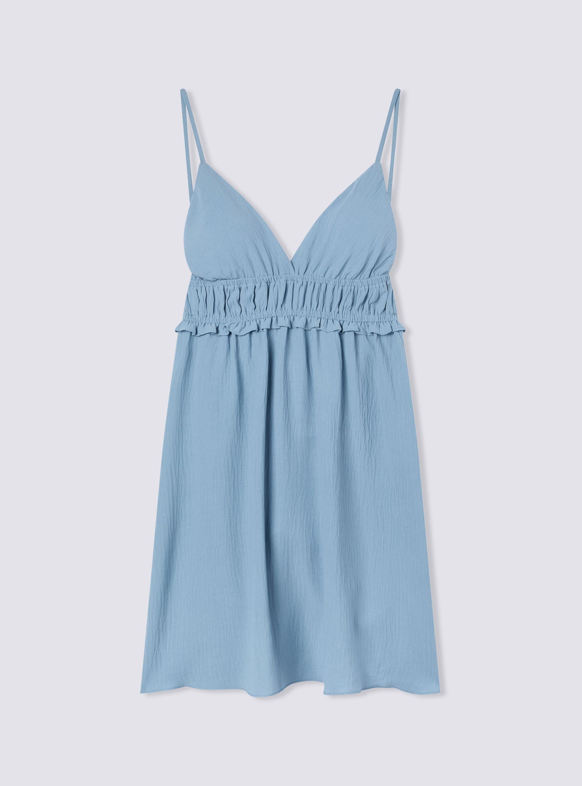 Dámské šaty s jednobarevným designem, s krátkou siluetou a charakteristickým svěžím a ženským stylem. Model má tenké nastavitelné ramínka, která umožňují přizpůsobitelné nošení. Horní část je obohacena o vnitřní košíčky, které poskytují oporu, zatímco jemné nařasení pod prsy přidává rafinovaný dotek, který zvýrazňuje postavu. Sukně volně splývá, vytváří lehký a plynulý efekt, ideální pro letní a neformální vzhled. Ideální pro ty, kteří hledají univerzální kousek, který spojuje eleganci a pohodlí.