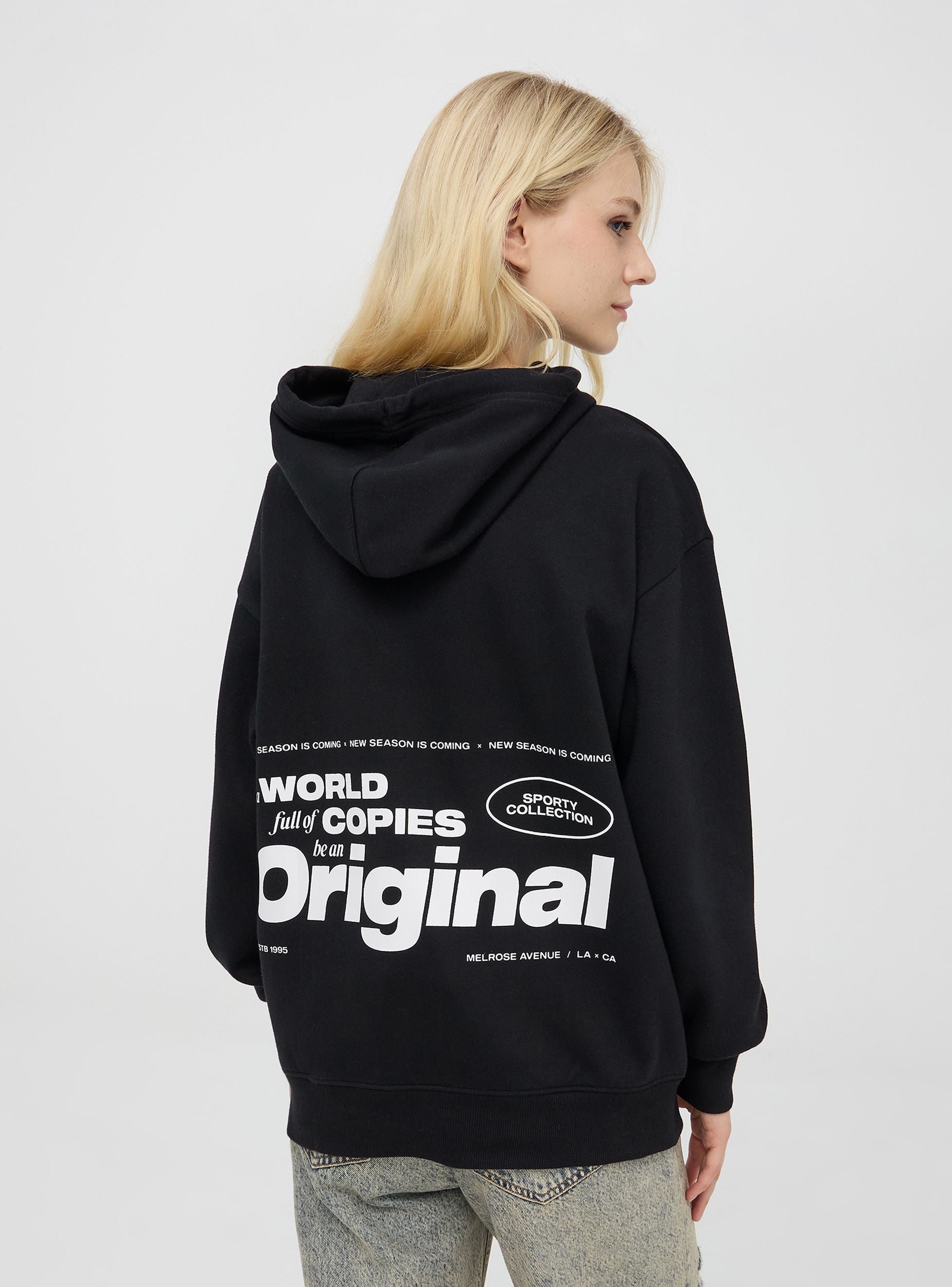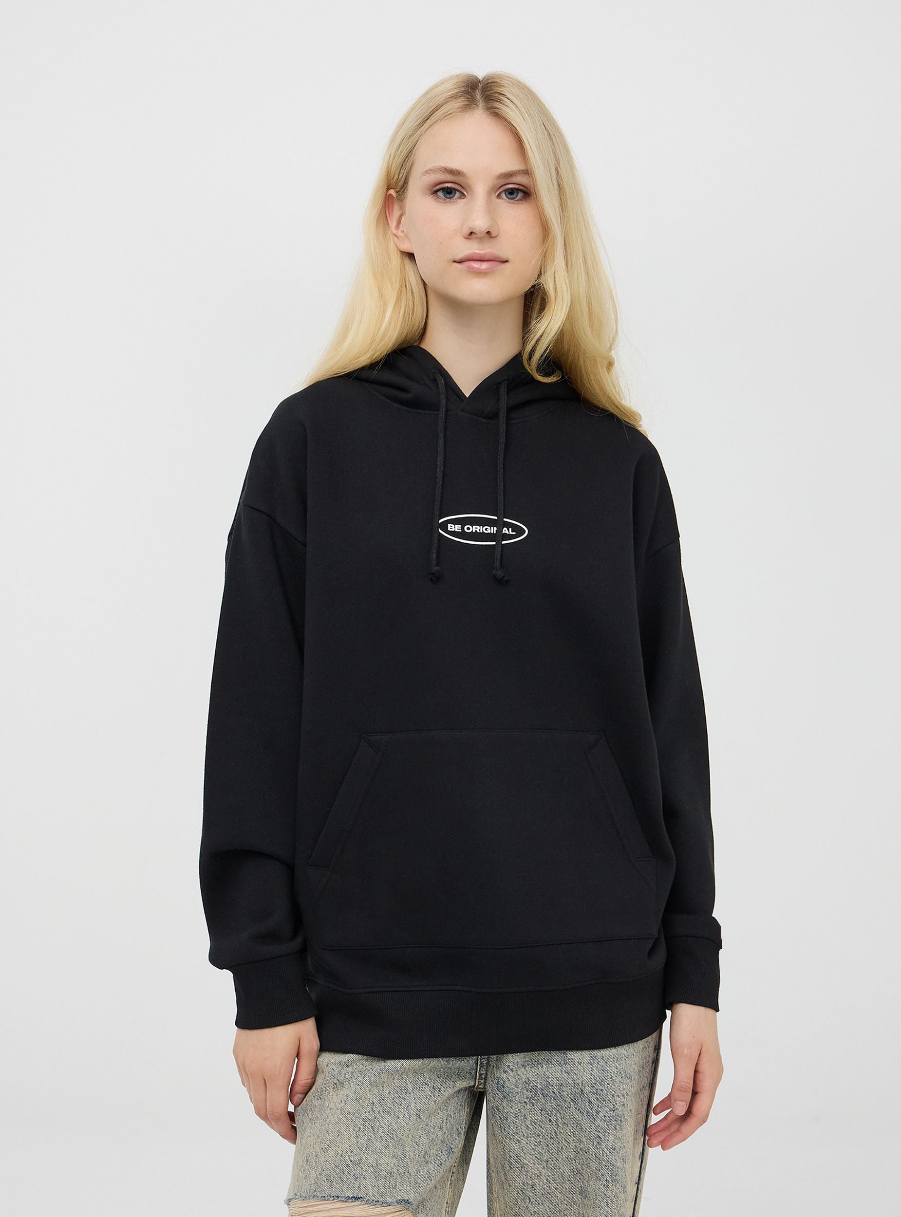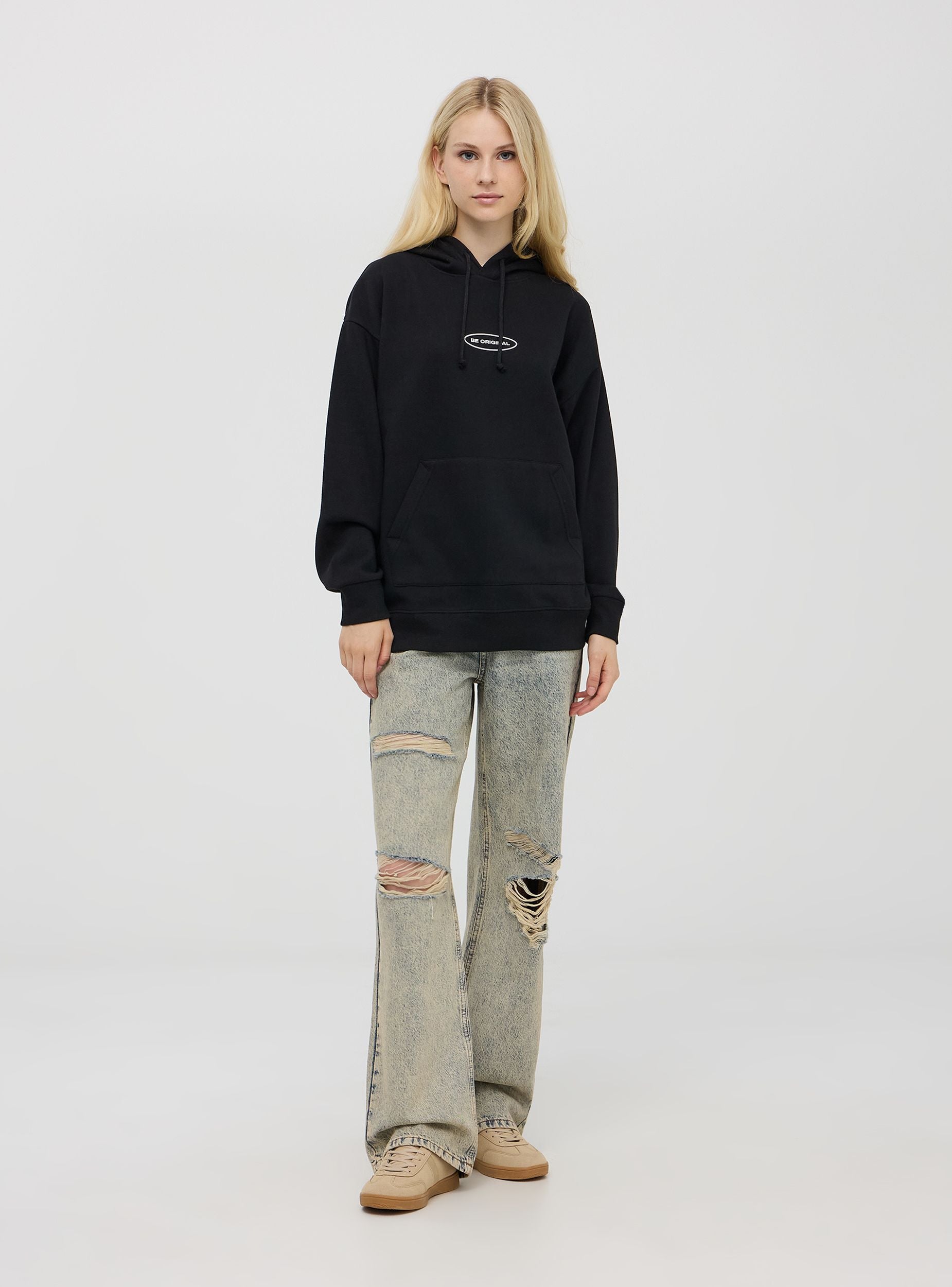 Dámská mikina s kapucí a stahovací šňůrkou, dlouhými rukávy, žebrovanými lemy a klokaní kapsou. Těžká jednobarevná tkanina s malým potiskem vpředu a velkým na zadní straně. Volný střih.Detaily