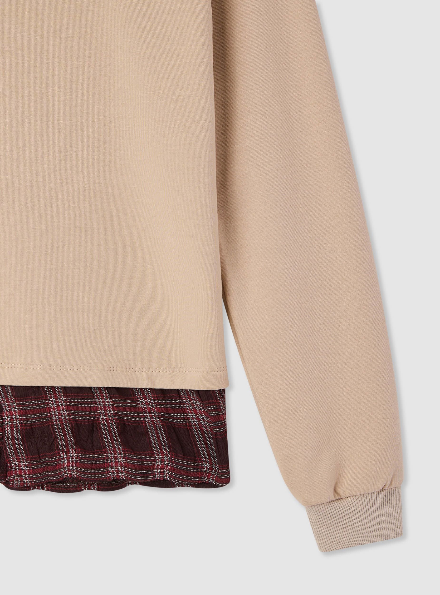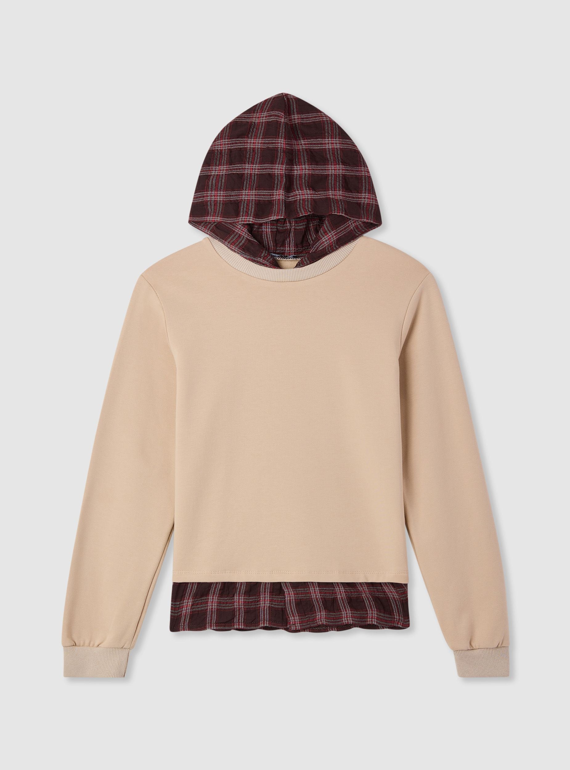 Mikina pro děti s kapucí, ideální do školy i na volný čas. Model s dlouhými rukávy a elastickými manžetami. Kapuce a lem mají kostkovaný vložku, která dodává trendy vzhled a snadno se kombinuje s džínami nebo tepláky jogger. Pohodlný střih a rovný tvar pro každodenní nošení, ideální k vrstvení přes tričko v přechodných obdobích.