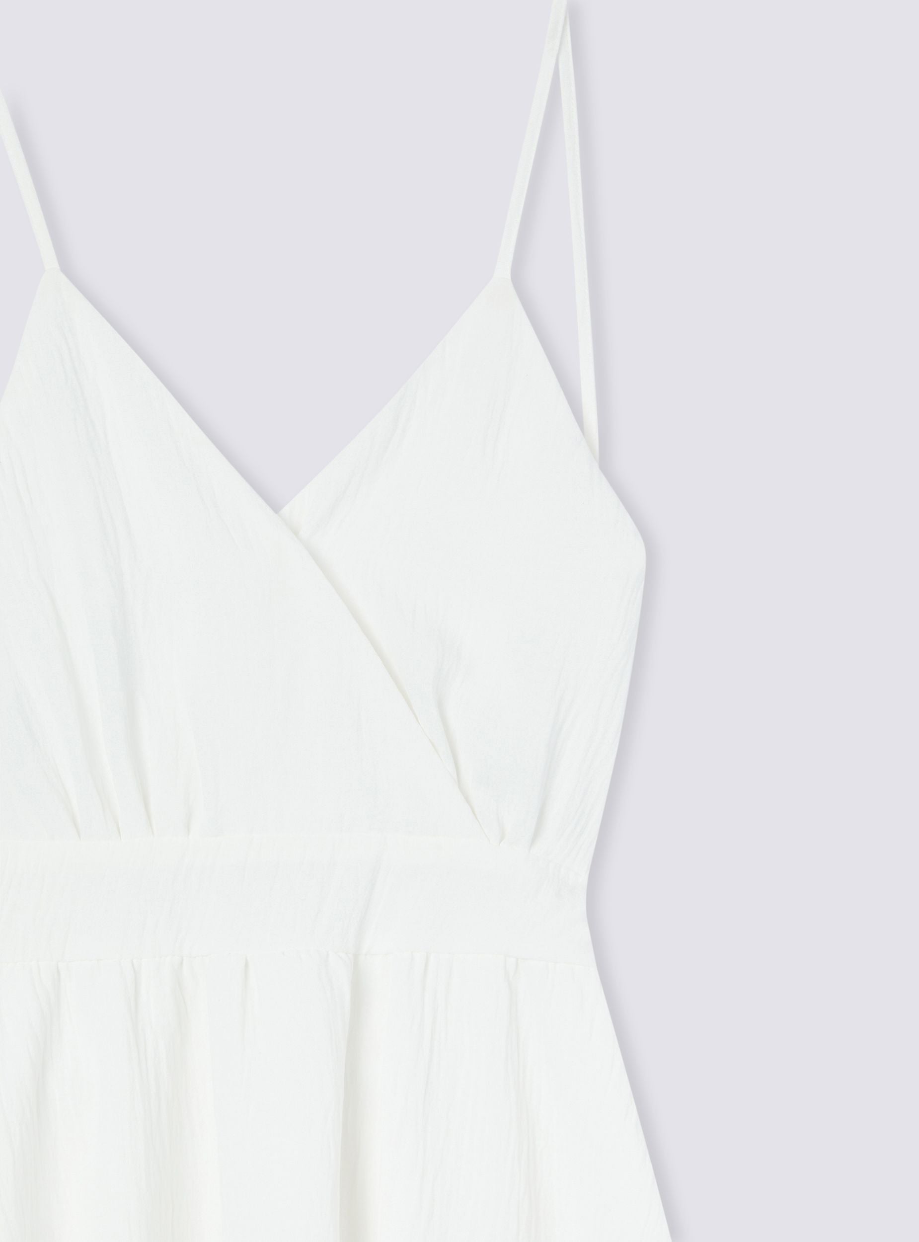 Dámský jednobarevný overal s krátkými nohavicemi, charakterizovaný svěžím a ženským stylem. Má tenké nastavitelné ramínka pro přizpůsobenou a pohodlnou velikost. Křížový design na přední části dekoltu vytváří jemný výstřih do V, který dodává nádech elegance. Pas je mírně nařasený, aby zvýraznil siluetu, zatímco spodní část je zdobena volány, které dodávají pohyb a lehkost oděvu. Ideální pro letní, neformální, ale sofistikovaný vzhled, perfektní k sandálům nebo teniskám pro všestranný outfit.