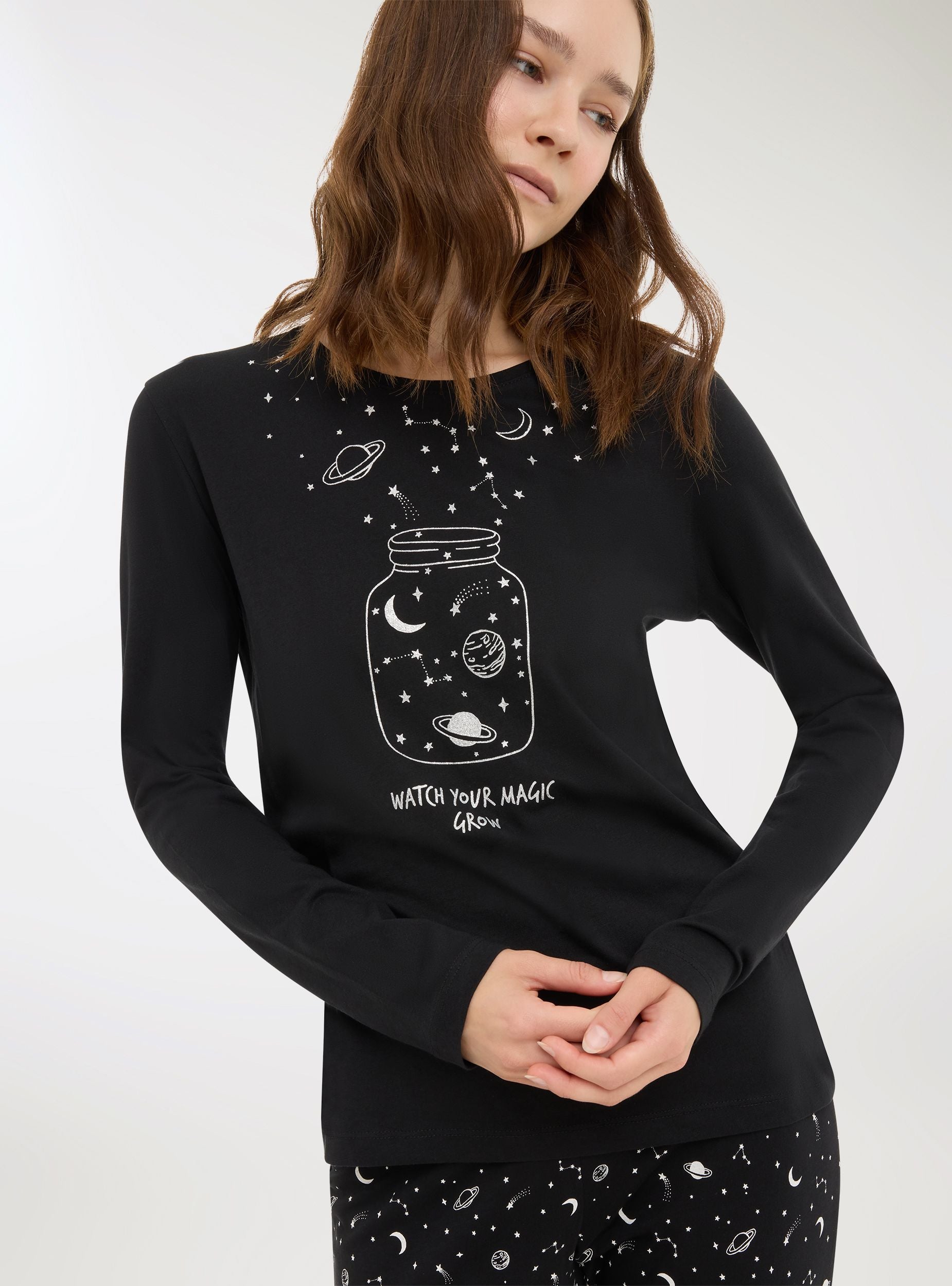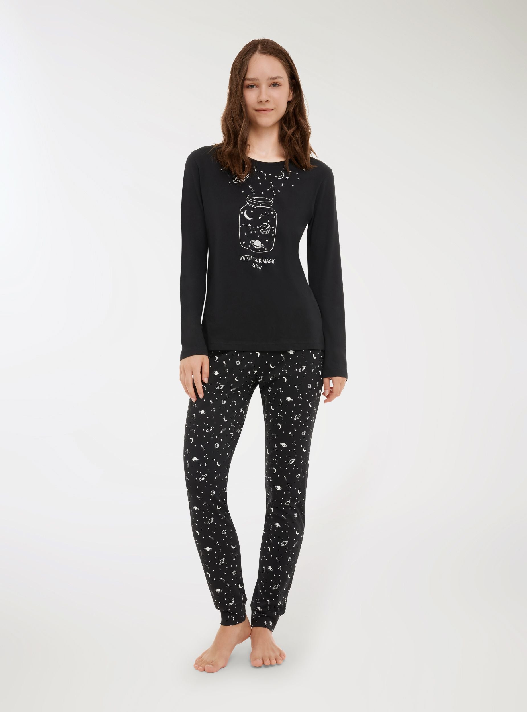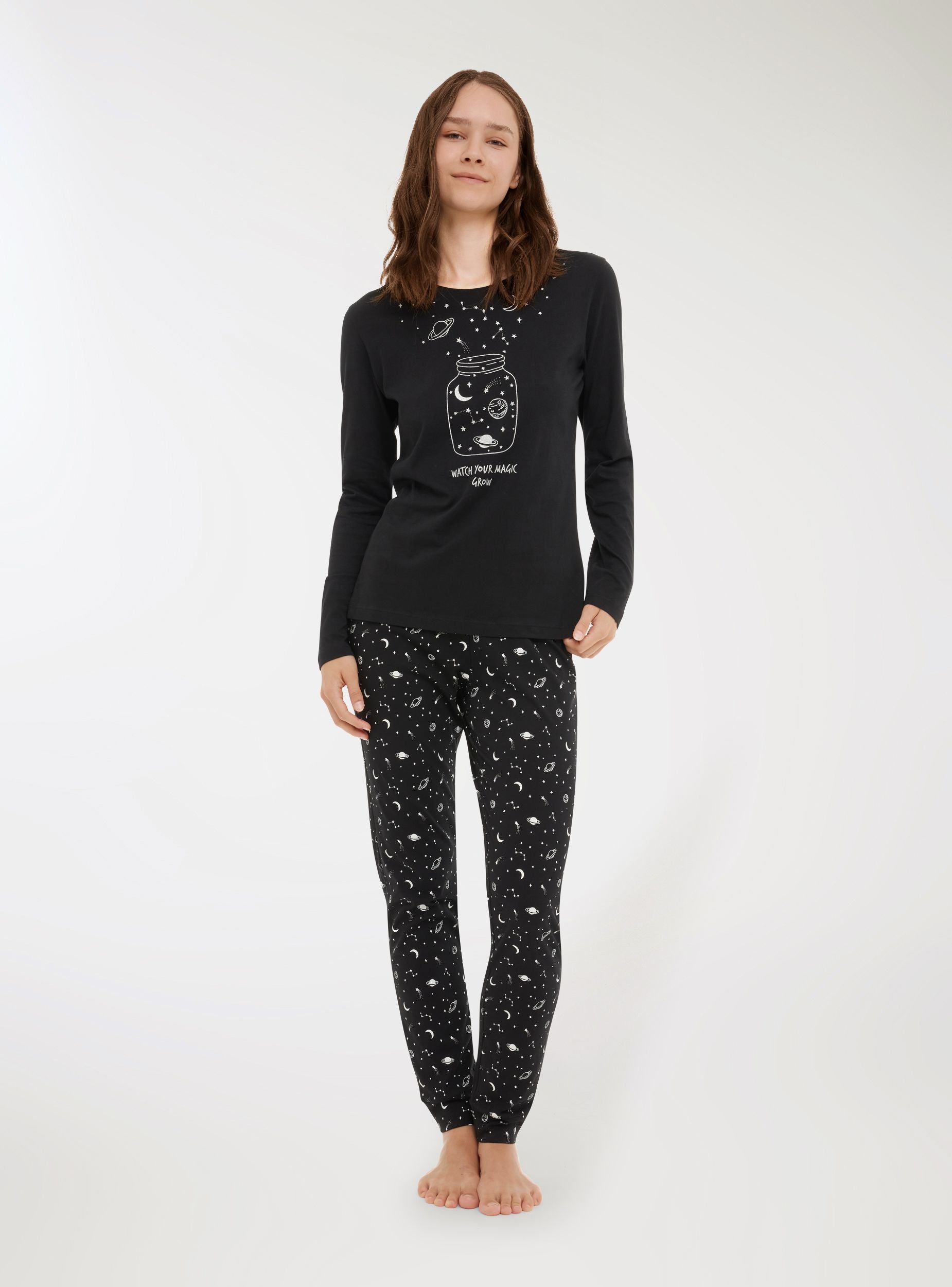 Dámské pyžamo sestávající z trička s dlouhým rukávem a dlouhých kalhot. Tričko má na přední straně dekorativní potisk s motivy hvězd a planet a nápisem. Kalhoty jsou zdobeny vzorem s vesmírným tématem. Ideální pro chvíle odpočinku a pohodlí, toto pyžamo nabízí pohodlný střih a ležérní styl, který je perfektní pro domácí nošení.Detaily