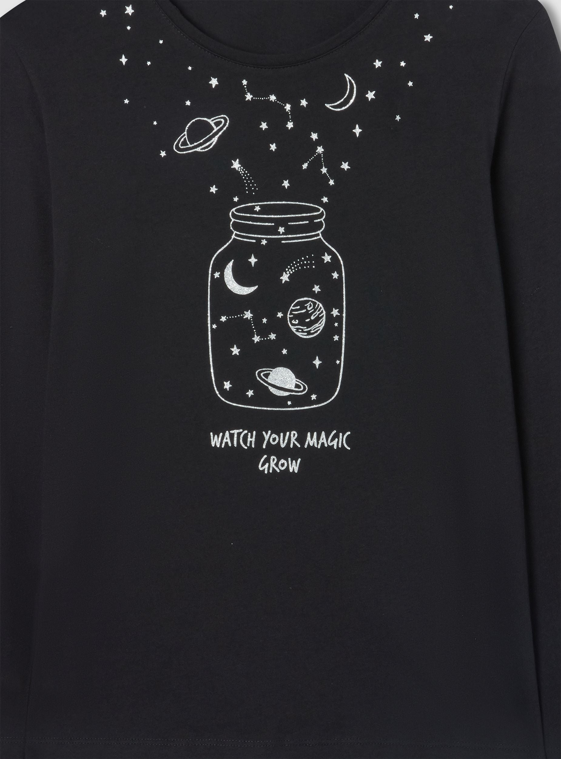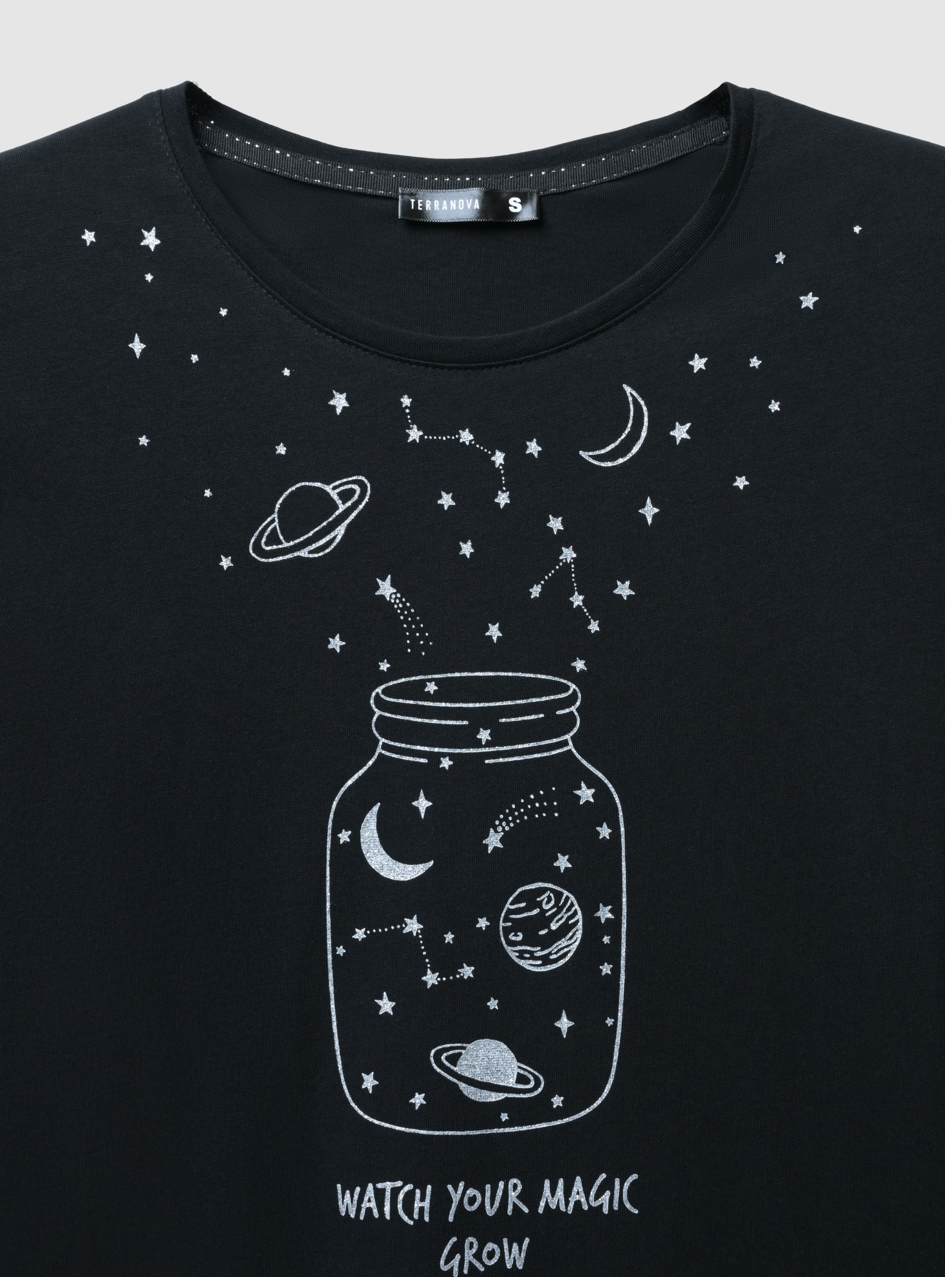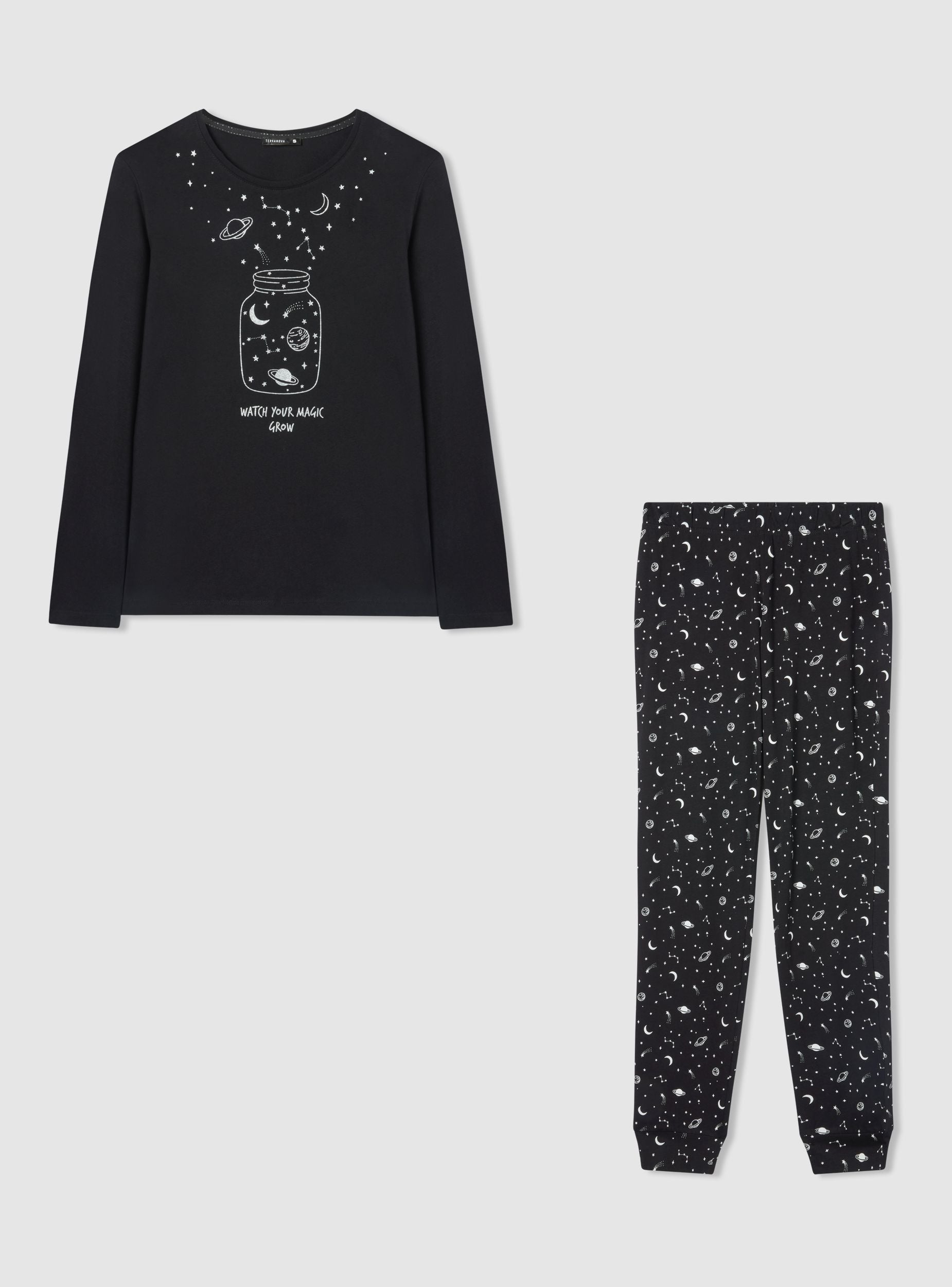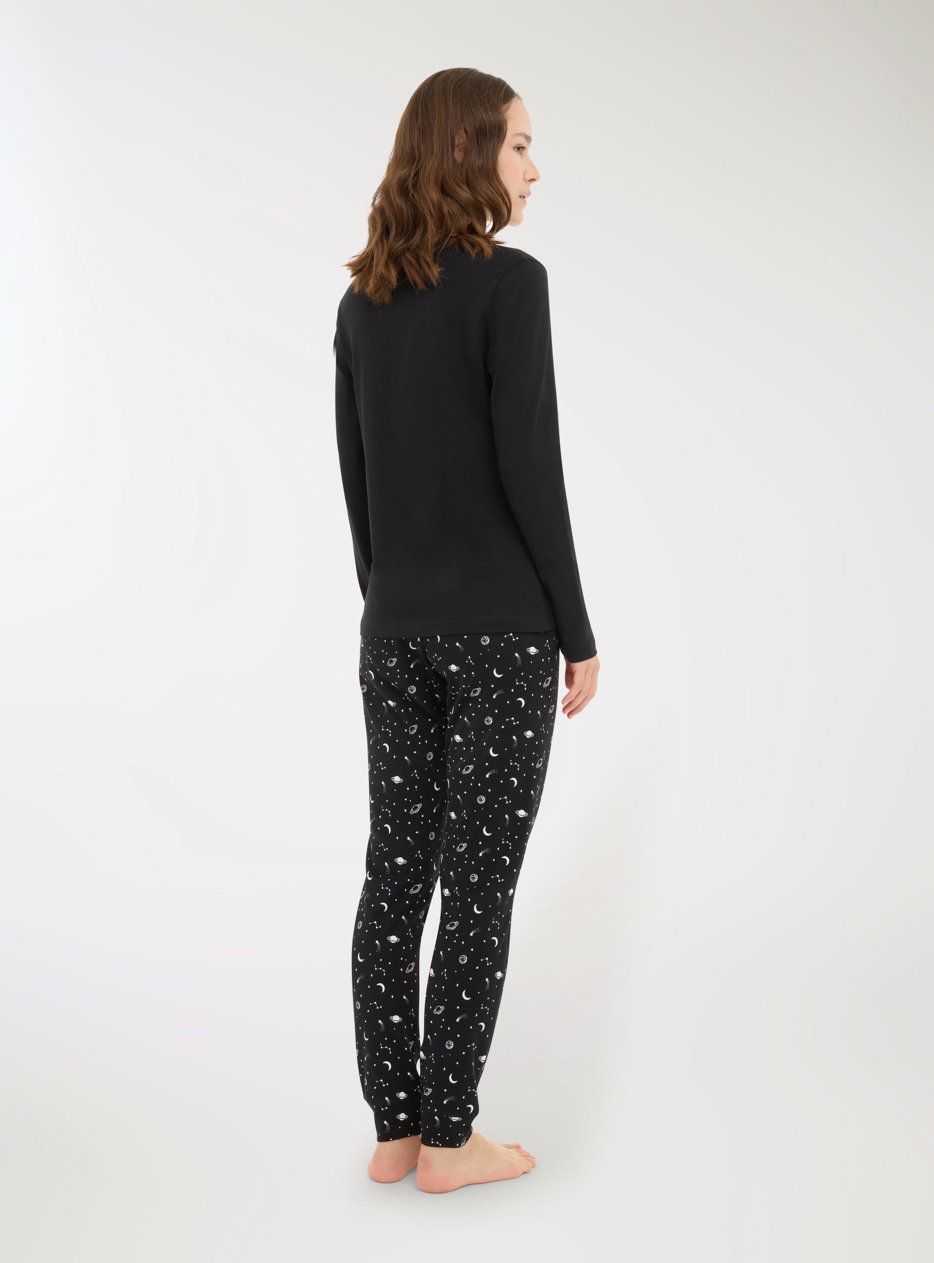 Dámské pyžamo sestávající z trička s dlouhým rukávem a dlouhých kalhot. Tričko má na přední straně dekorativní potisk s motivy hvězd a planet a nápisem. Kalhoty jsou zdobeny vzorem s vesmírným tématem. Ideální pro chvíle odpočinku a pohodlí, toto pyžamo nabízí pohodlný střih a ležérní styl, který je perfektní pro domácí nošení.Detaily