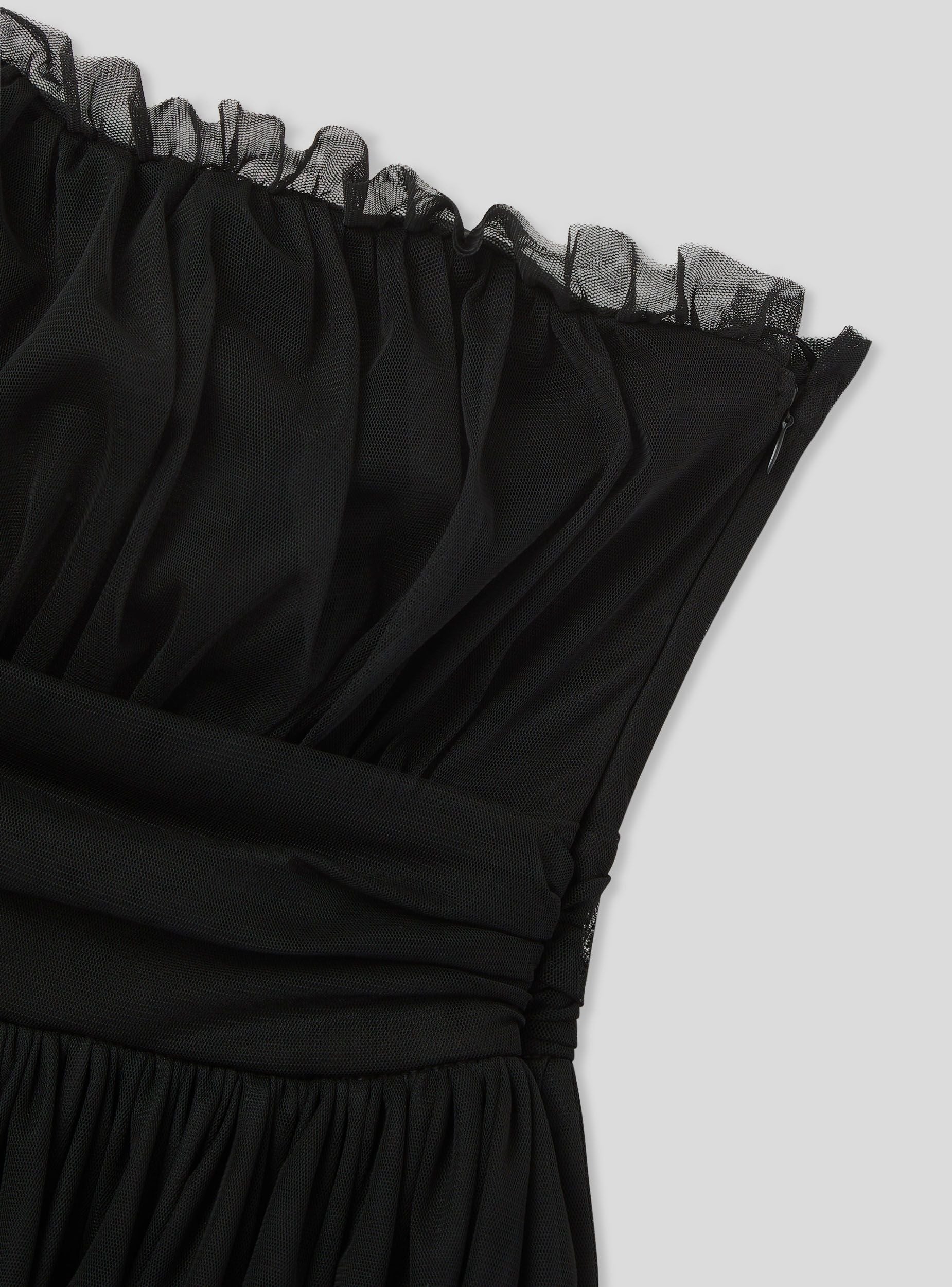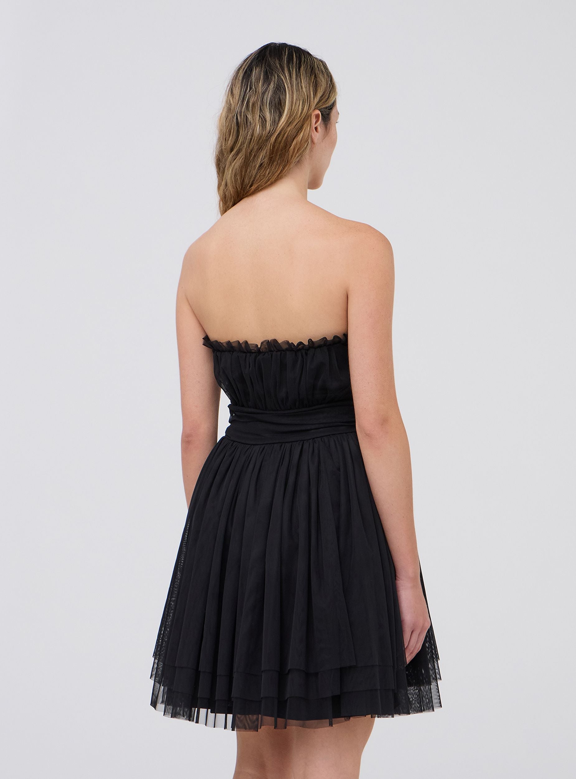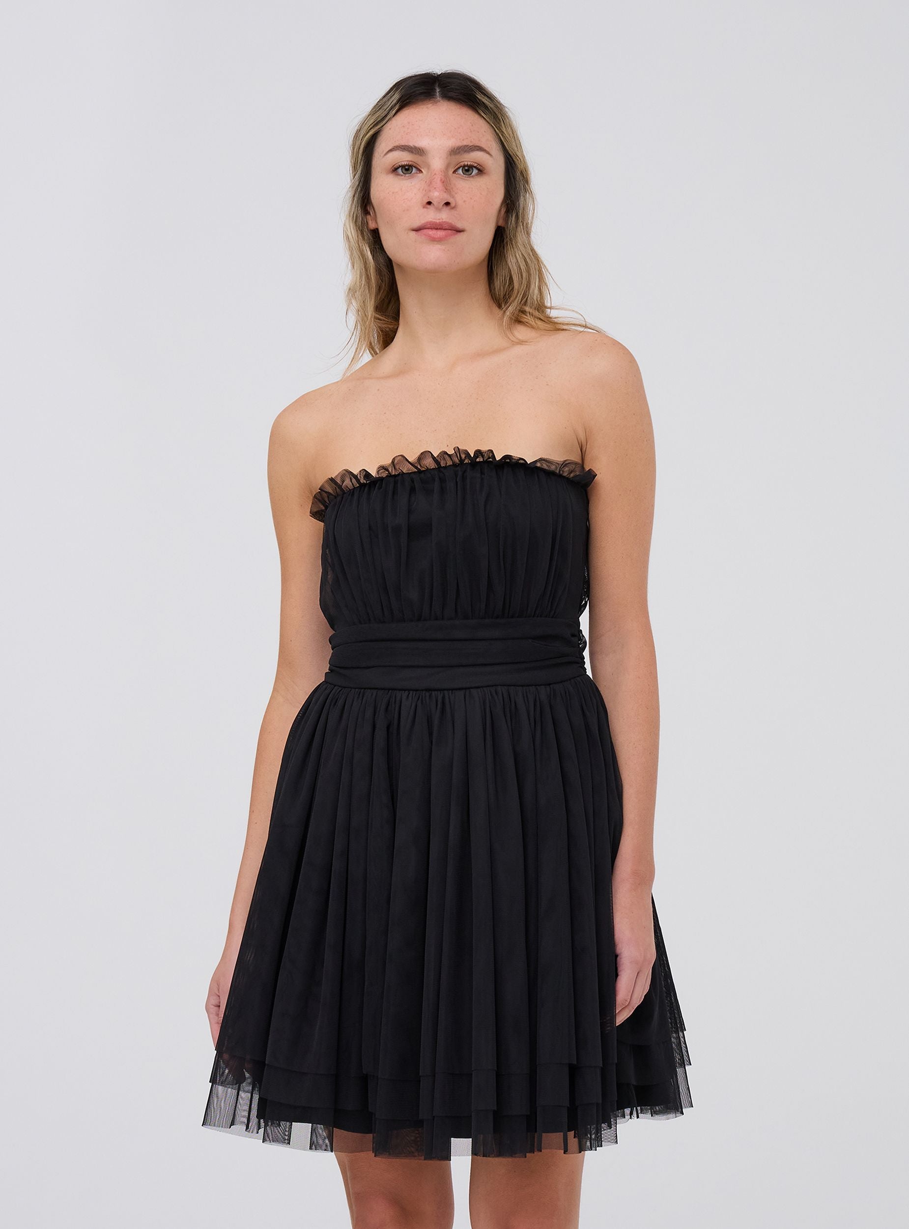 Krátké dámské šaty s pruhy, vyrobené v jednobarevném provedení, ideální na letní sezónu. Jsou charakterizovány tylovou tkaninou, která dodává vzdušný a jemný efekt. Mají skrytý zip na boku, který zajišťuje diskrétní zapínání a pohodlné nošení. Volány dodávají celkovému designu romantický a ženský nádech.Detaily