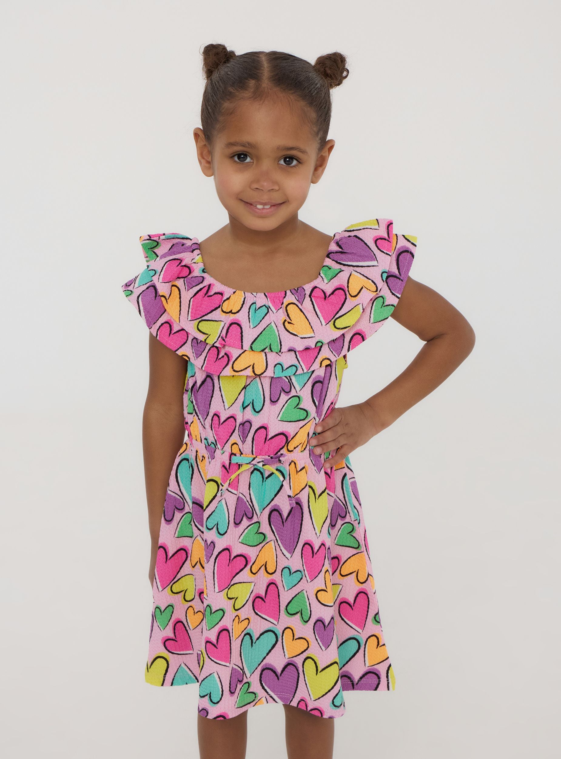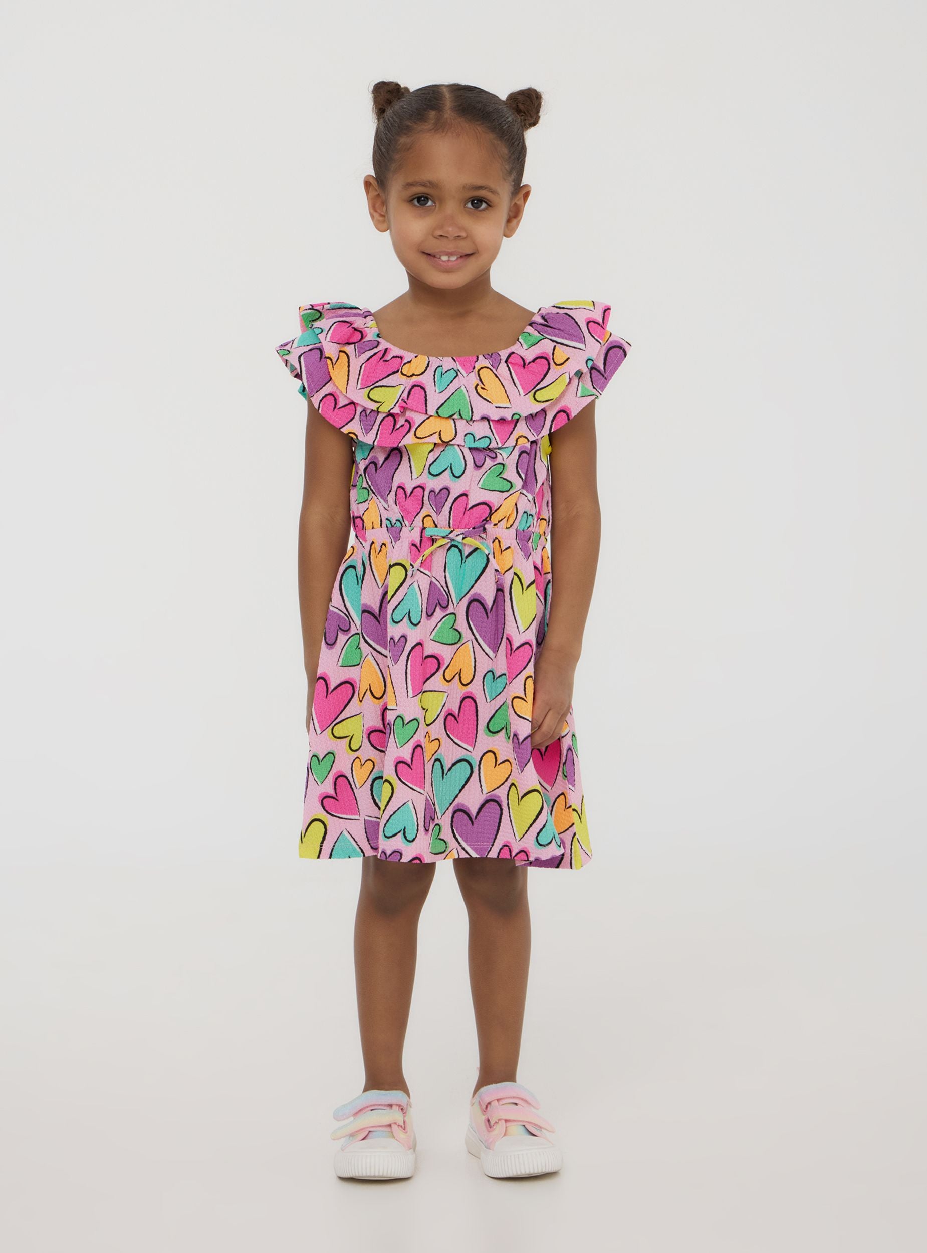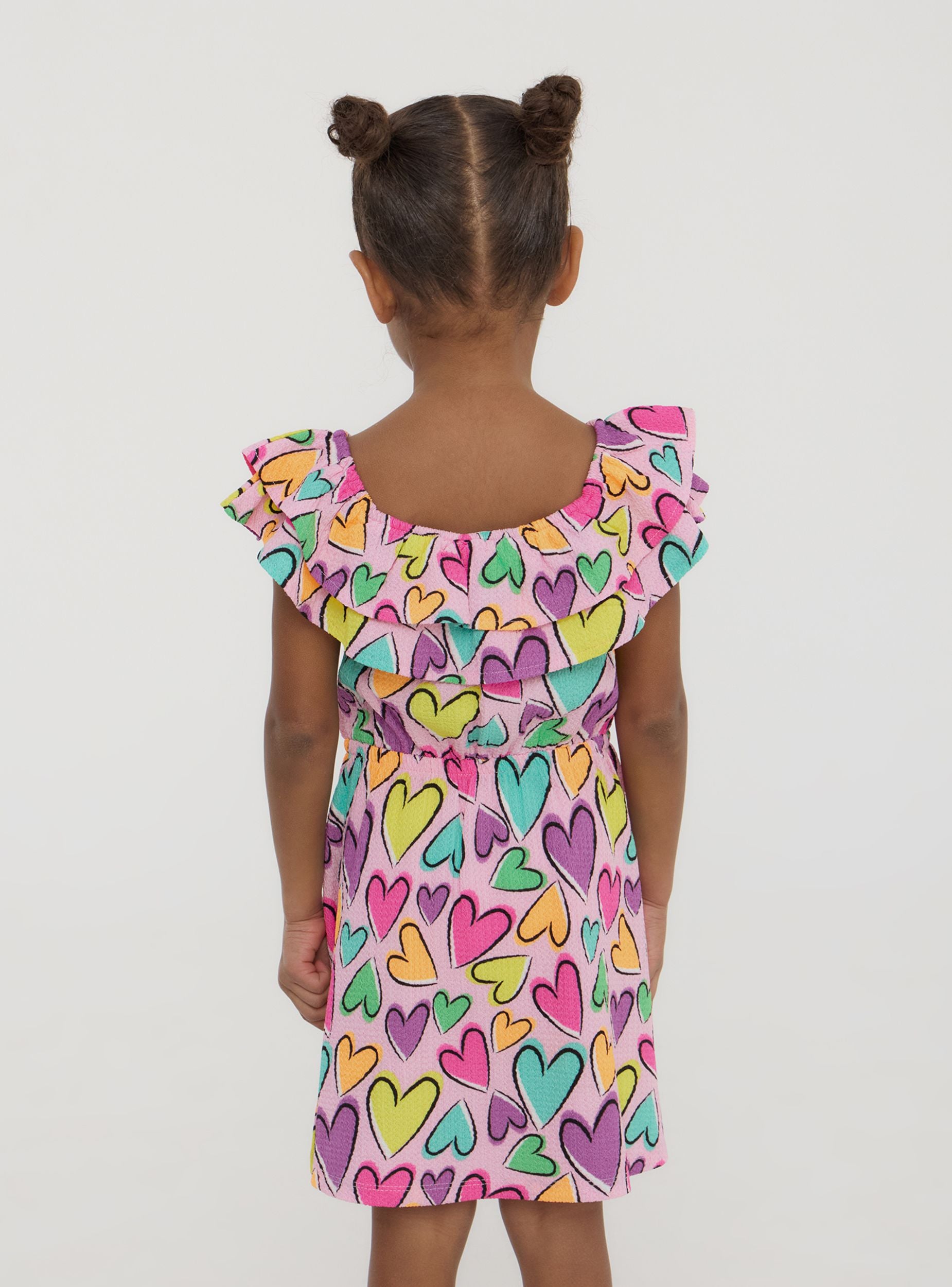 Dívčí šaty obohacené o barevný vzor srdcí. Design obsahuje roztomilé volány, které dodávají romantický a veselý nádech. Ideální pro malé, které se chtějí cítit jedinečné a módní, perfektní pro zvláštní příležitosti nebo pro přidání špetky radosti do každého dne.Detaily