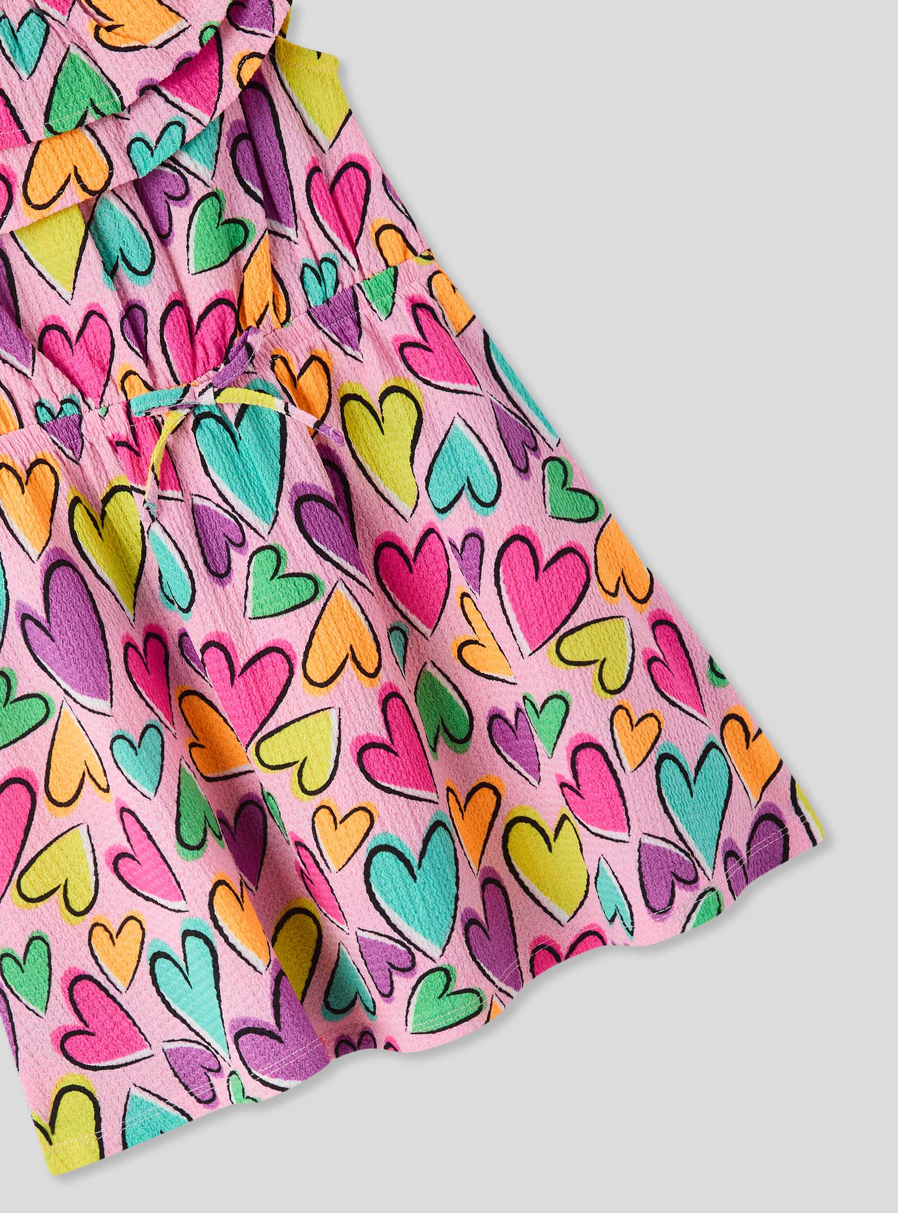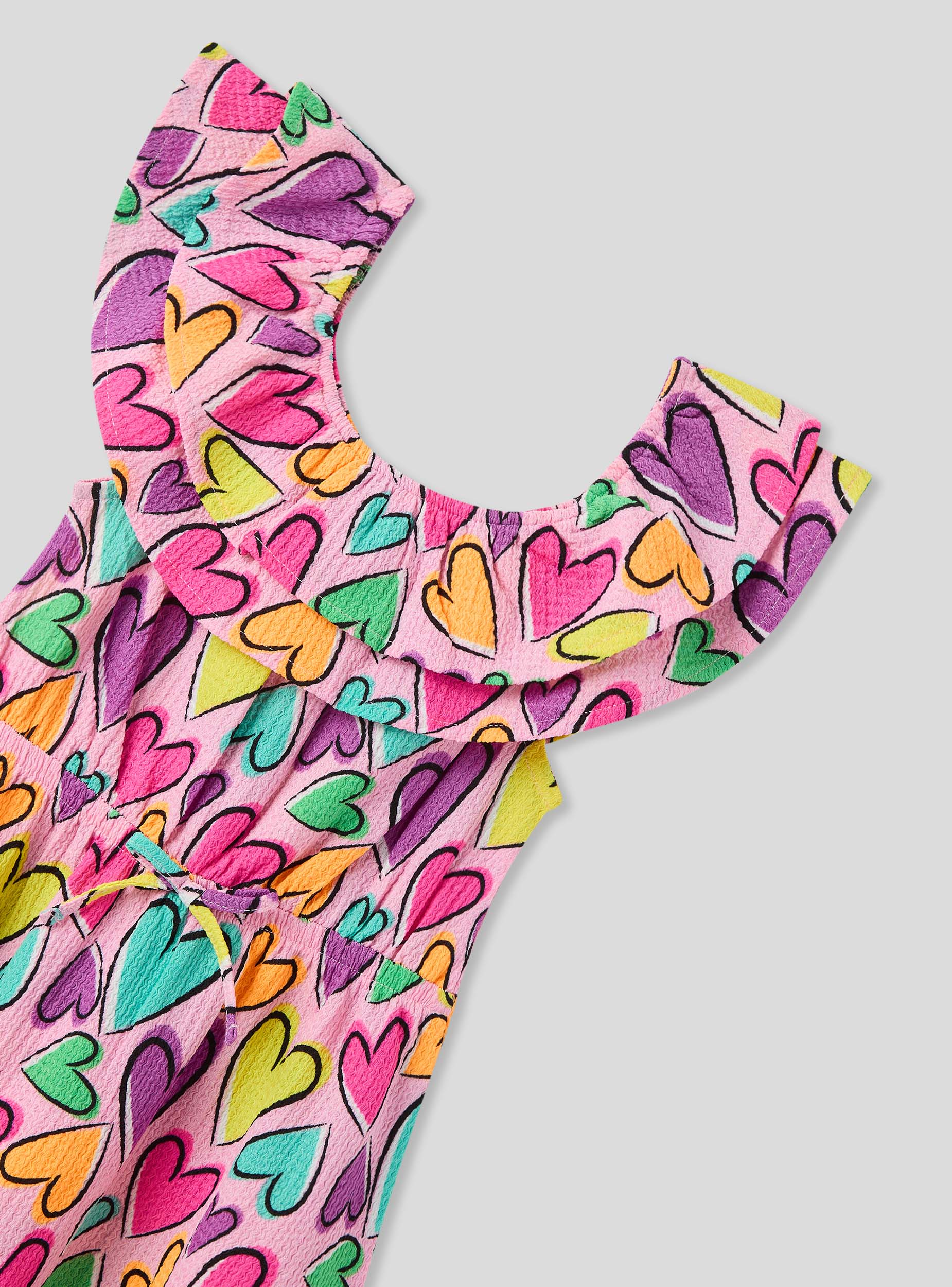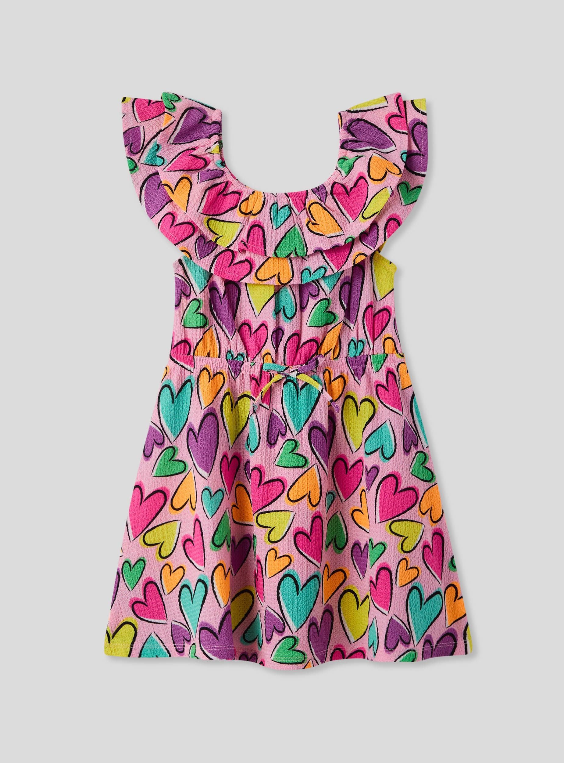 Dívčí šaty obohacené o barevný vzor srdcí. Design obsahuje roztomilé volány, které dodávají romantický a veselý nádech. Ideální pro malé, které se chtějí cítit jedinečné a módní, perfektní pro zvláštní příležitosti nebo pro přidání špetky radosti do každého dne.Detaily