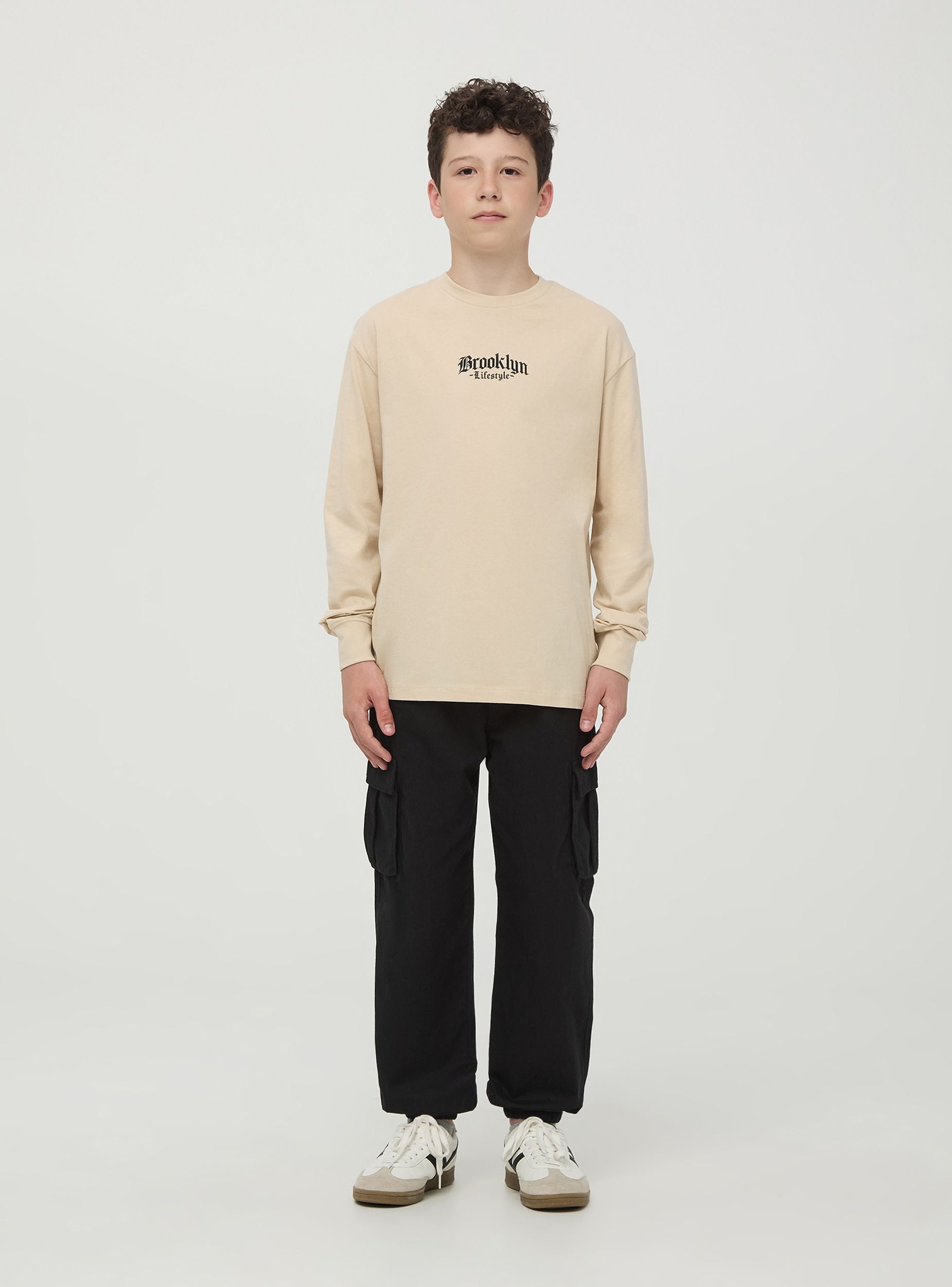 Dětské tričko s gotickým potiskem. Vyrobeno z bavlny s single jersey tkaninou, má potisk "Brooklyn Lifestyle" na hrudi a velký nápis "Brooklyn" na zádech. Tričko má elastické manžety a límec. Ideální pro pohodlný a ležérní vzhled, perfektní pro volný čas a každodenní aktivity.Detaily
