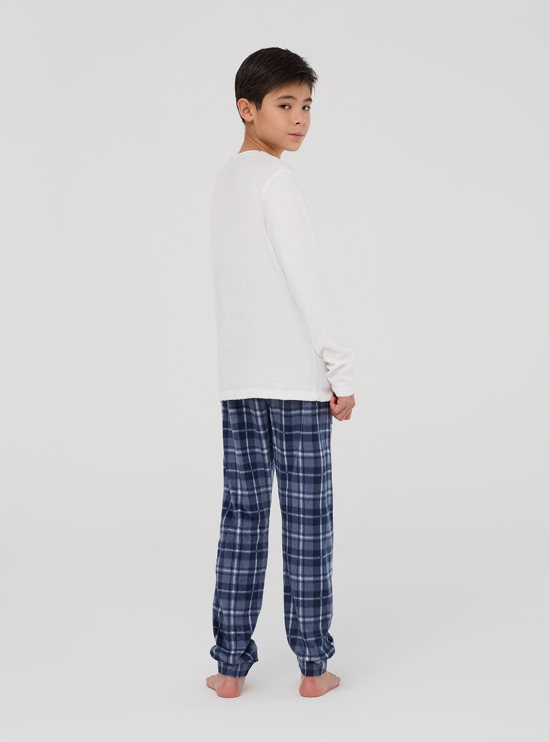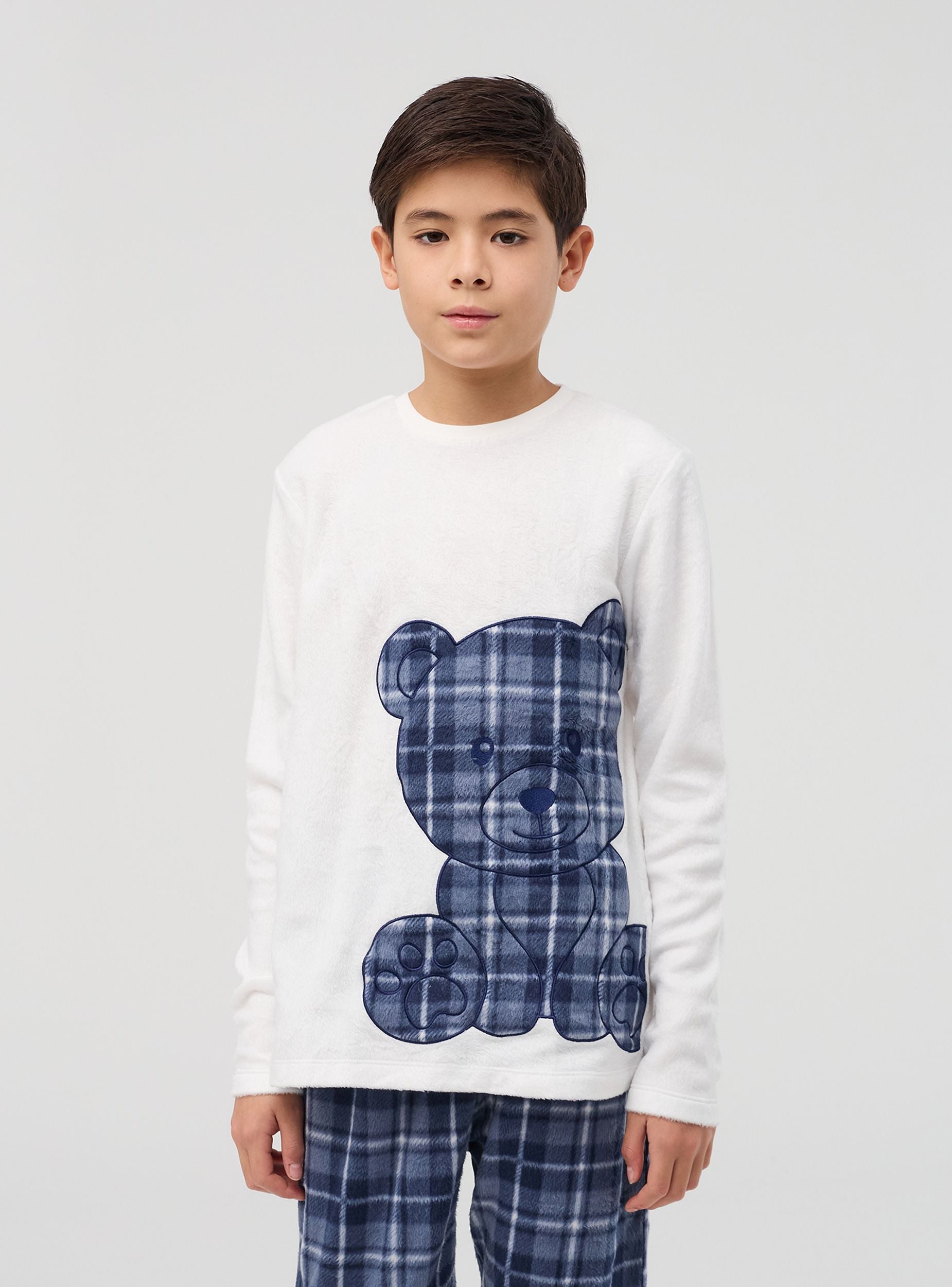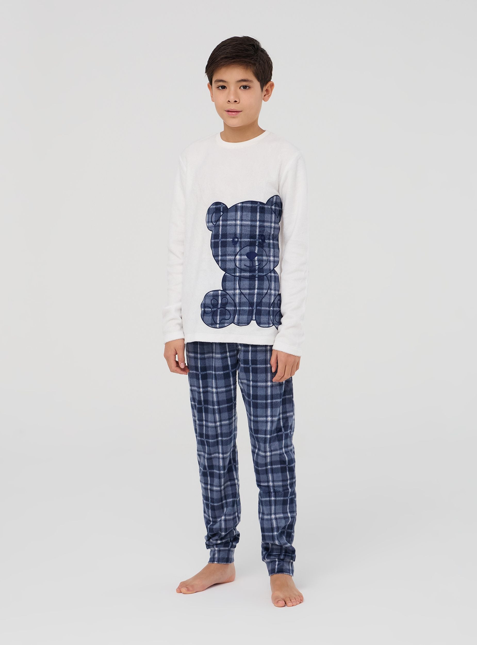 Dětské pyžamo ideální na zimní noci, složené z dlouhého rukávu a dlouhých kalhot. Tričko má roztomilého medvídka z tkaniny s aplikovaným tartanovým vzorem, což dodává nádech sladkosti a stylu. Kalhoty, které ladí s tričkem, jsou zdobeny stejným tartanovým vzorem, což zajišťuje koordinovaný a módní vzhled. Toto pyžamo nabízí pohodlí a teplo. Ideální pro přidání nádechu radosti a stylu do nočního oblečení.Detaily