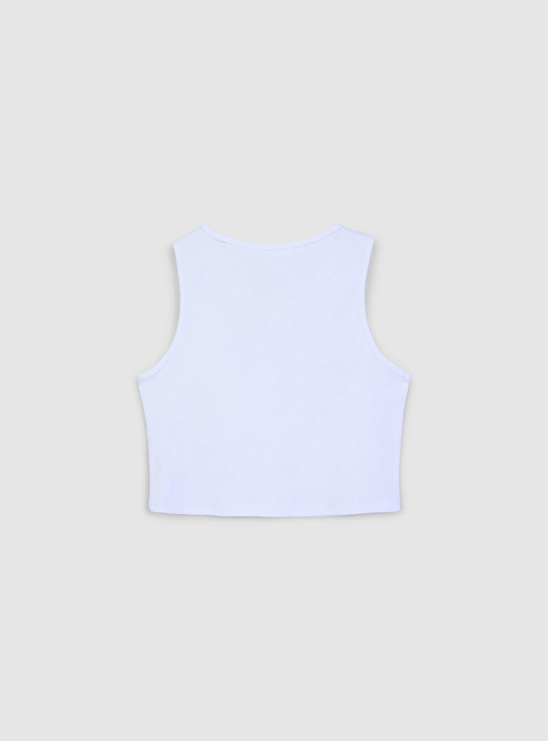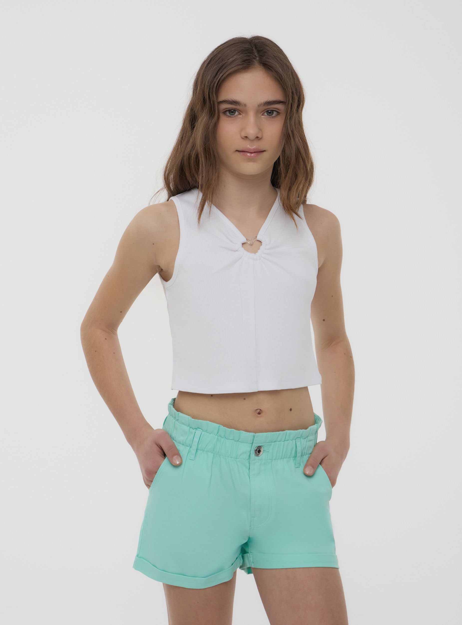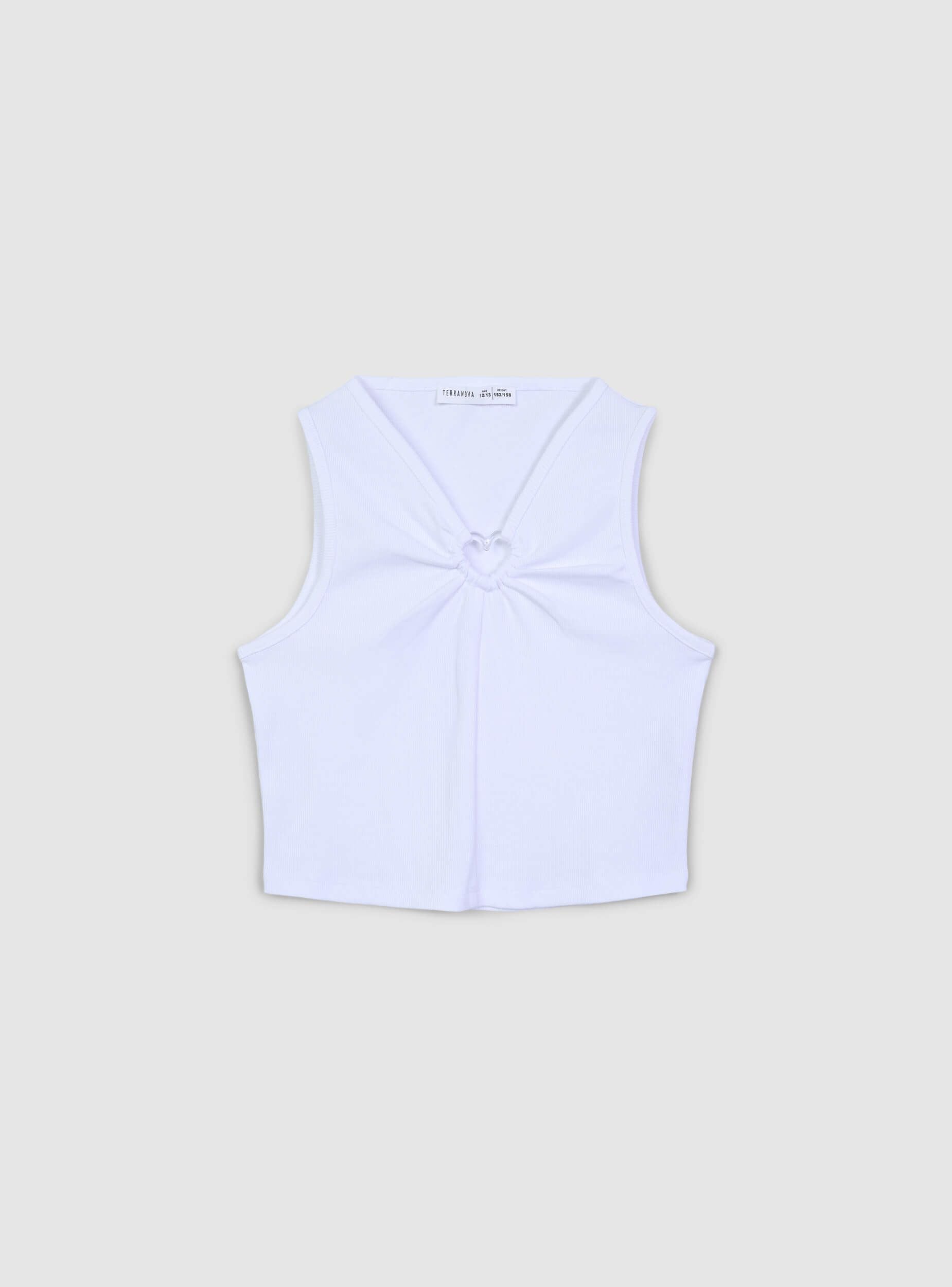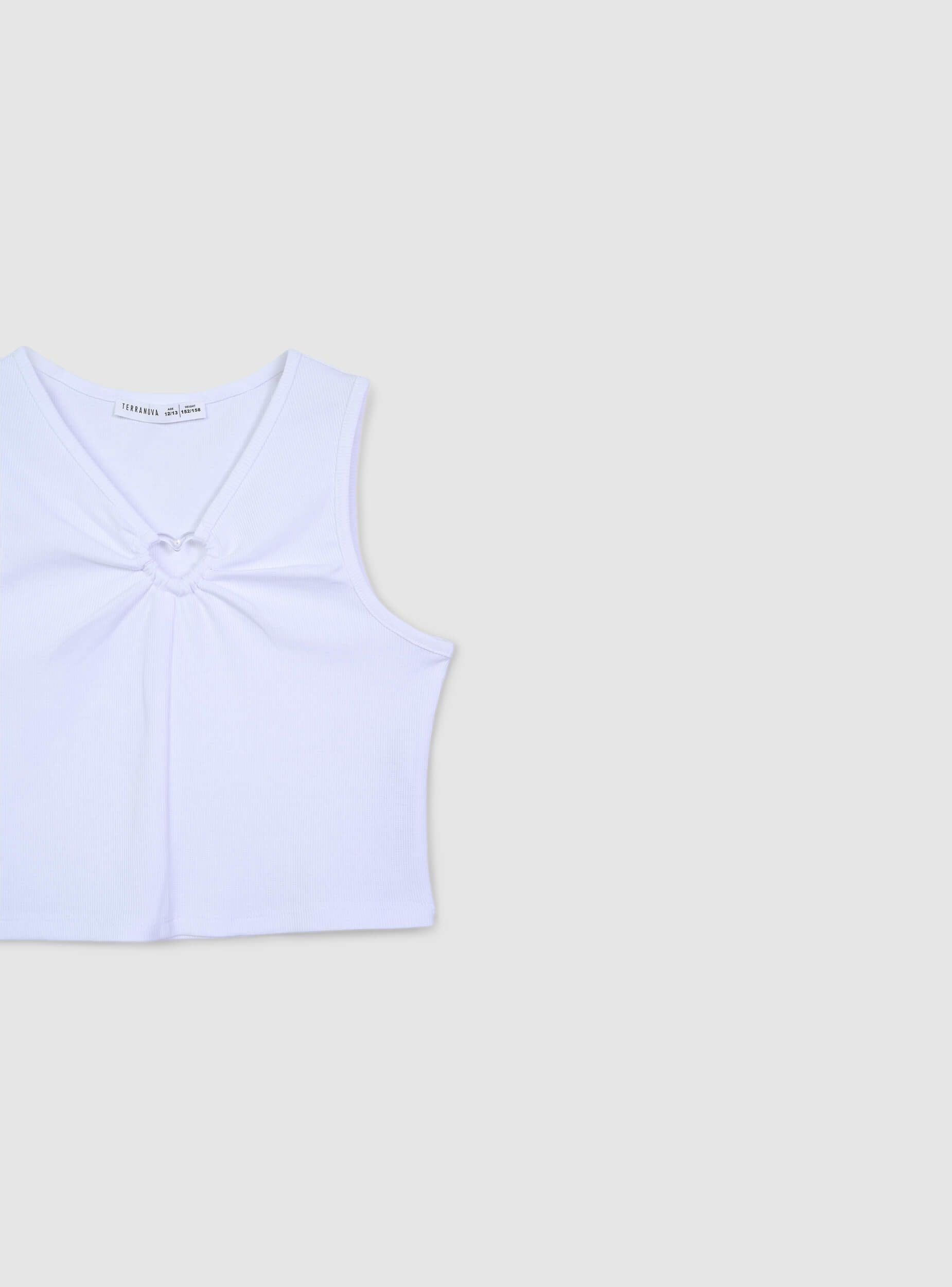 Dívčí tílko s jednobarevným designem, které se snadno kombinuje s každým outfitem. Detail v podobě srdíčkového výřezu na přední straně dodává originální a romantický nádech. Krátký střih ho činí ideálním pro vytváření módních letních outfitů, navržených pro každou příležitost.Detaily