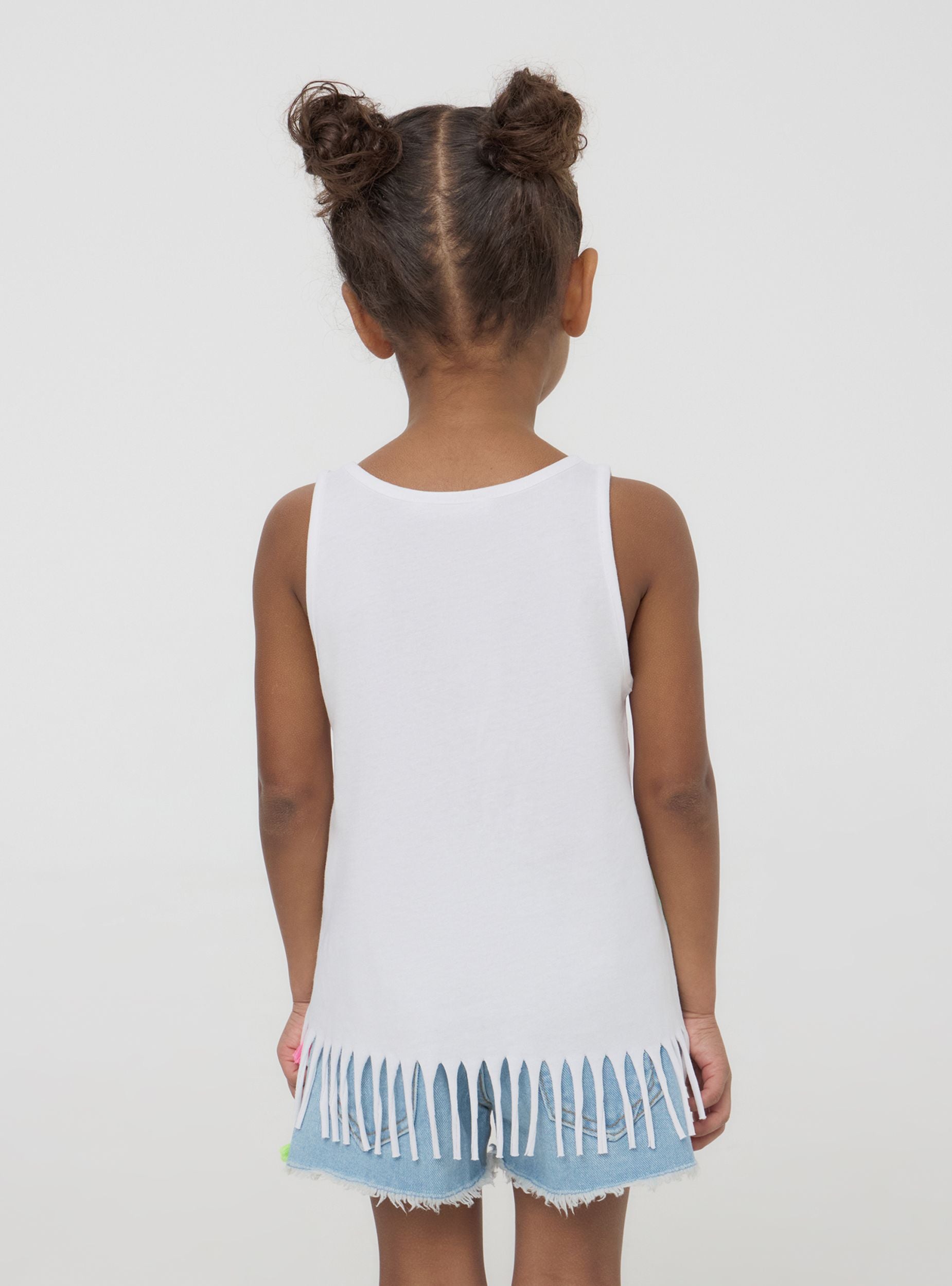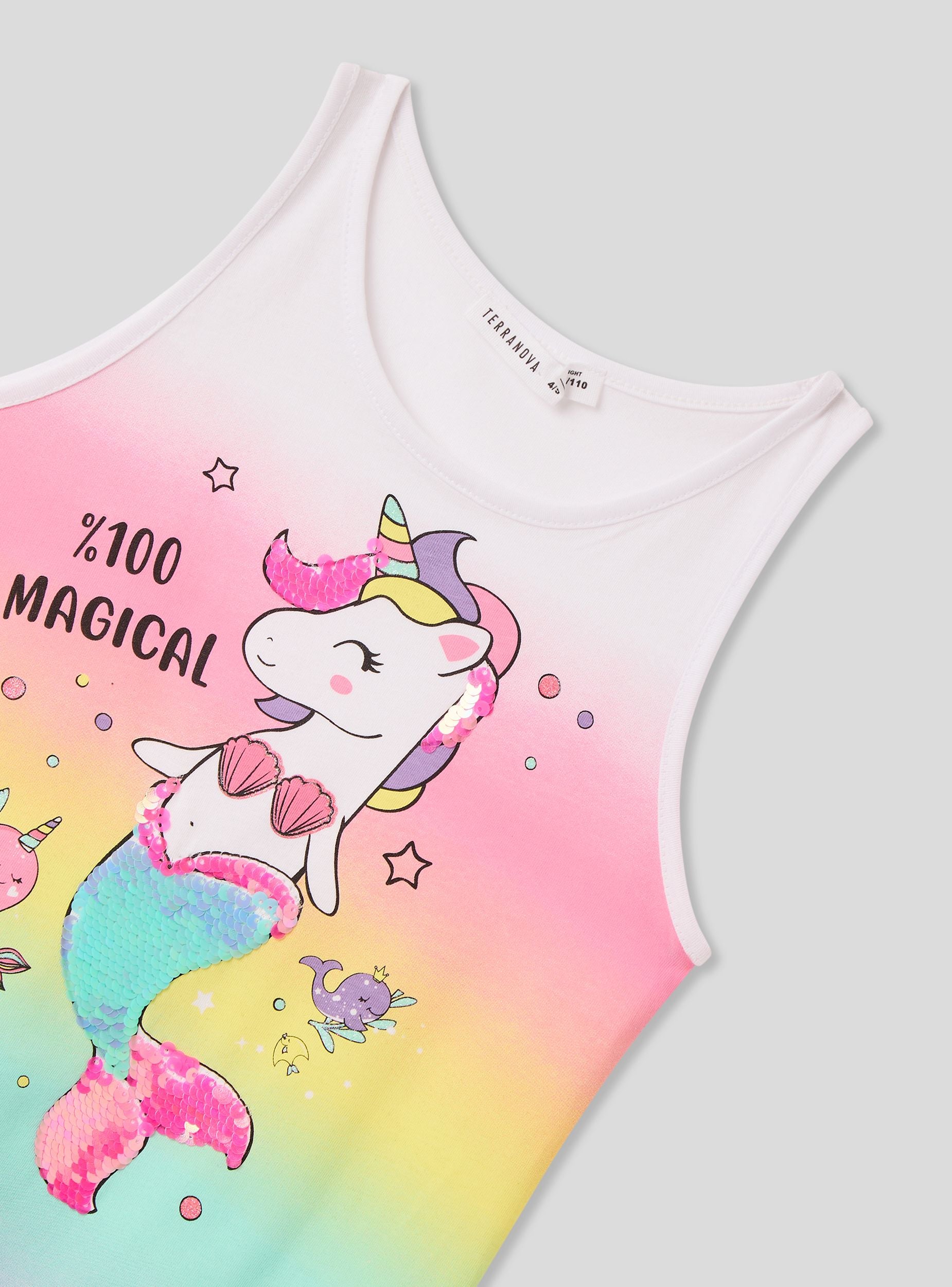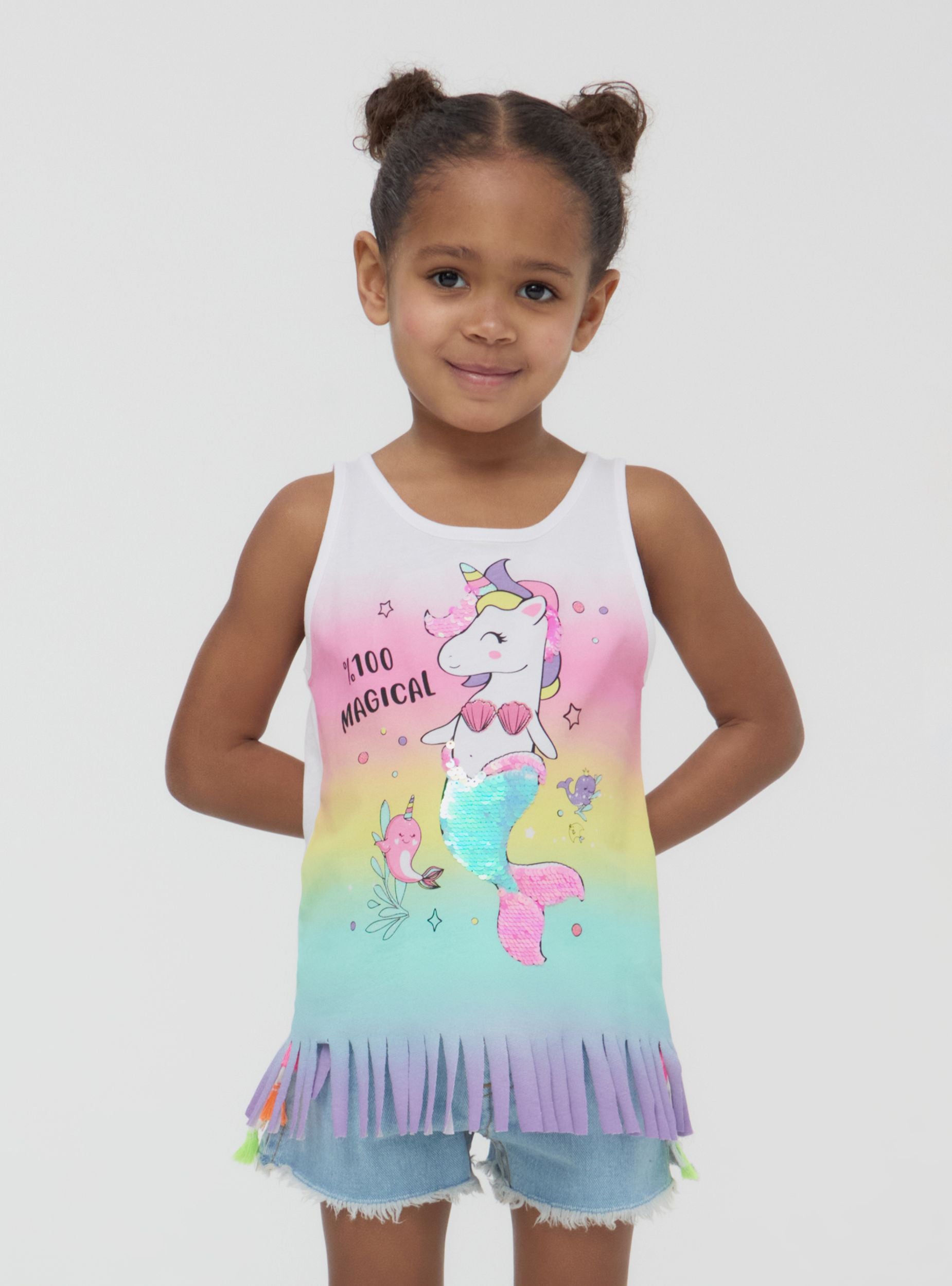 Top pro dívku s veselým designem, obohacený o živé třásně podél okraje pro dynamický a zábavný vzhled. Tisk sladkého jednorožce s mořskou pannou přidává pohádkový nádech, zatímco třpytivé detaily a flitry dodávají lesk a kouzlo, ideální pro ty, kdo rádi sní s otevřenýma očima. Neodolatelný kousek pro prožití každého dne se stylem a kouskem fantazie.Detaily