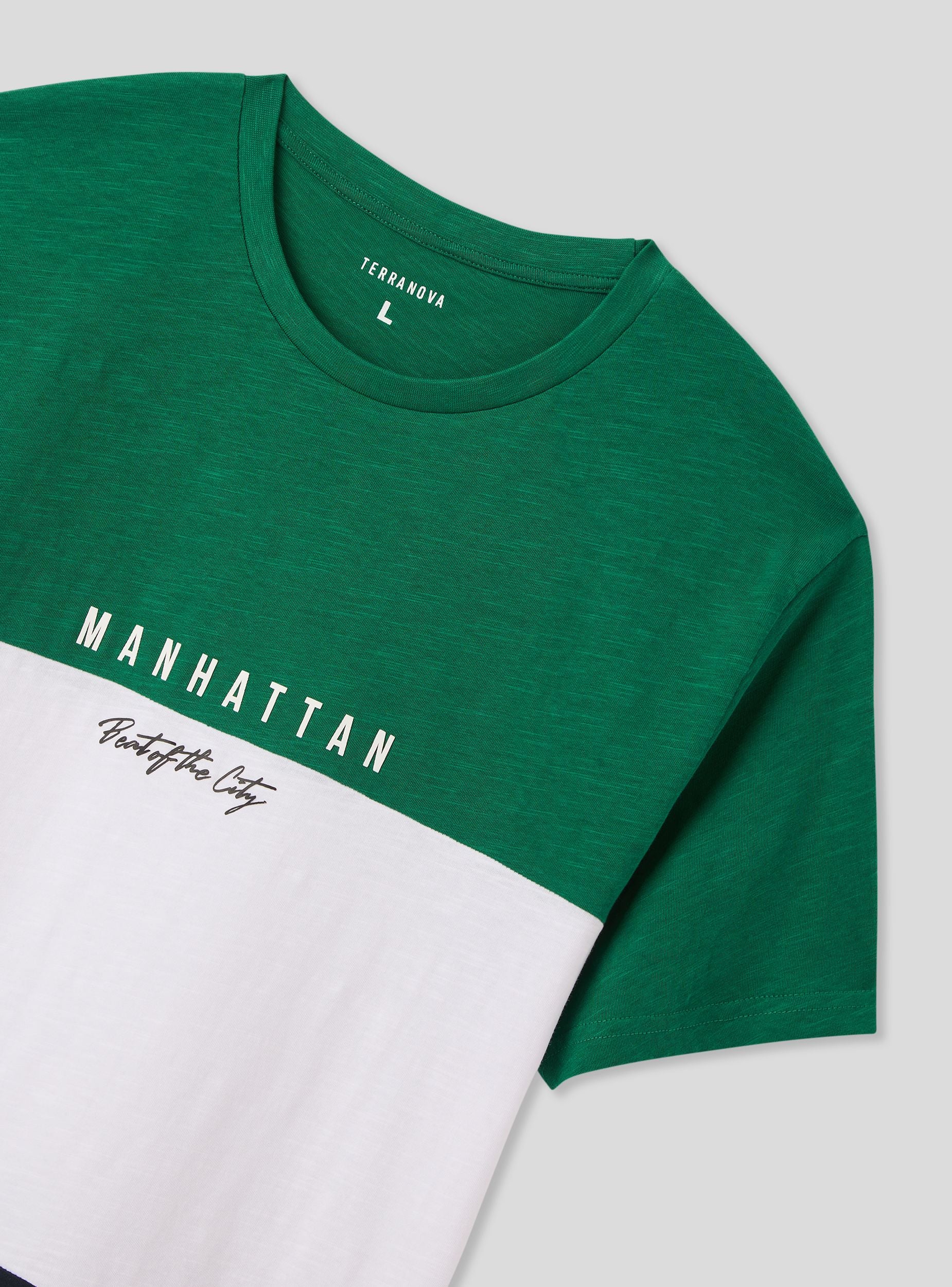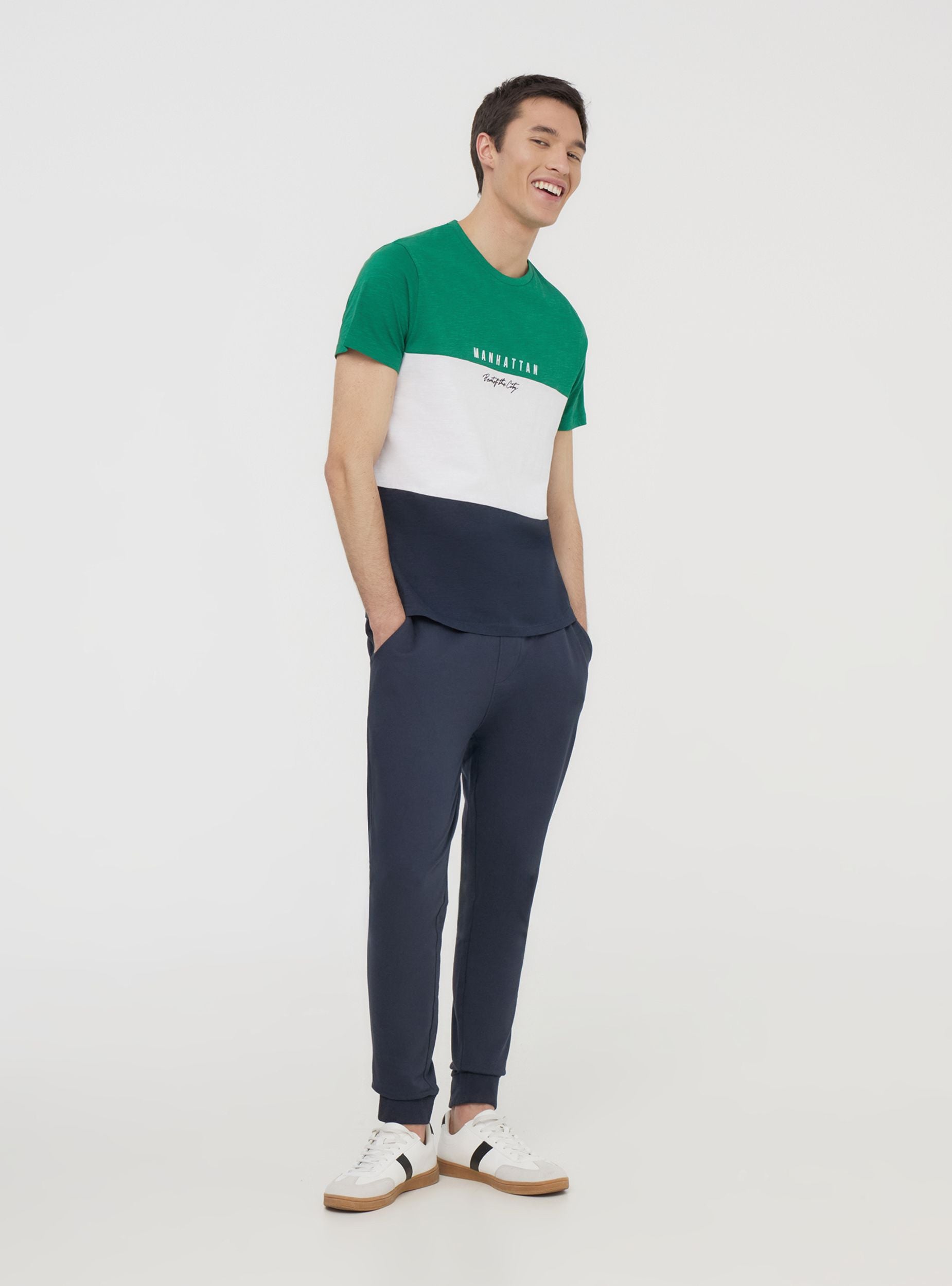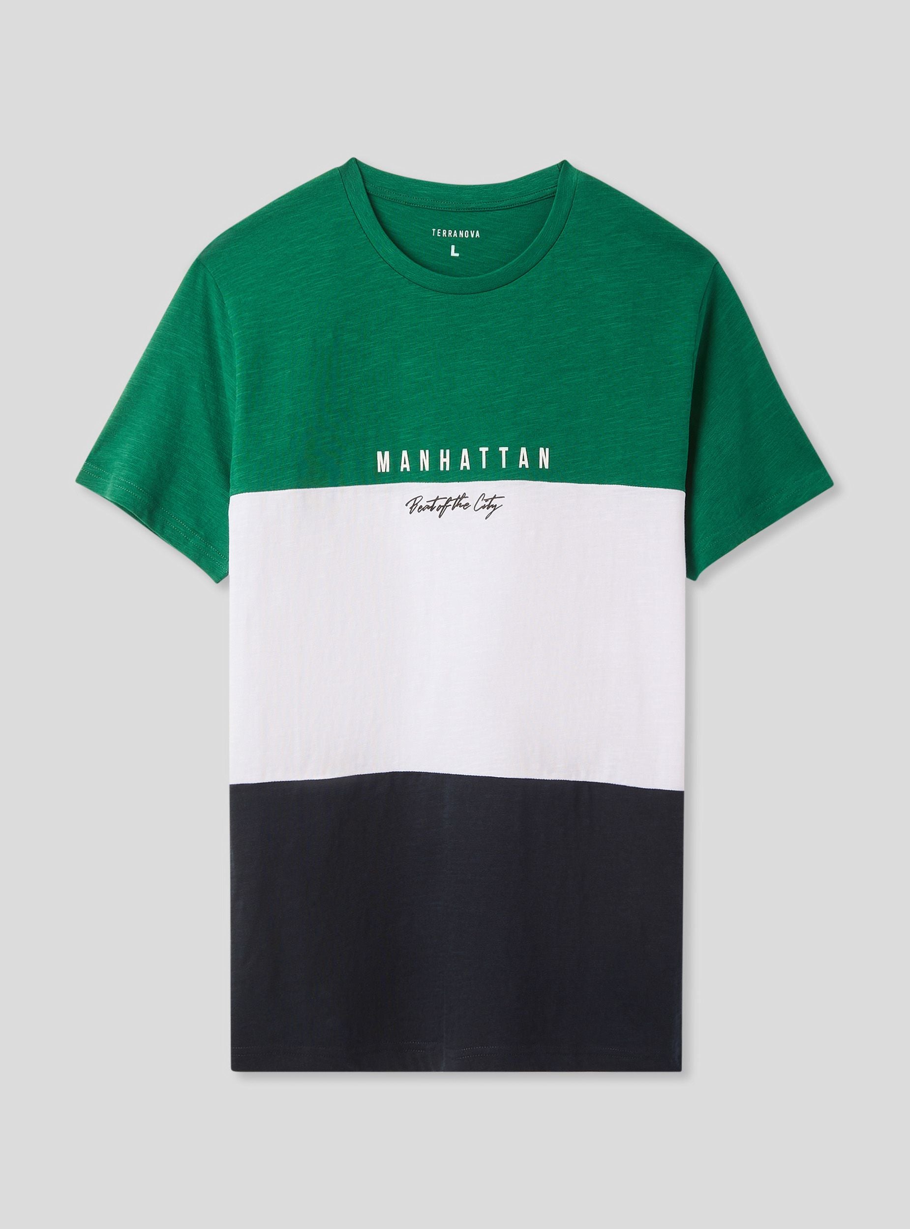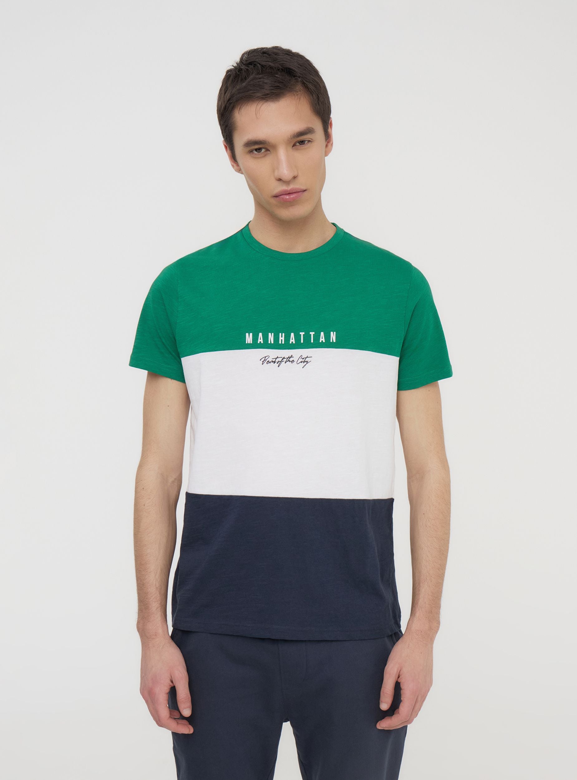 Pánská trička s krátkým rukávem a kulatým výstřihem, charakterizovaná designem v blokových barvách, který dodává moderní a výrazný vzhled. Tisk na hrudi zdůrazňuje městský styl, což ji činí ideální pro casual a dynamické outfity. Perfektní k džínům nebo bermudám pro uvolněný, ale elegantní vzhled, je vhodná na volný čas, procházky po městě a neformální setkání s přáteli.Detaily