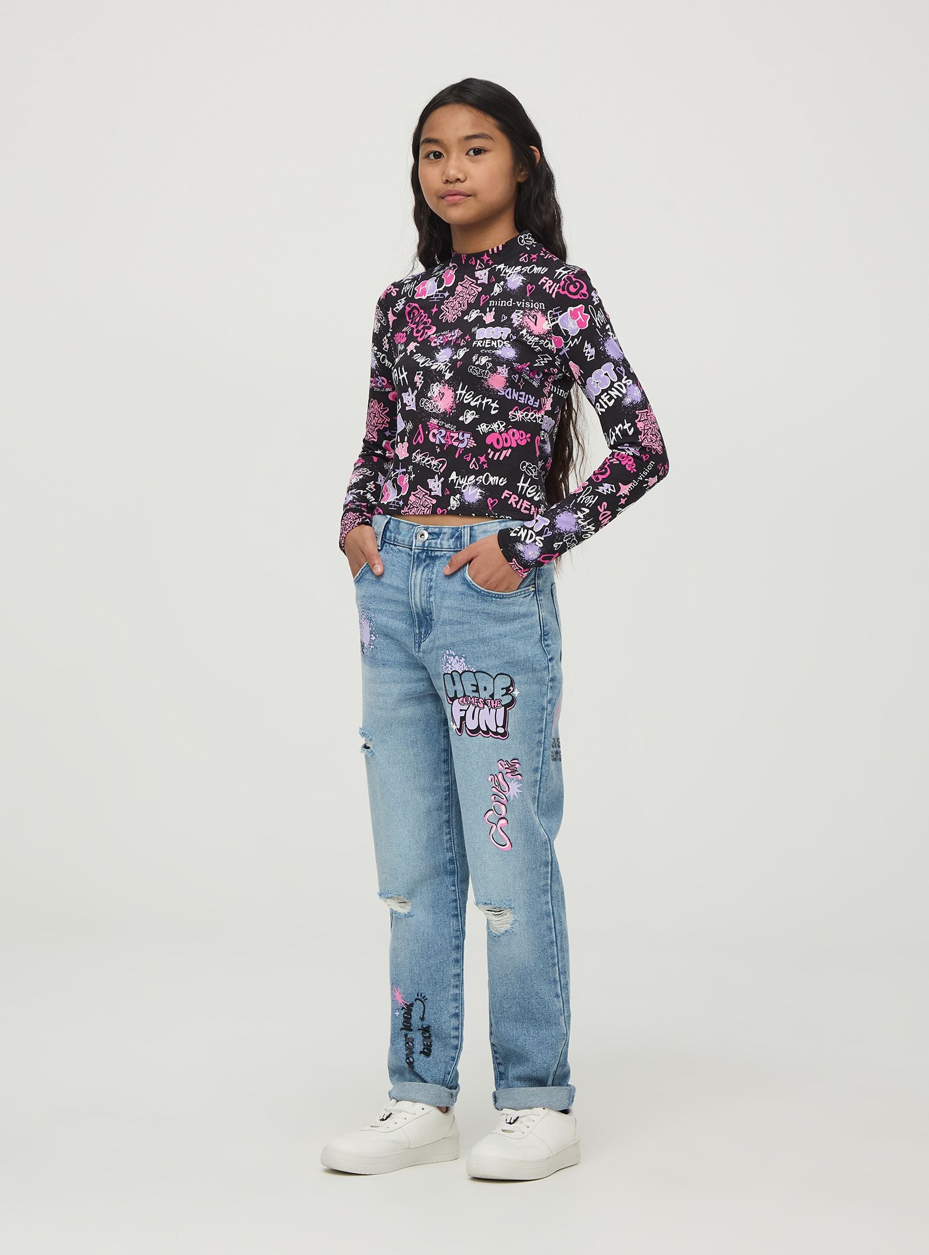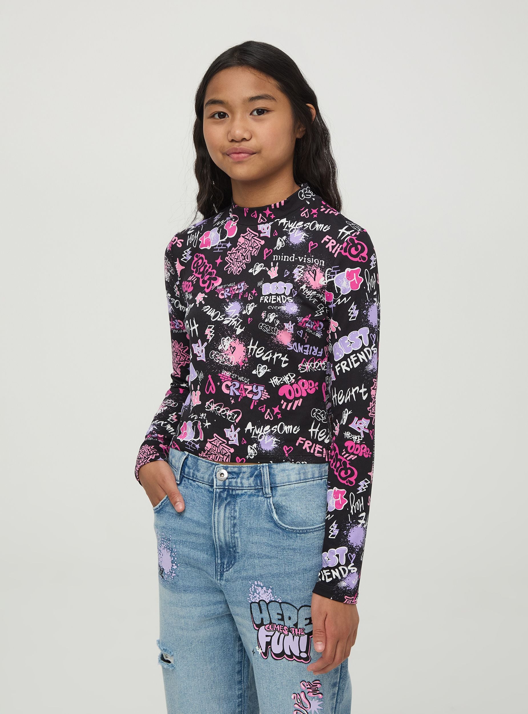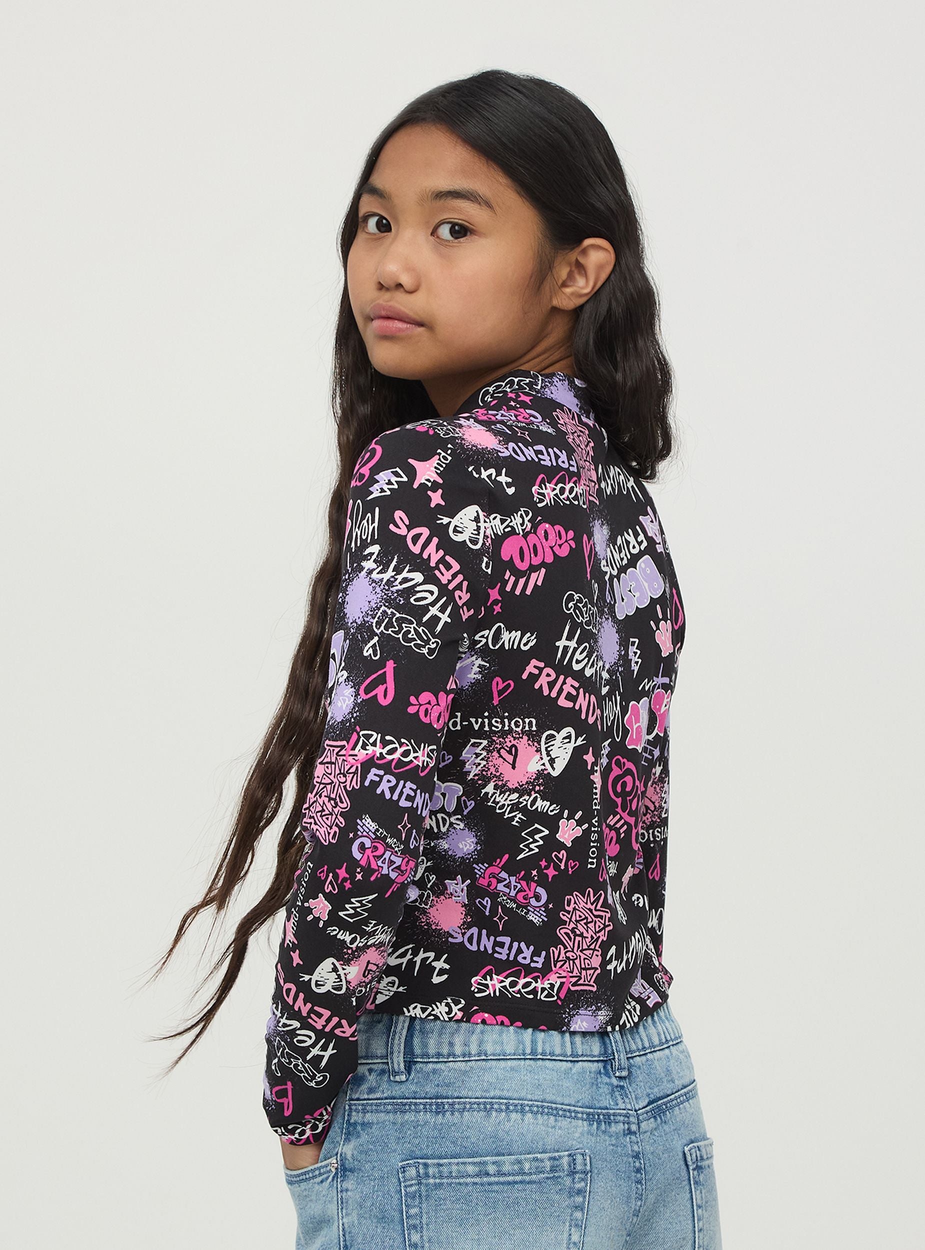 Dívčí tričko s dlouhými rukávy a živou potiskem graffiti po celém povrchu s obrázky a nápisy. Materiál soft touch poskytuje pocit pohodlí a měkkosti. Ideální pro volný čas a každodenní aktivity, toto tričko se perfektně hodí k džínům, sukním nebo kalhotám, zajišťující styl a pohodlí pro každou příležitost. Regular fit.Detaily